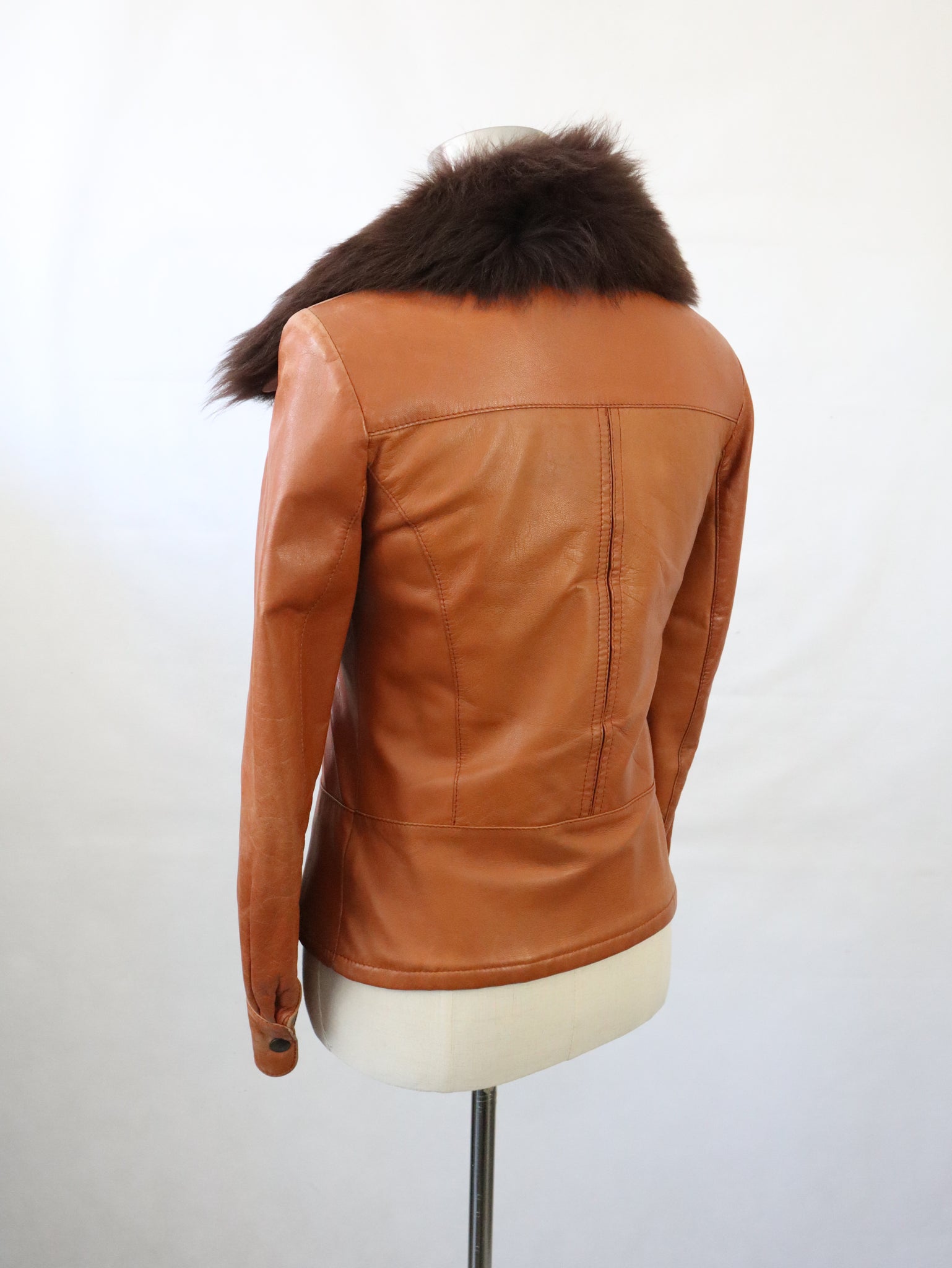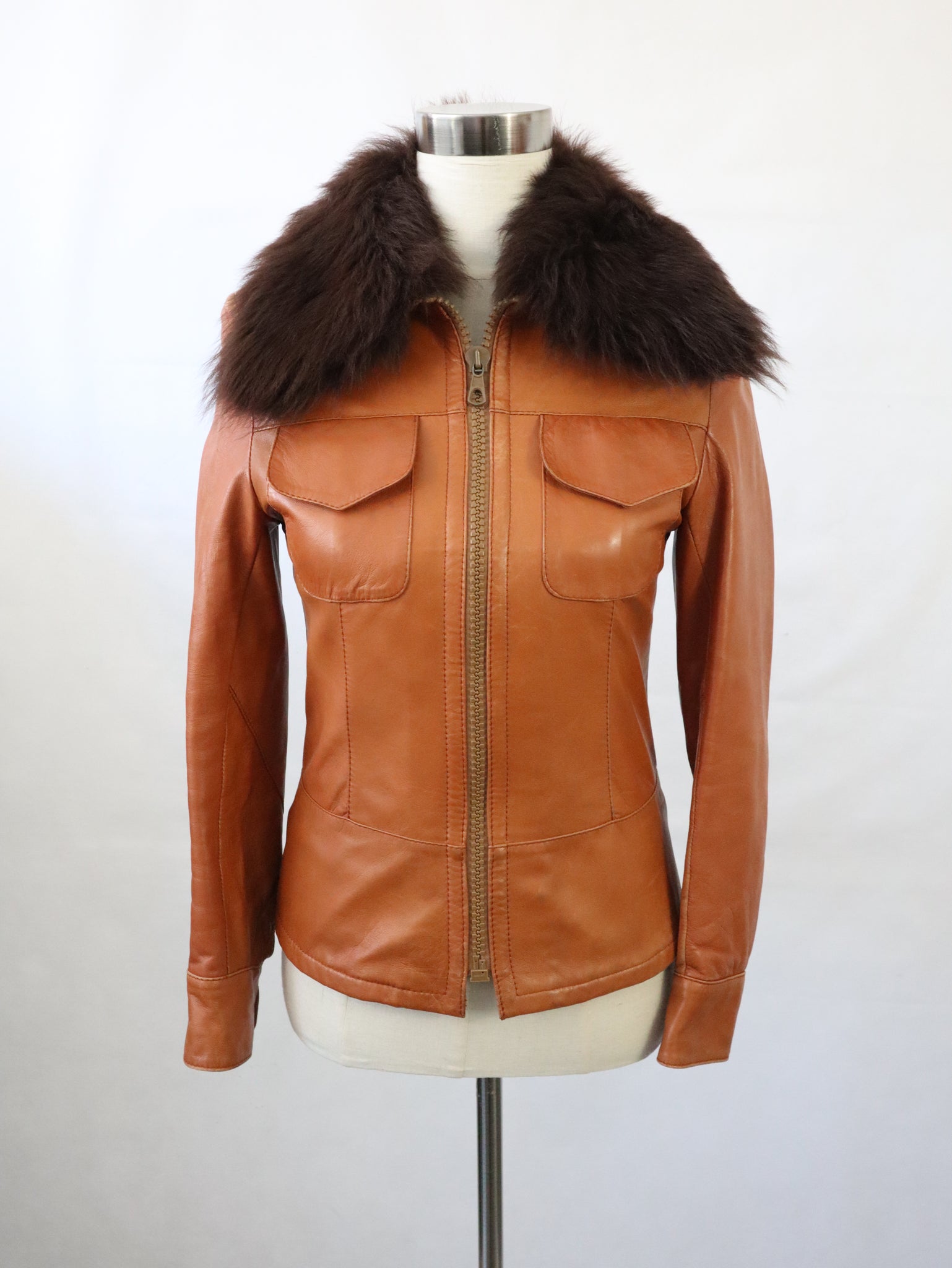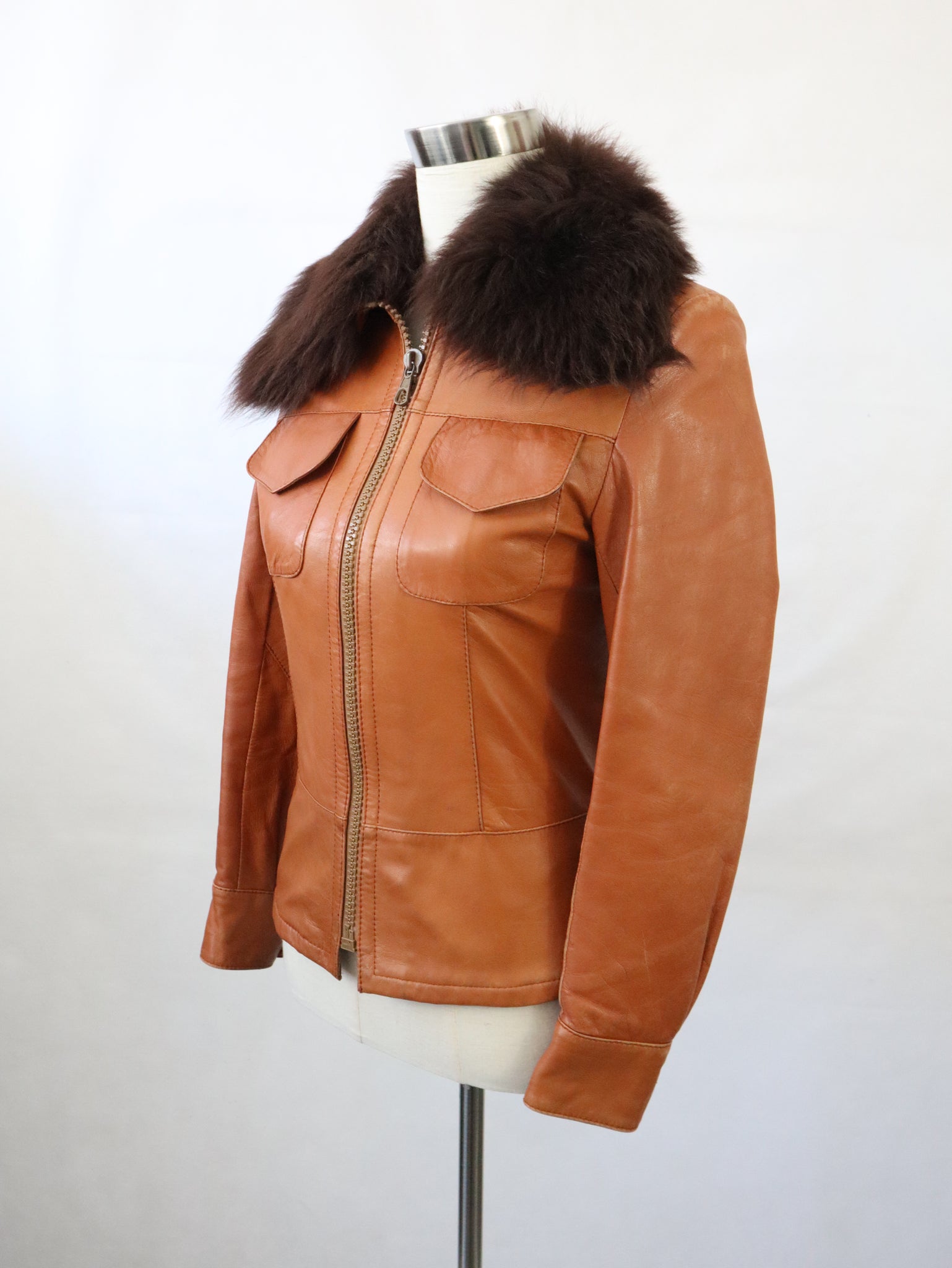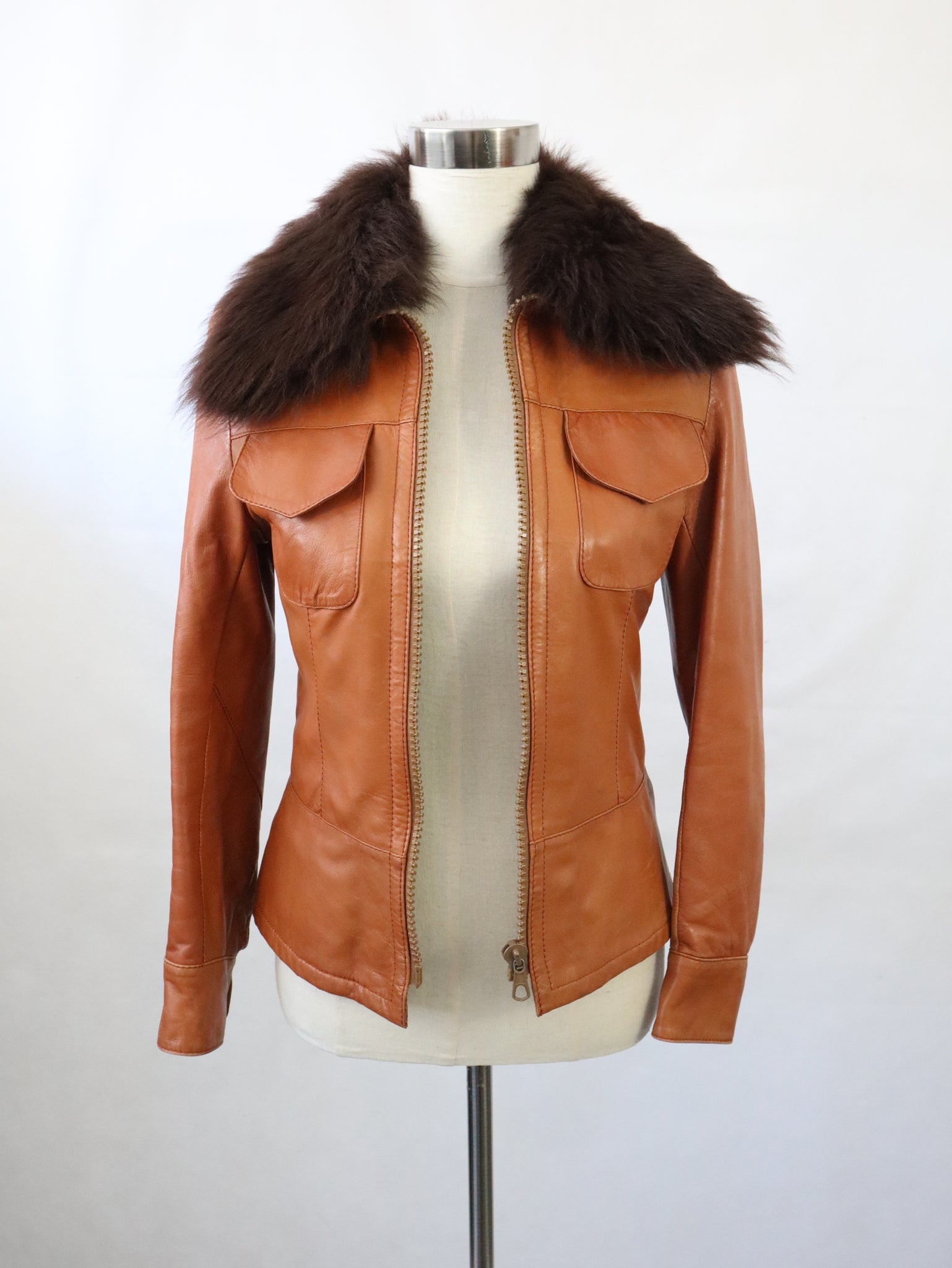 Konjakinruskea lyhyt nahkatakki kotimaista vintagea 70-luvulta, valmistaja Frihansa, Lauttakylä Finland.