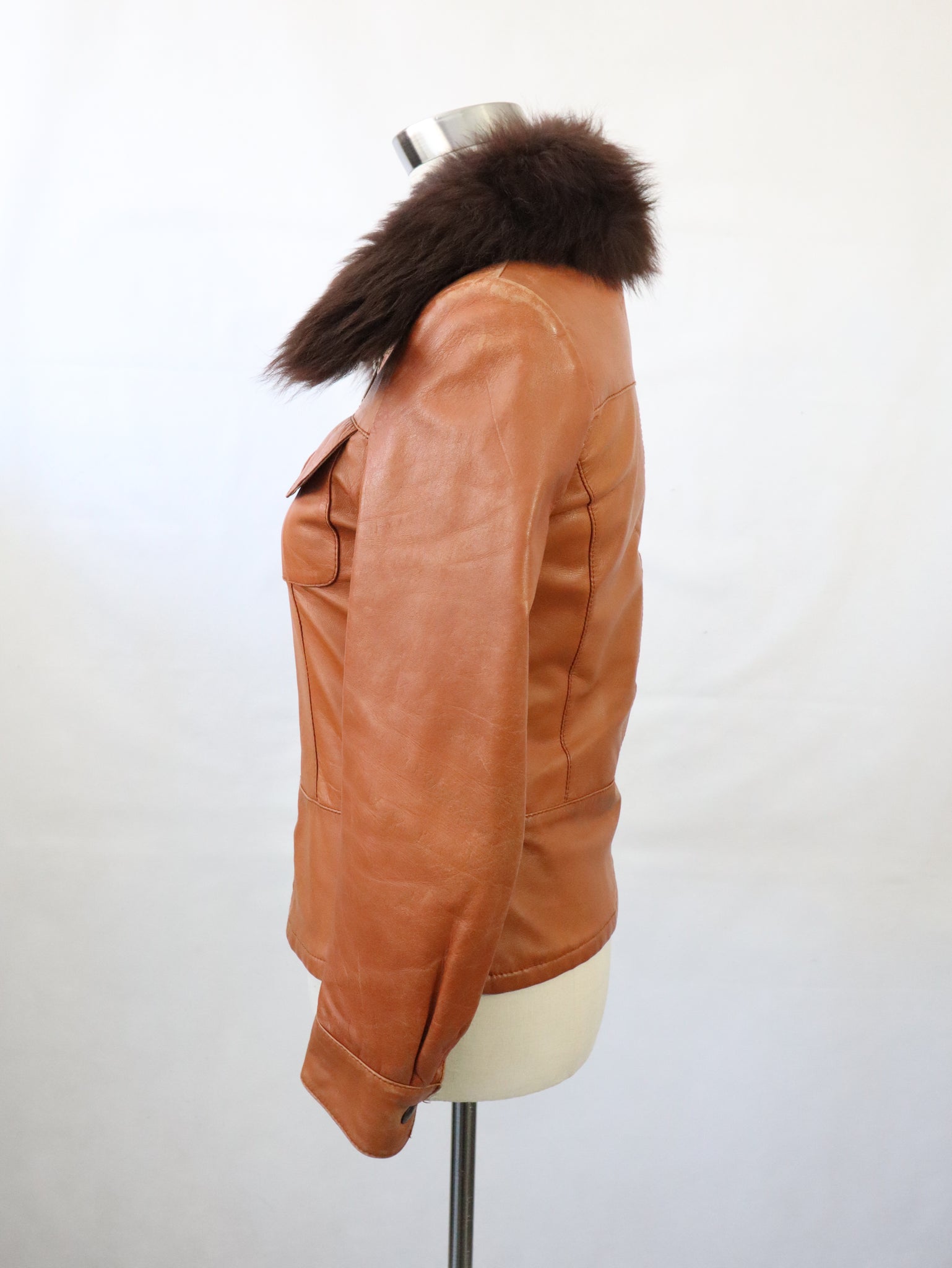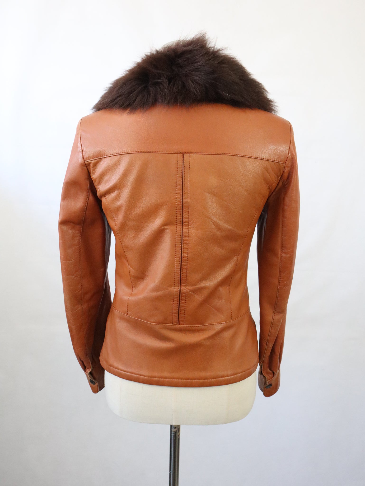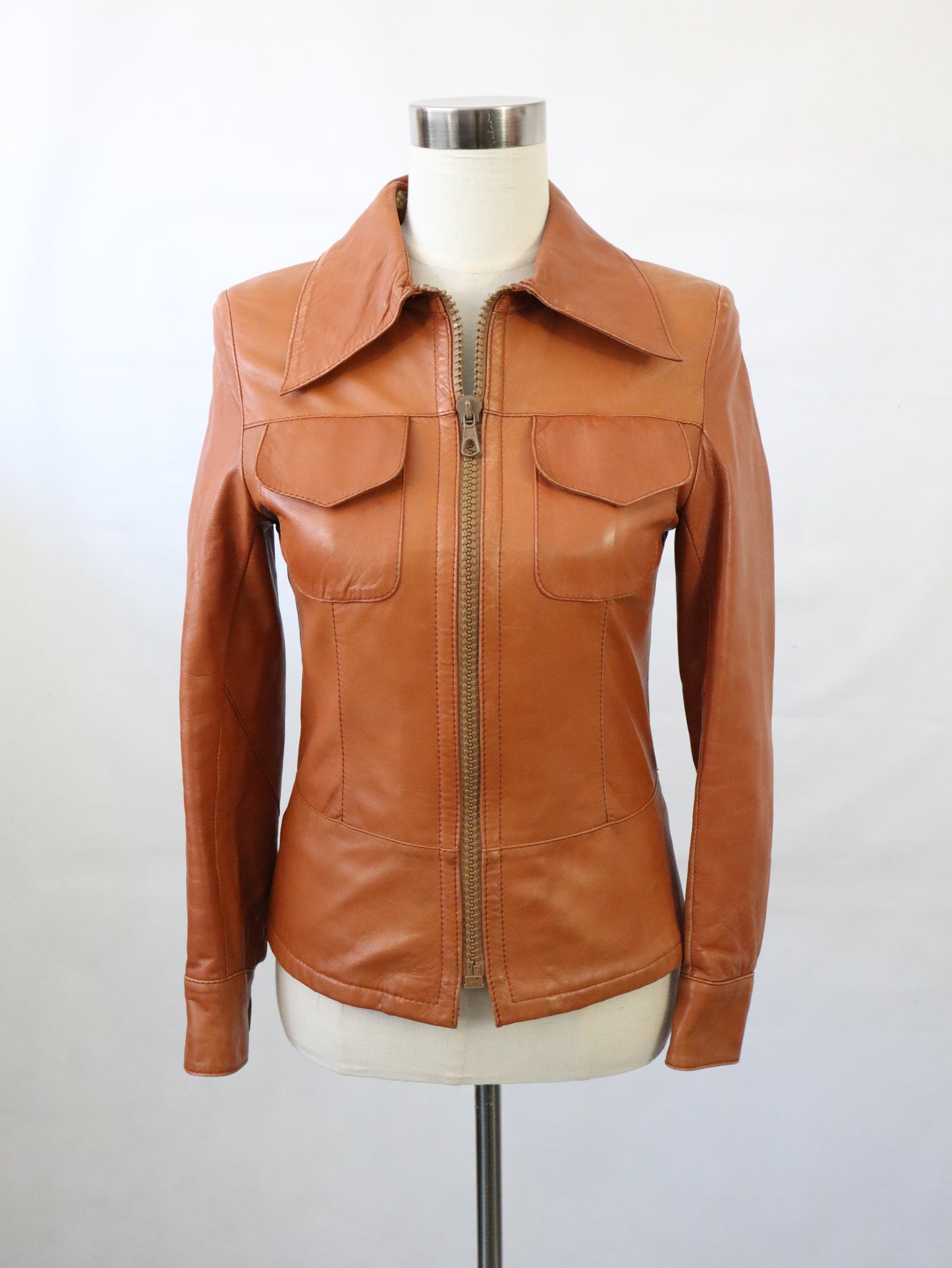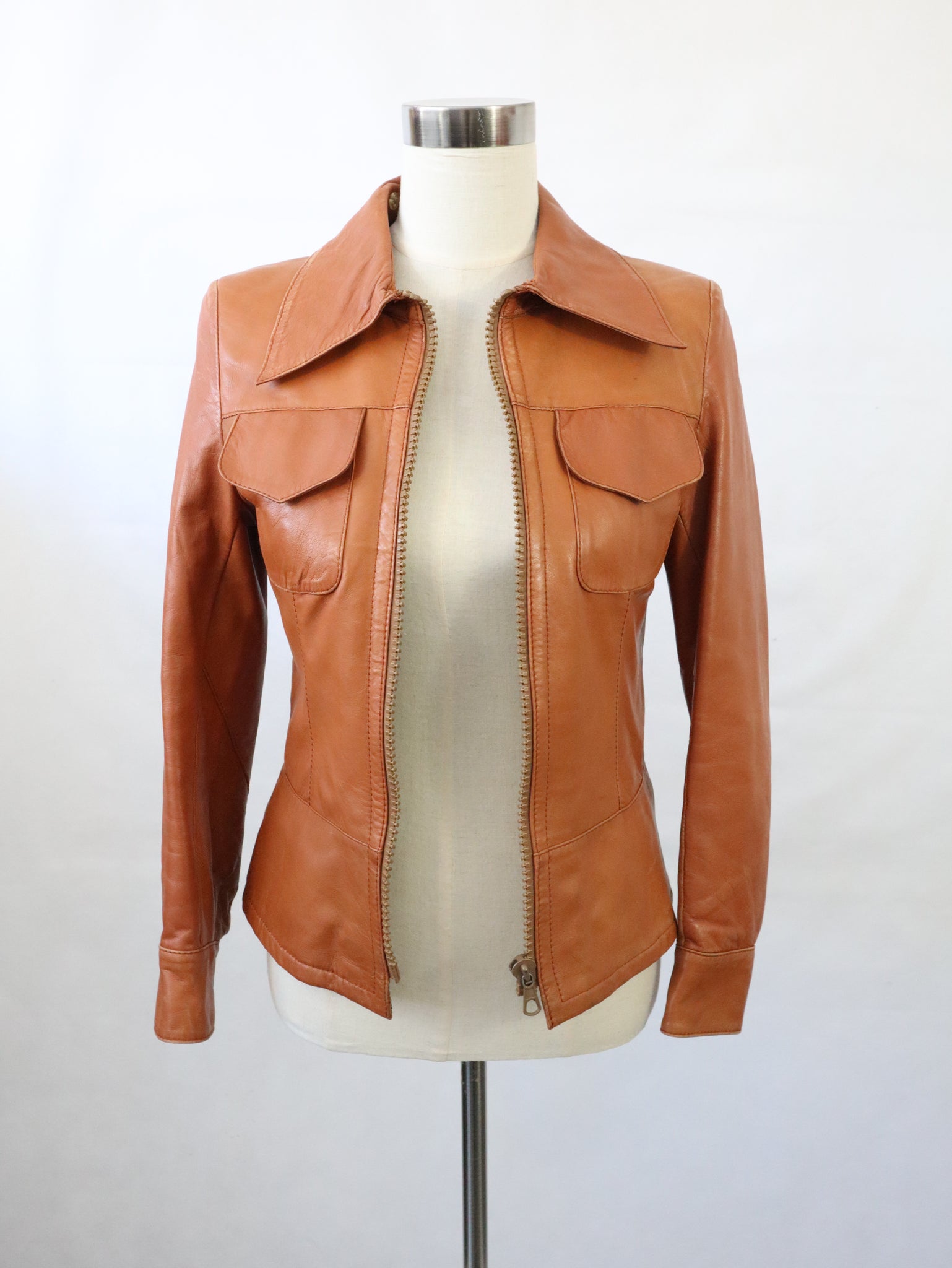 Konjakinruskea lyhyt nahkatakki kotimaista vintagea 70-luvulta, valmistaja Frihansa, Lauttakylä Finland.