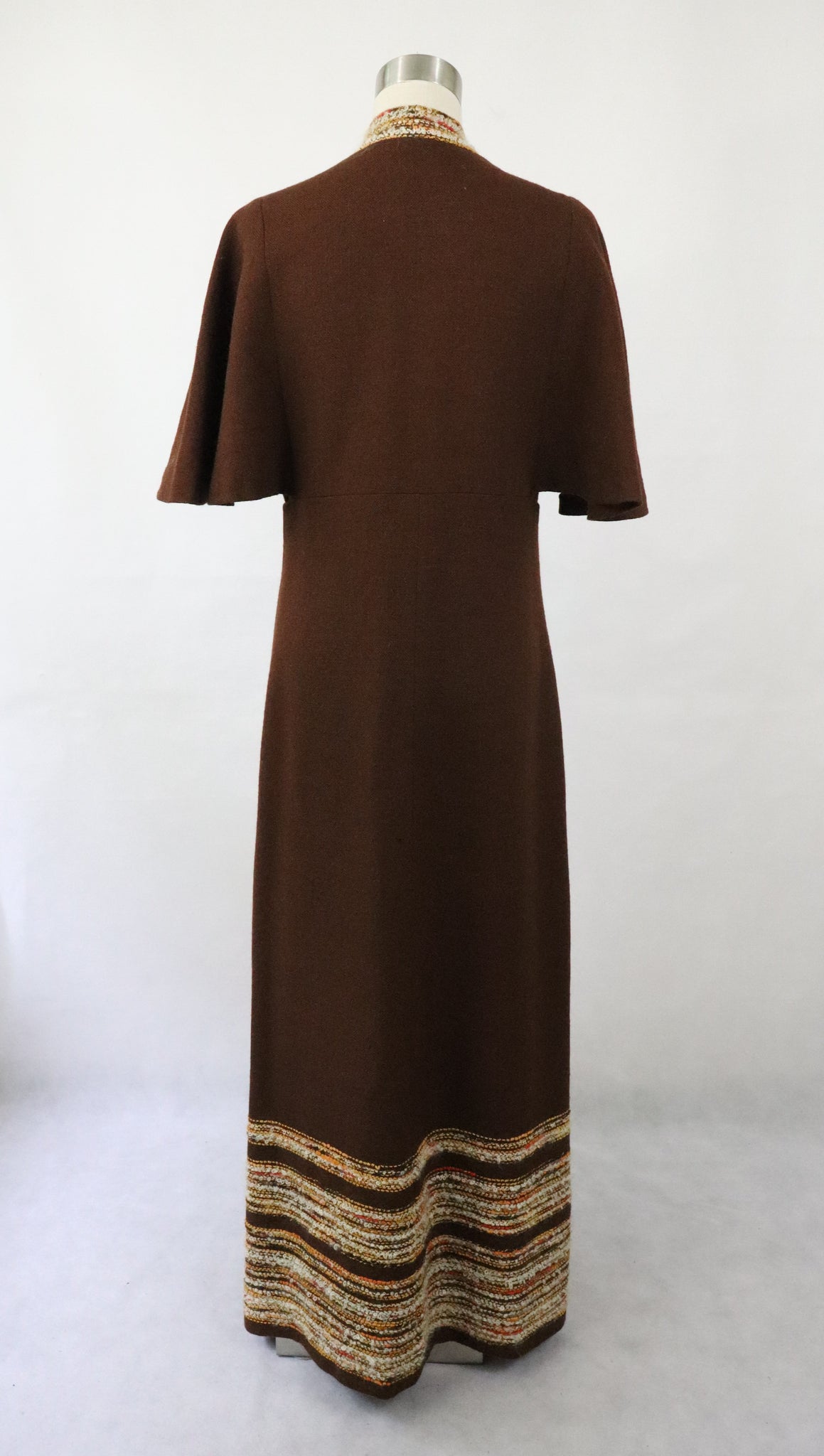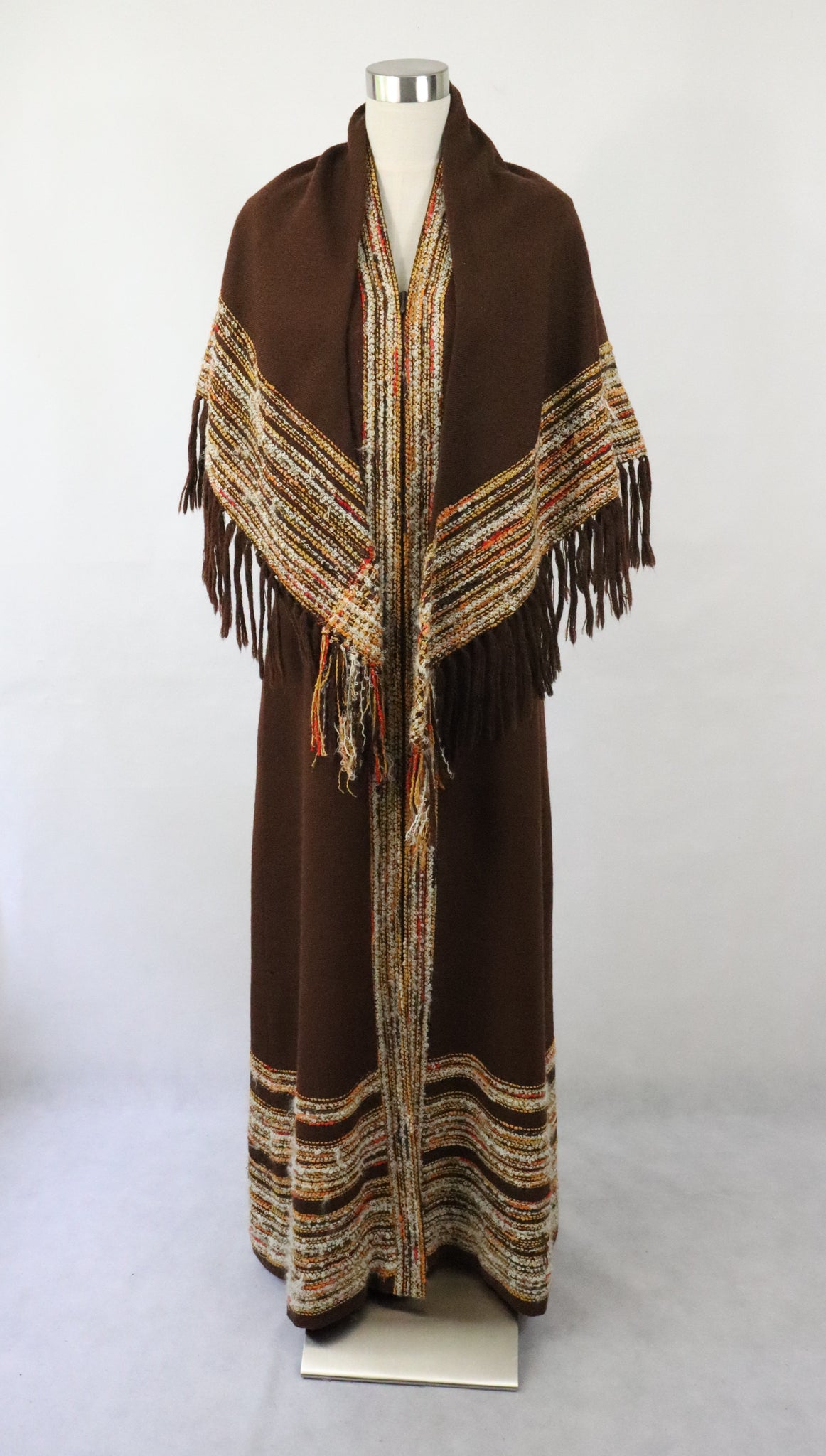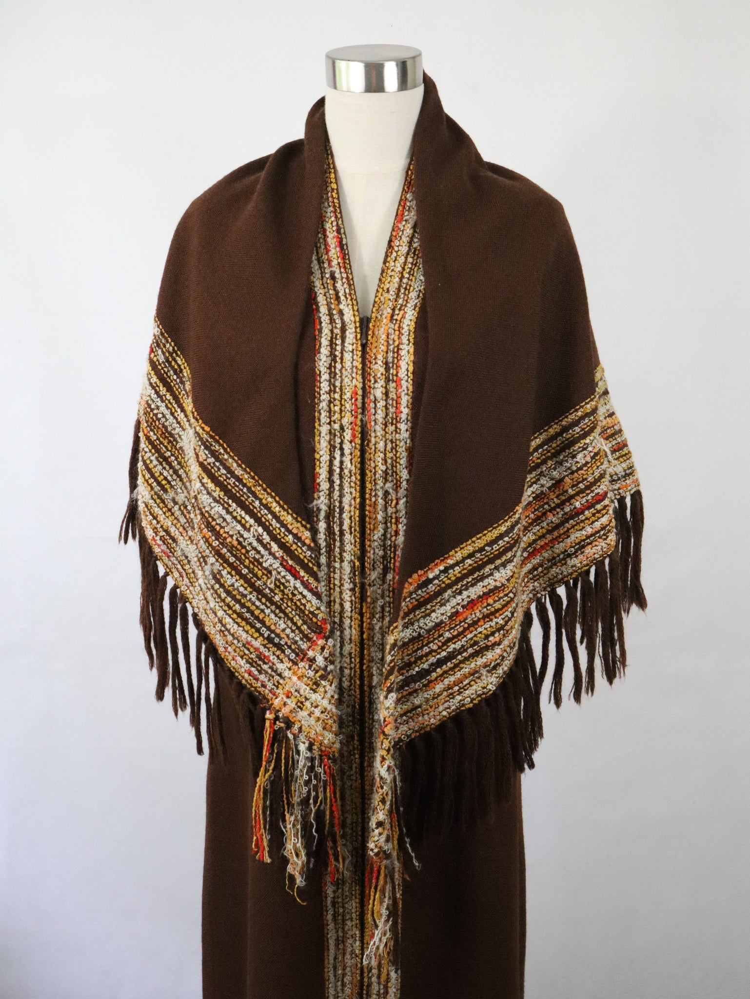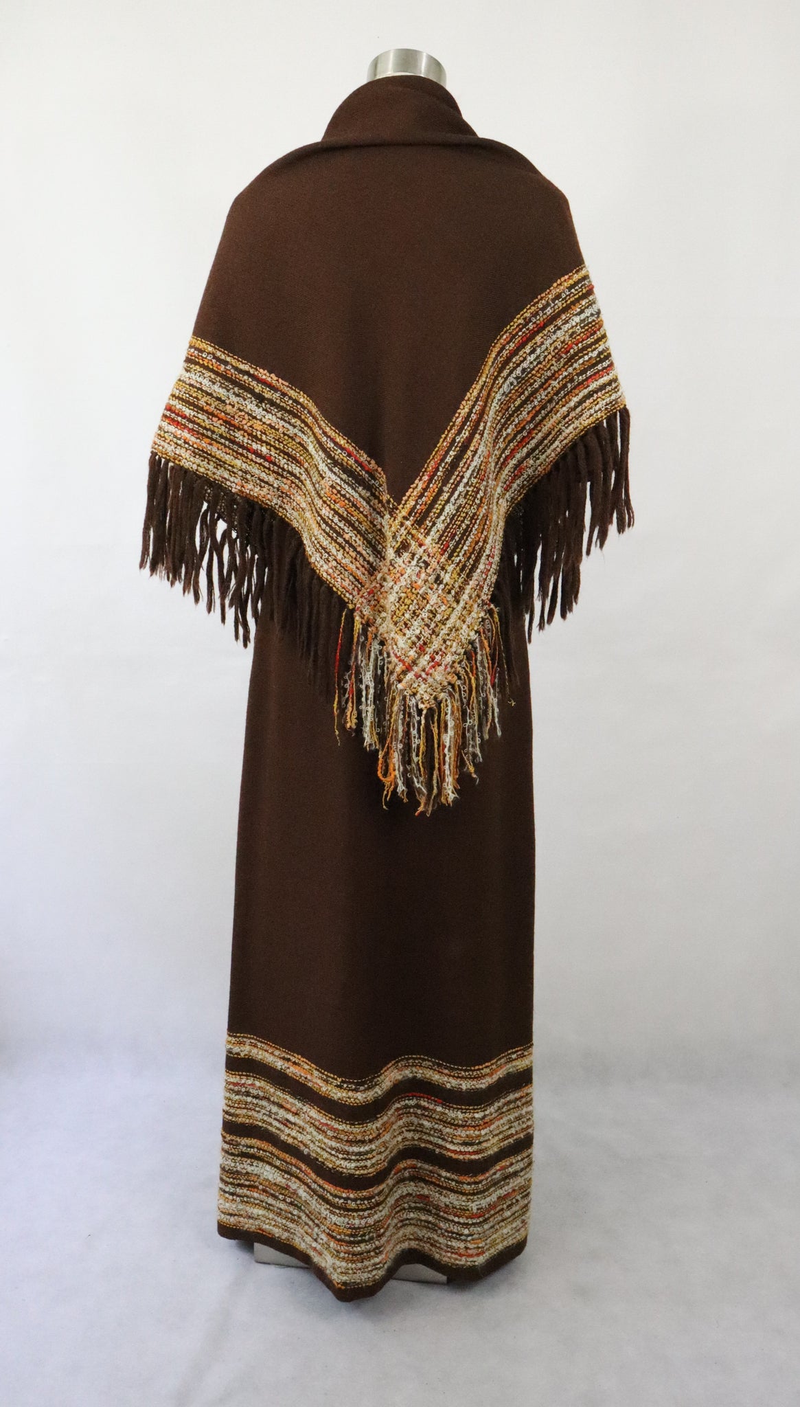 Kansallisromanttista tyyliä henkivä, tyylinsä perustella 70-luvun kotimaista vintagea edustava täyspitkä villakankainen mekko ja kolmiomallinen hapsuhuivi, valmistaja Arola, made in Finland.