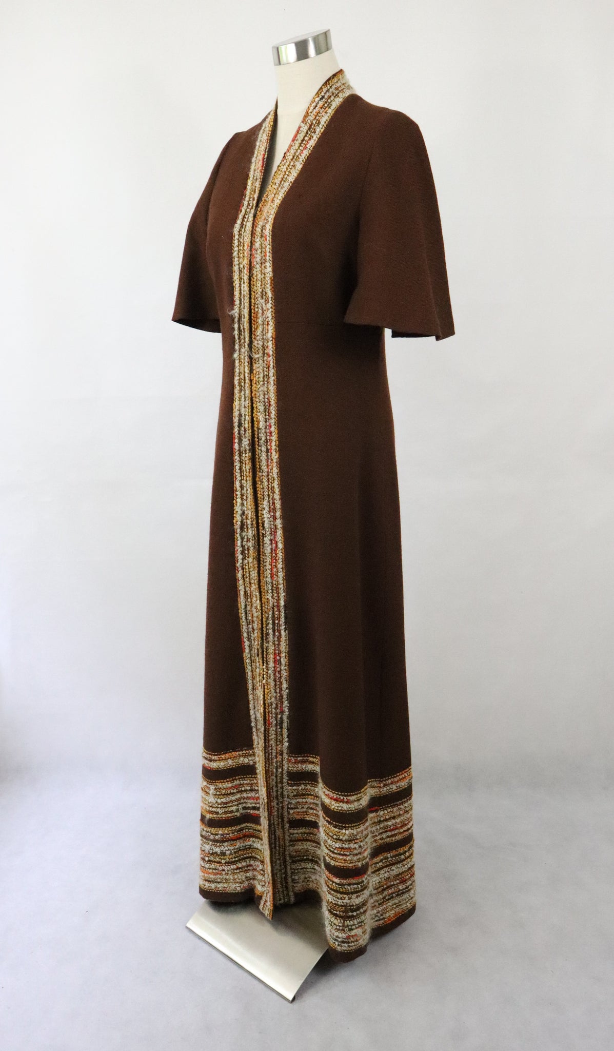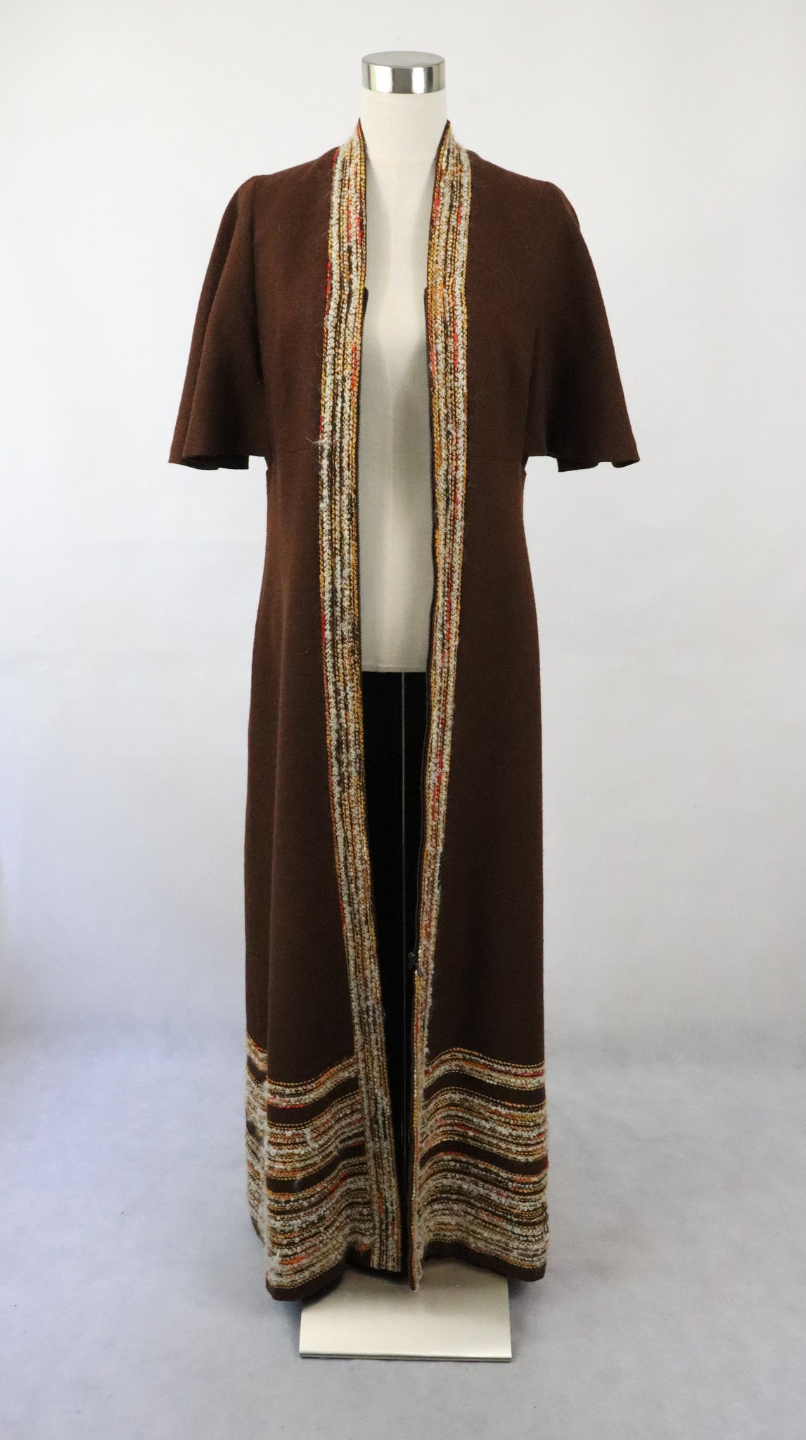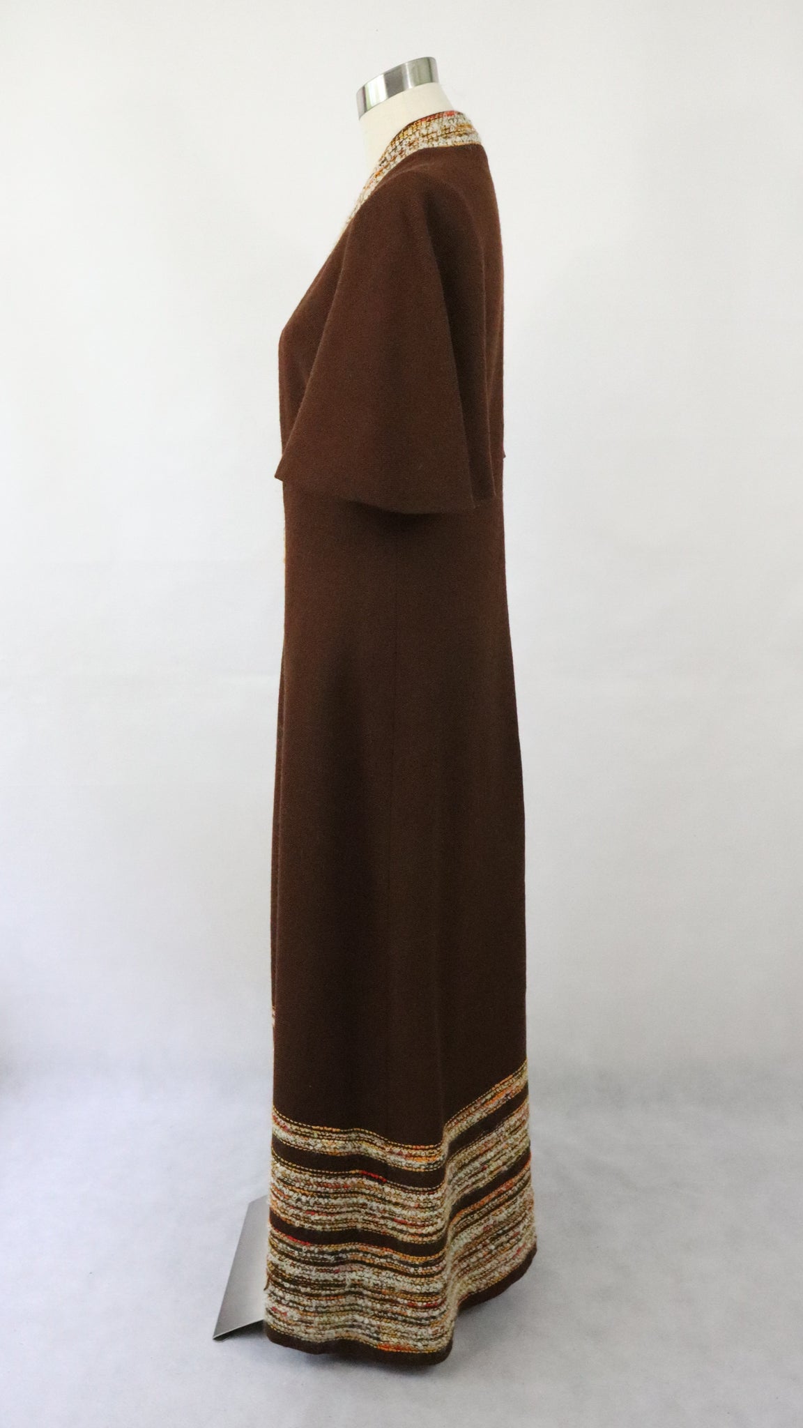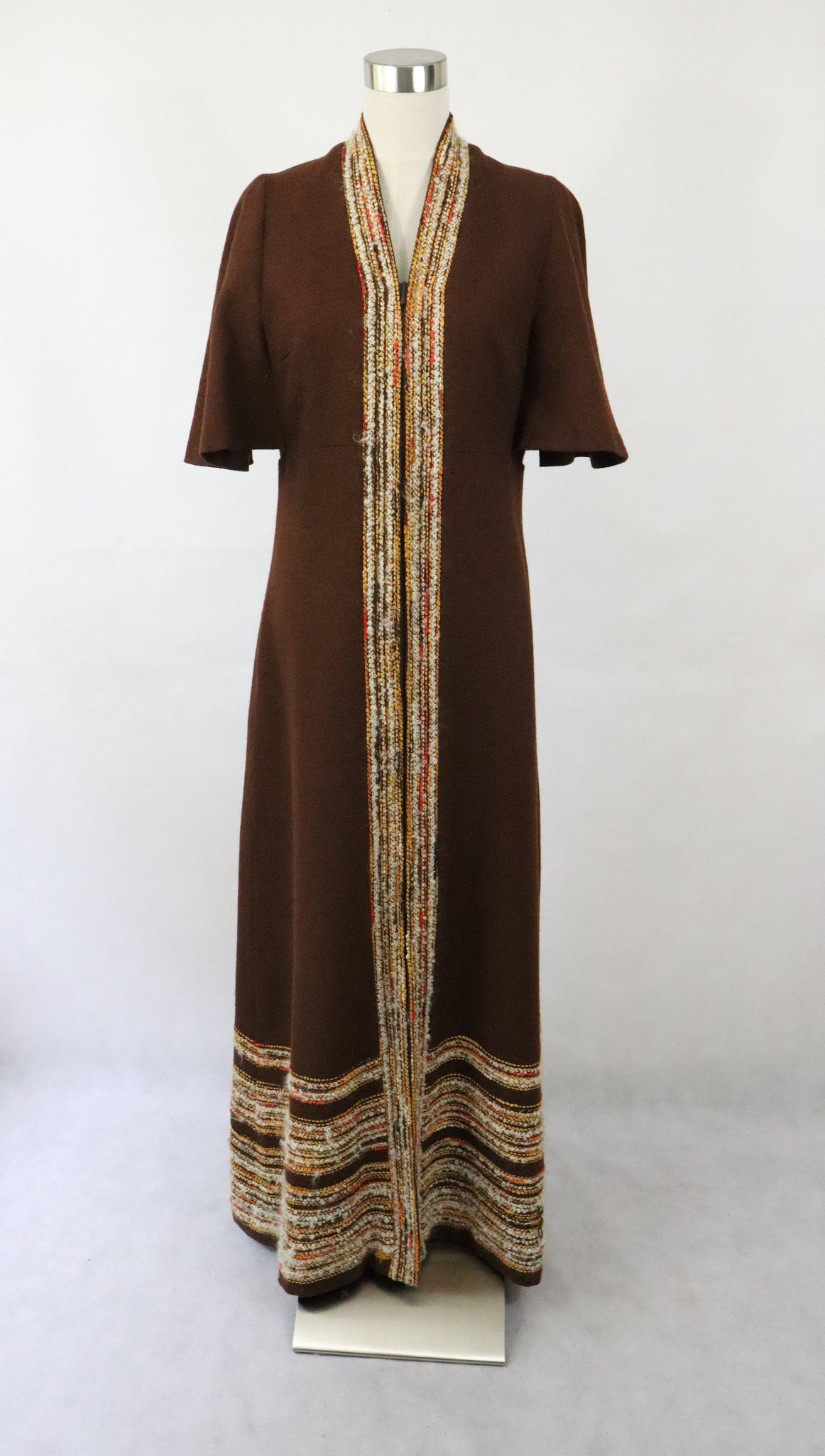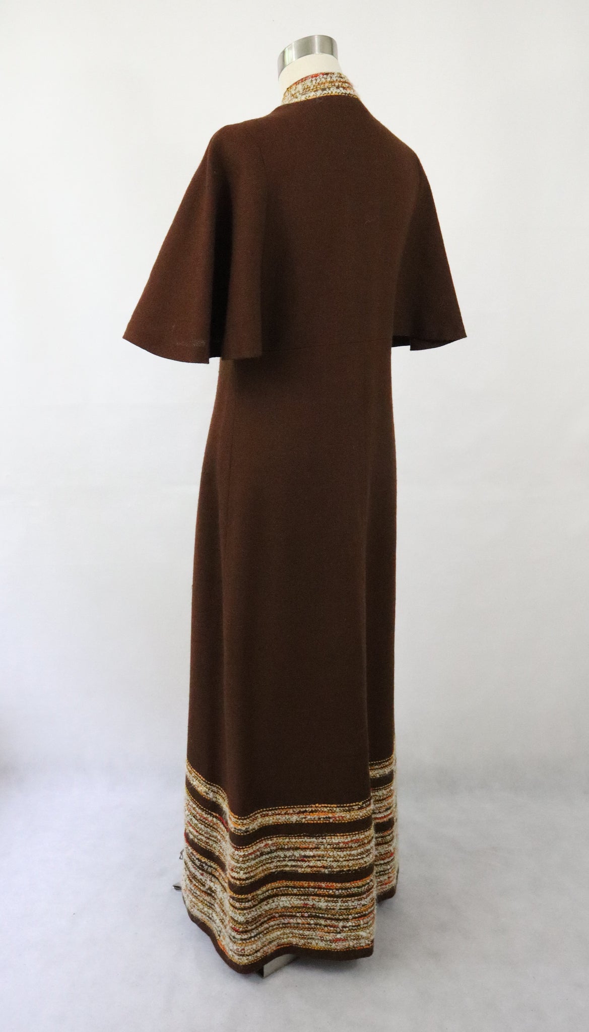 Kansallisromanttista tyyliä henkivä, tyylinsä perustella 70-luvun kotimaista vintagea edustava täyspitkä villakankainen mekko ja kolmiomallinen hapsuhuivi, valmistaja Arola, made in Finland.