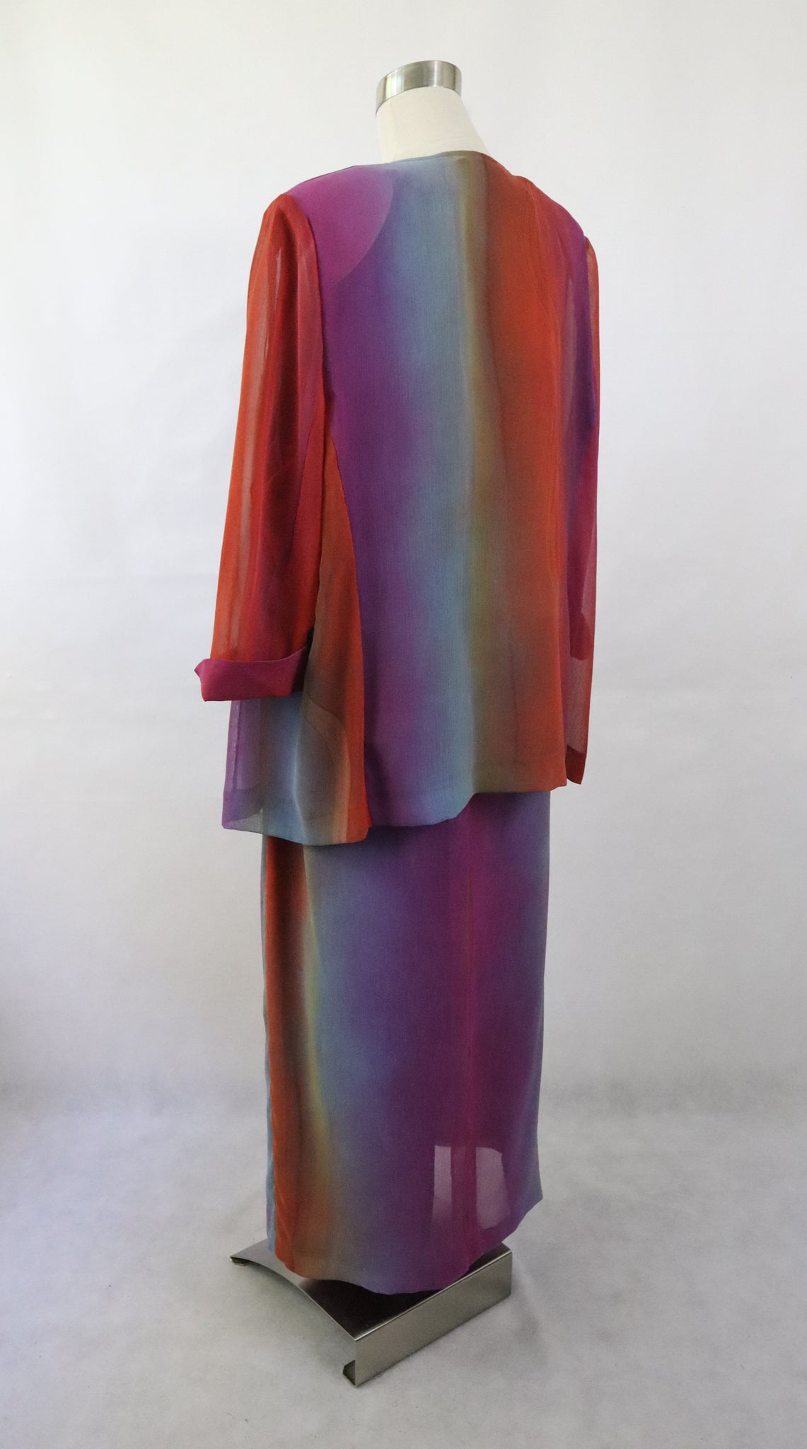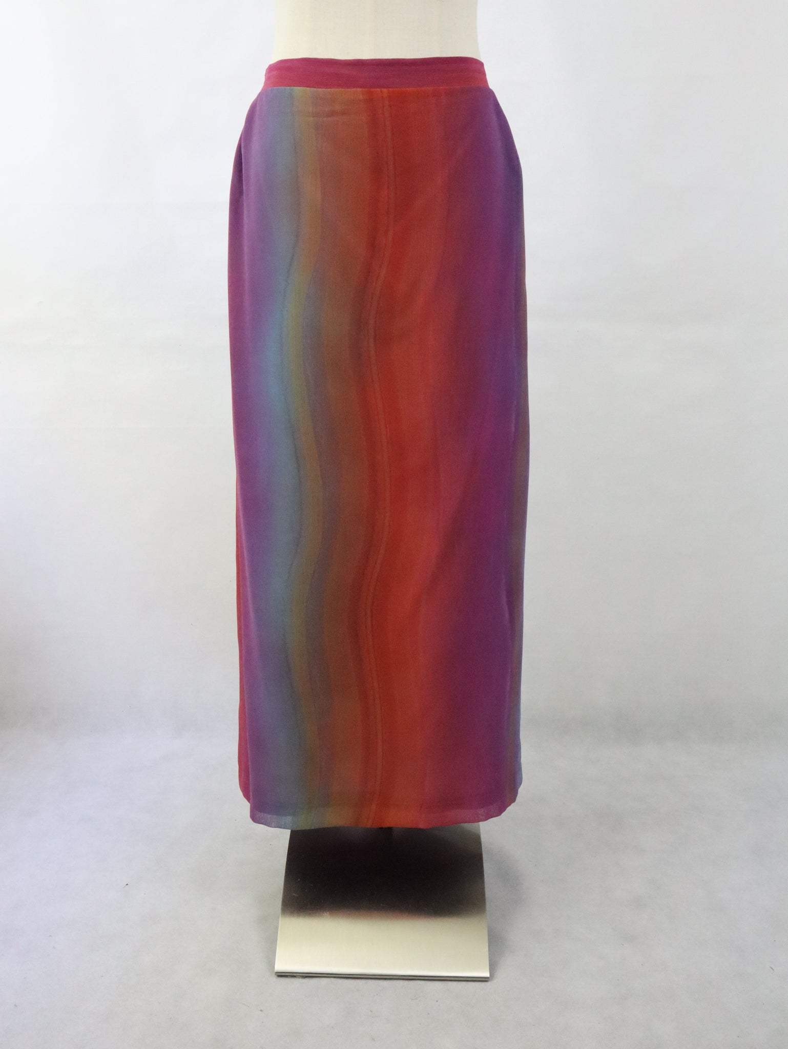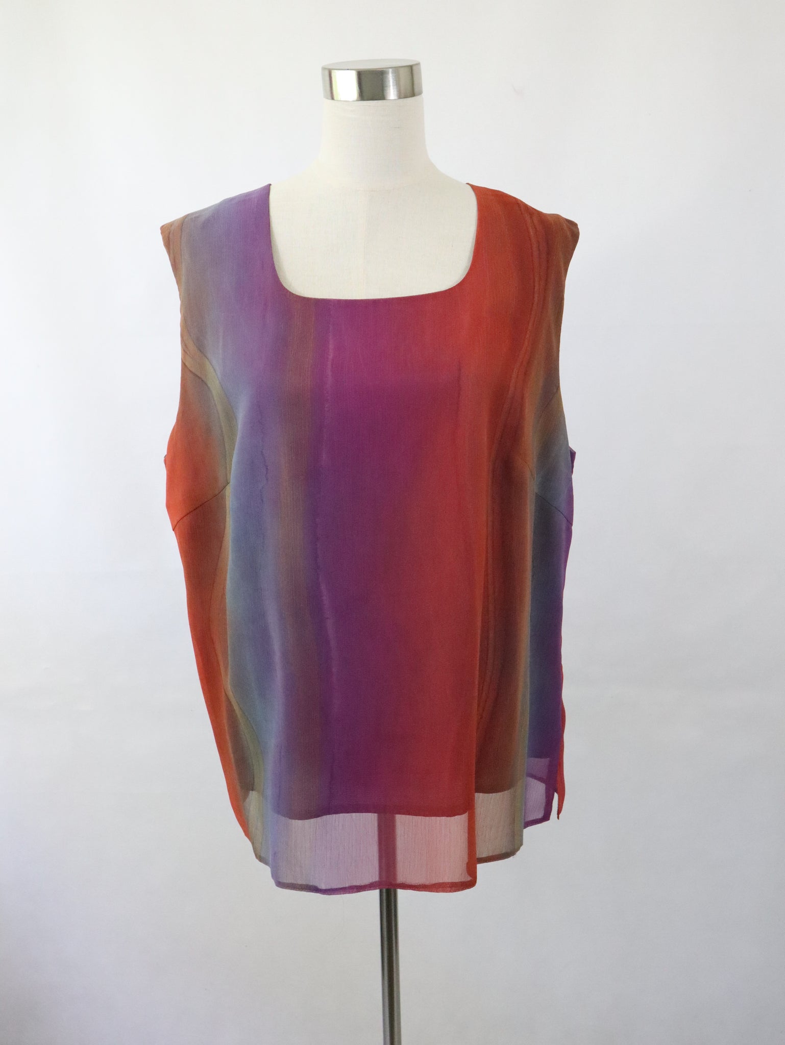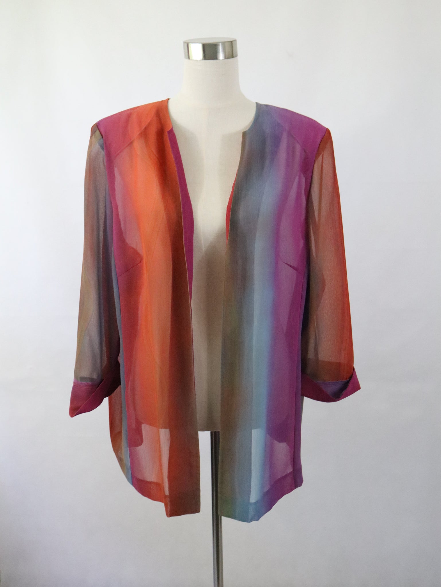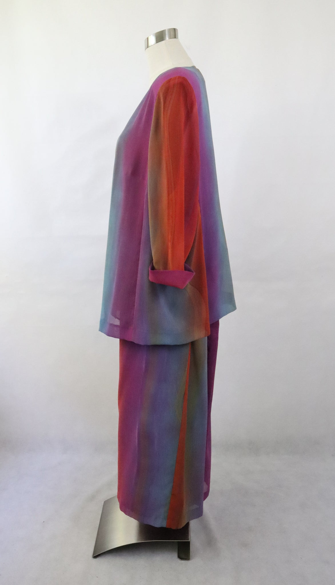 Ohut ja kevyt kuultava kreppisifonkikangas, joka on kiinnostavalla tavalla liukuvärjätty. Värimaailma on punaisen ja sinisen sävyinen. Materiaali 100% polyesteria, hienopesu 40 asteessa.