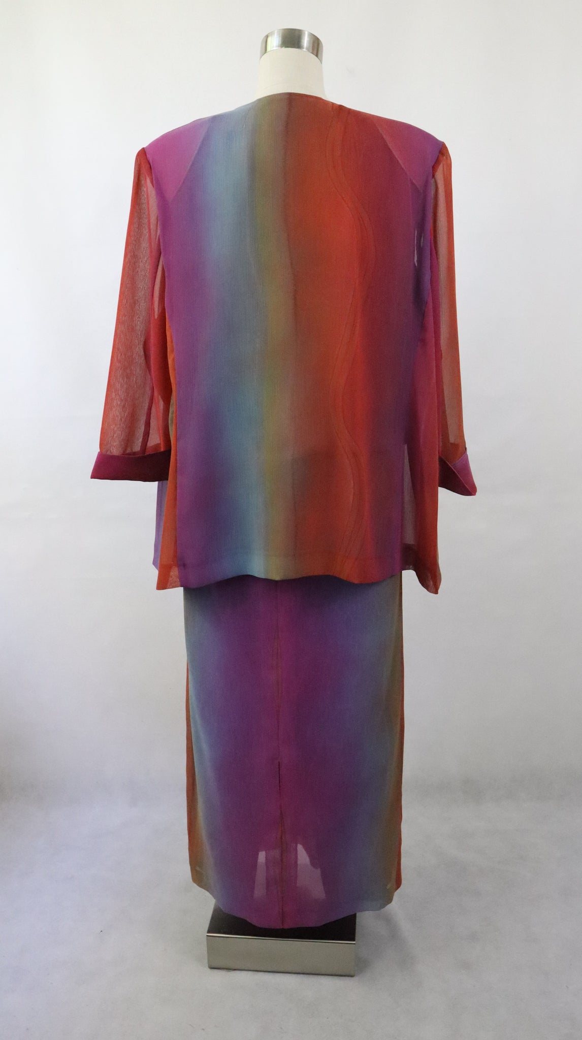 Kolmeosainen juhlava asukokonaisuus, johon kuuluu pitkä hame, toppi ja kevyt jakku, valmistaja Modelia, made in Finland.
