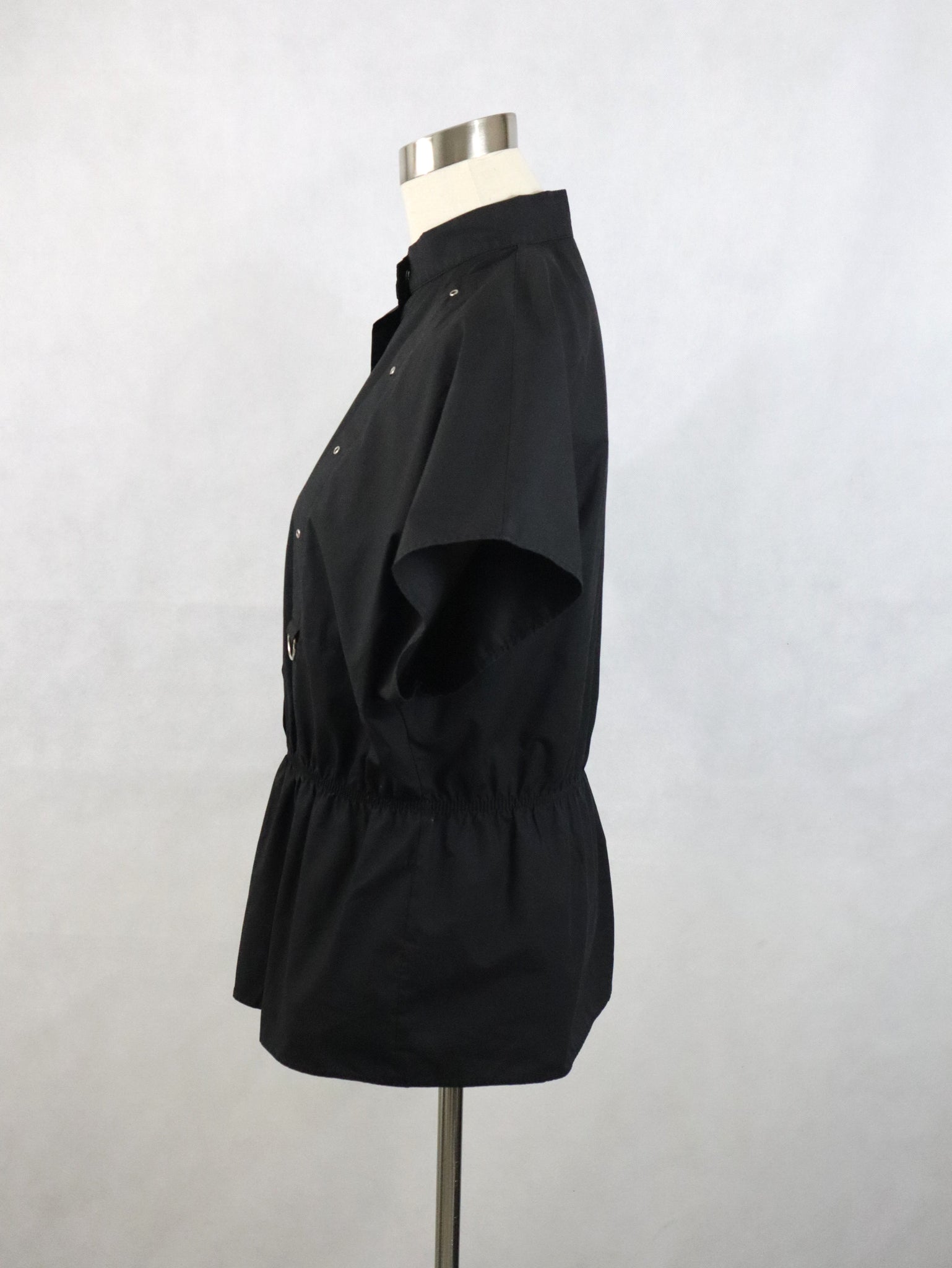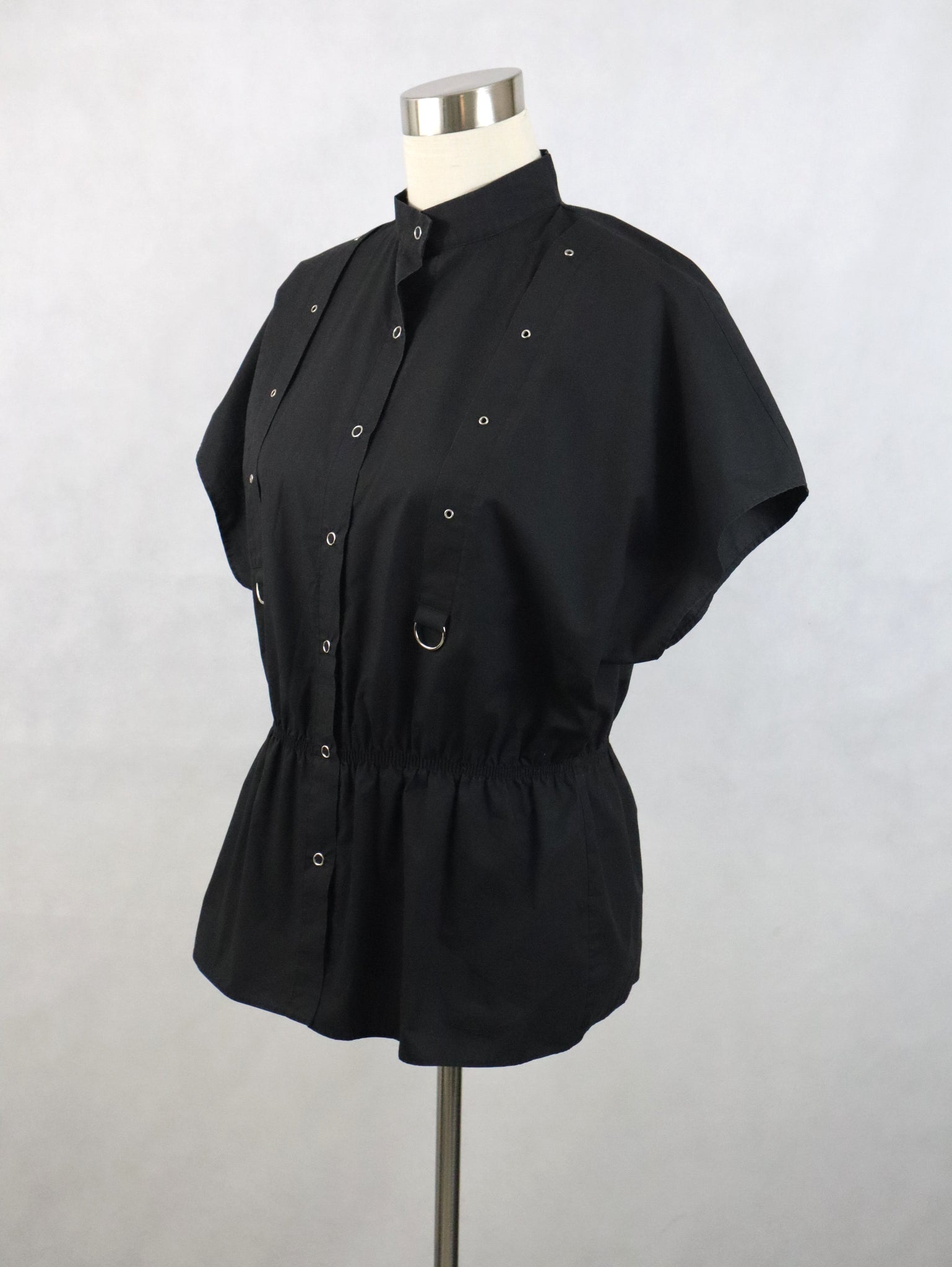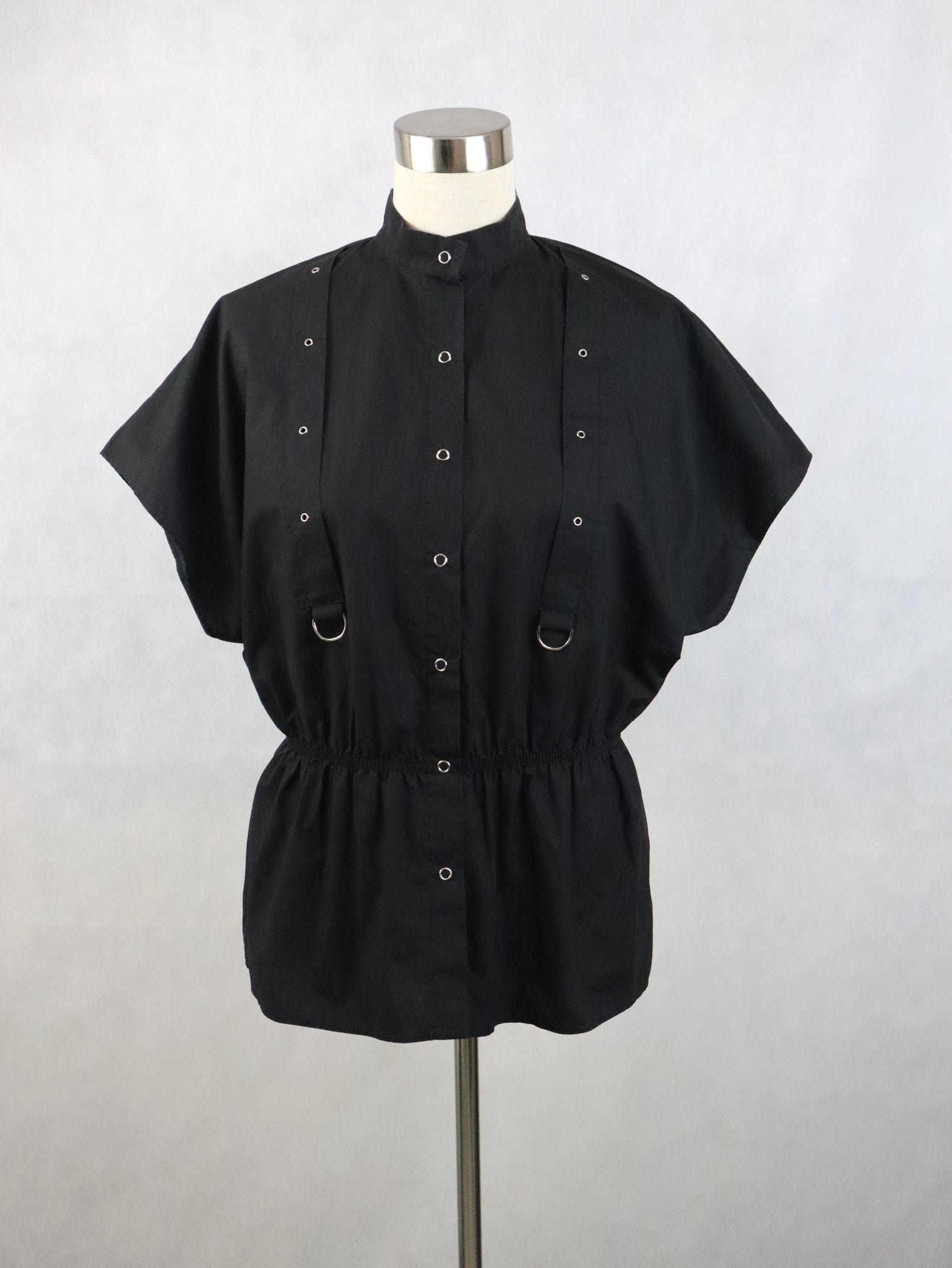 Puserossa on madallettu hartialinja ja leveät holkkihihat. Pusero kiinnitetään neppareilla. Puseron etuosaa somistavat hopeanväriset metalliniitit ja -renkaat. Vyötäröllä on joustava kuminauha.
