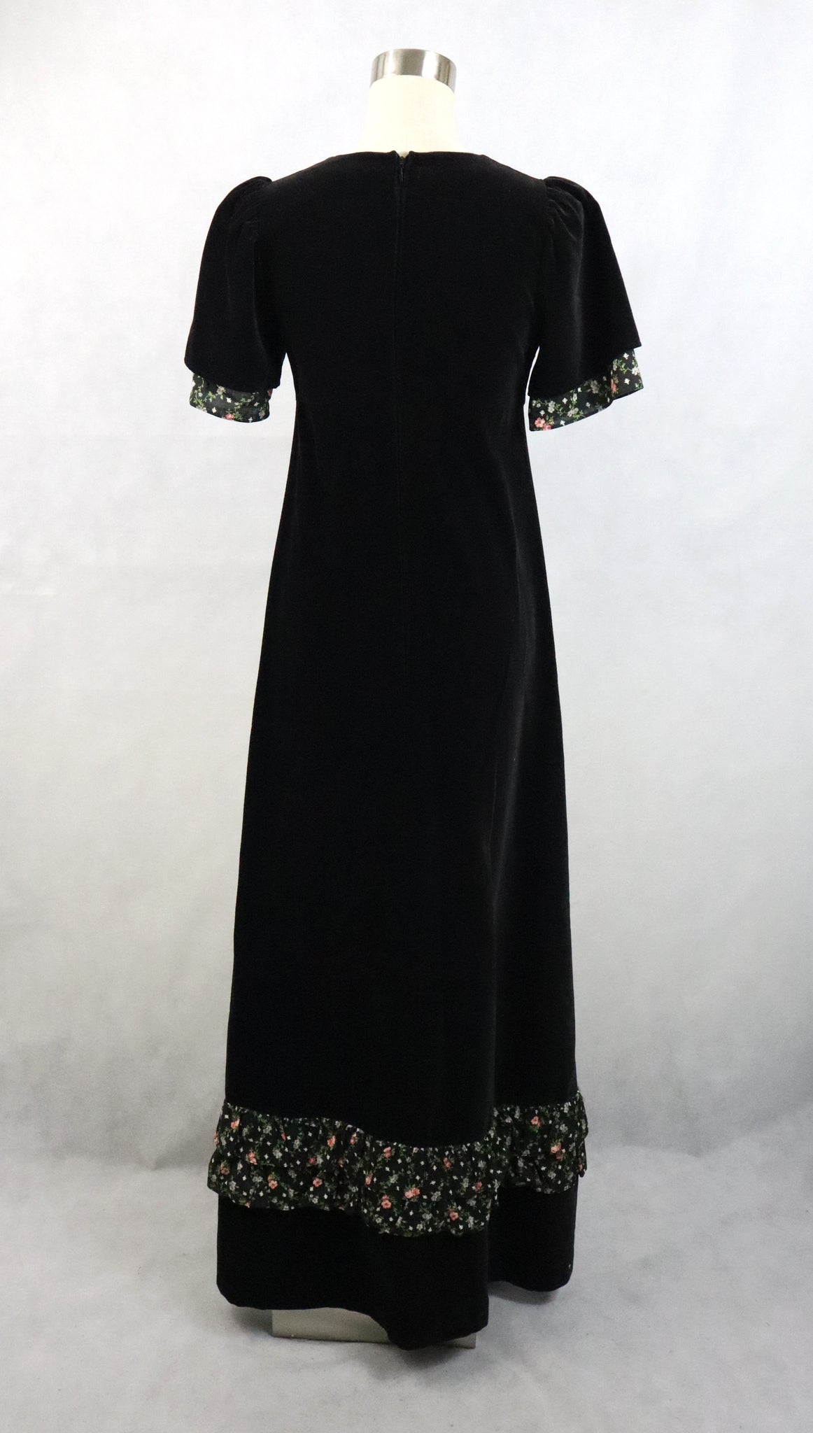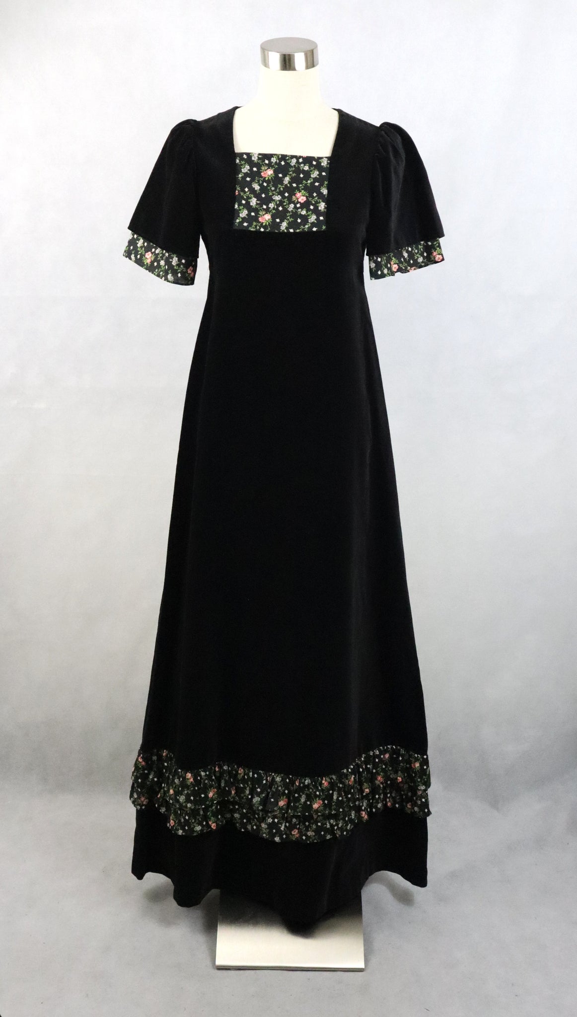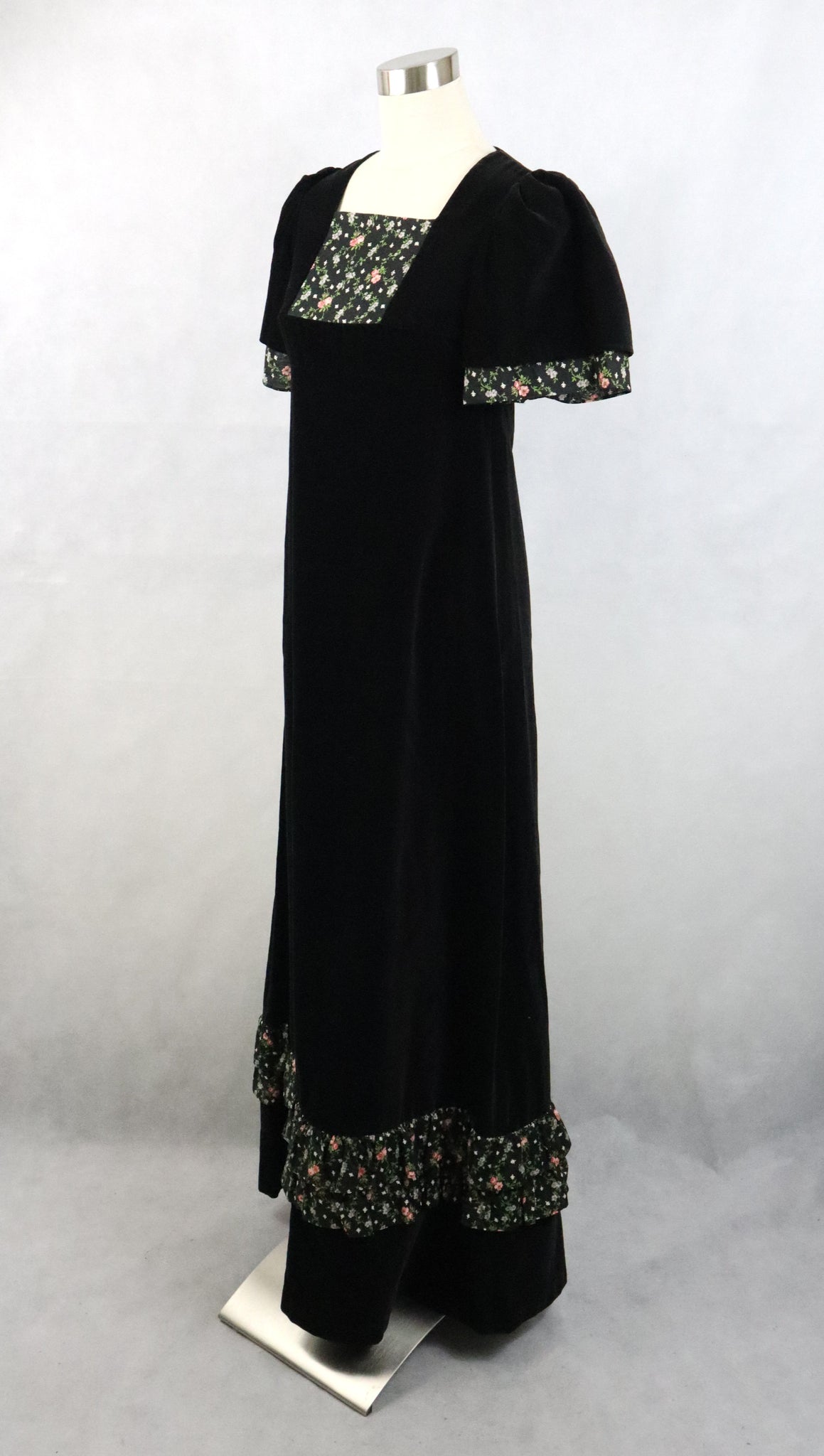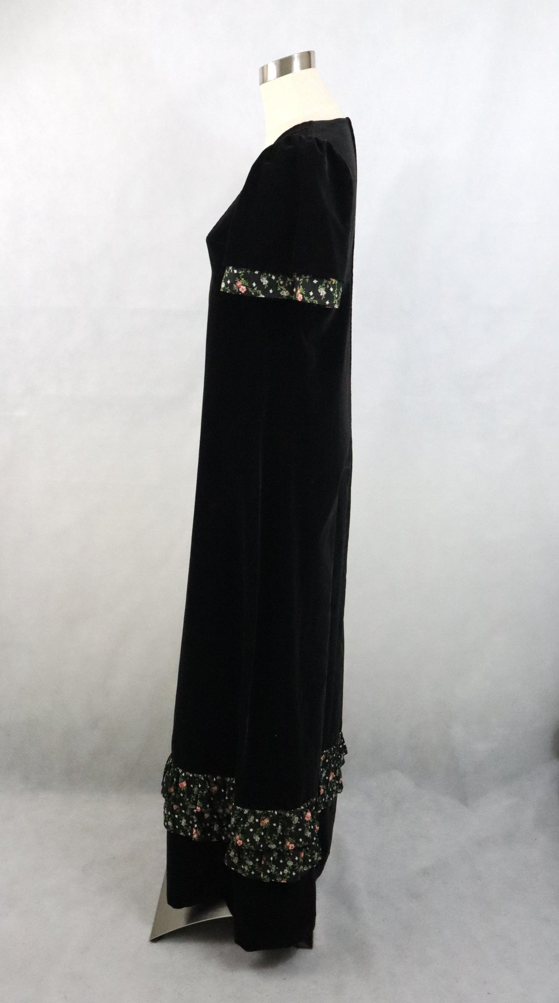 Musta maksimittainen samettimekko 70-luvulta, valmistaja Pia & Paula by Scantex Oy, made in Finland.