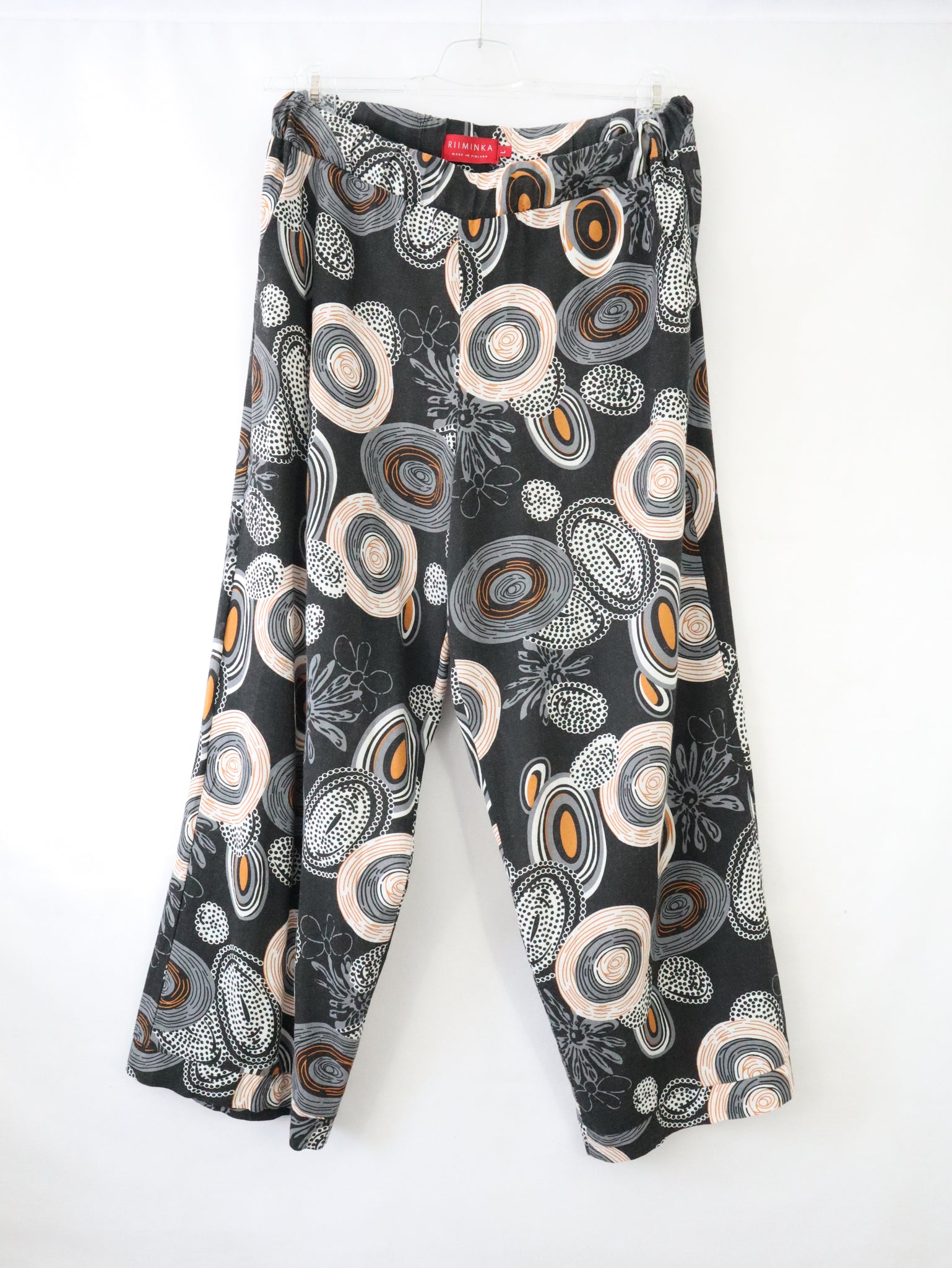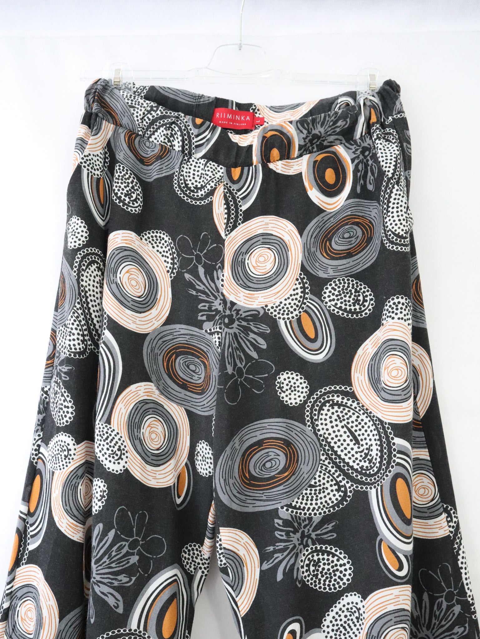 Kuviolliset rennot ja mukavat housut, valmistaja Riiminka, made in Finland.