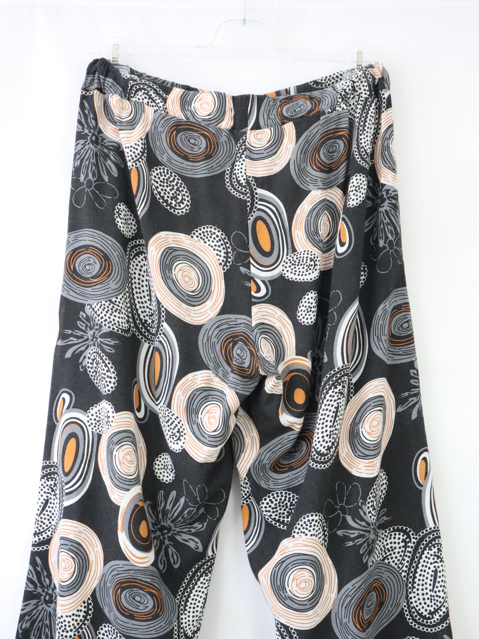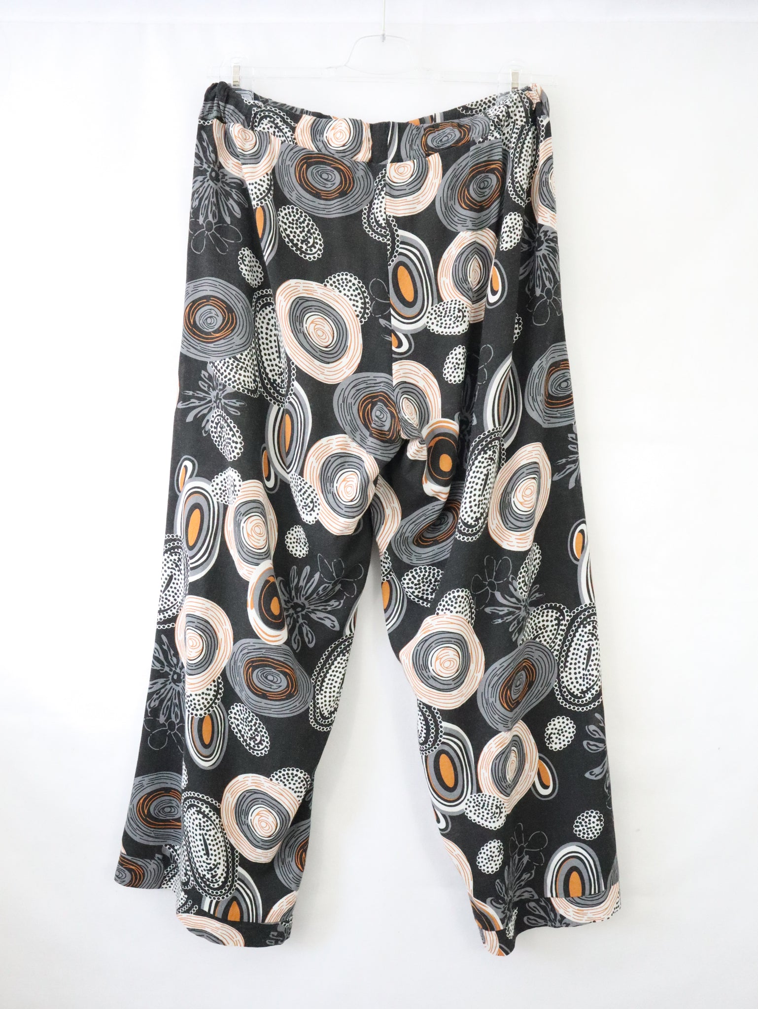 Housut on valmistettu ohuehkosta villa-viskoosisekoitekankaasta, jossa on mustalla / tummanharmaalla pohjalla harmaan, valkoisen ja oranssin värinen pyörre-kuosi. Materiaali on 15% villaa ja 85% viskoosia, hienopesu 40 asteessa.
