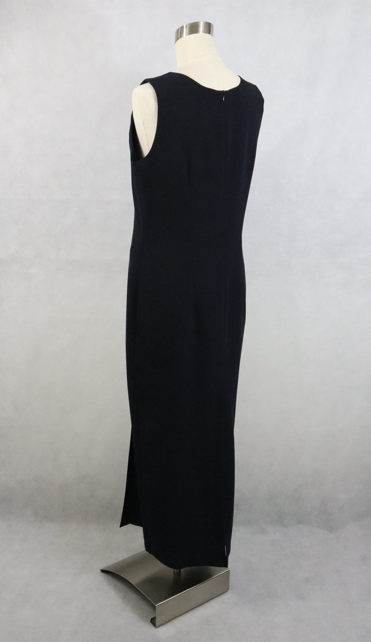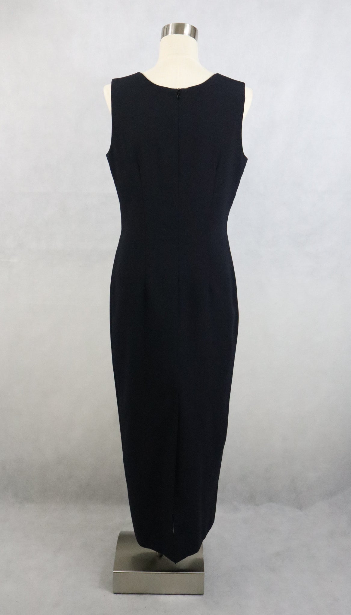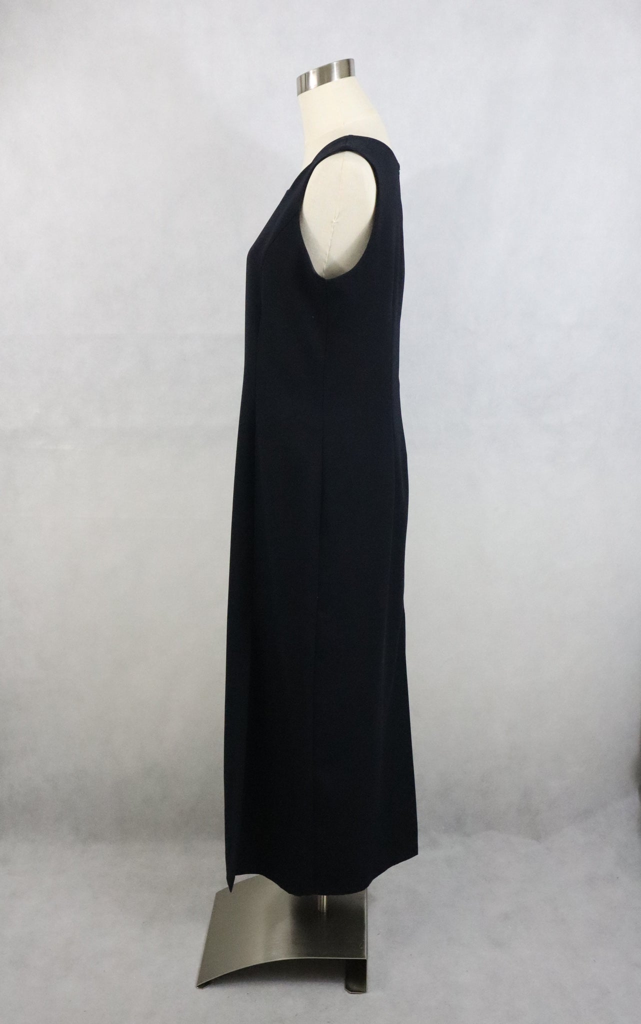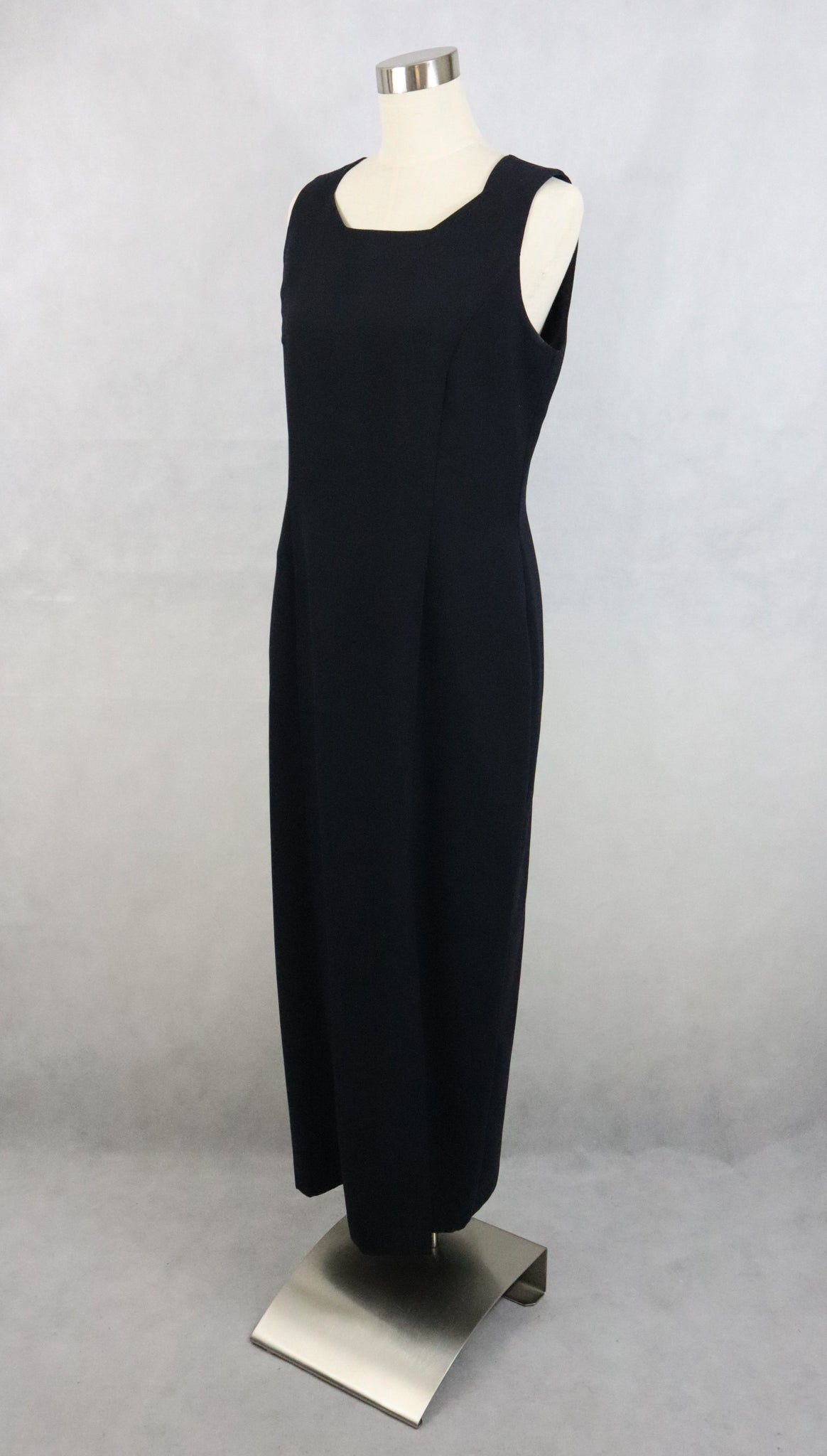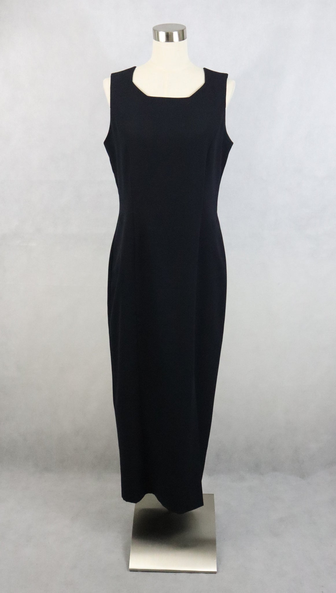 Ajaton ja monikäyttöinen musta vartaloa myötäilevä pitkä hihaton mekko arviolta 90-luvun lopulta, valmistaja Shann by Pola, Lappeenranta, made in Finland.