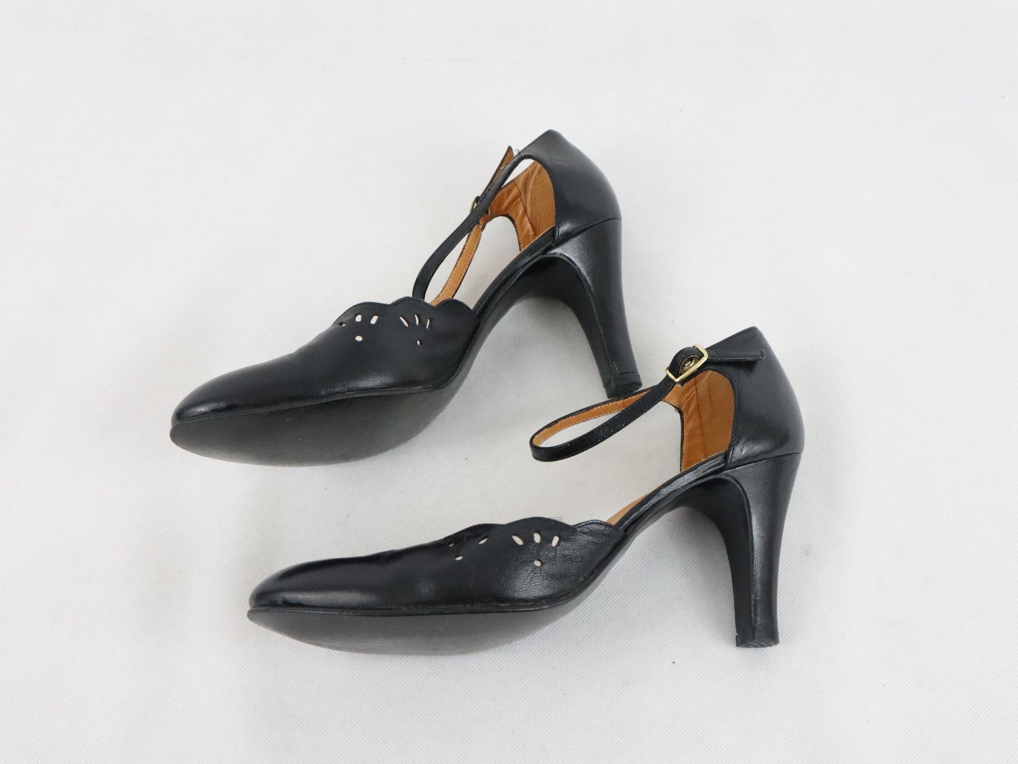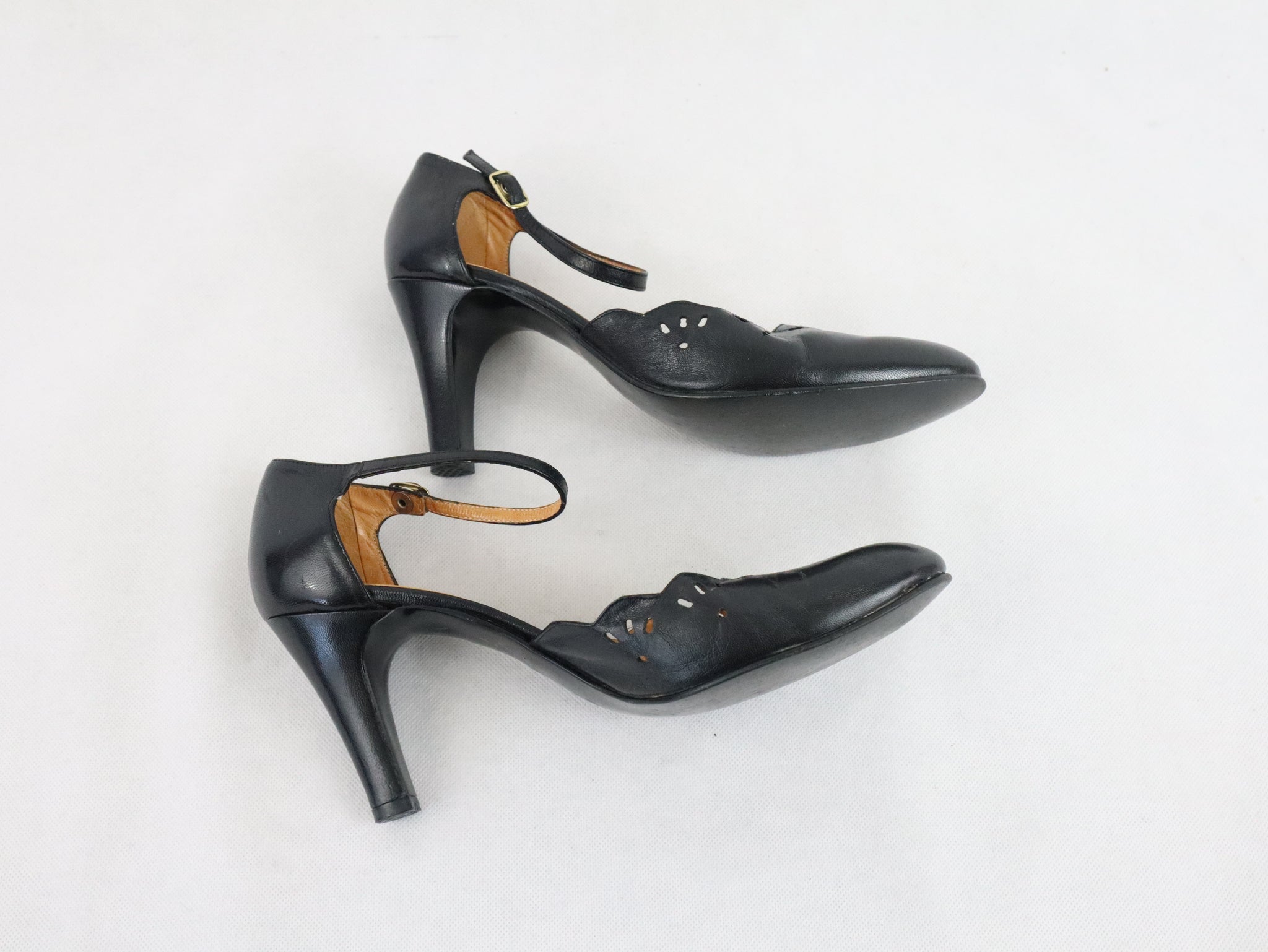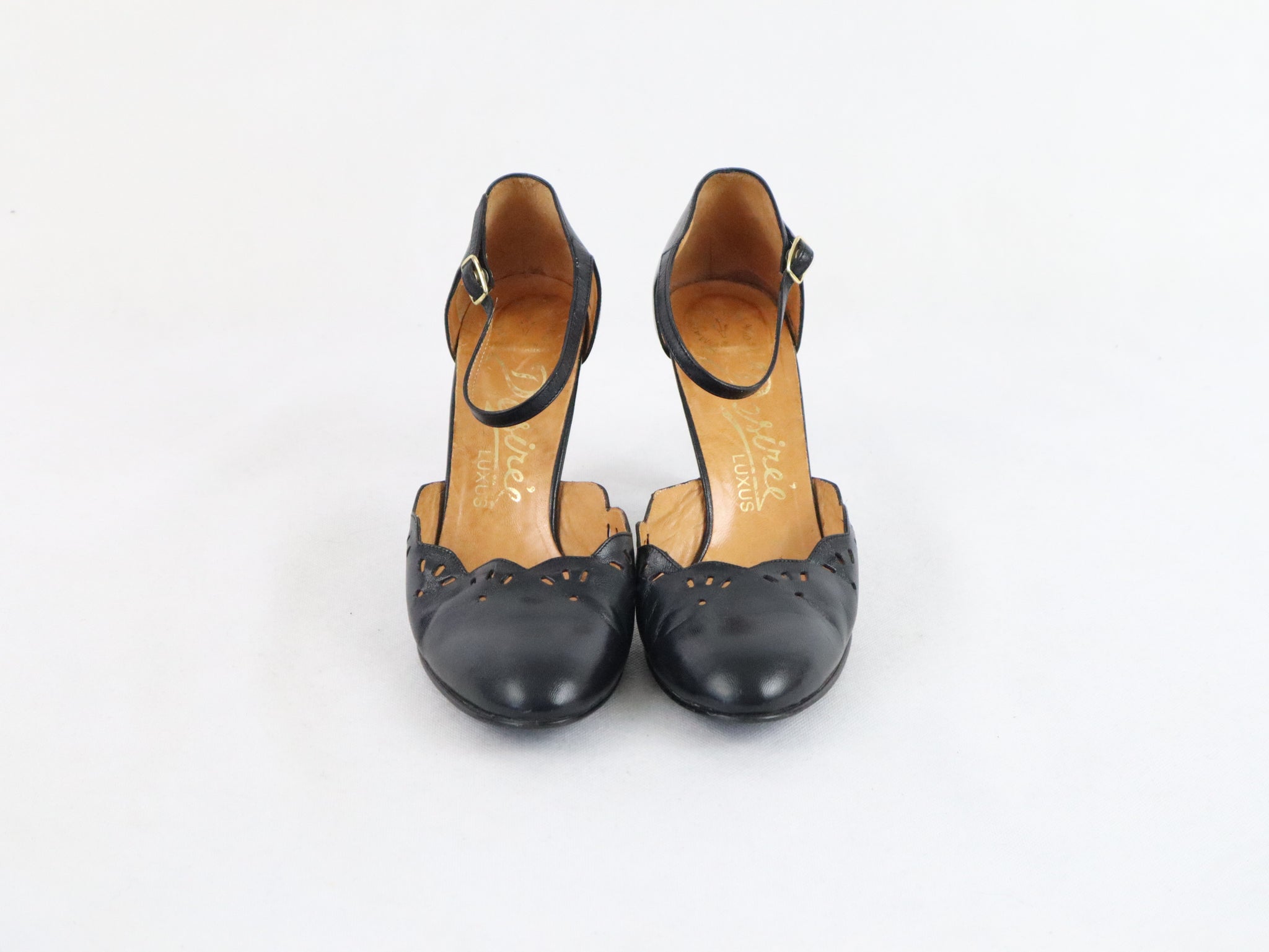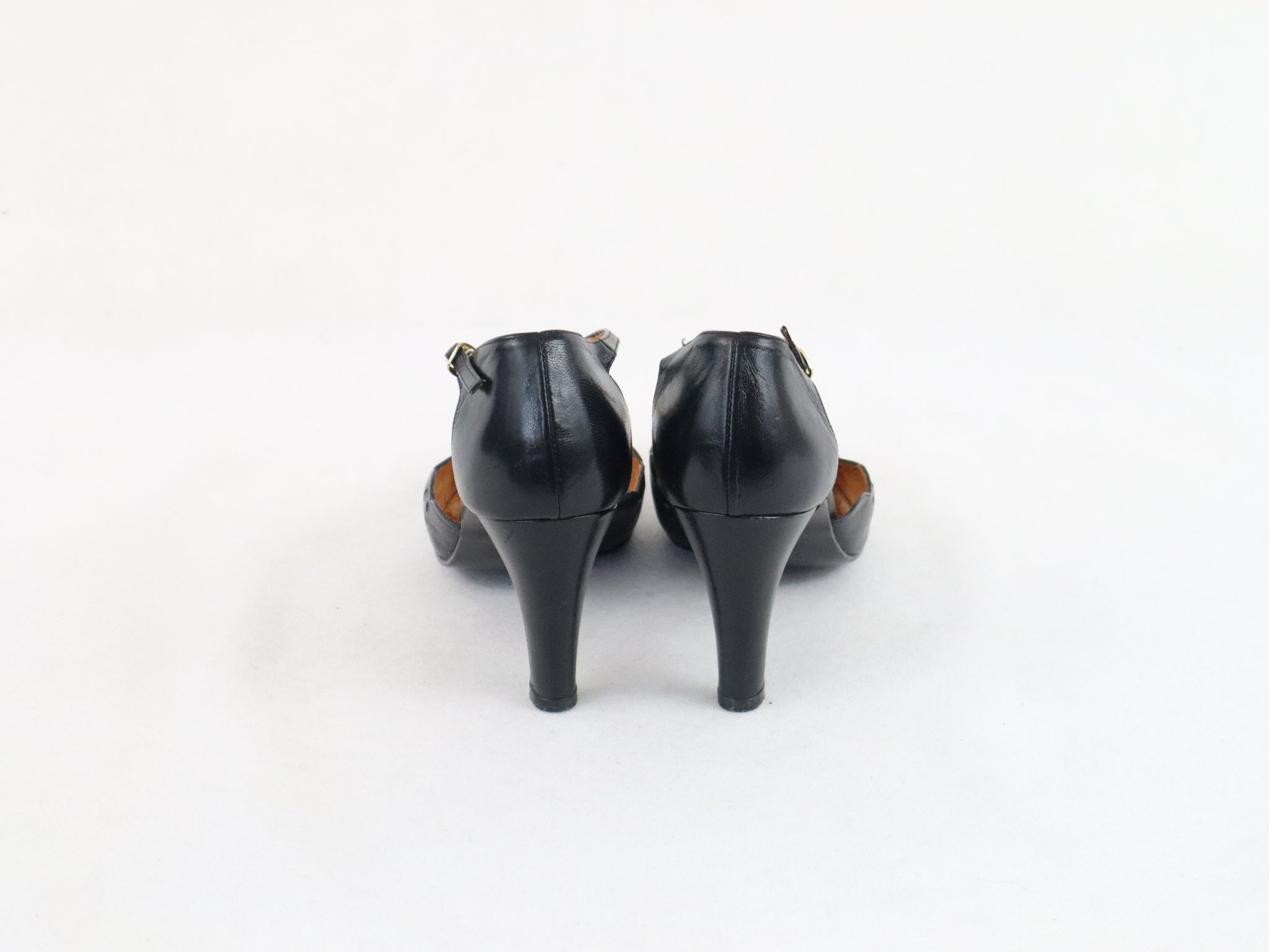 Mustat nahkaiset korkokengät, valmistaja Desirée Luxus, made in Finland. Kengät ovat kotimaista vintagea arviolta 70-80-luvulta, voivat olla sitä vanhemmatkin.