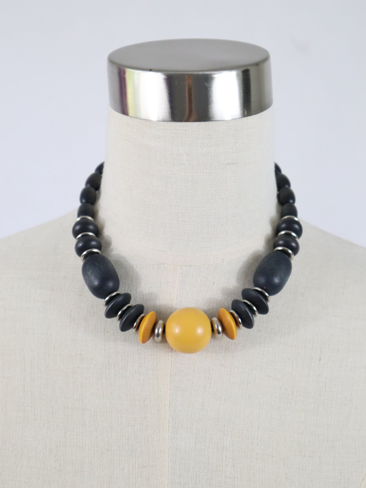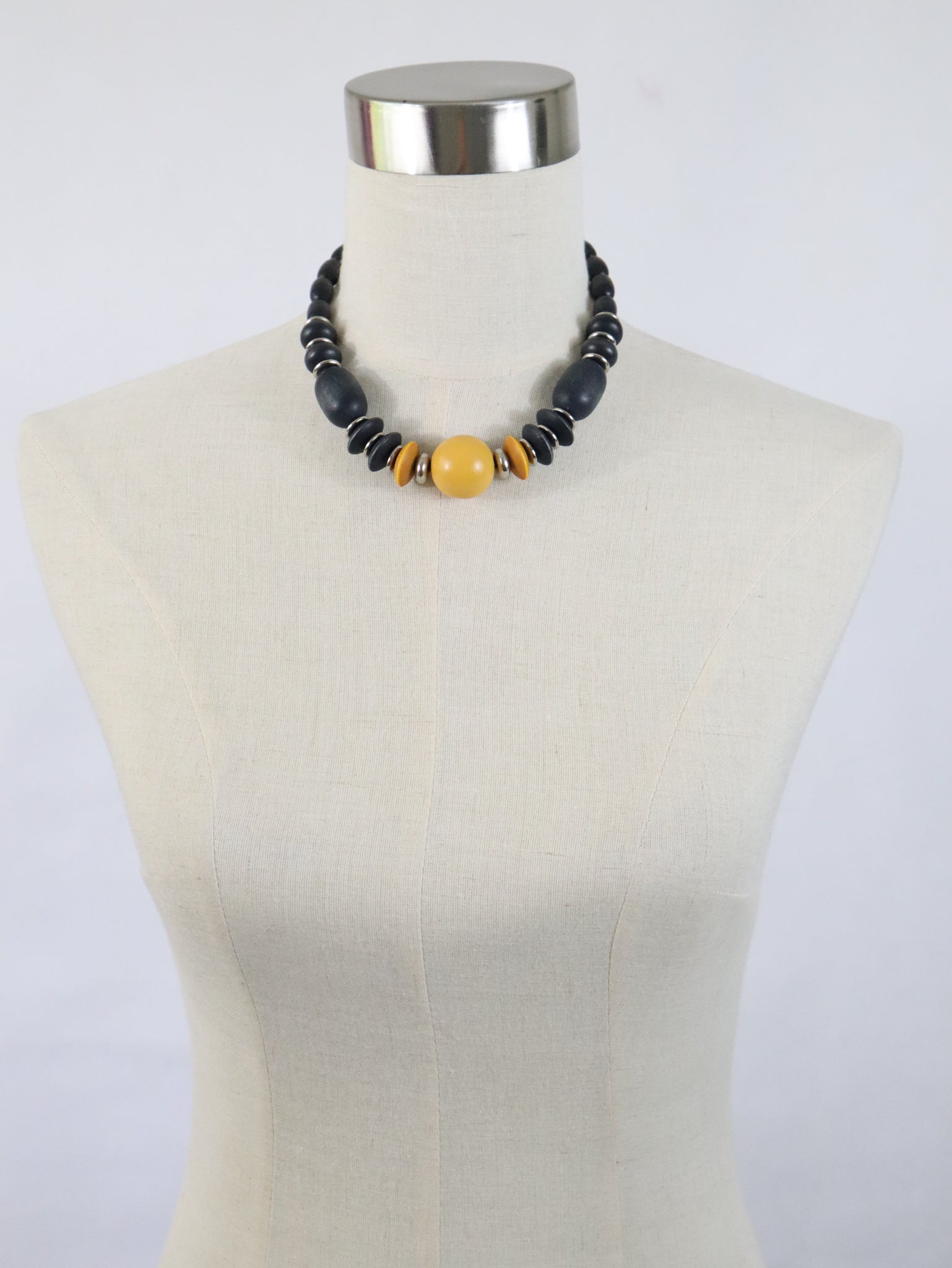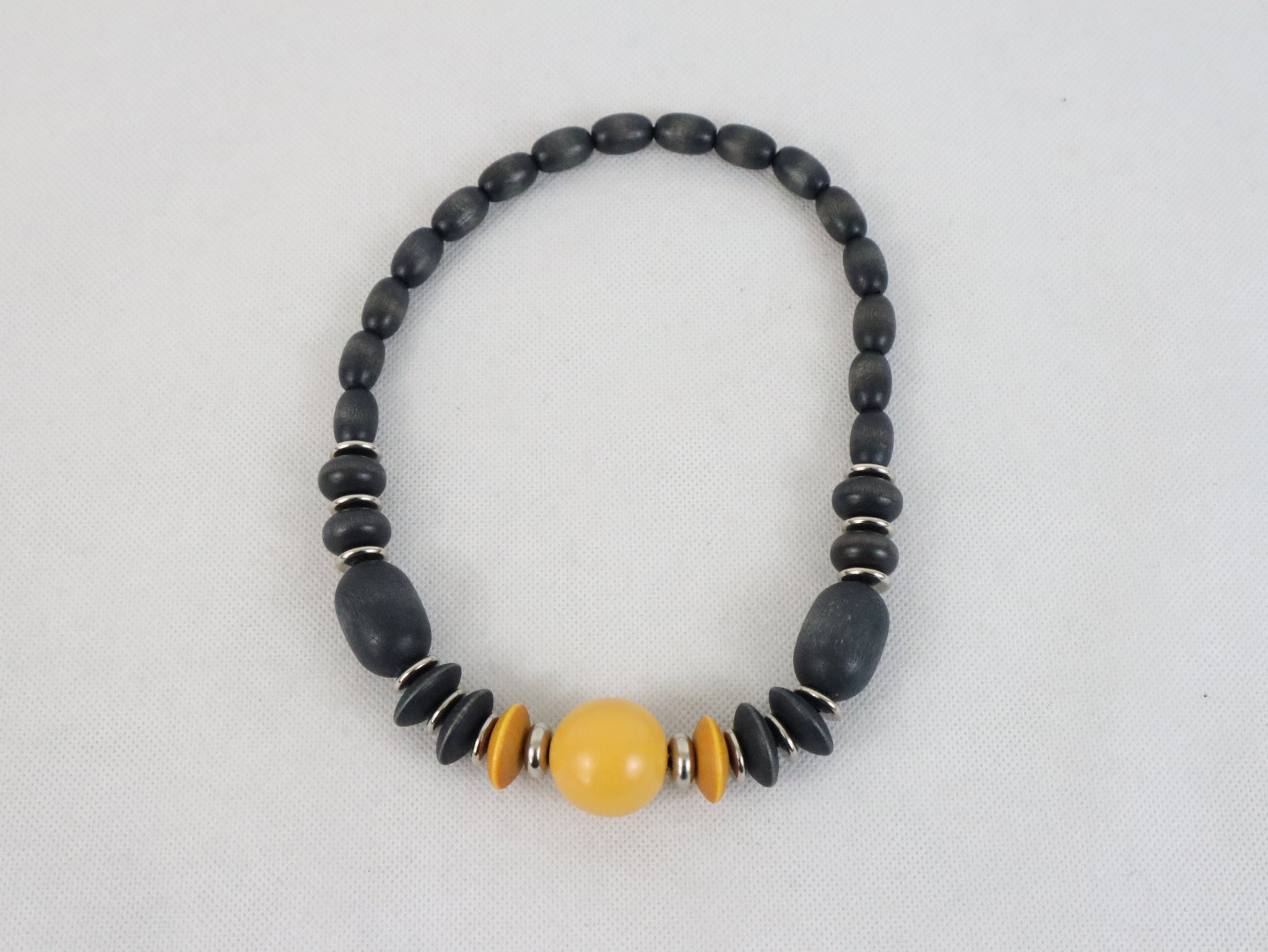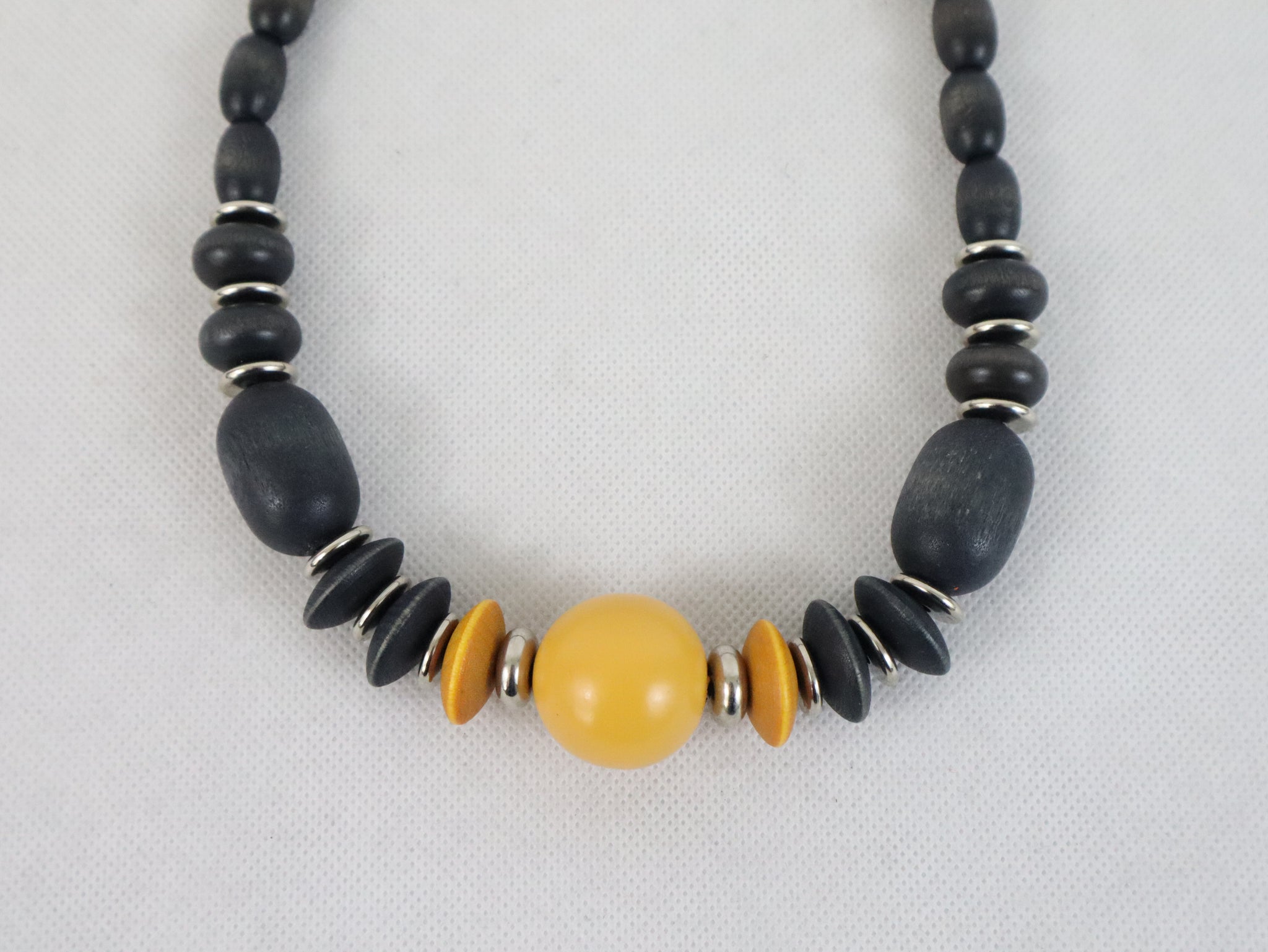 Aarikan hieman jo vanhempaa tuotantoa edustava kaulakoru, jossa eri kokoisia keltaisia ja mustia puuhelmiä ja hopeanvärisiä metallihelmiä on pujotettu joustavaan kuminauhaan.