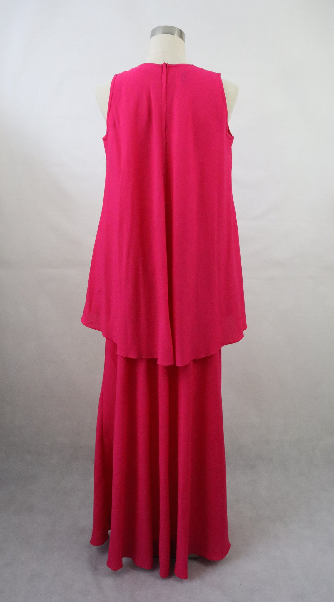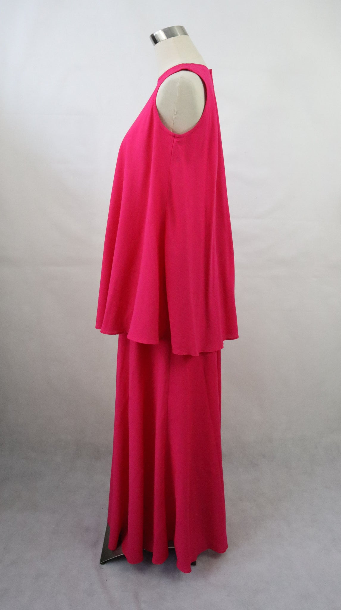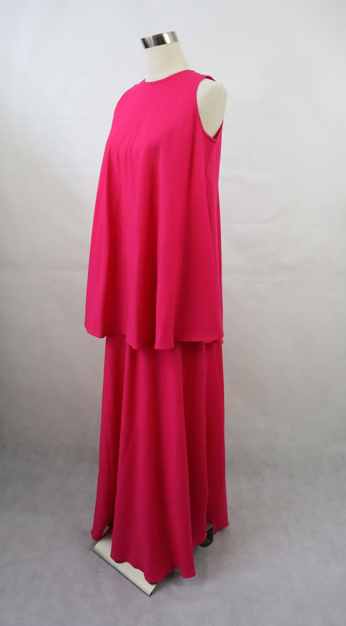 Asuun kuuluu hihaton a-linjainen toppi ja maksipituinen kellohelmainen hame. Hameessa on sivulla vetoketju. Helma levenee a-linjaisesti, kauniisti kellottuen. Hame on vuorittamaton. Topissa on pyöreä pääntie ja selässä vetoketju. Toppi on myös malliltaan a-linjainen ja vuorittamaton. Yhdessä toppi ja hame muodostavat kauniisti laskeutuvan, näyttävästi hulmuavan kokonaisuuden.