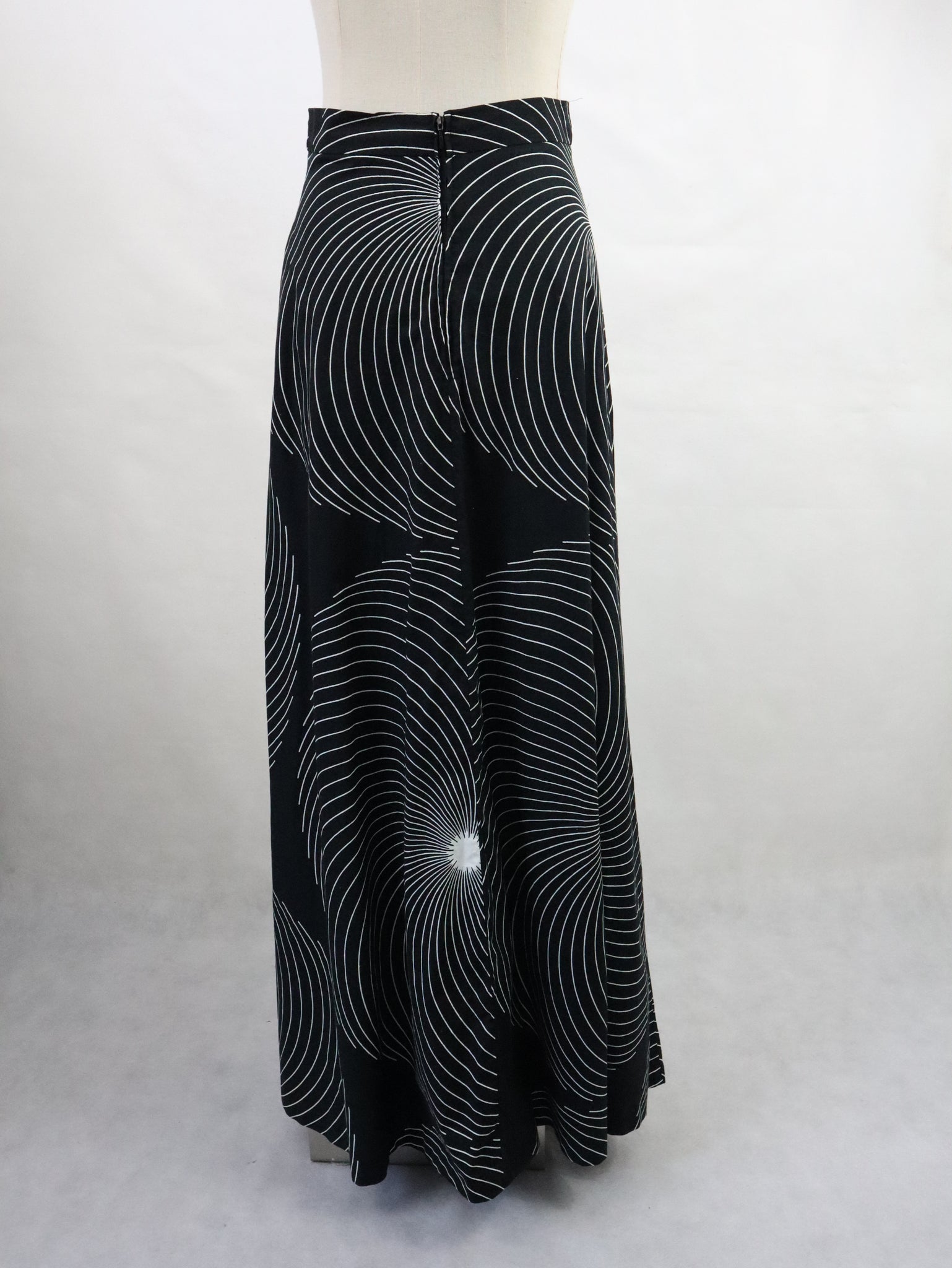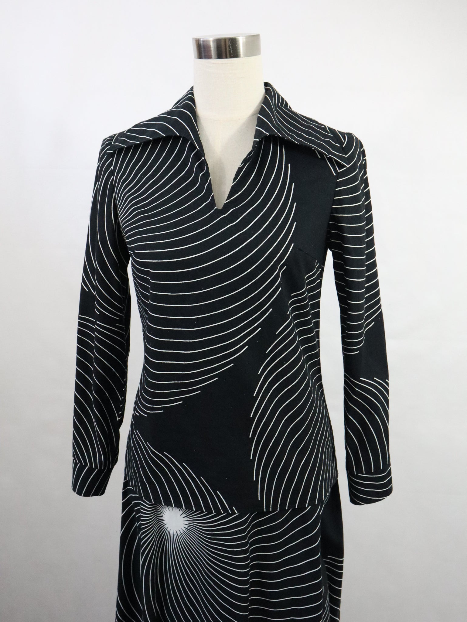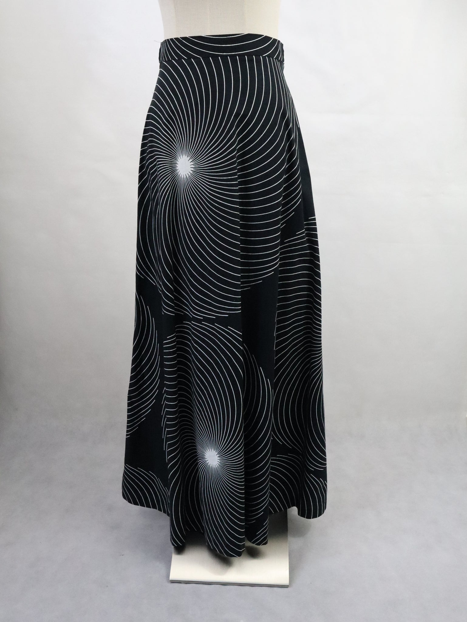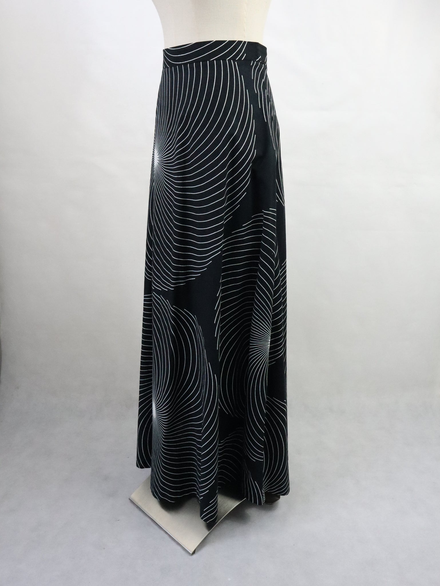 Mustavalkoinen pusero ja maksihame -yhdistelmä 70-luvun kotimaista vintagea, valmistaja Fenno-Sport, made in Finland.
