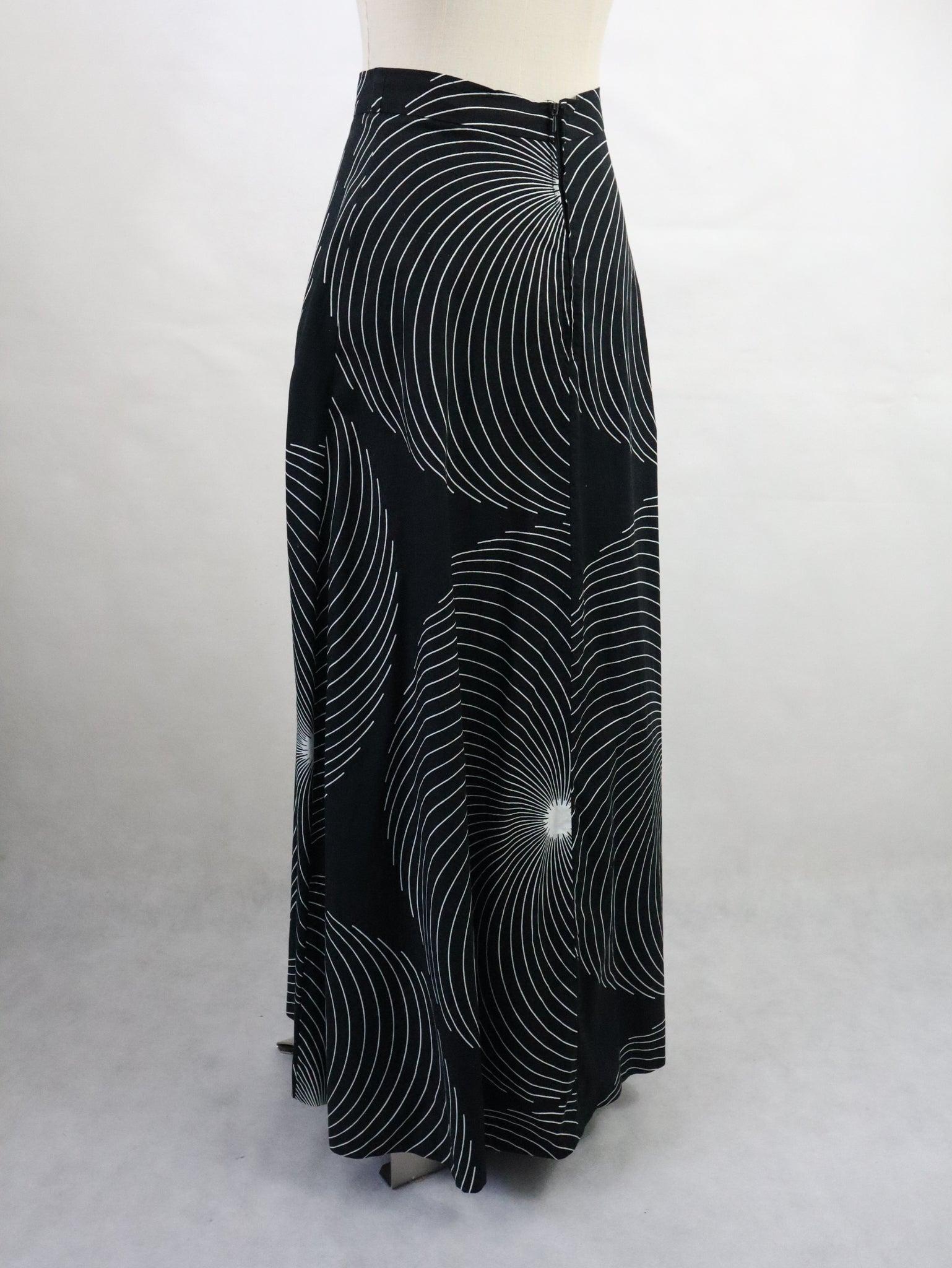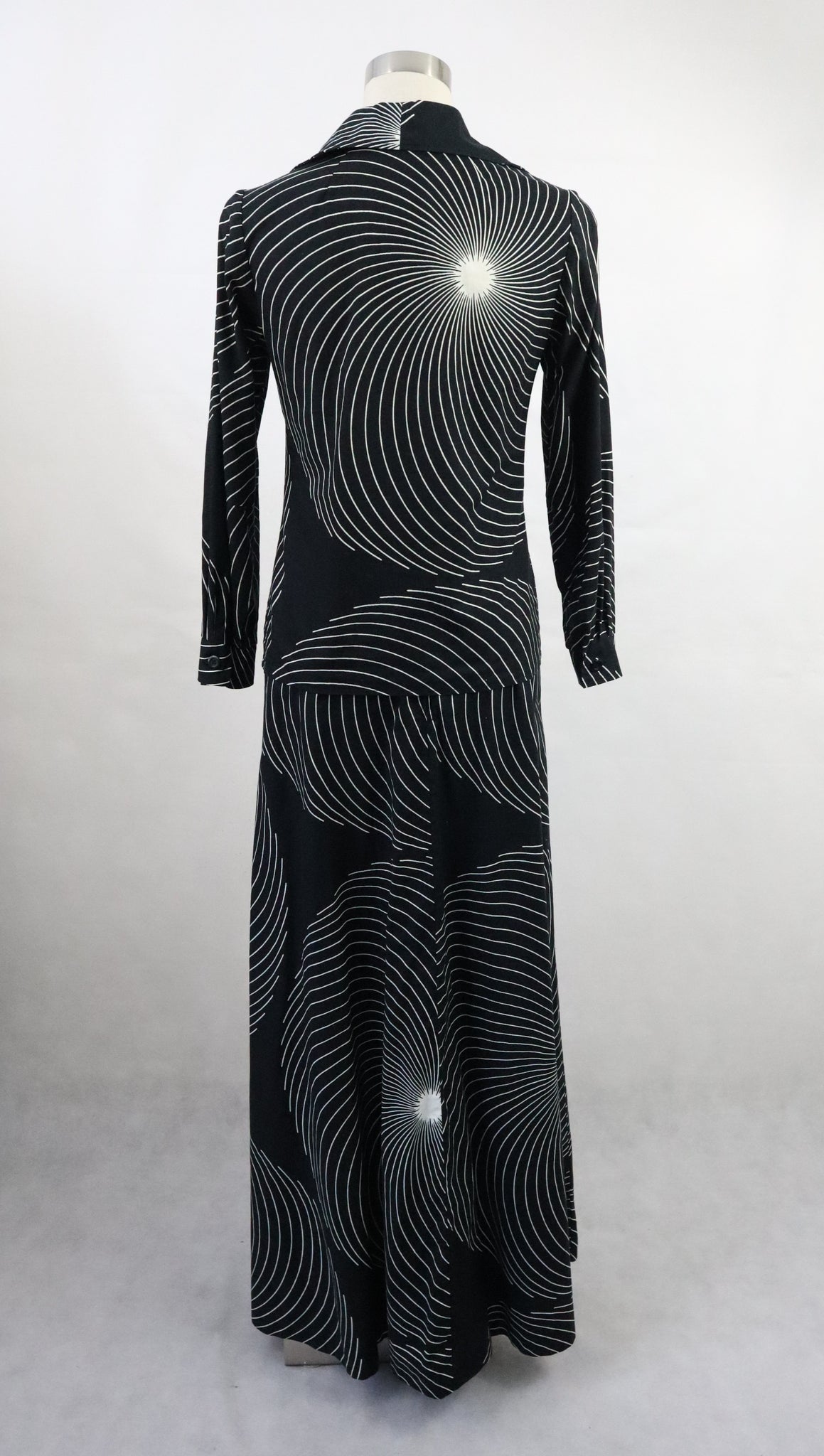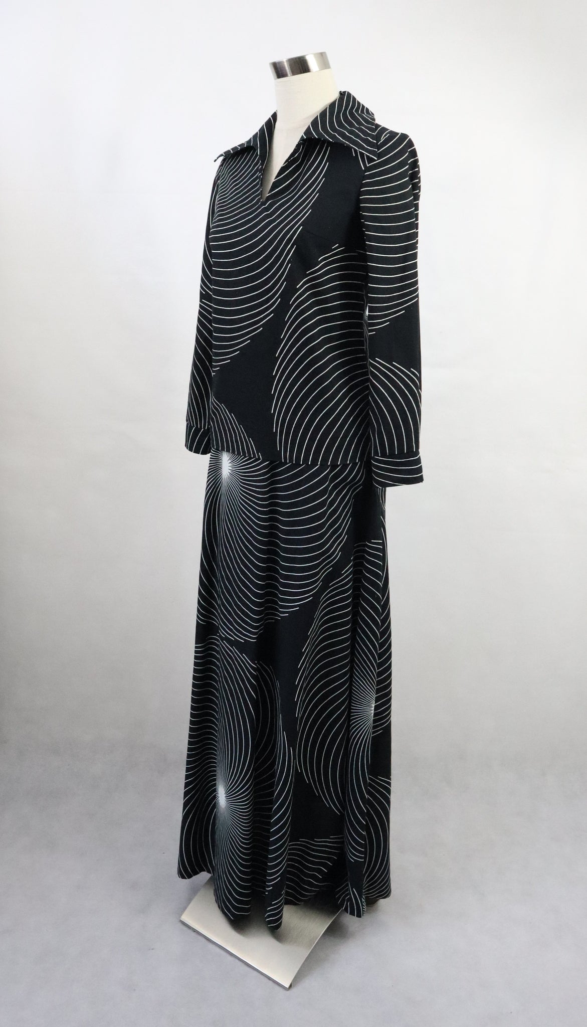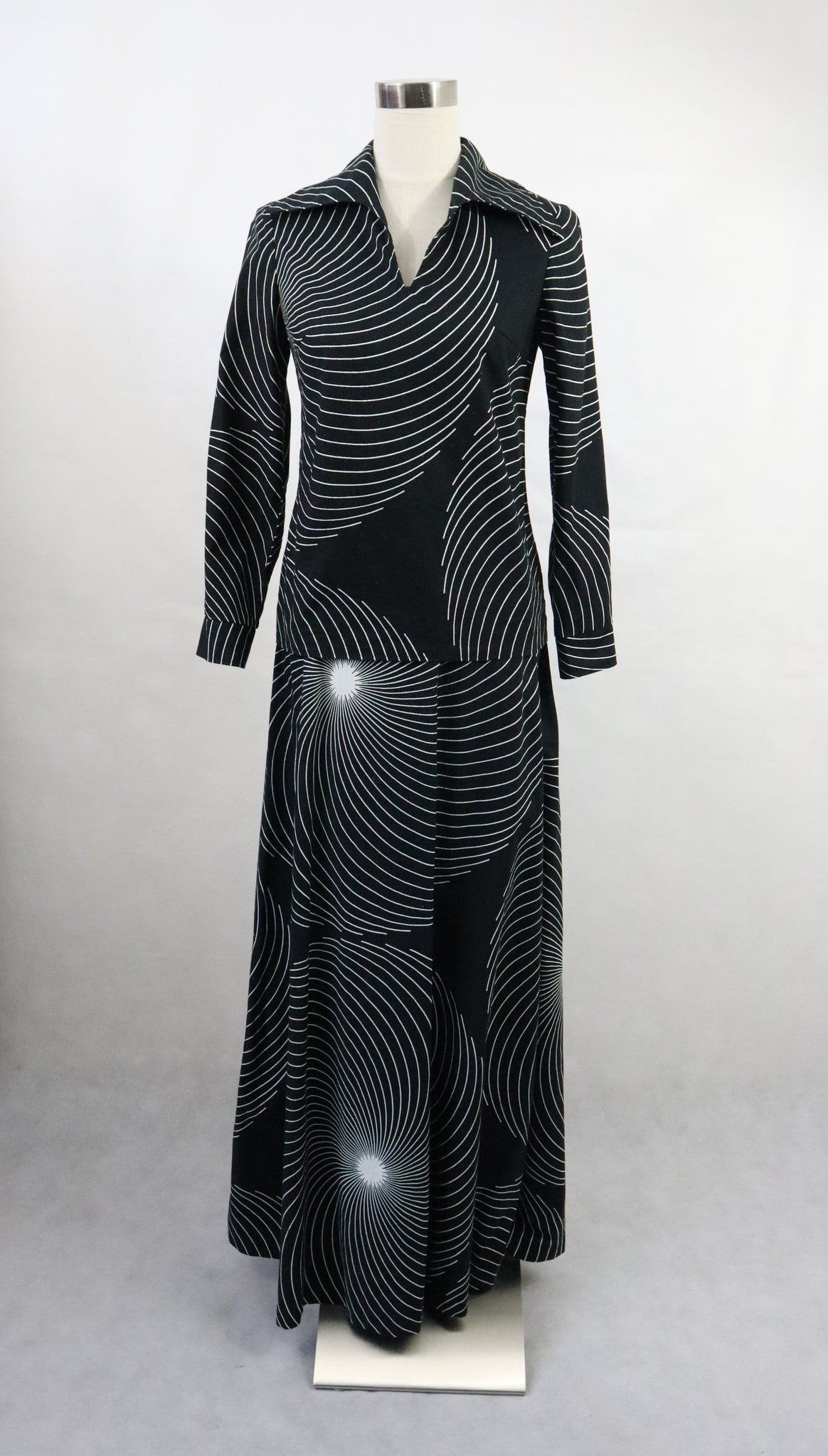 Mustavalkoinen pusero ja maksihame -yhdistelmä 70-luvun kotimaista vintagea, valmistaja Fenno-Sport, made in Finland.