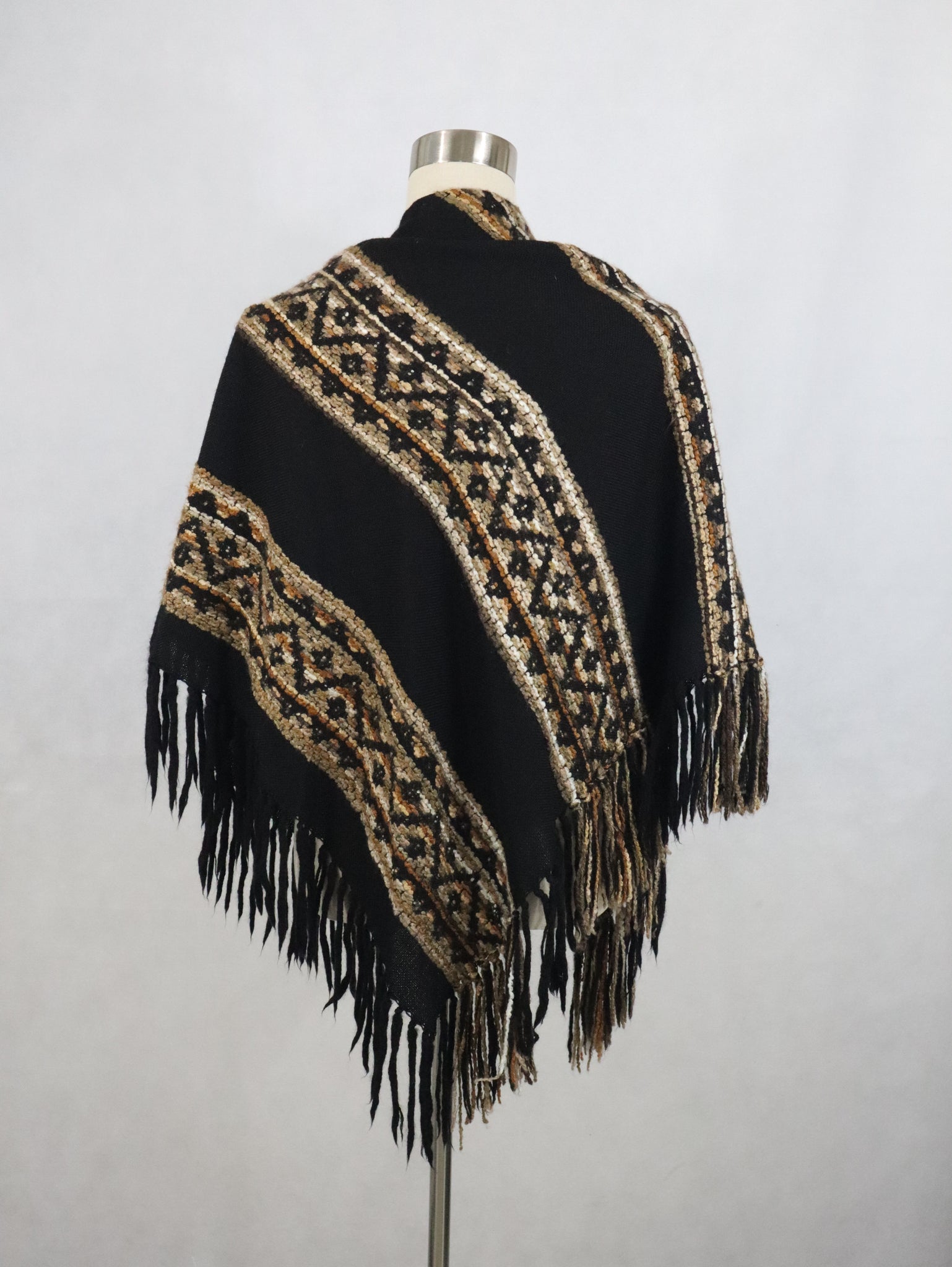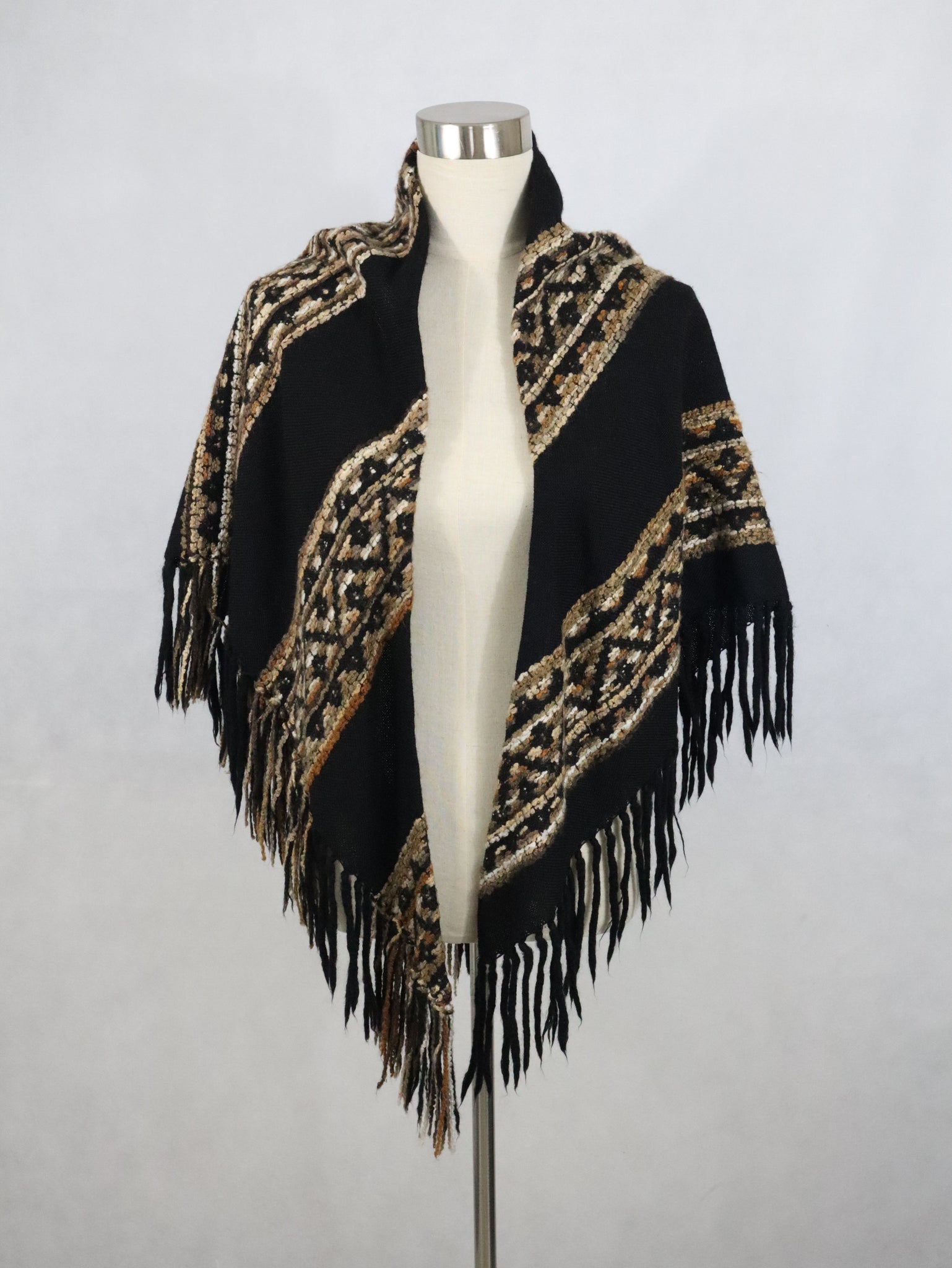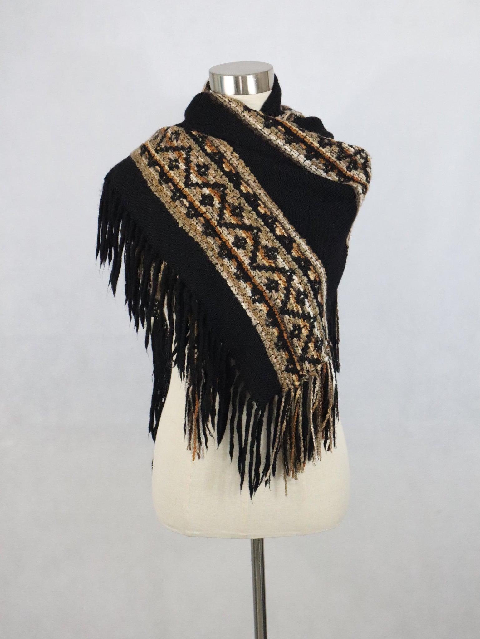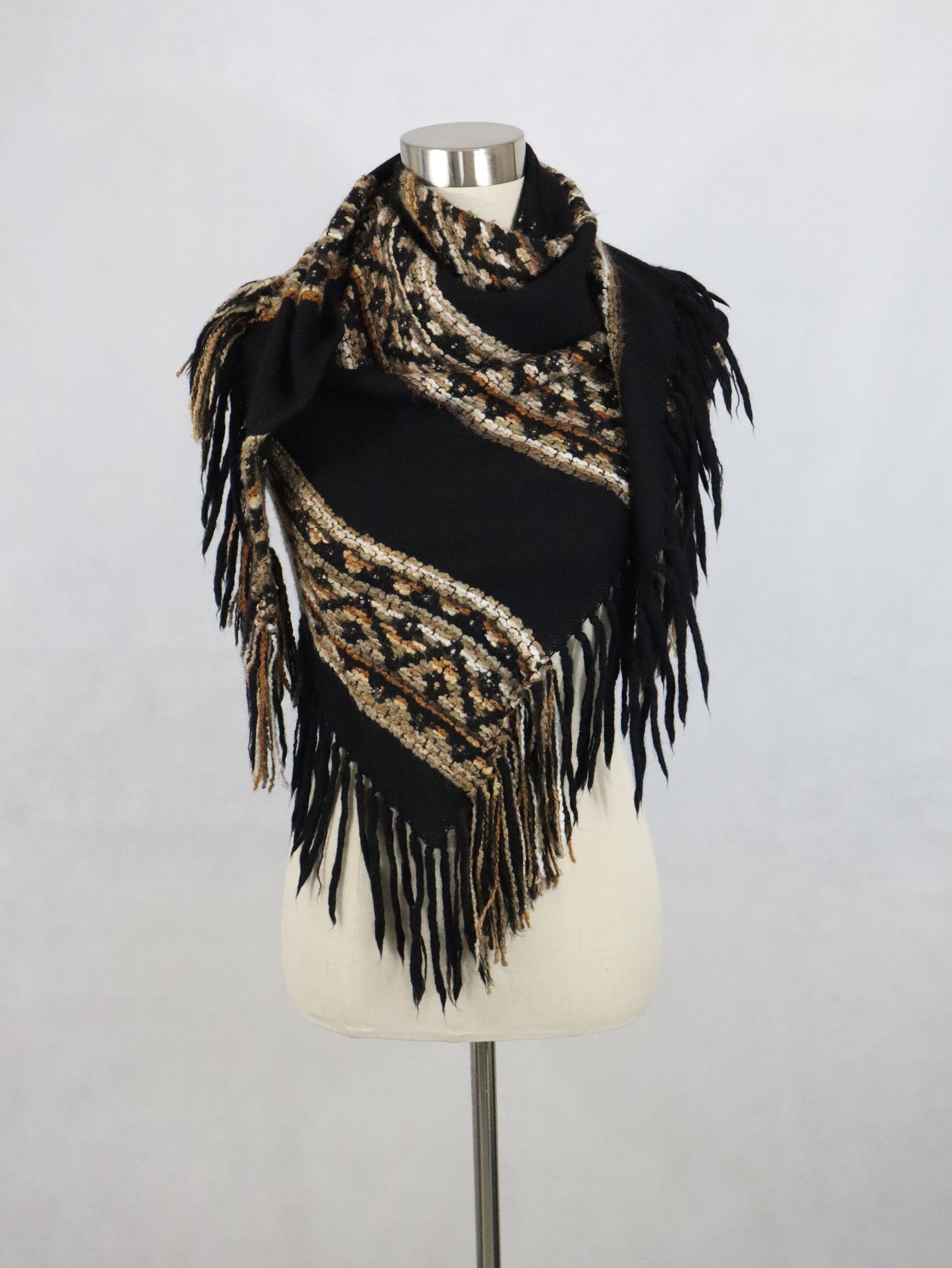 Musta iso kolmiomallinen kotimainen vintage huivi lämmintä neulosta, valmistaja Arola, made in Finland.
