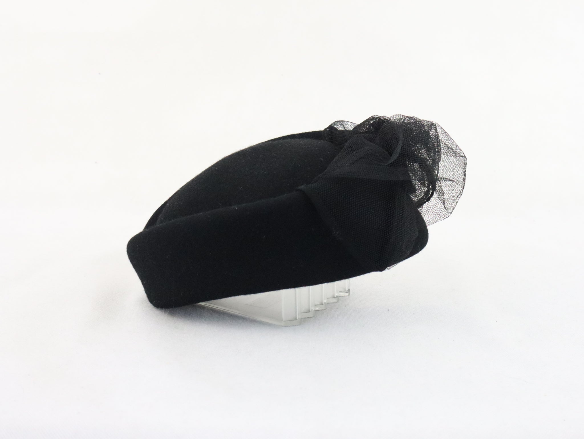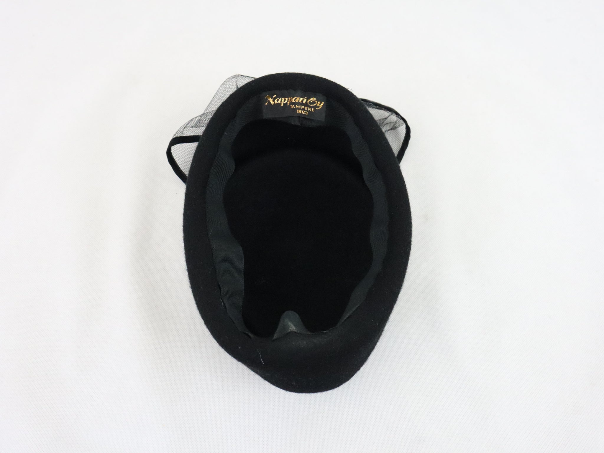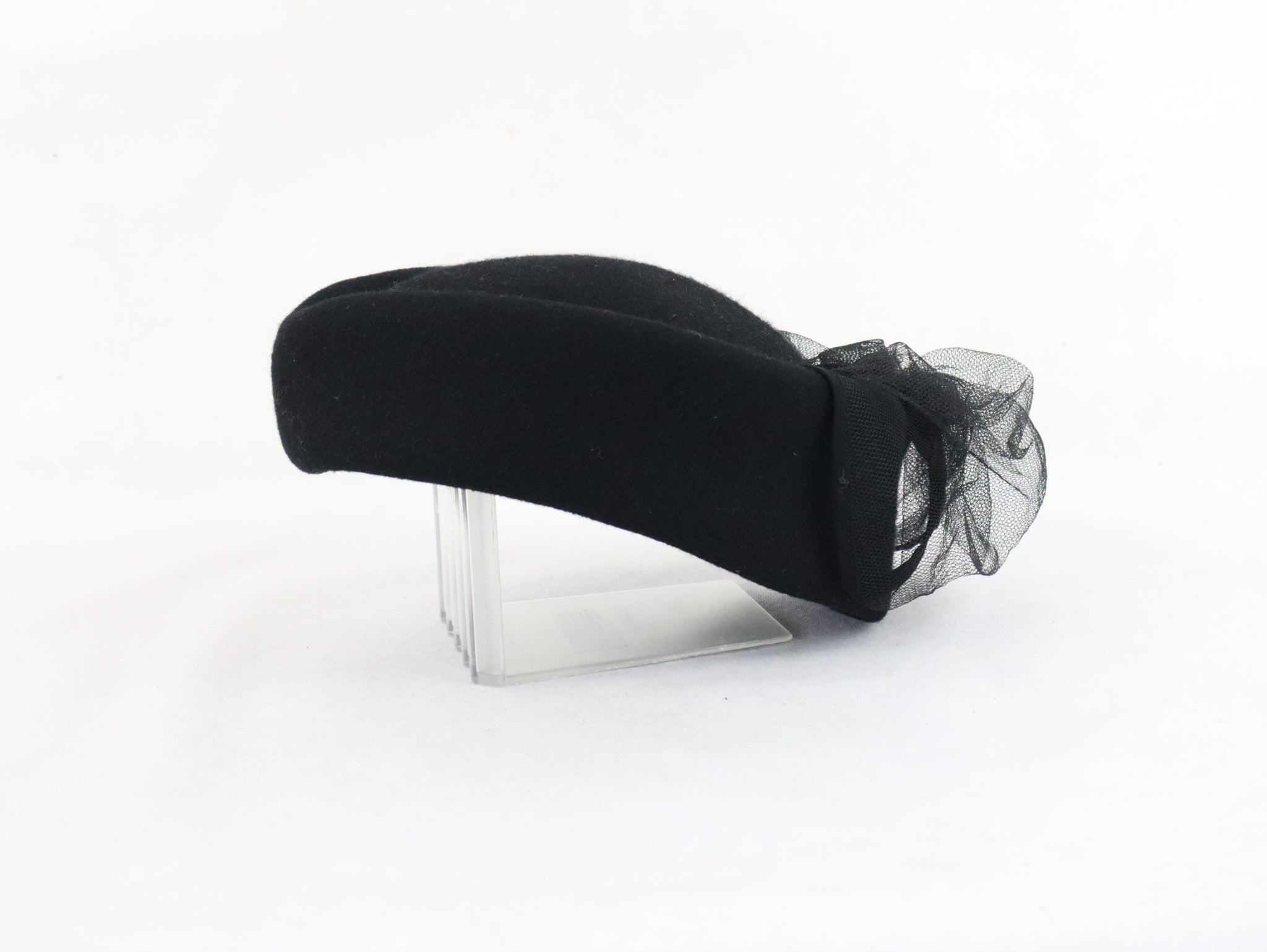 Hattu on valmistettu mustasta huopakankaasta ja siinä on rusetilla oleva harsomainen somiste.