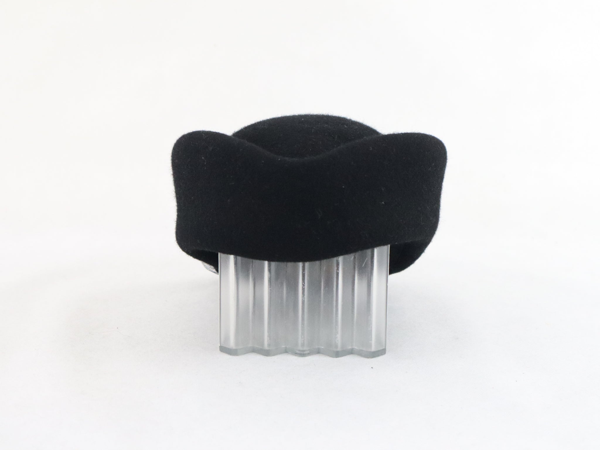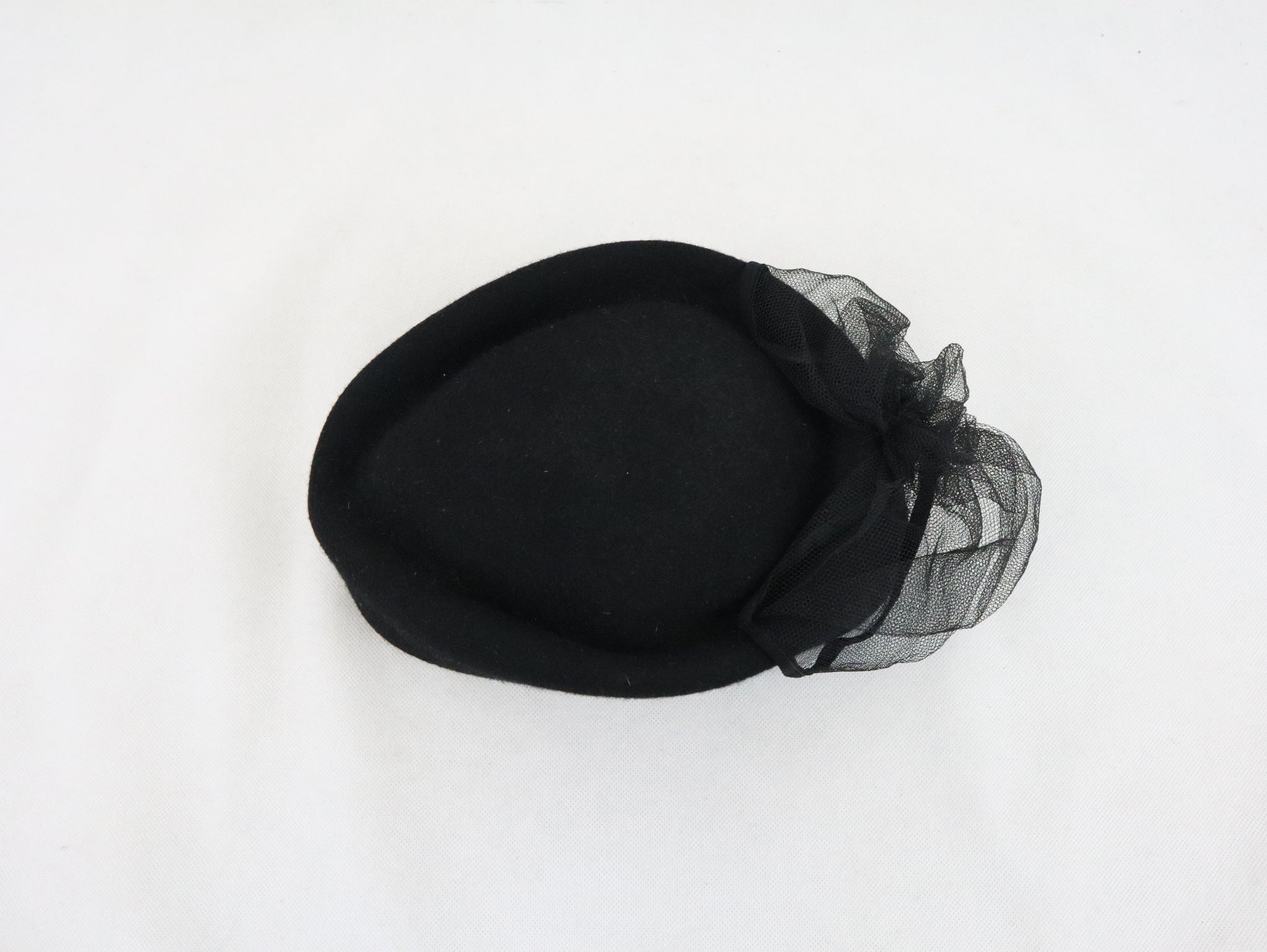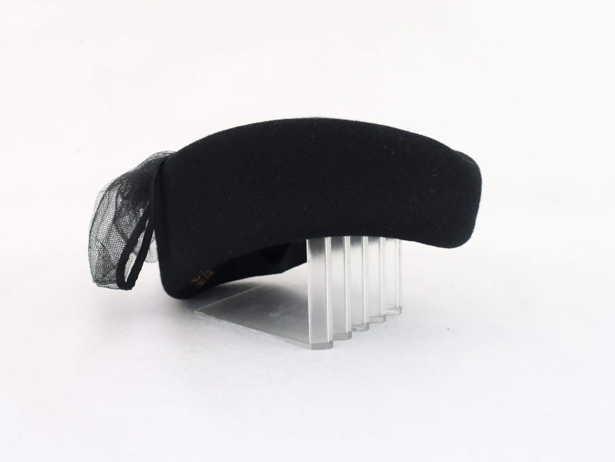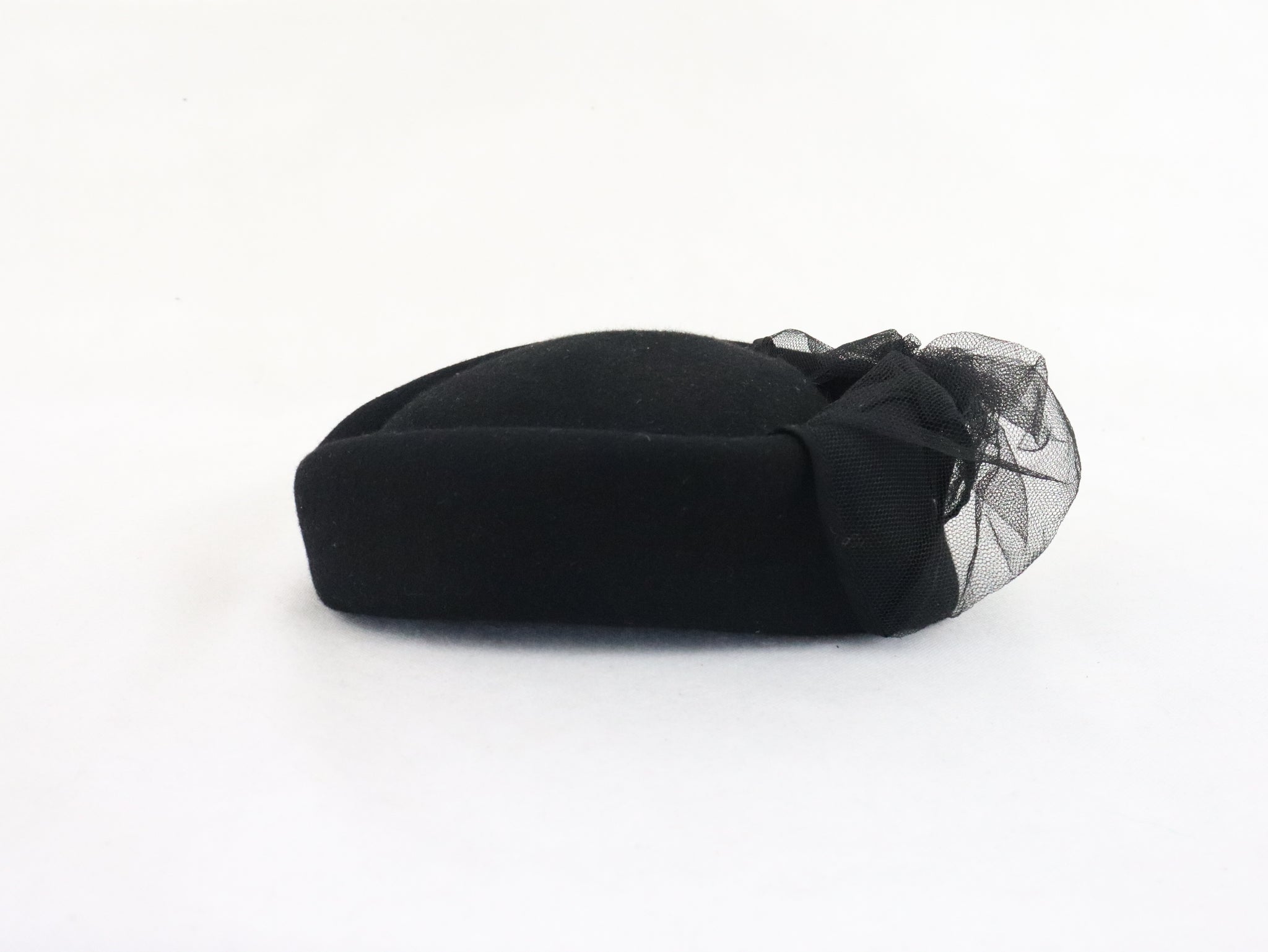 Hattu on valmistettu mustasta huopakankaasta ja siinä on rusetilla oleva harsomainen somiste.
