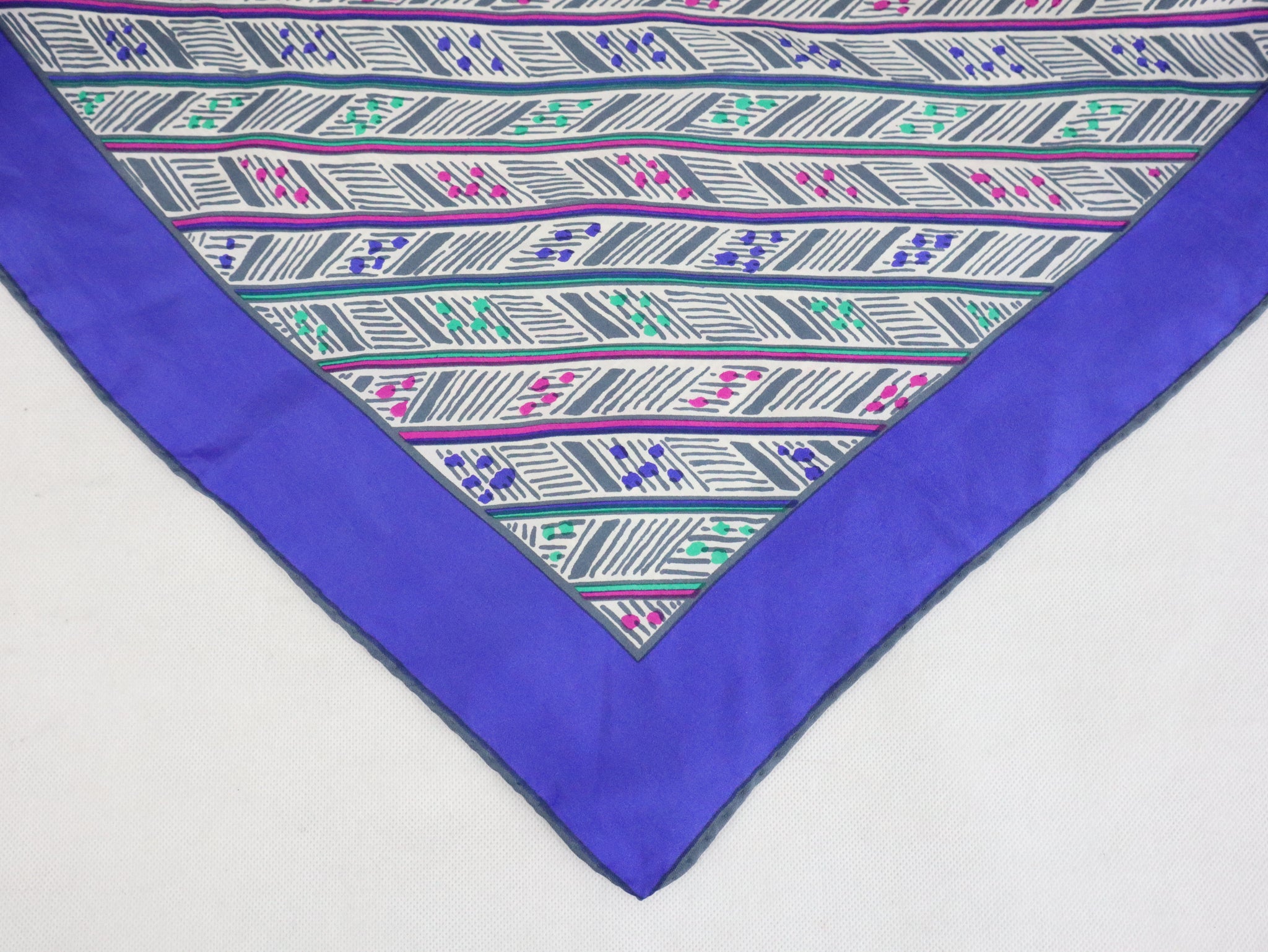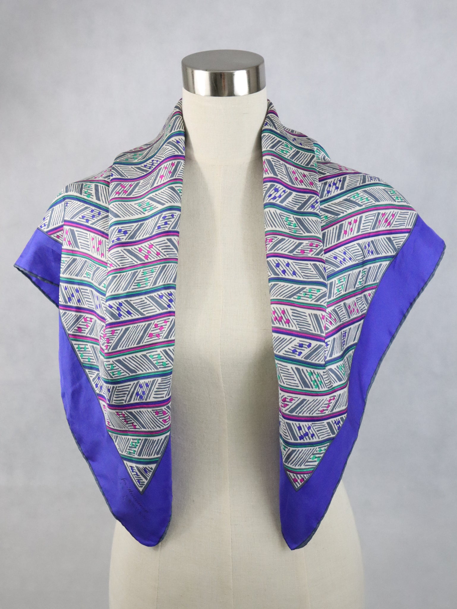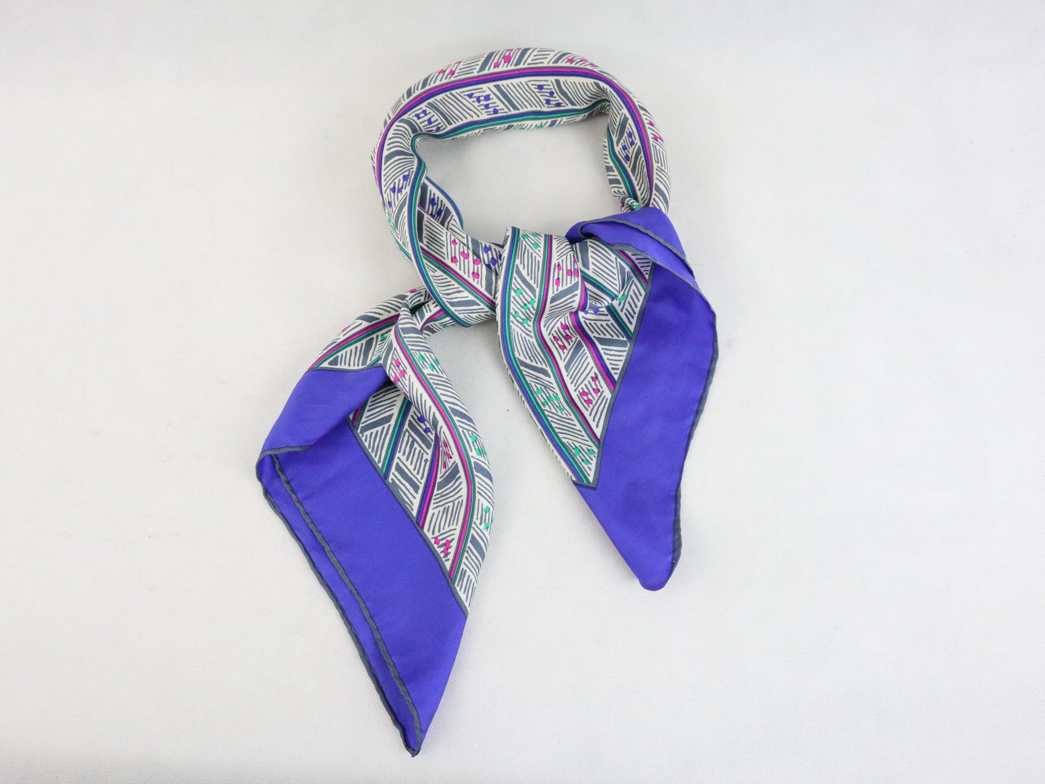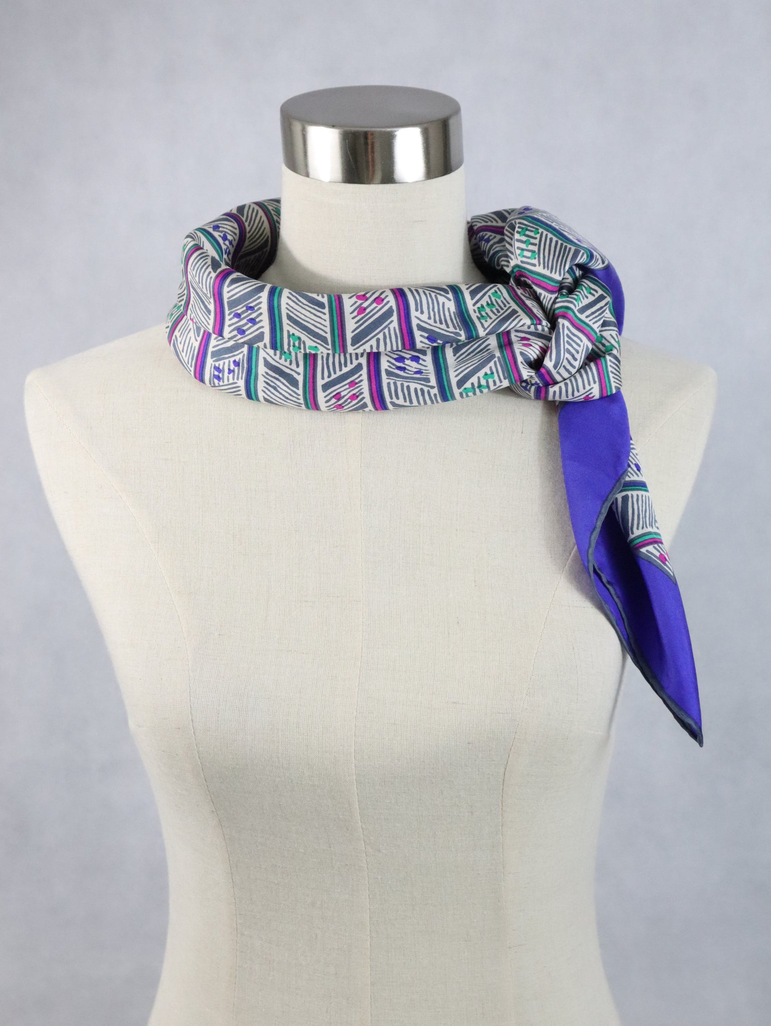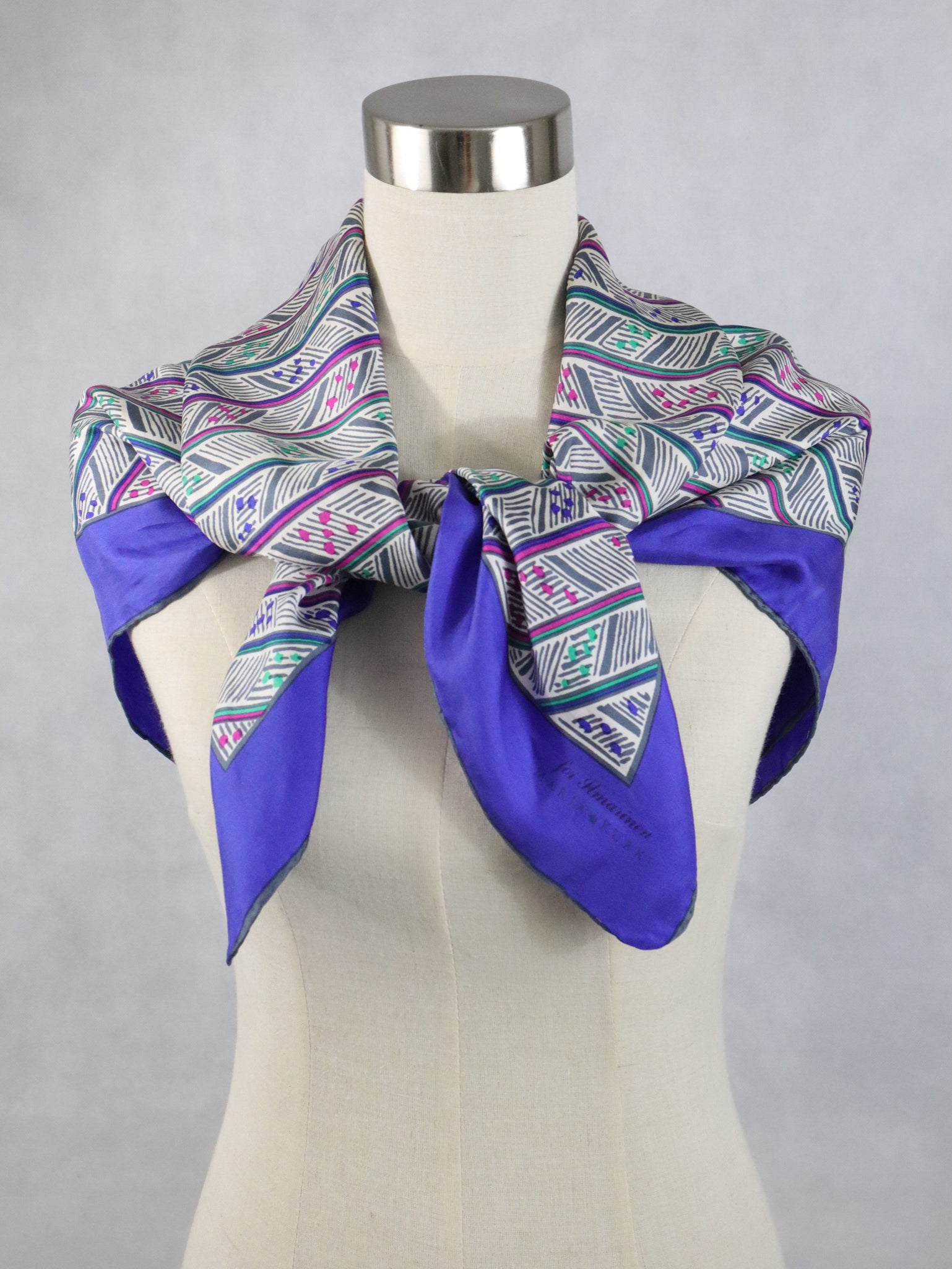 Huivissa on sinivioletti reunus ja valkoisella pohjalla graafinen kuosi, väreinä sinivioletin lisäksi fuksianpunaista, vihreää ja harmaata. Huivin koko on noin 85 x 85 cm ja sen voi kietoa monella tapaa.