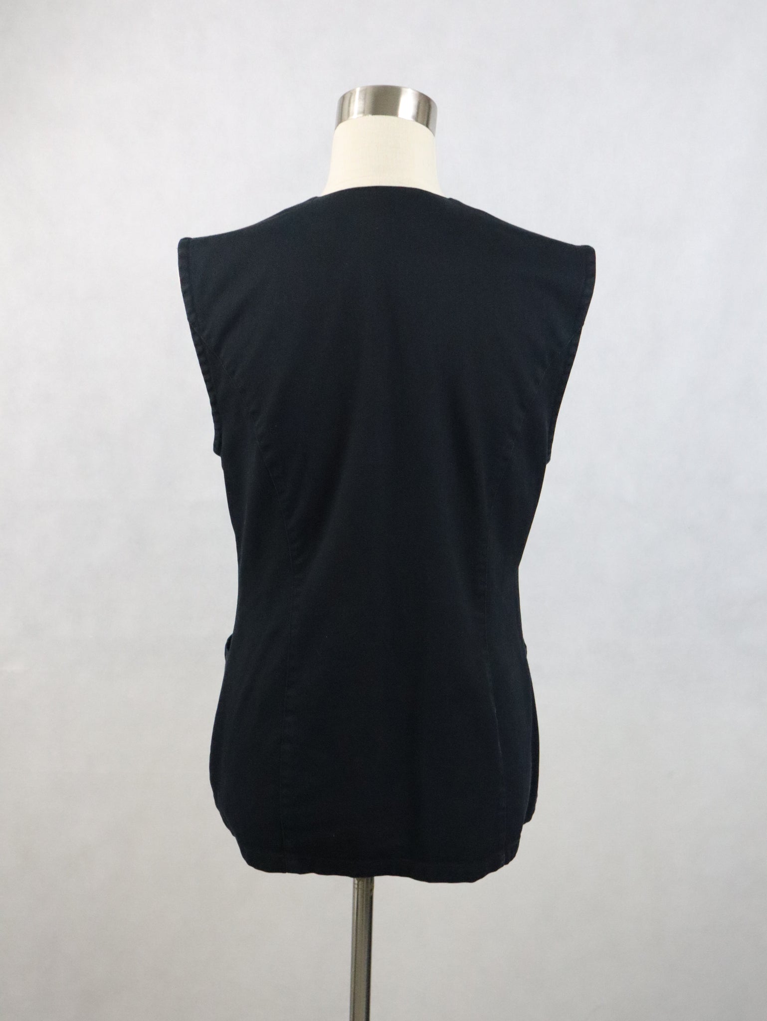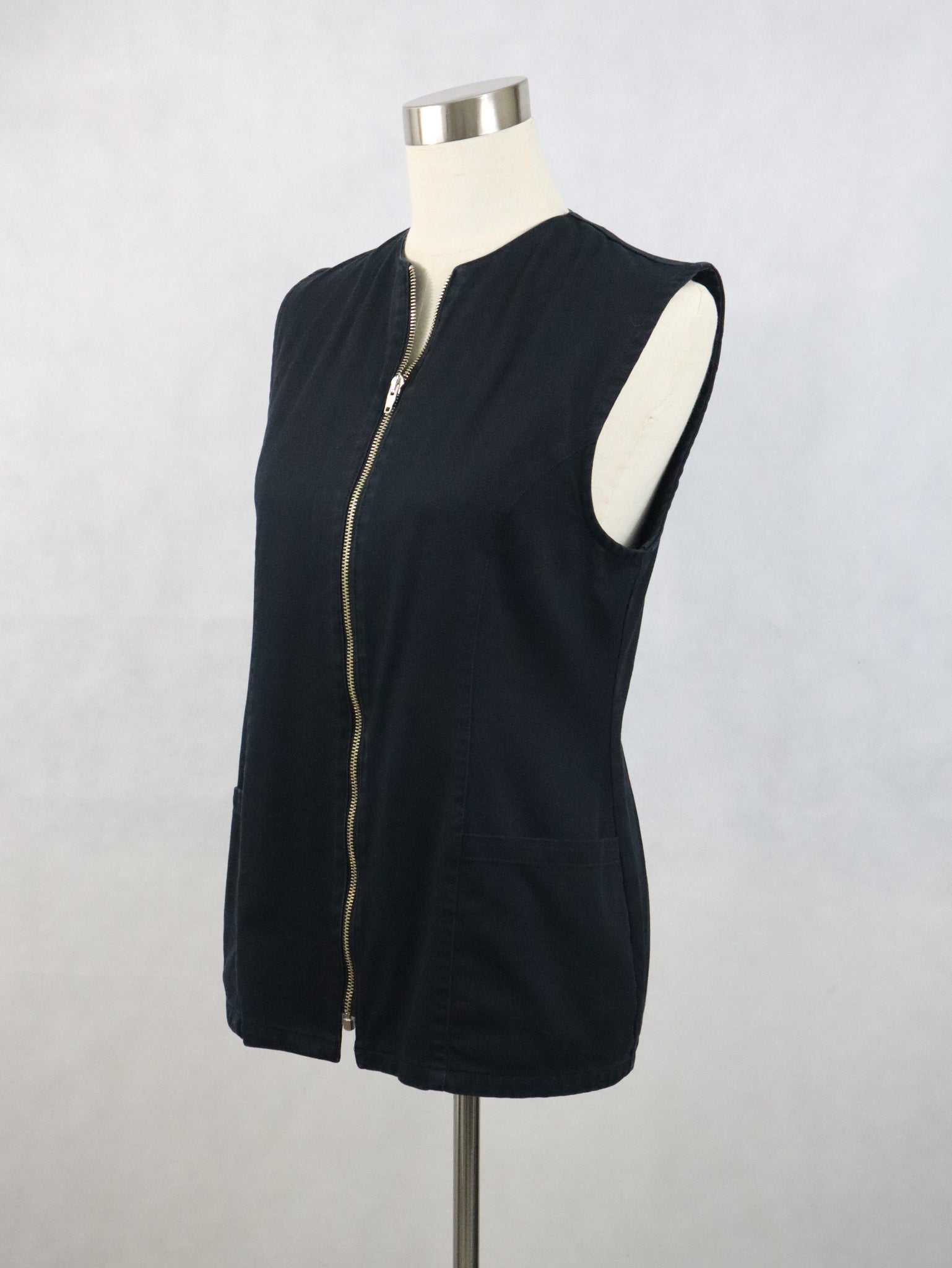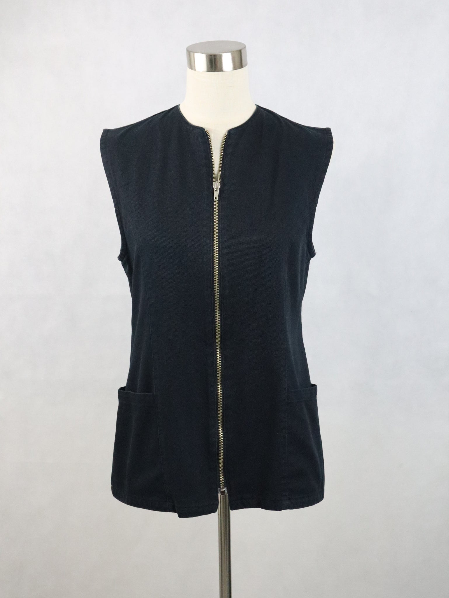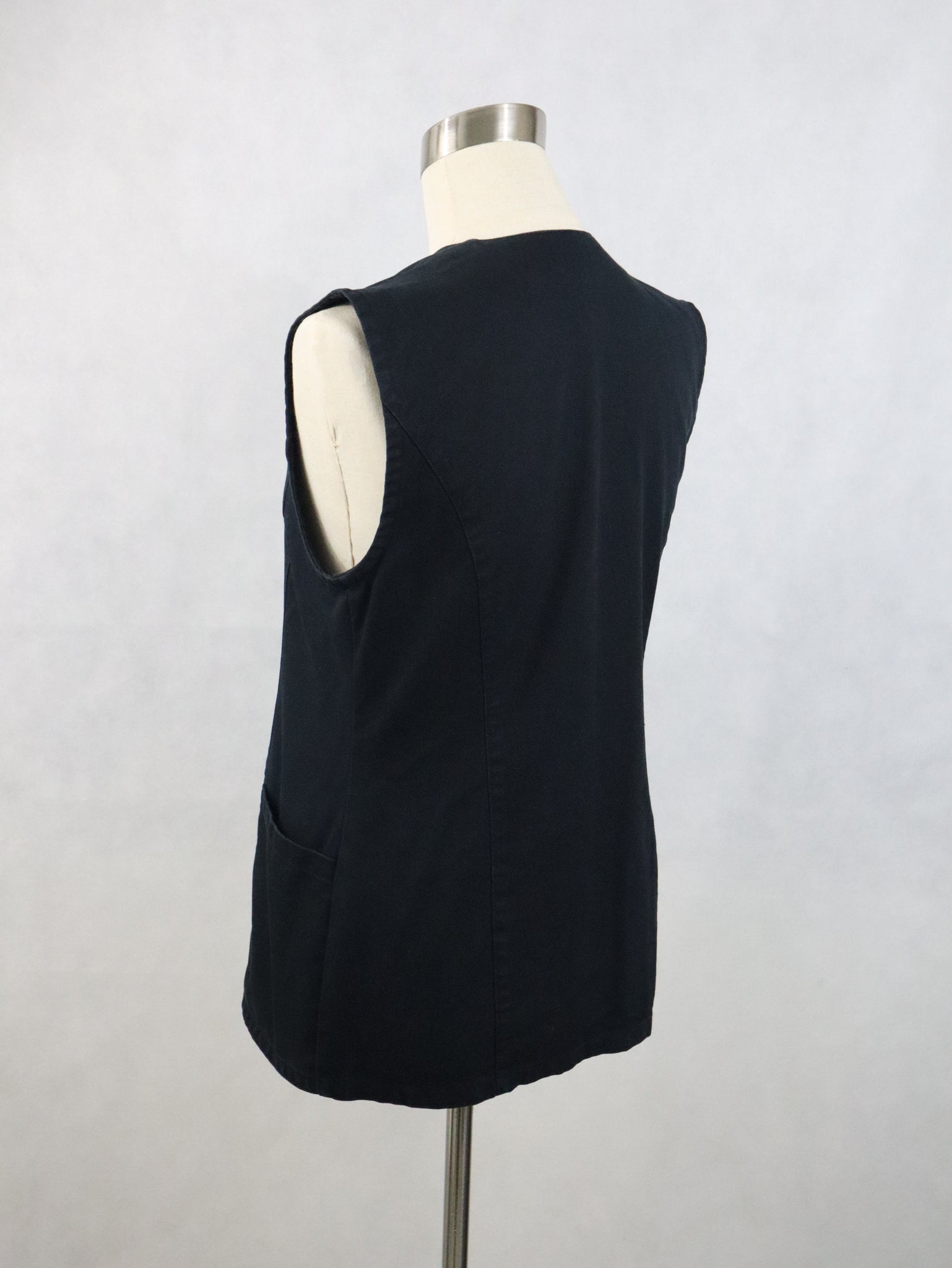 Musta denim-kankainen liivi, valmistaja Tarja Wallius, handmade in Finland.