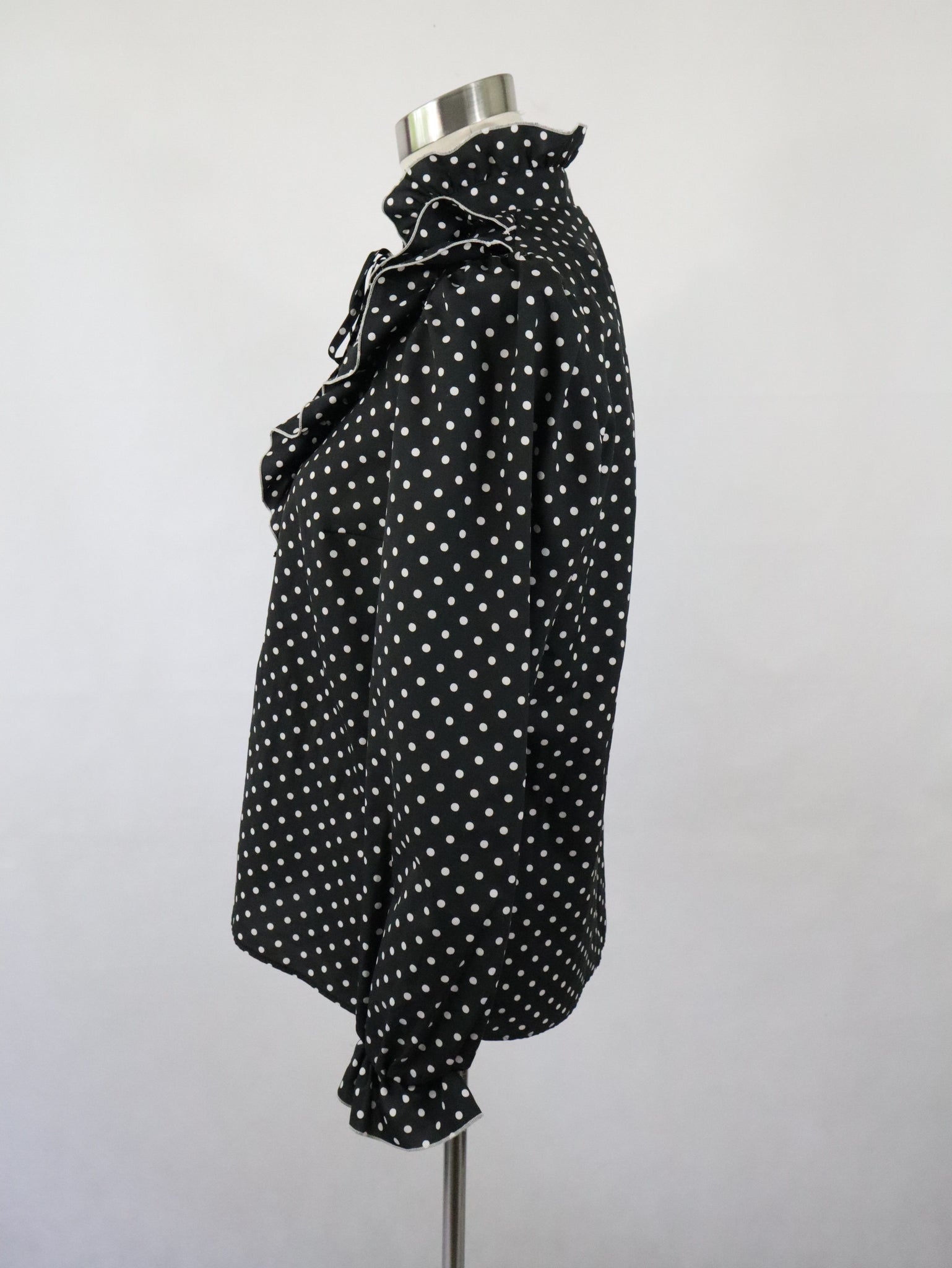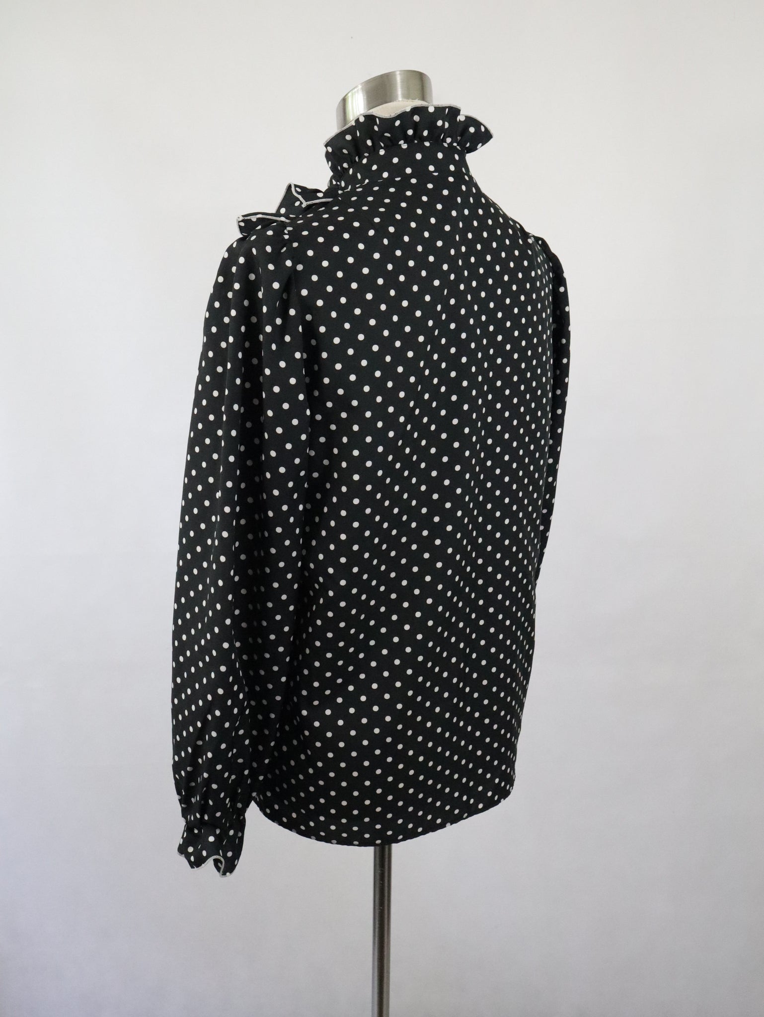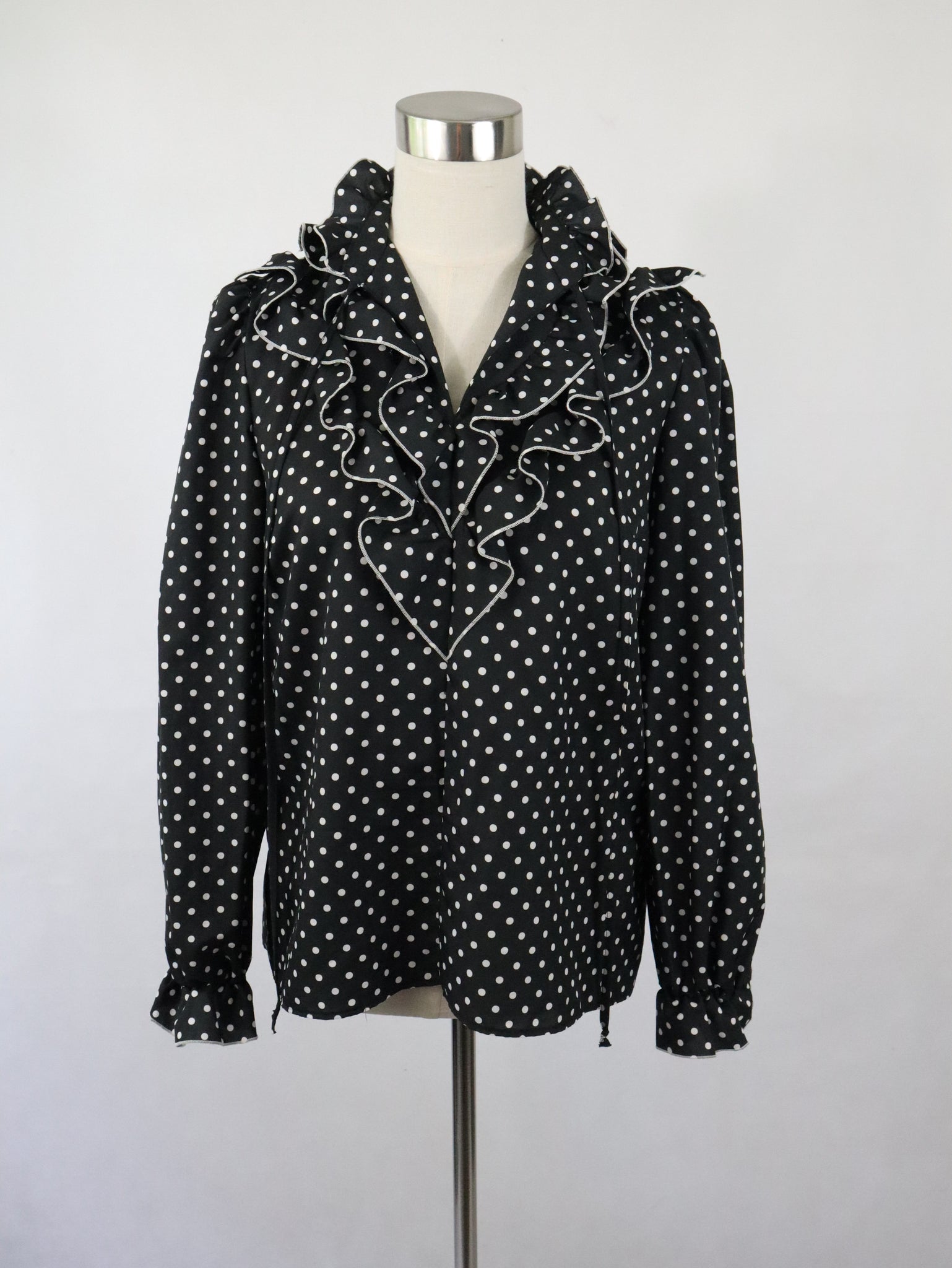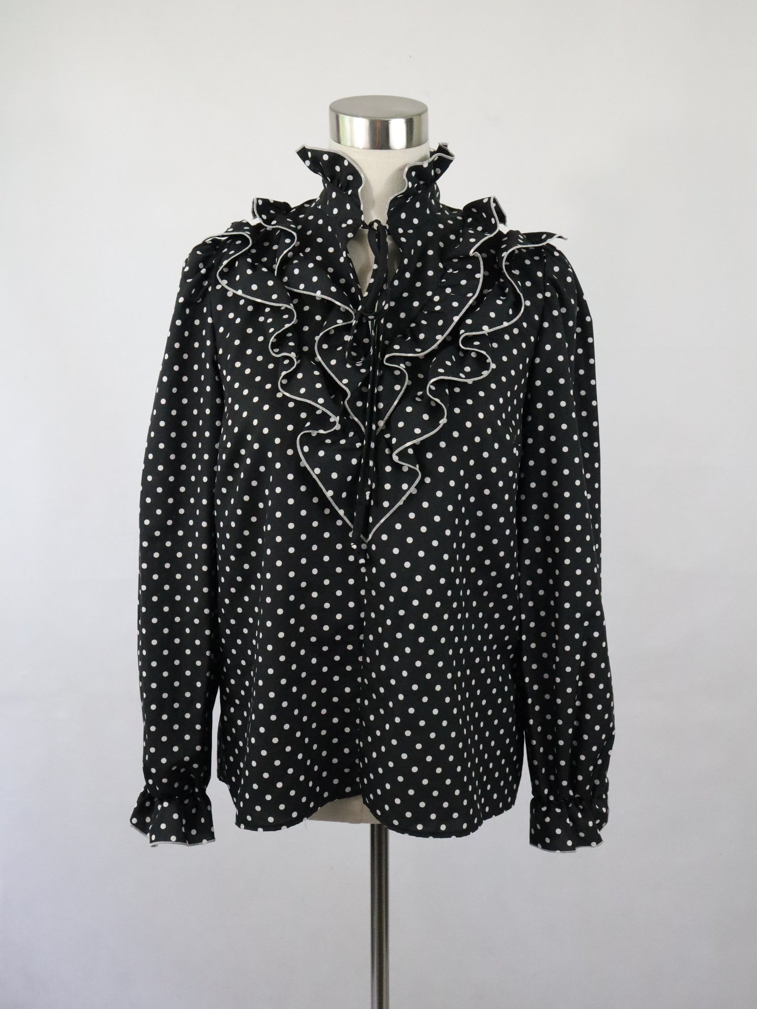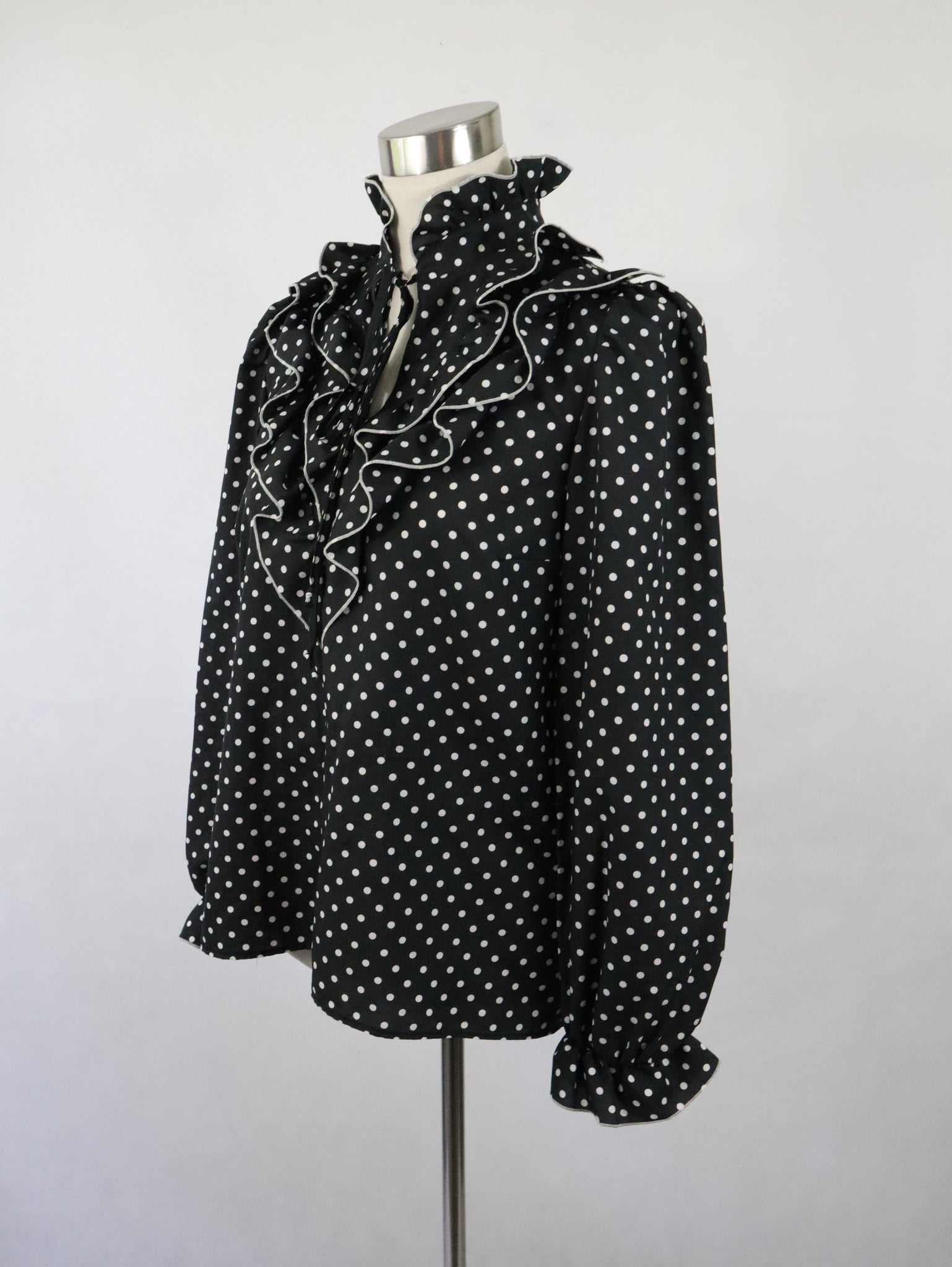 Puserossa on kerroksittainen röyhelökaulus solmittavilla nauhoilla. Hihat ovat laskostetut puhvihihat ja hihansuissa on röyhelöt. Pusero on malliltaan suora ja rinnan kohdalla on muotoleikkaukset.