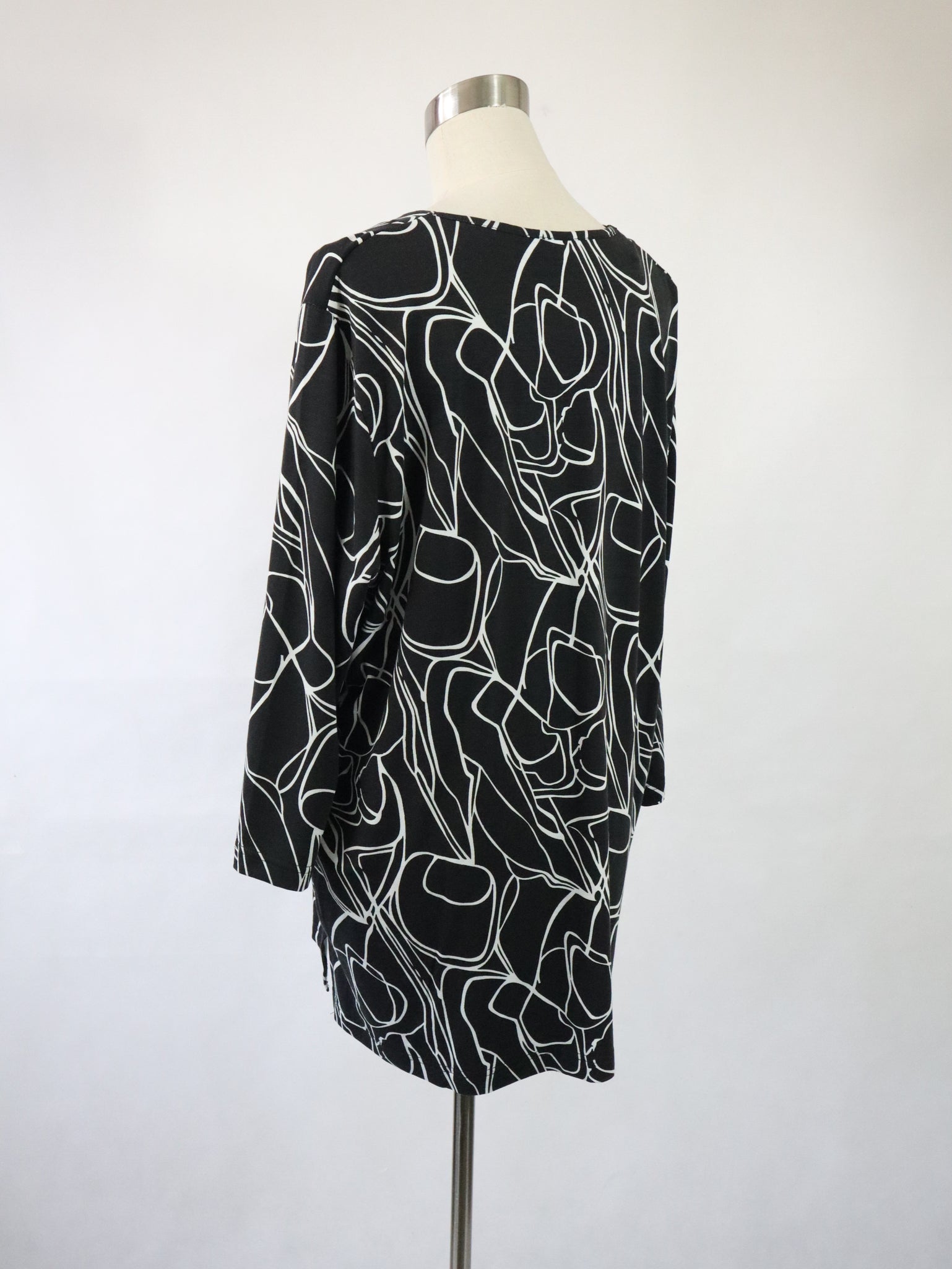 Mustavalkoinen kuviollinen Finnwear tunika, valmistuttaja Nanso Group Oy, Finland.