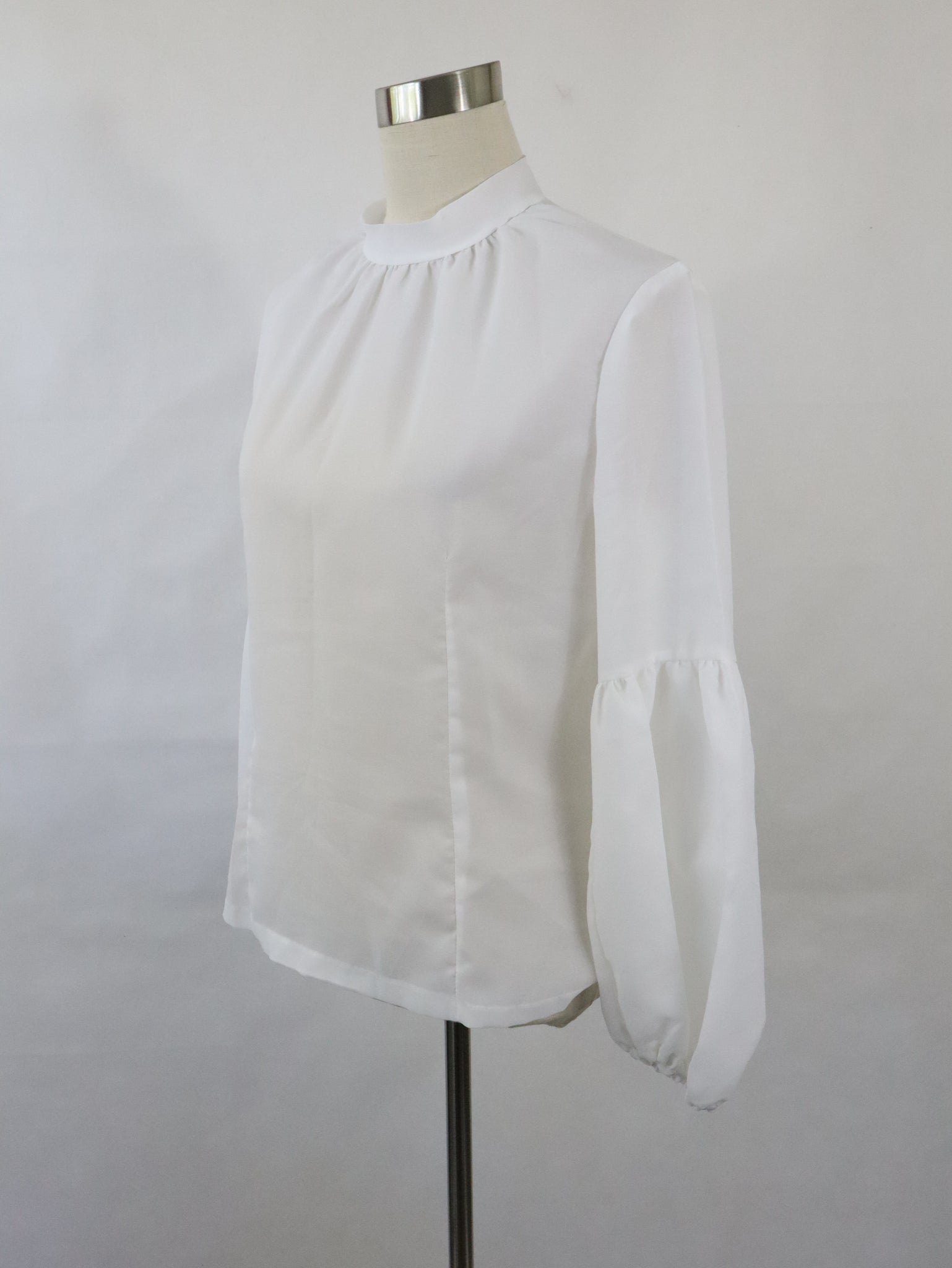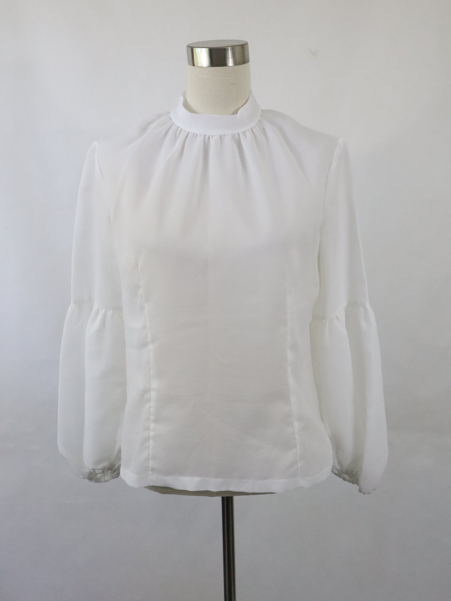 Puserossa on matala pystykaulus, jonka alta kangas on kauniisti laskostettu. Selässä on vetoketju. Pusero on malliltaan vartaloa myötäilevä. Hihat levenevät puolivälistä ja hihansuissa on kuminauhat.