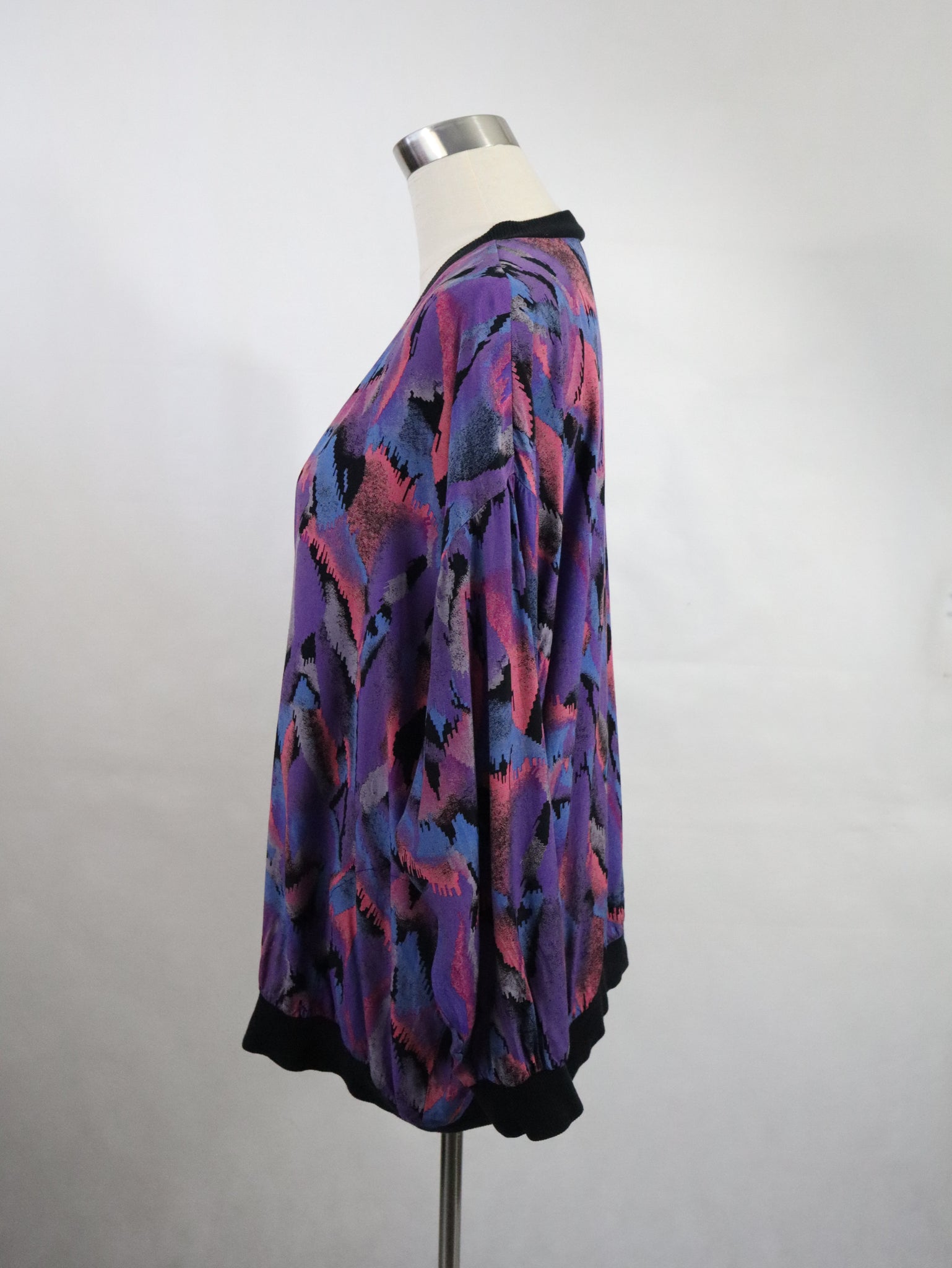 Ohut ja kevyt, värikäs kuviollinen viskoosikangas, väreinä pinkki, violetti, sininen, harmaa ja musta. Materiaali 100% viskoosia, pesu 40 asteessa.