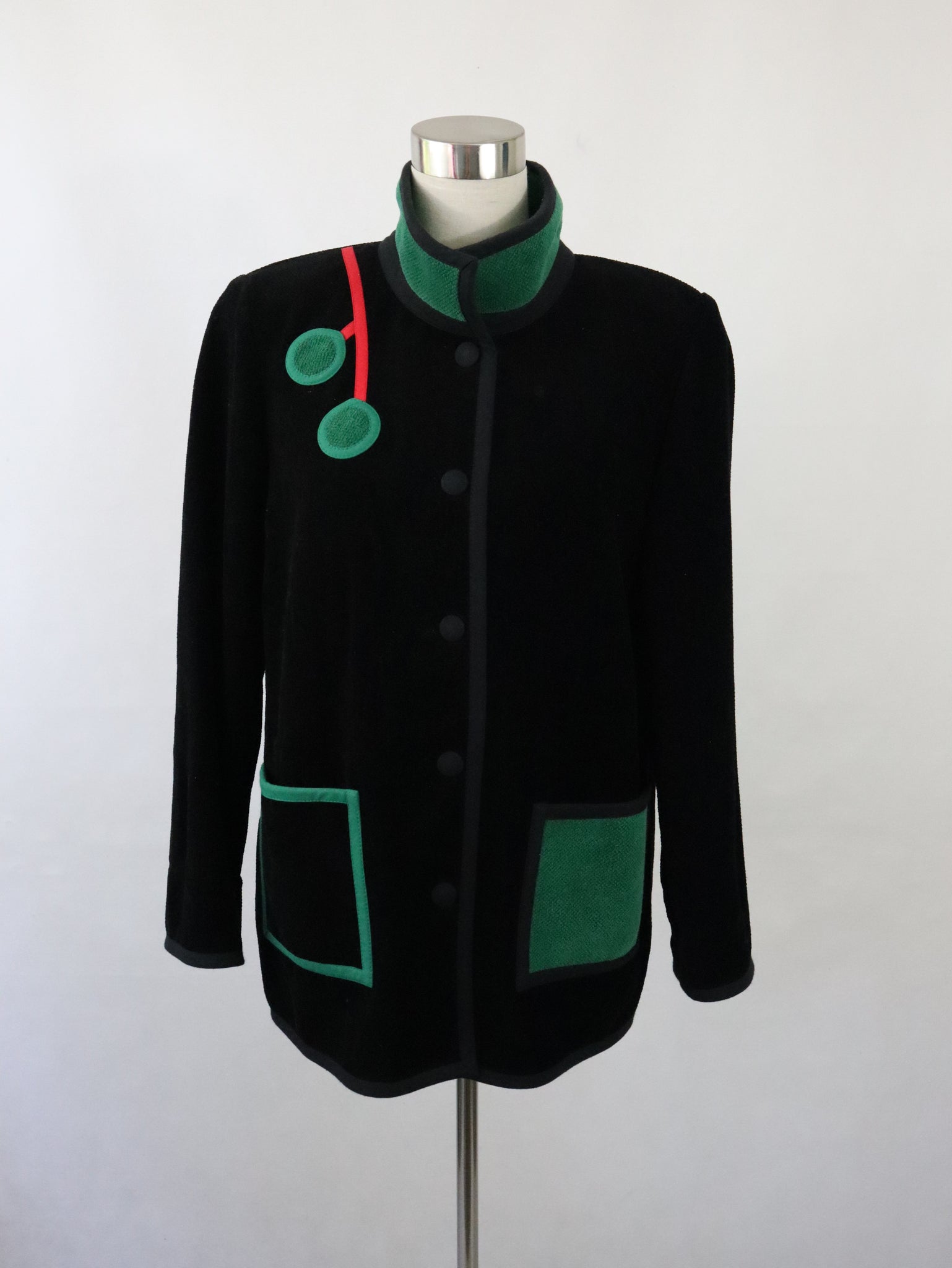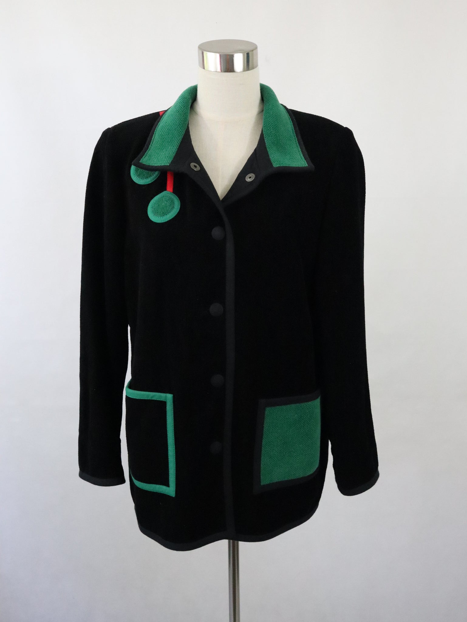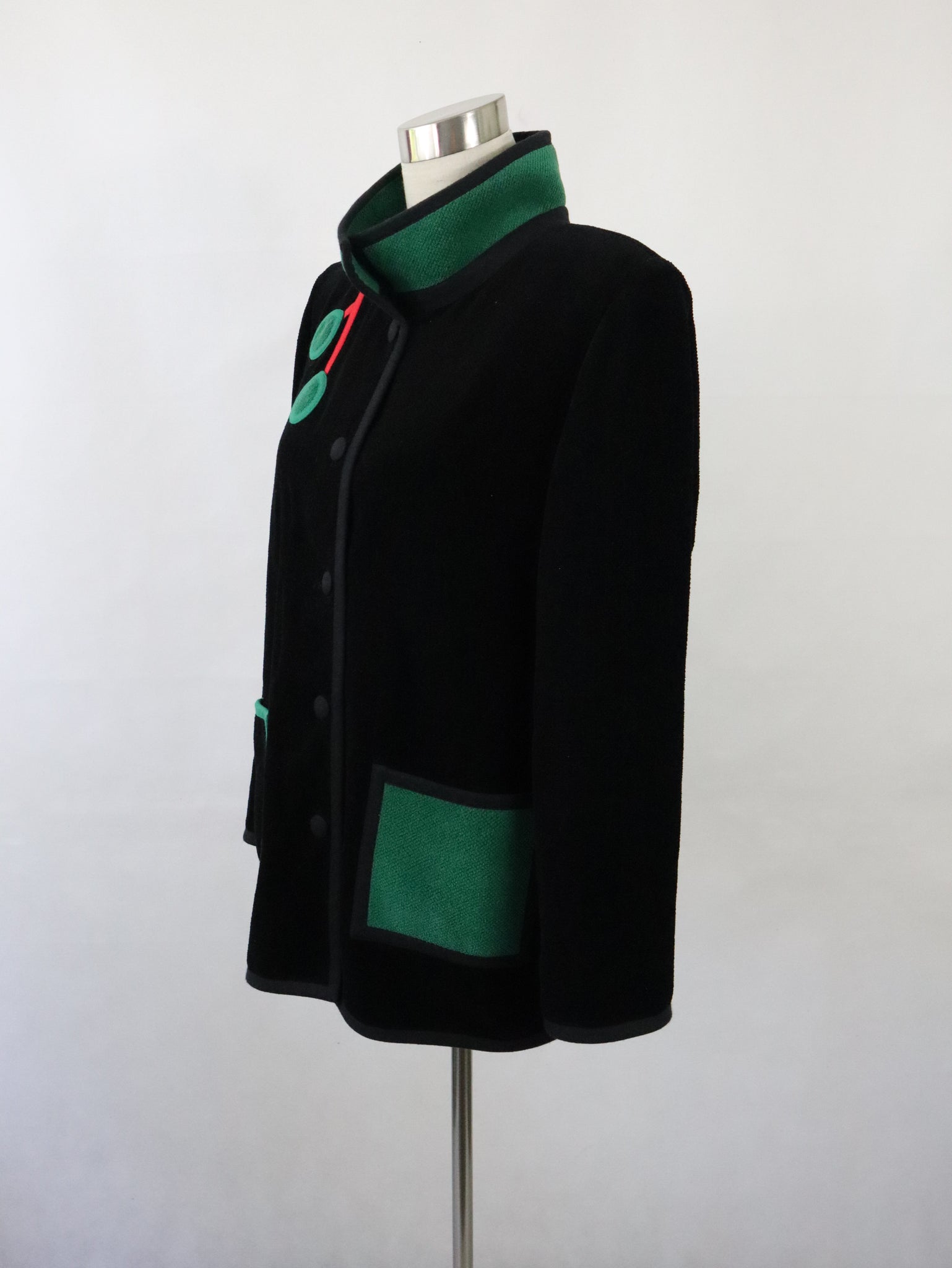 Jakku on ommeltu pääosin mustasta poppanakankaasta ja siinä on vihreitä ja punaisia yksityiskohtia. Materiaali 100% puuvillaa, vuori 100% asetaattia, pesu 40 asteessa.