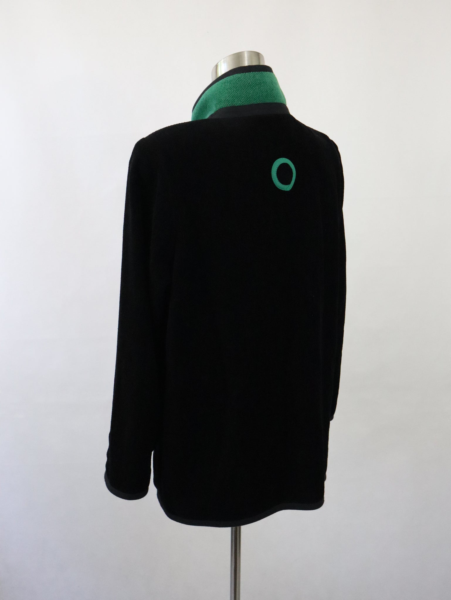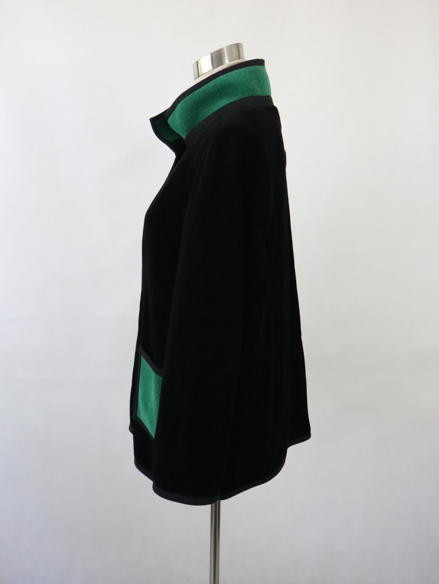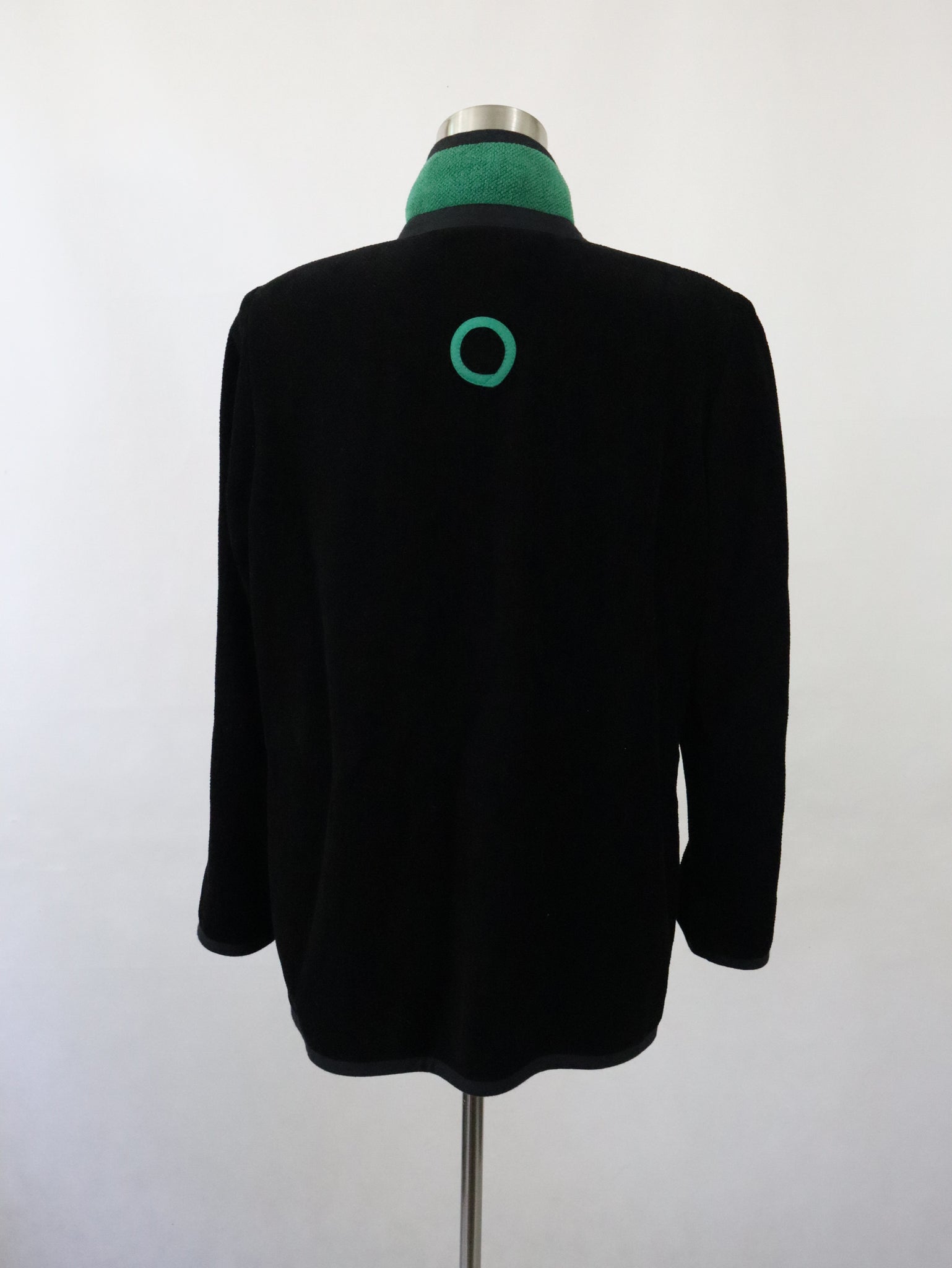 Jakku on ommeltu pääosin mustasta poppanakankaasta ja siinä on vihreitä ja punaisia yksityiskohtia. Materiaali 100% puuvillaa, vuori 100% asetaattia, pesu 40 asteessa.