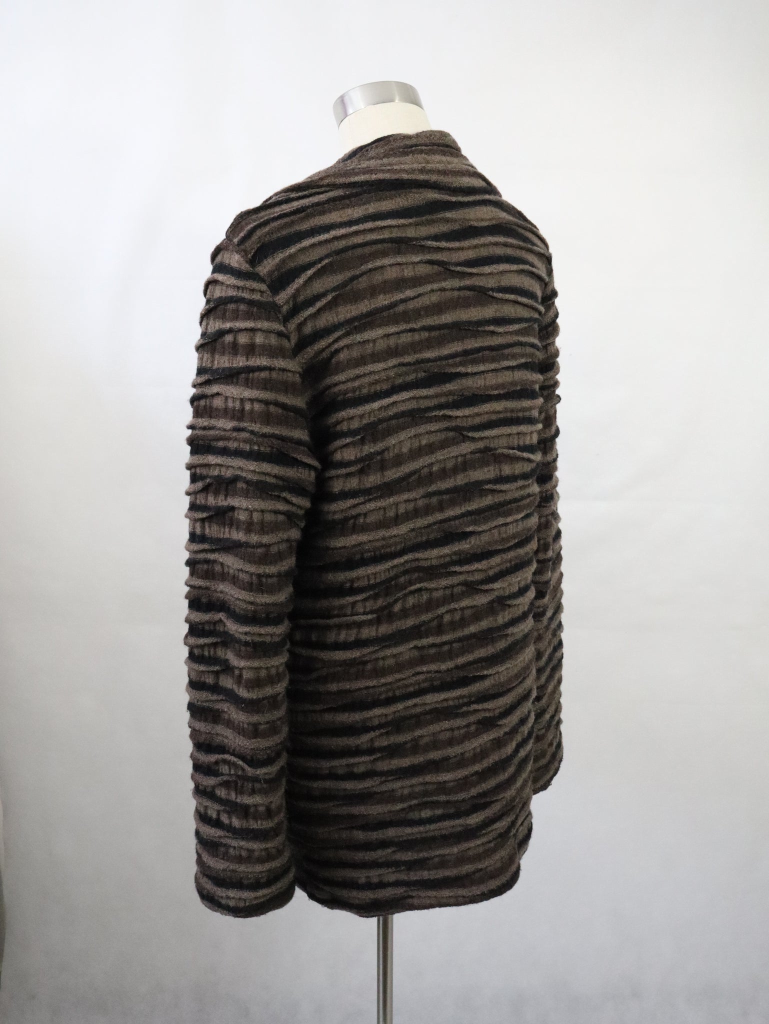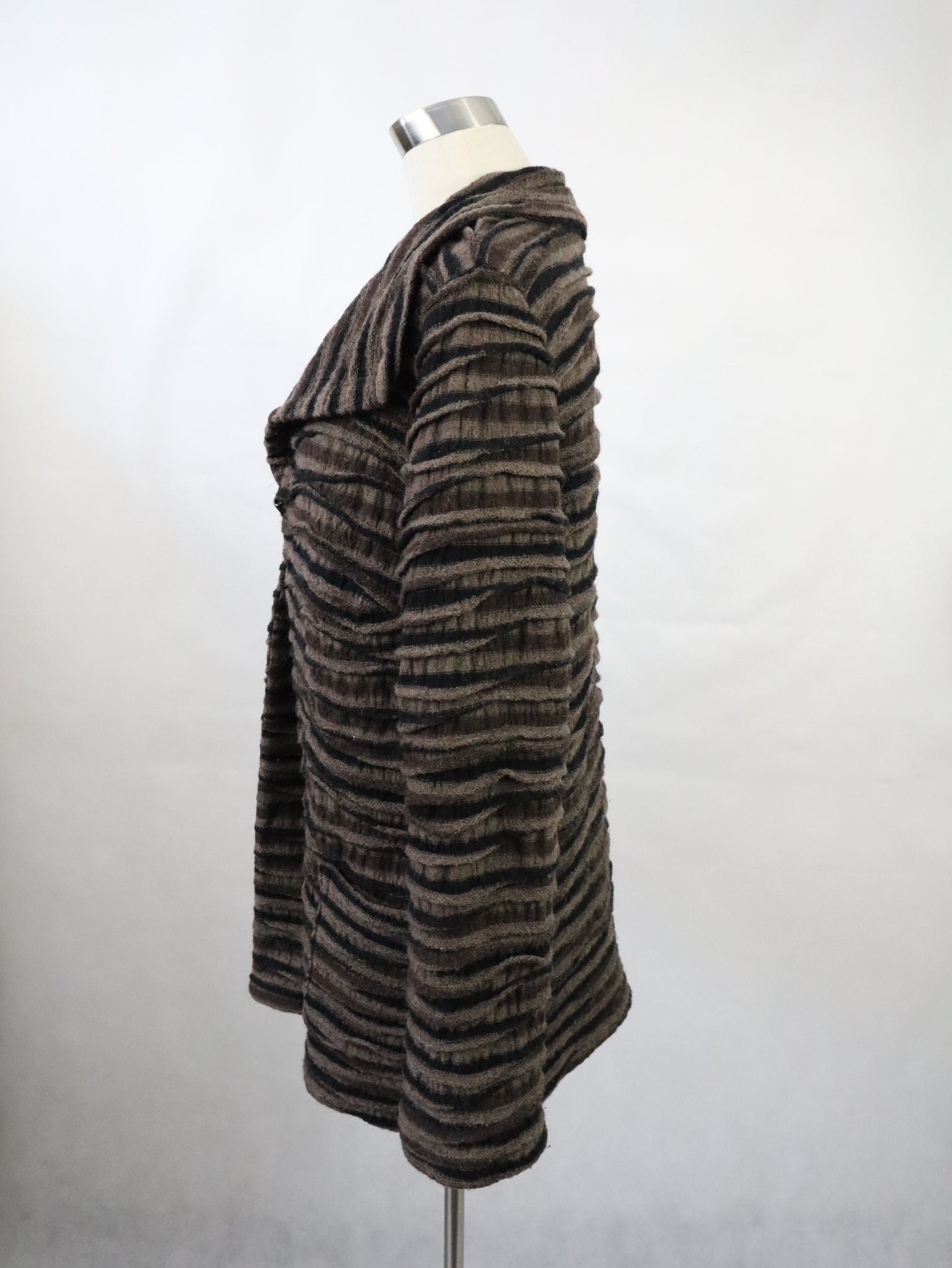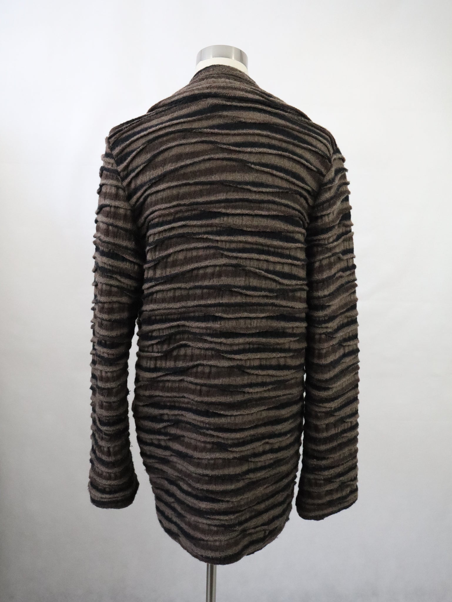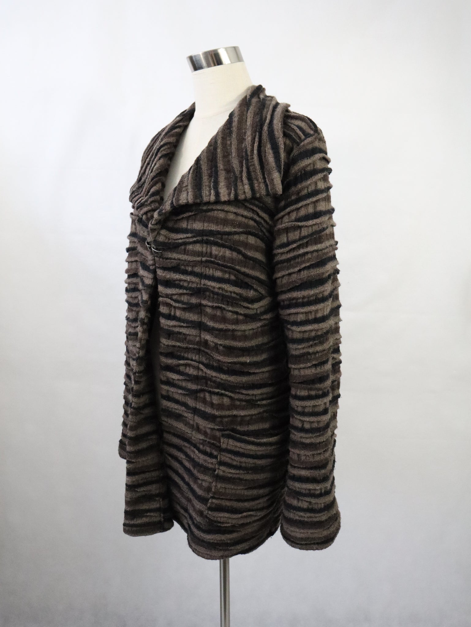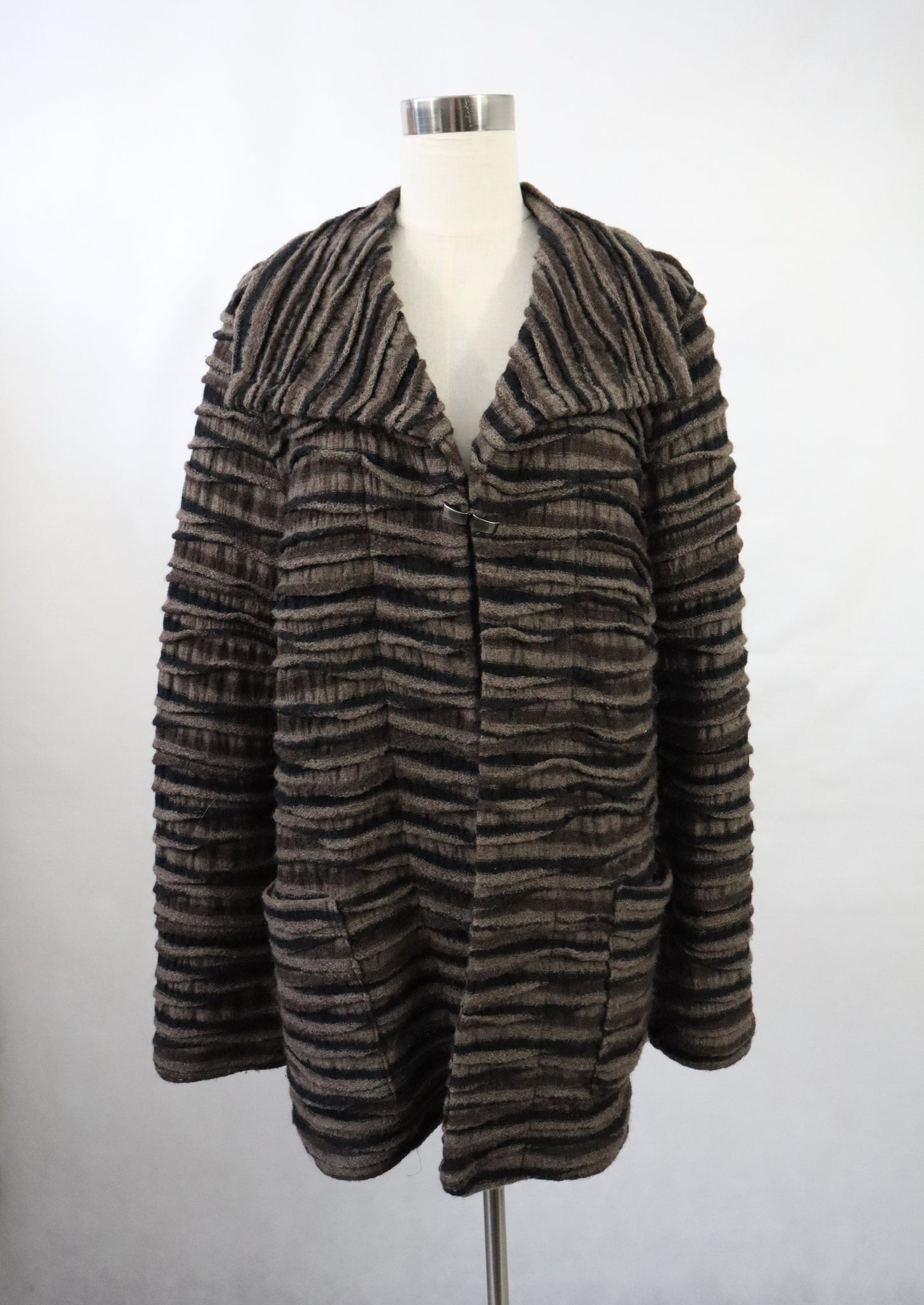 Takki on valmistettu villaneuloksesta, jossa on aaltoileva raidallinen kohokuviointi, väreinä harmaanruskeaa ja mustaa. Materiaali on 100% virgin wool ja pesuohje suosittelee kuivapesua.