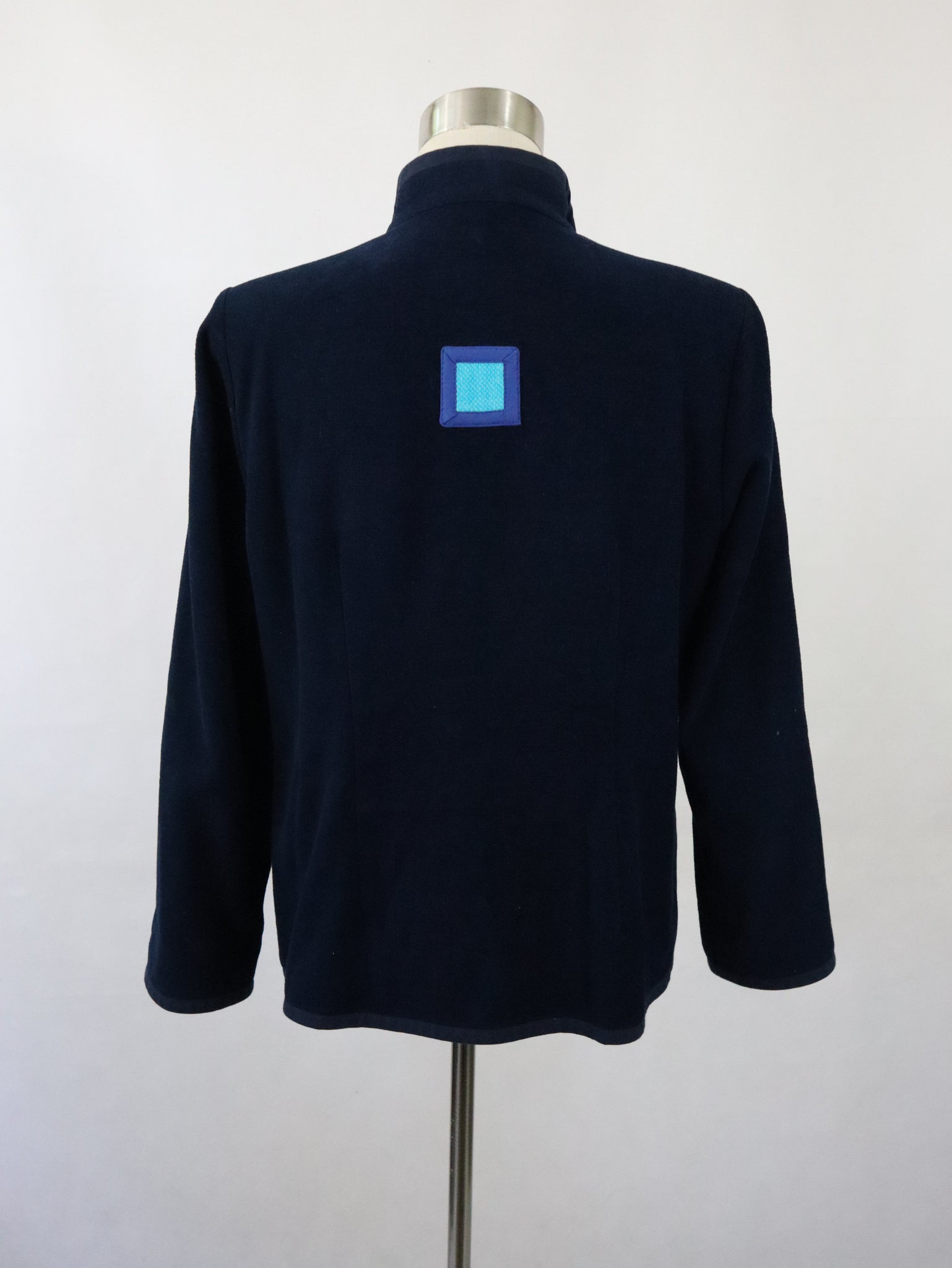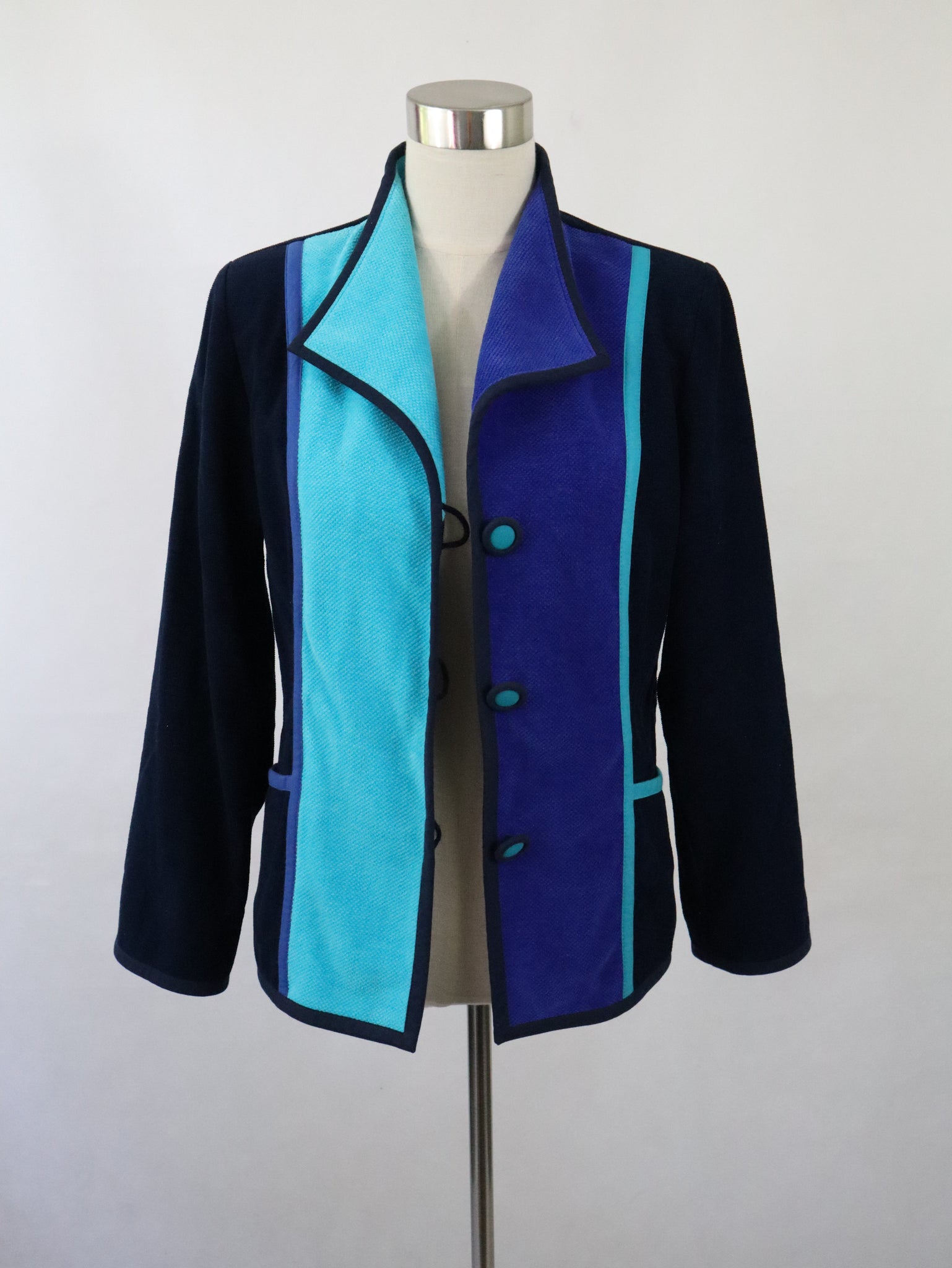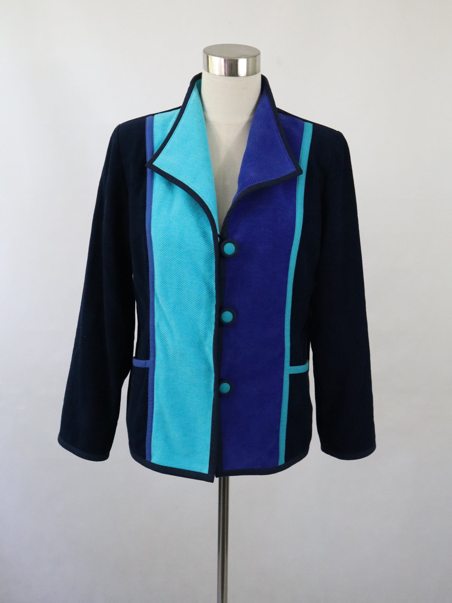 Jakku on ommeltu pääosin mustasta poppanakankaasta ja edessä on siniset ja turkoosit kaistaleet. Materiaali 100% puuvillaa, vuori 100% asetaattia, pesu 40 asteessa.