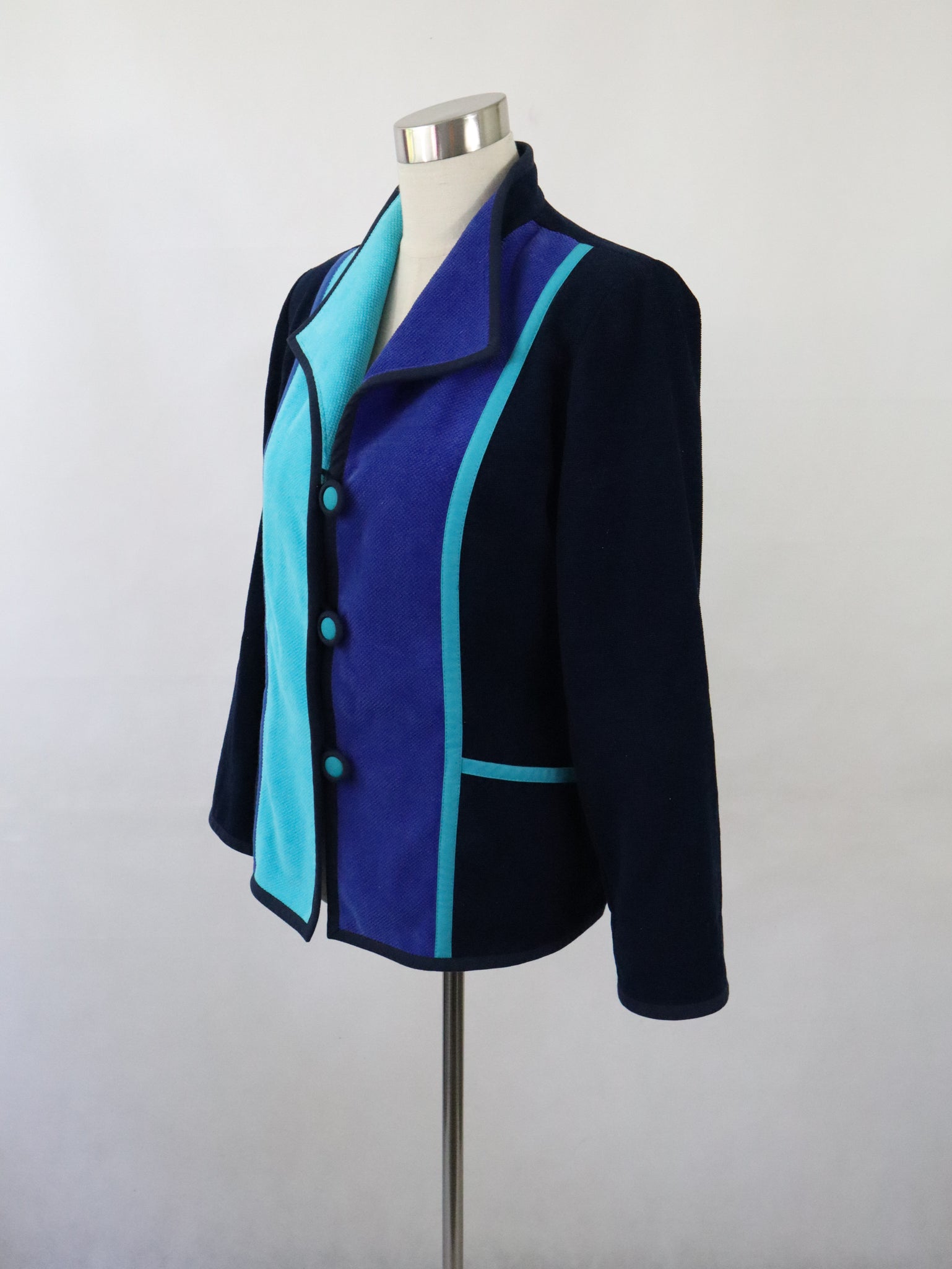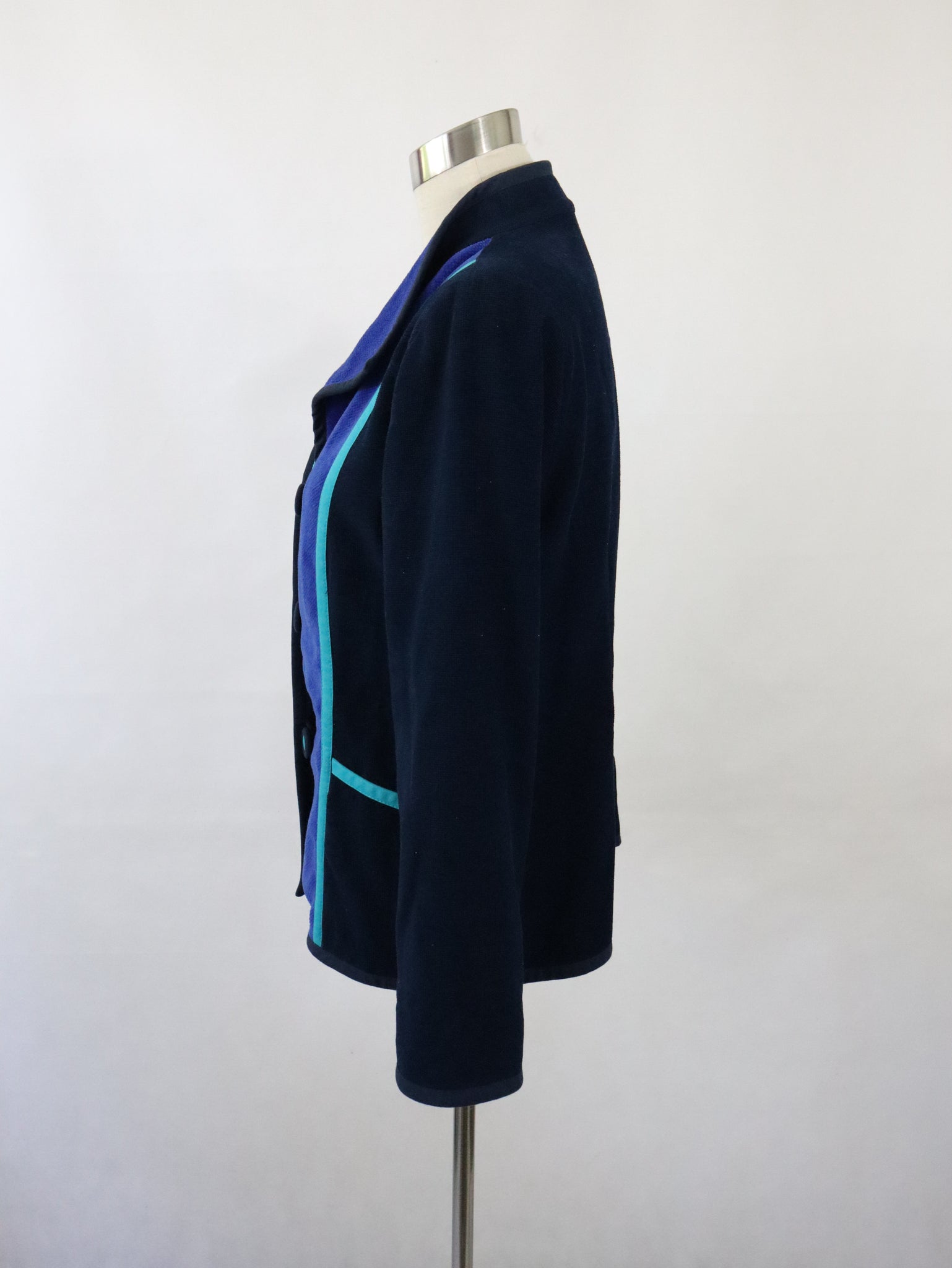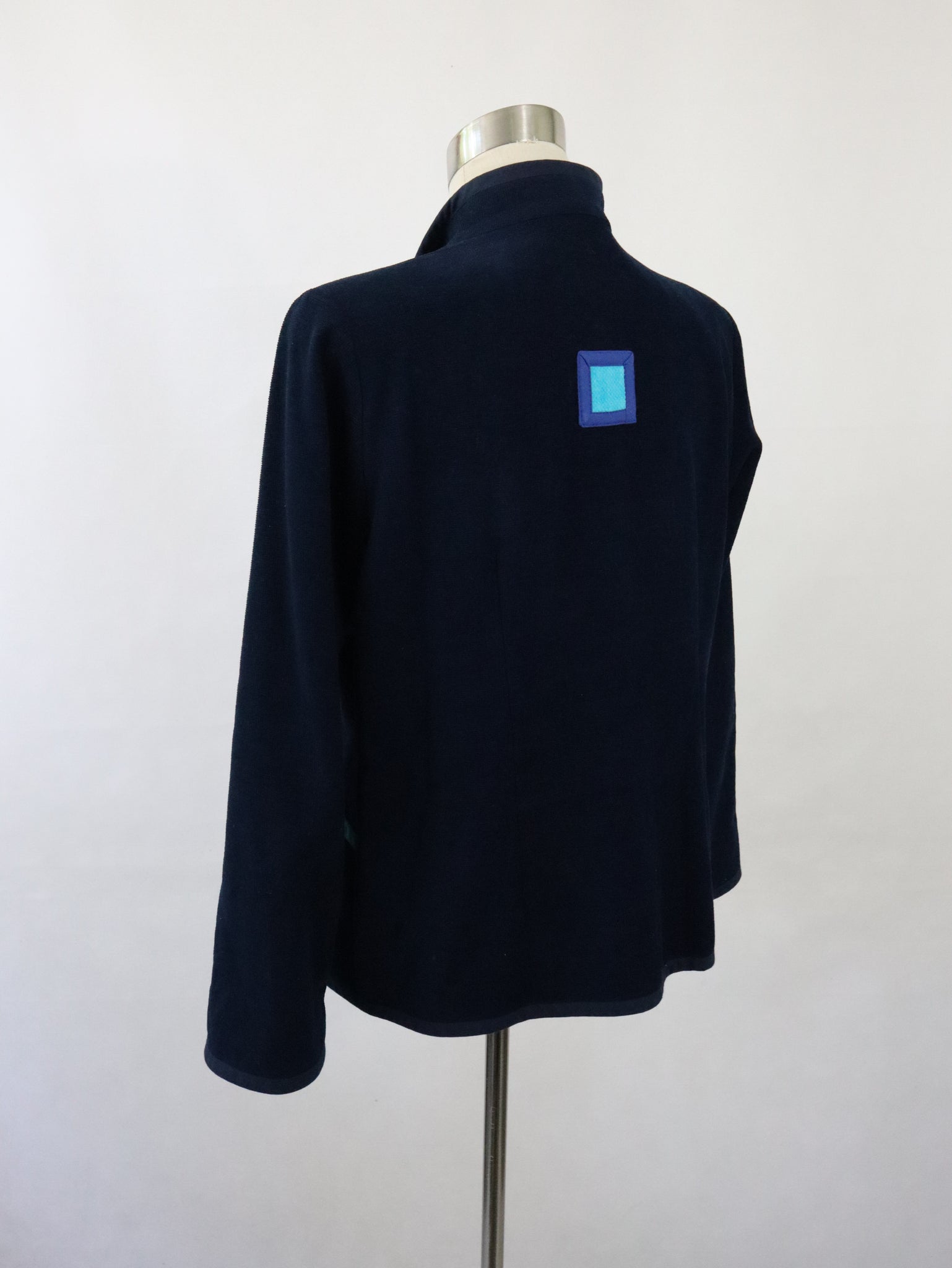 Jakku on ommeltu pääosin mustasta poppanakankaasta ja edessä on siniset ja turkoosit kaistaleet. Materiaali 100% puuvillaa, vuori 100% asetaattia, pesu 40 asteessa.