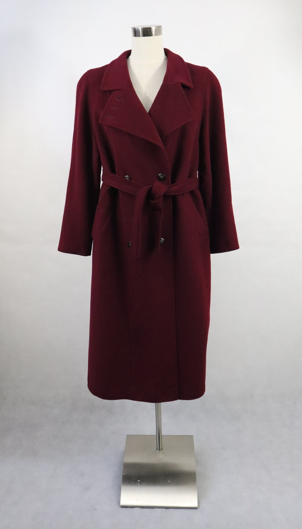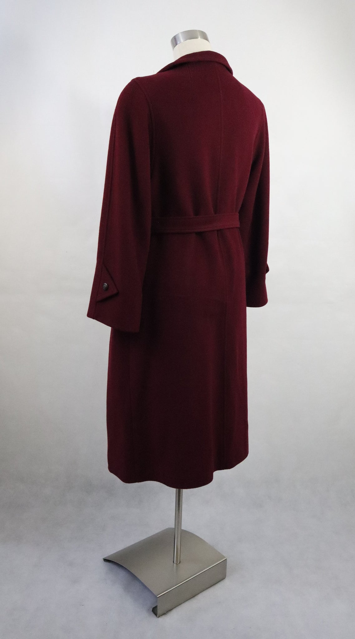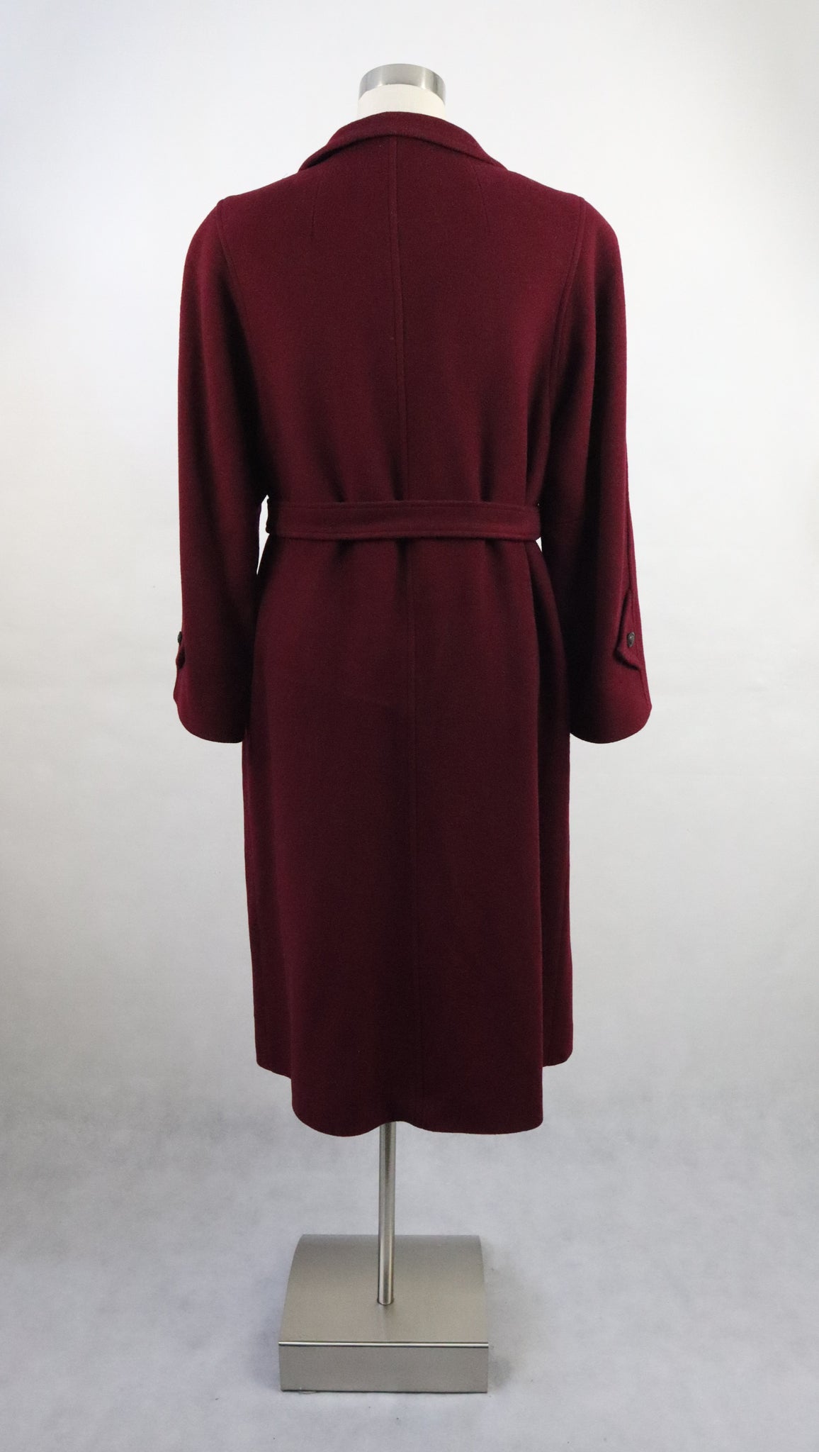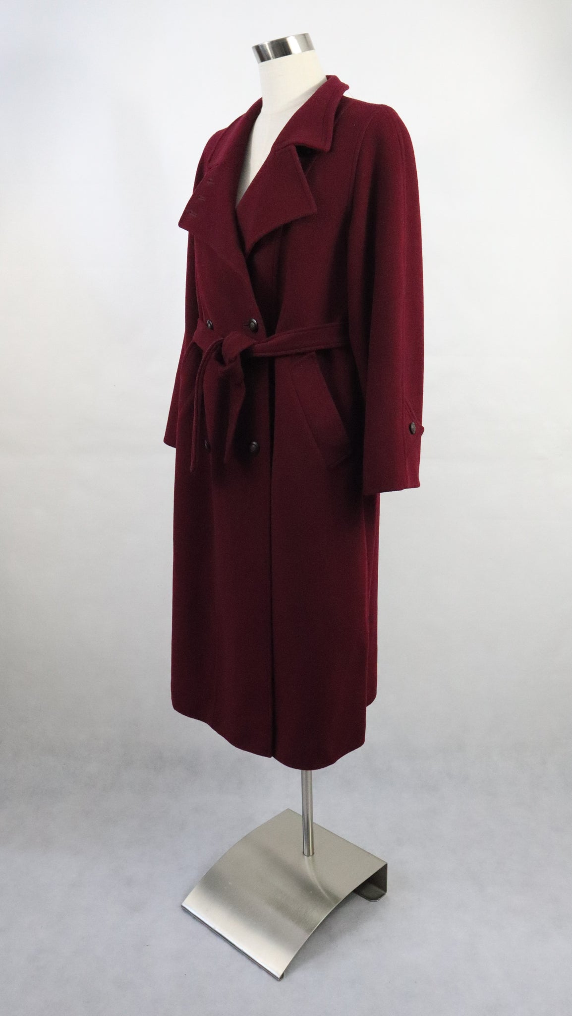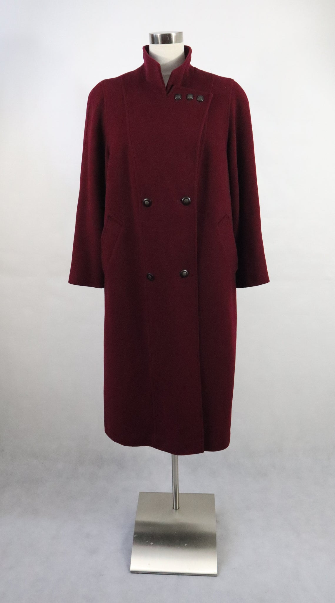 Viininpunainen pitkä villakangastakki 80-90-luvulta, valmistaja Lacoda High Quality Clothing - Classics For Today, made in Finland.