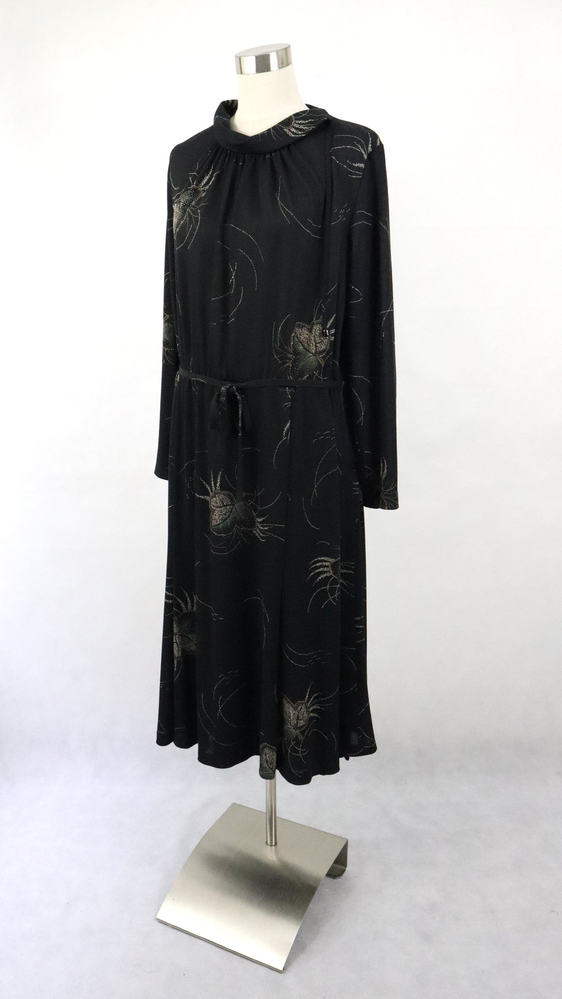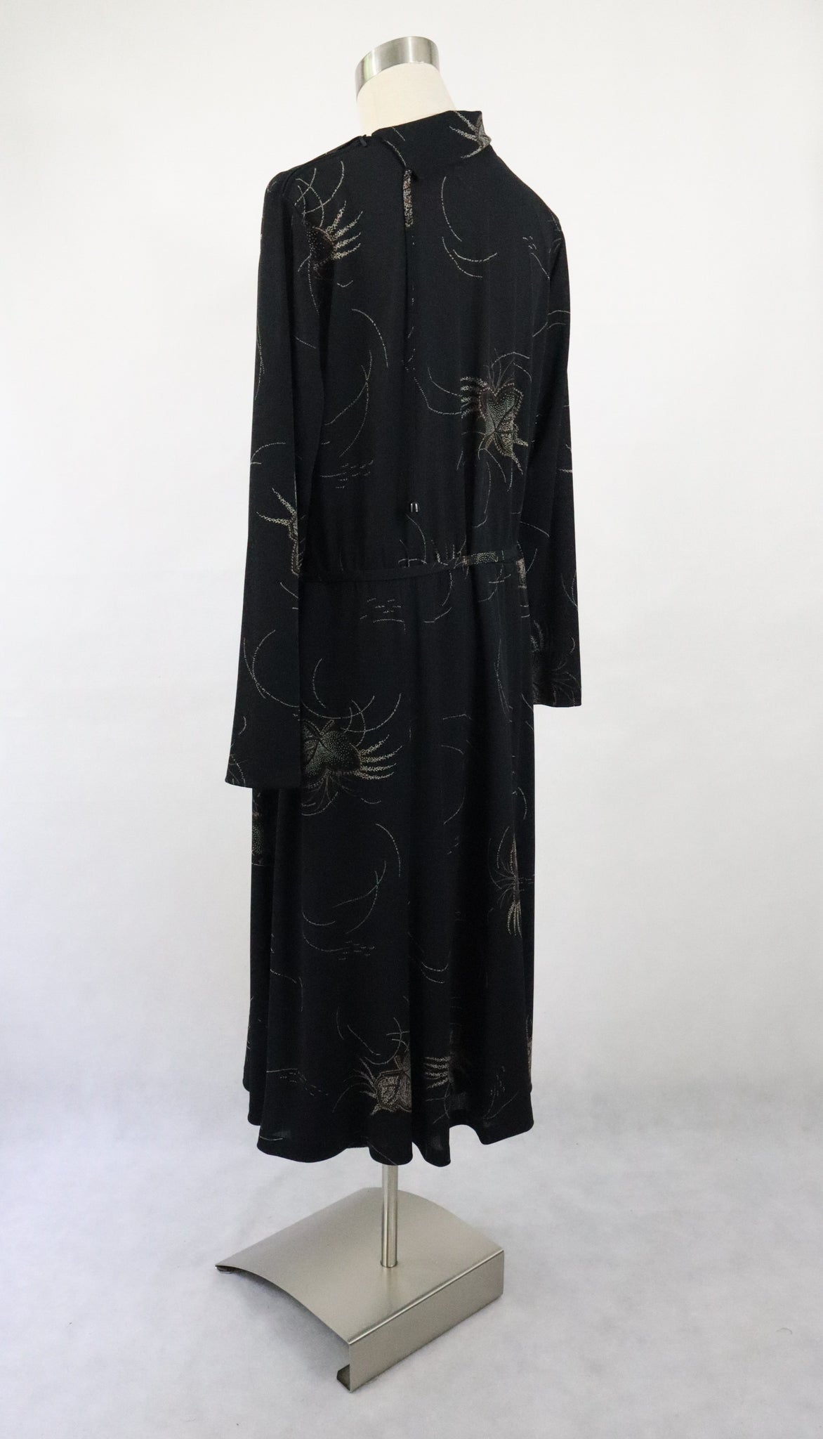 Musta mekko hillityllä ruskeasävyisellä kuvioinnilla, valmistaja Nina Naisten Pukutehdas Oy Finland.