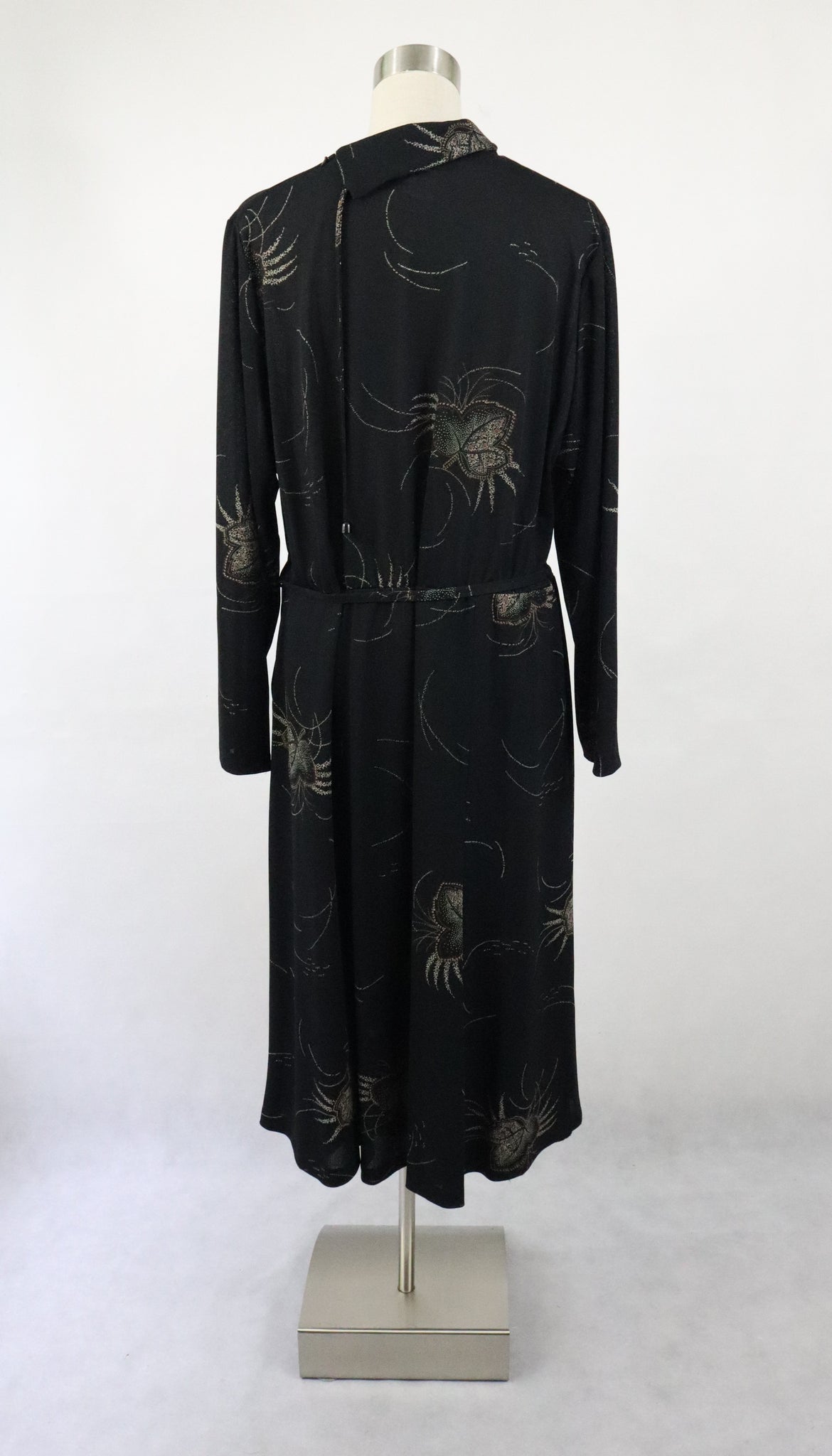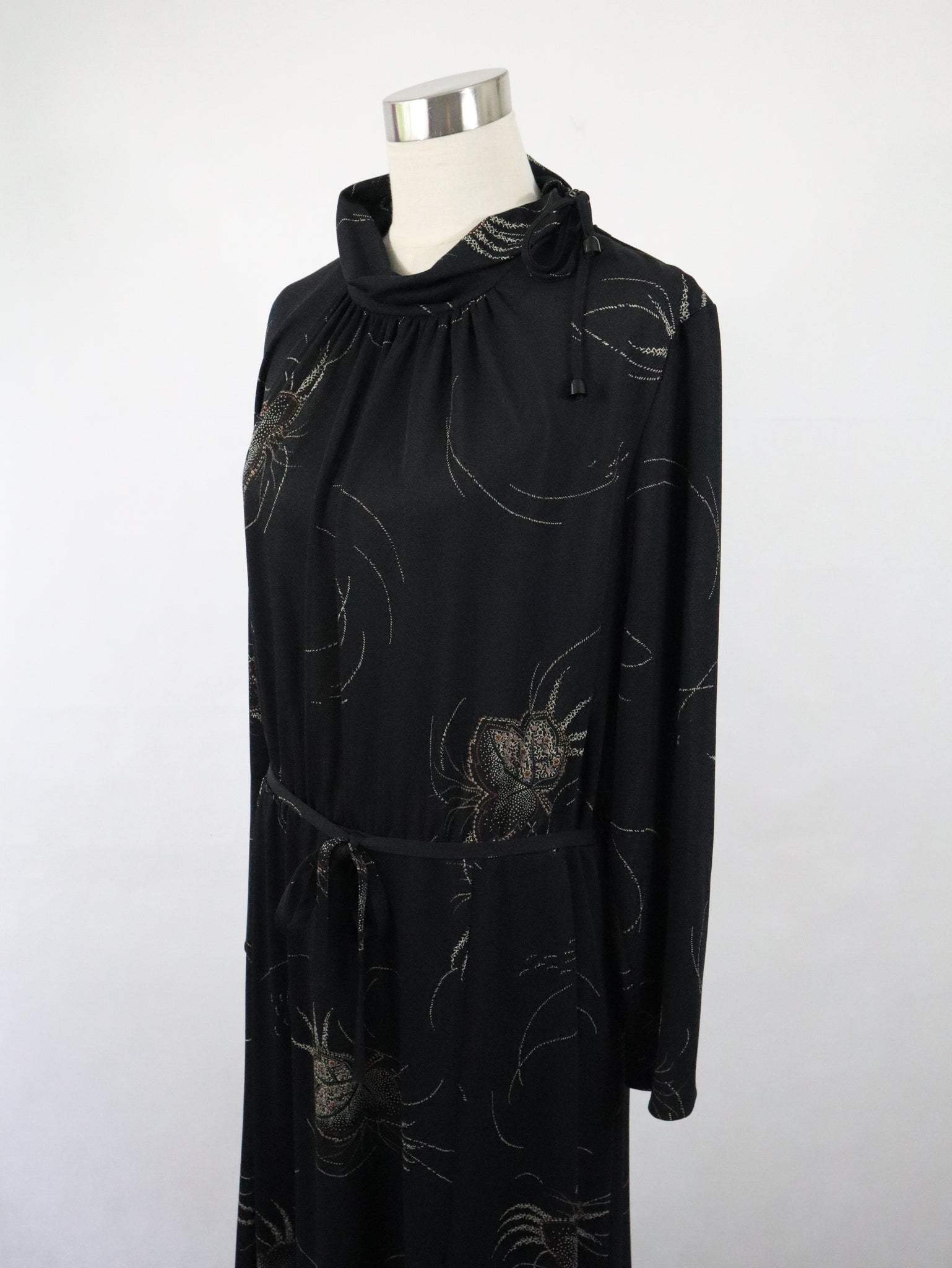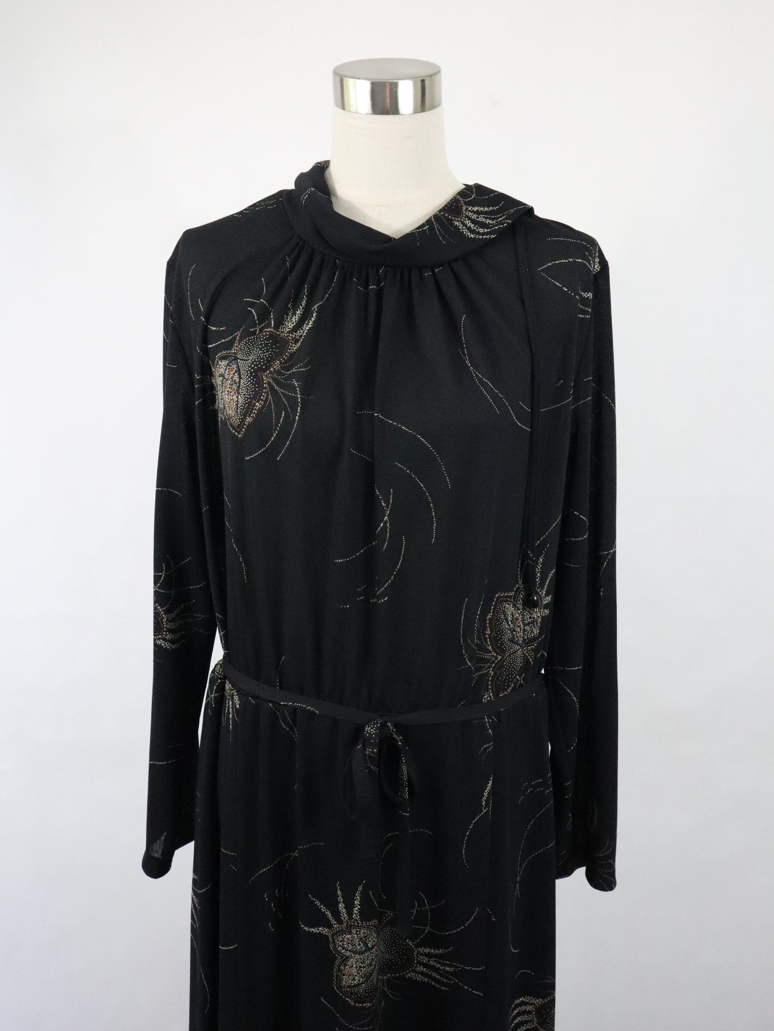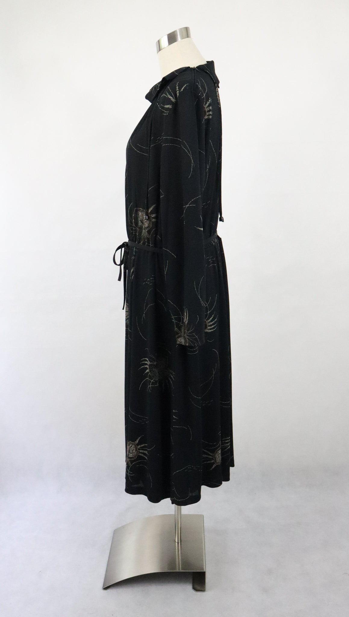 Mekossa on käännettävä pystykaulus ja toisella olkapäällä vetoketju. Kauluksessa on solmittavat nauhat. Yläosa on laskostettu ja vyötäröllä on kuminauha. Mekkoon kuuluu kapea solmittava vyö. Mekon toisella sivulla on vetoketju. Mekko on helmaosasta vuoritettu.