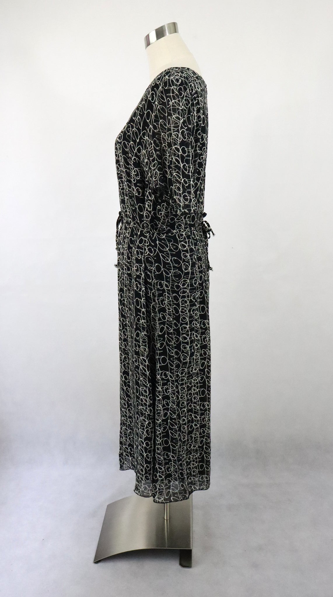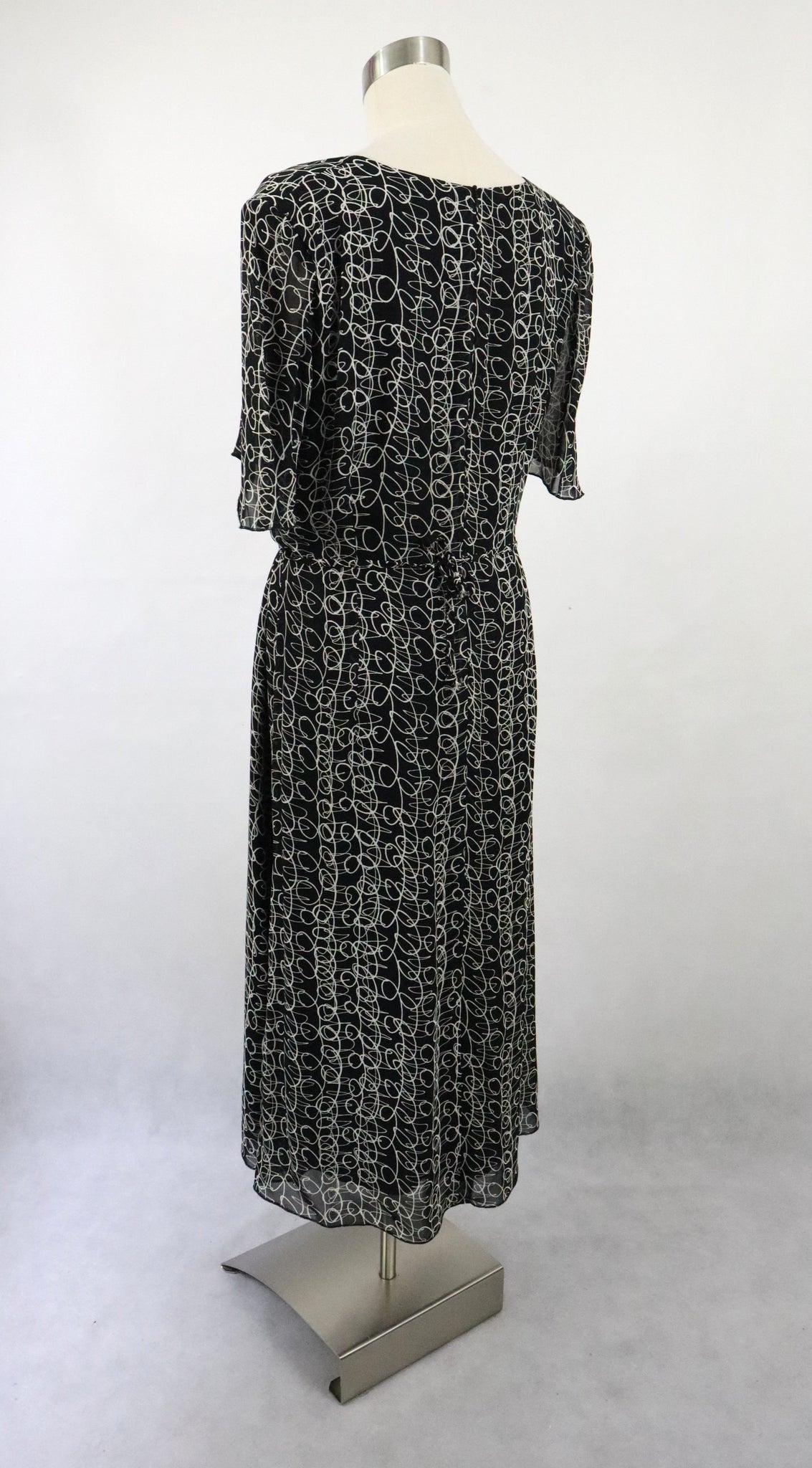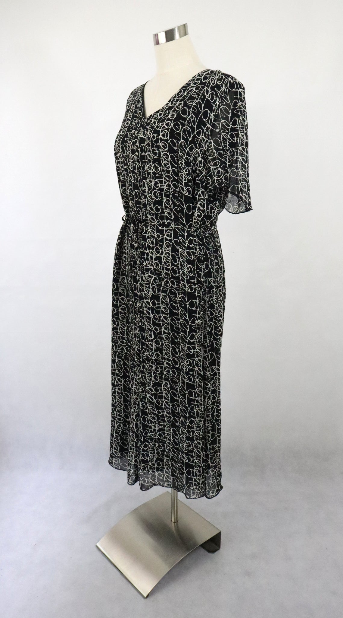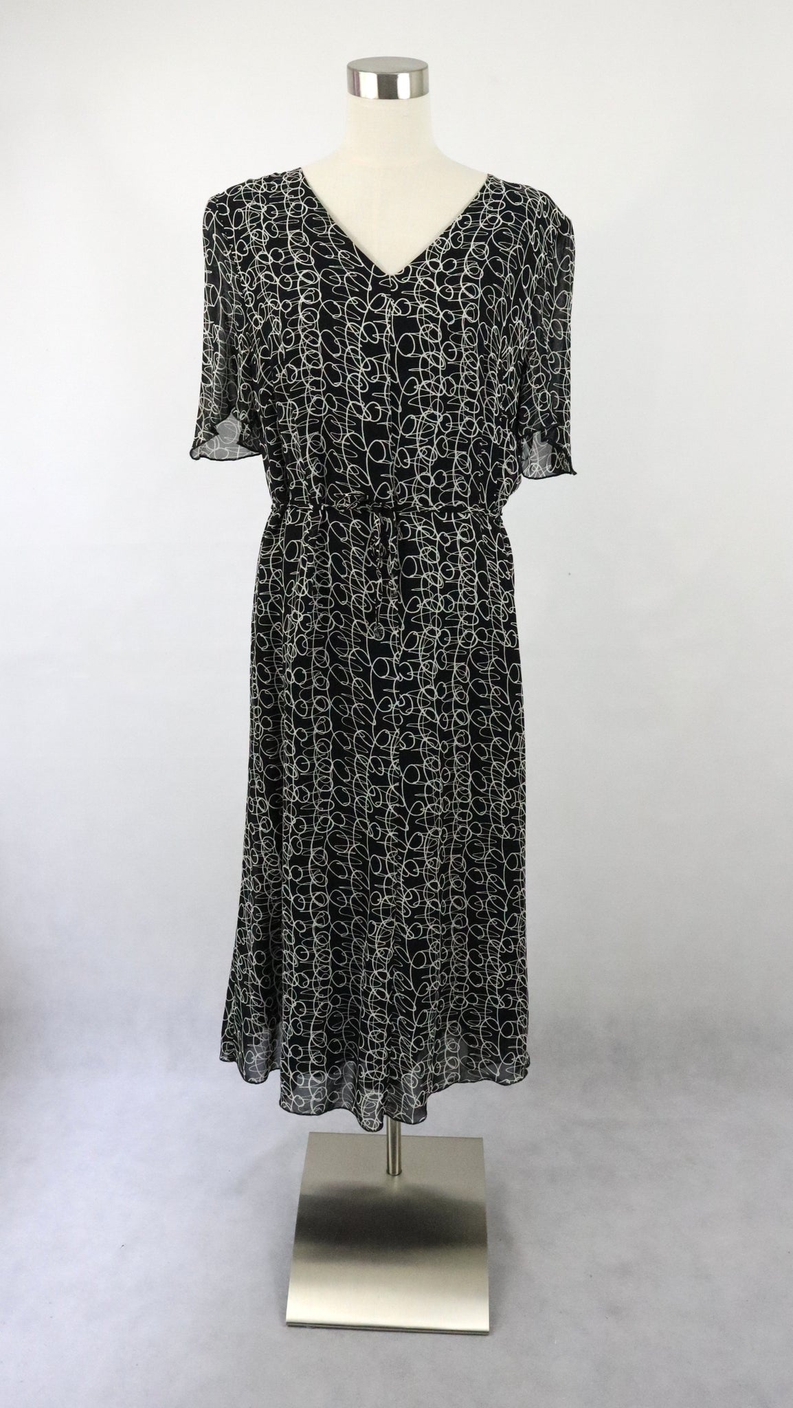 Mustavalkoinen kevyestä sifonkikankaasta valmistettu pitkä mekko, valmistaja Delia by Modelia, made in Finland.