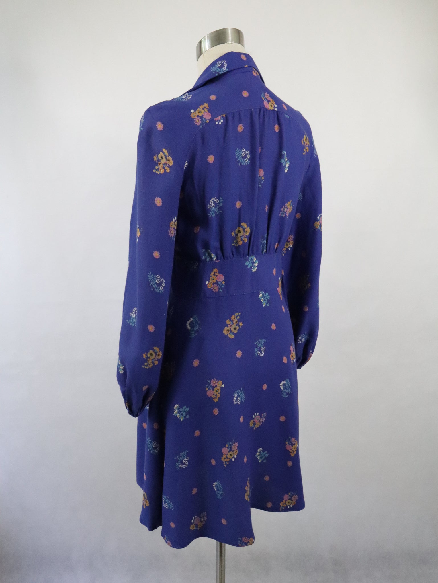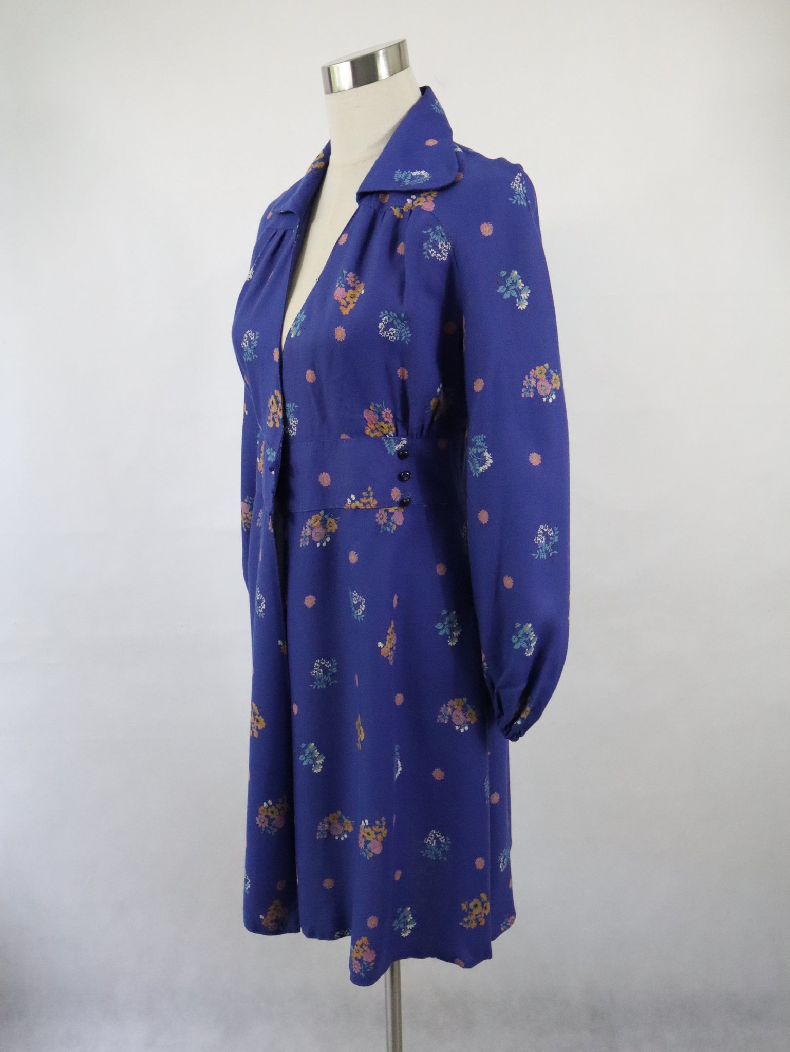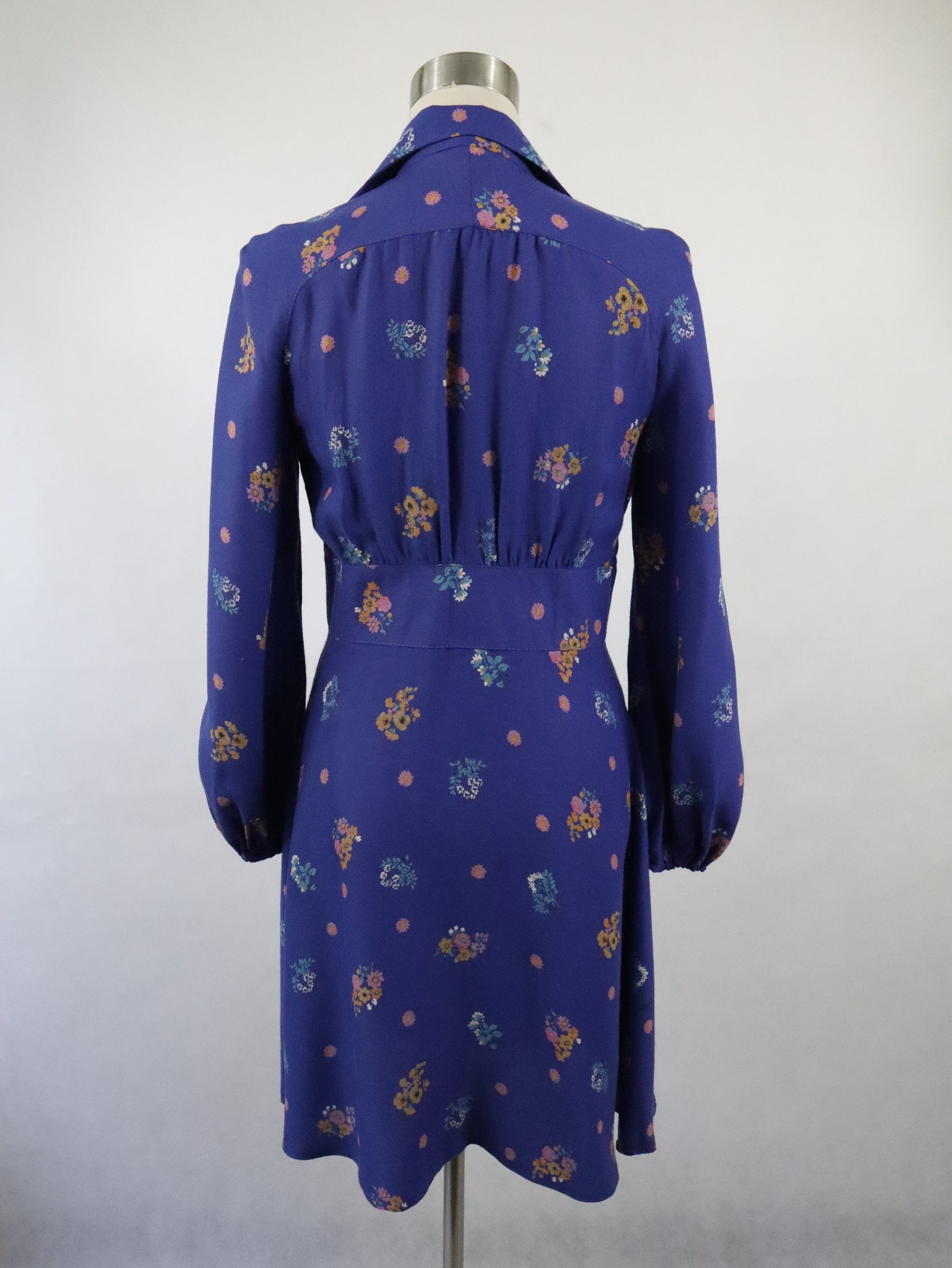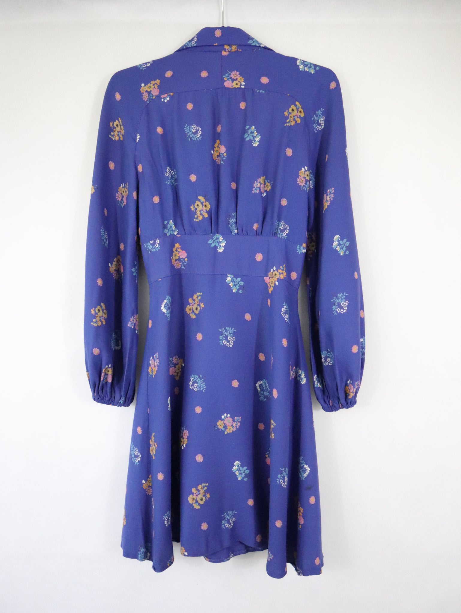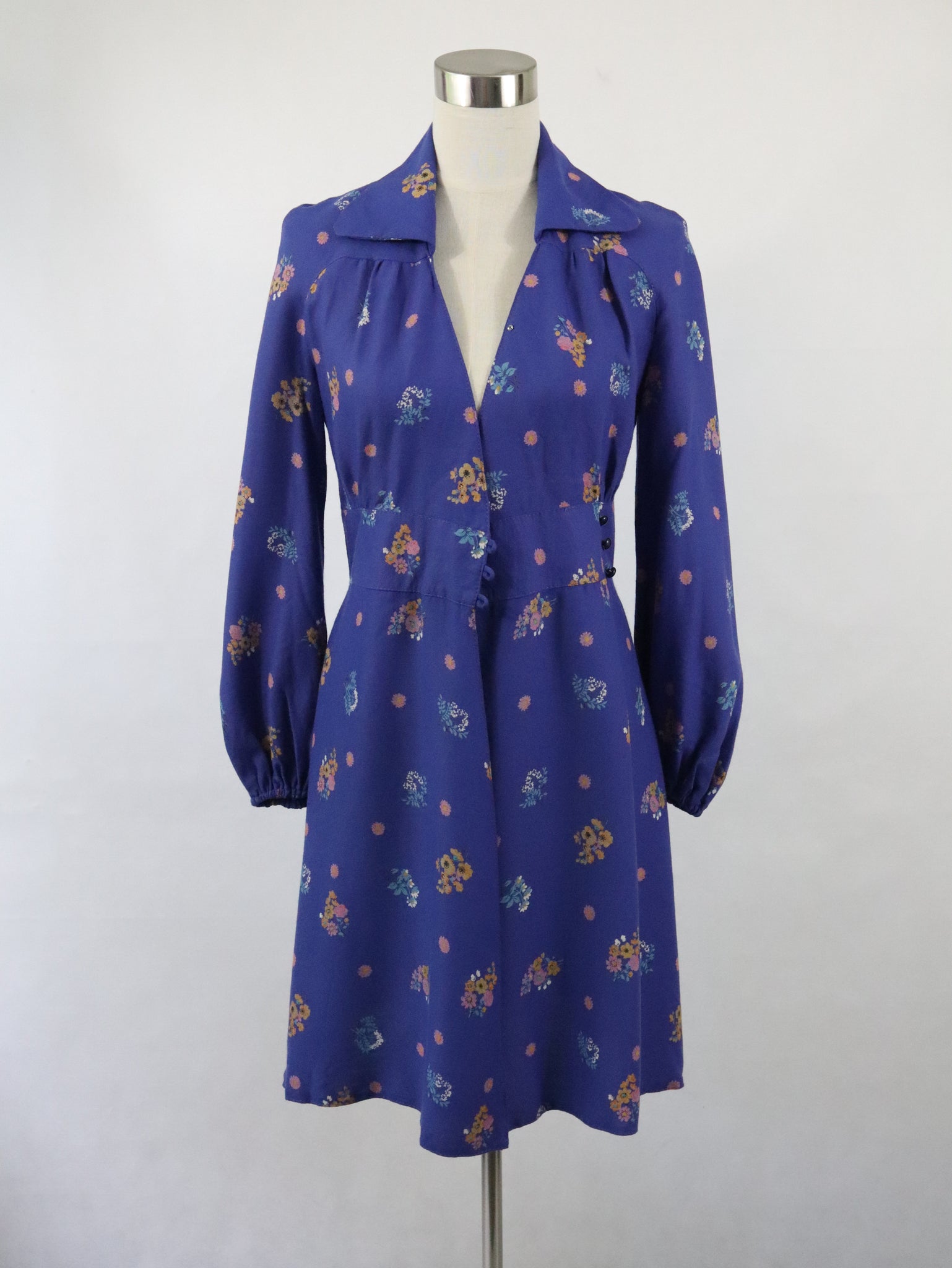 Sininen kietaisumallinen kukkamekko kotimaista 70-luvun vintagea