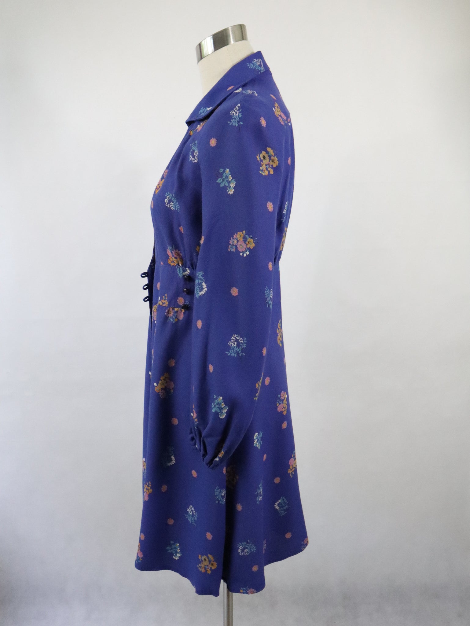 Sininen lyhyt mekko värikkäällä kukkakuosilla, valmistaja Tiina, Teini-Tuote Finn-Teen, made in Finland.