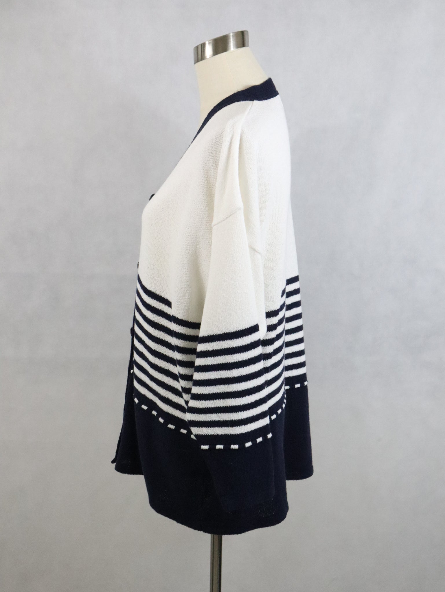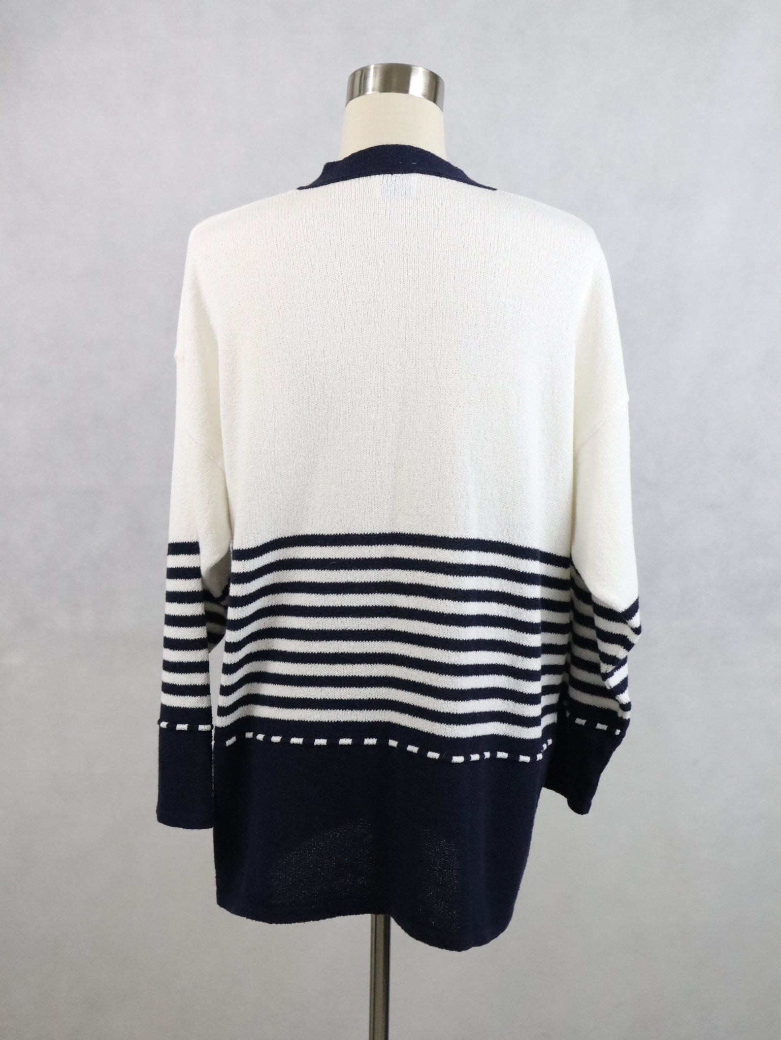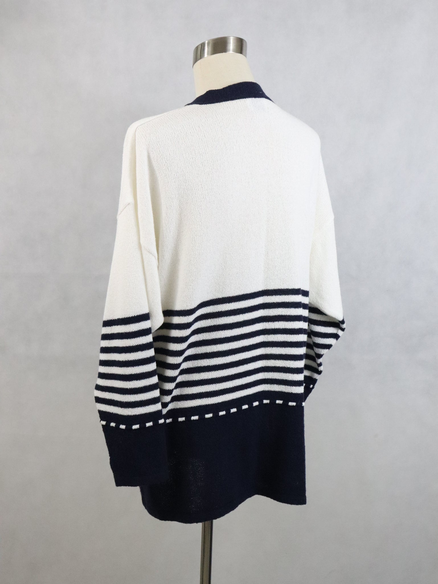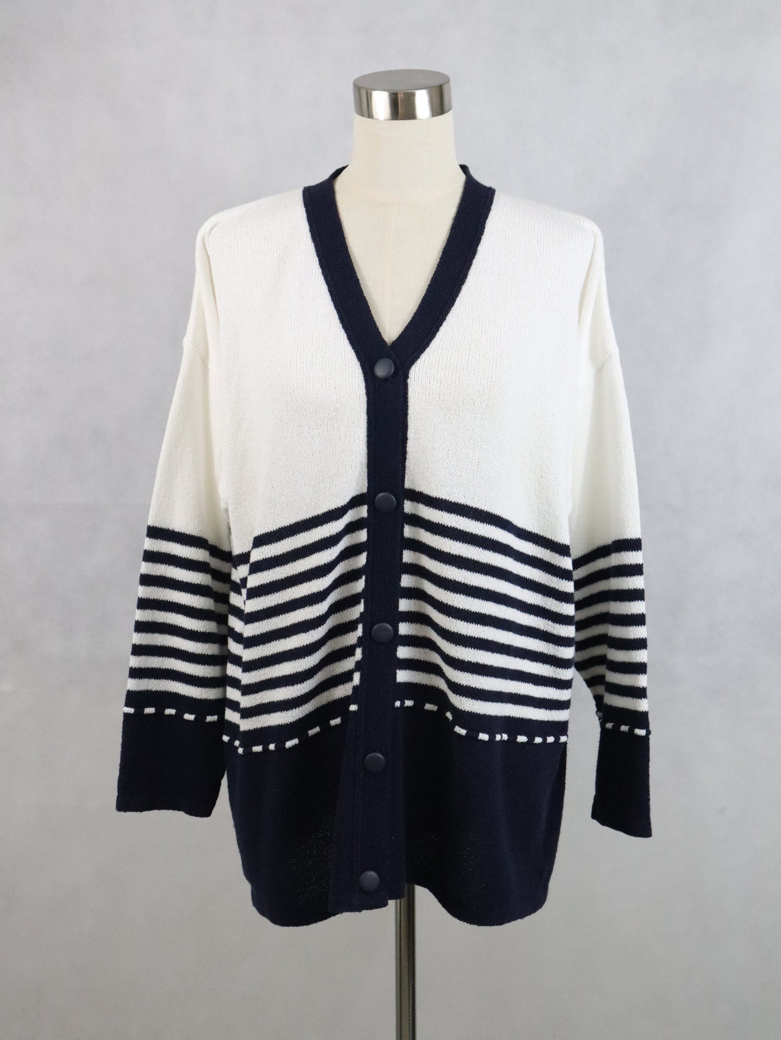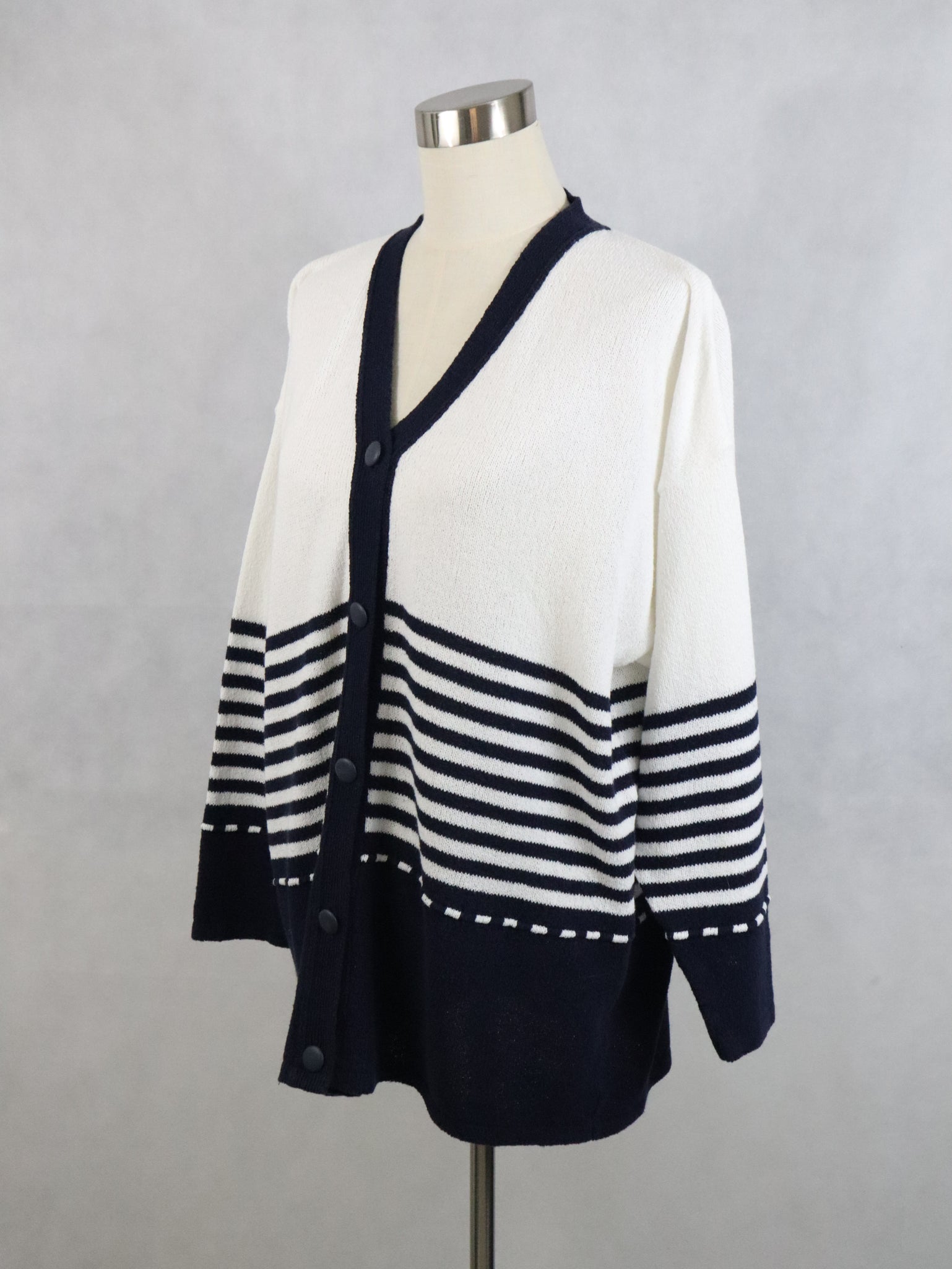 80-90-luvun kotimaista vintagea valkoinen neuletakki tummansinisillä raidoilla, valmistaja Balladi by Holopainen, made in Finland.