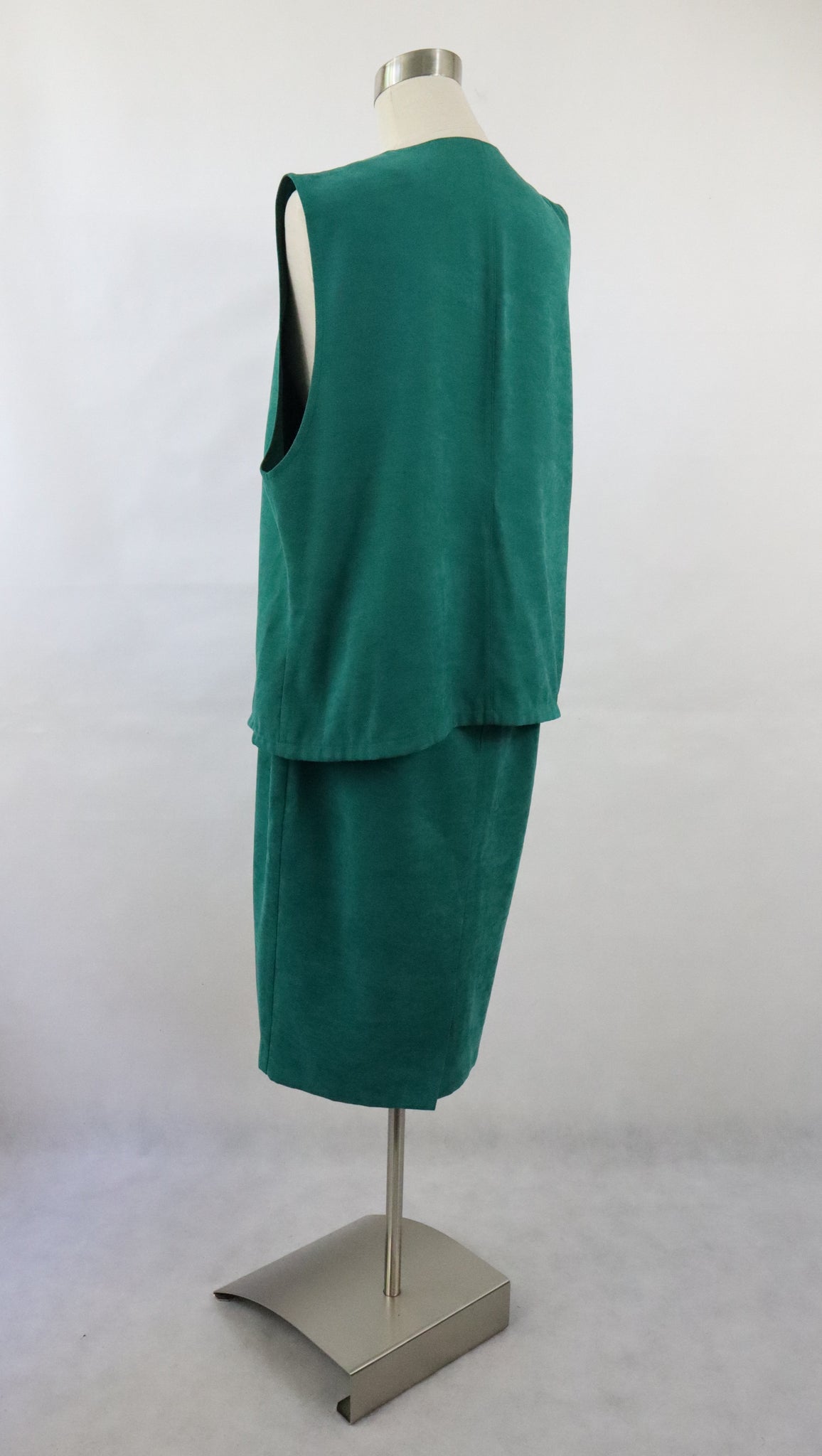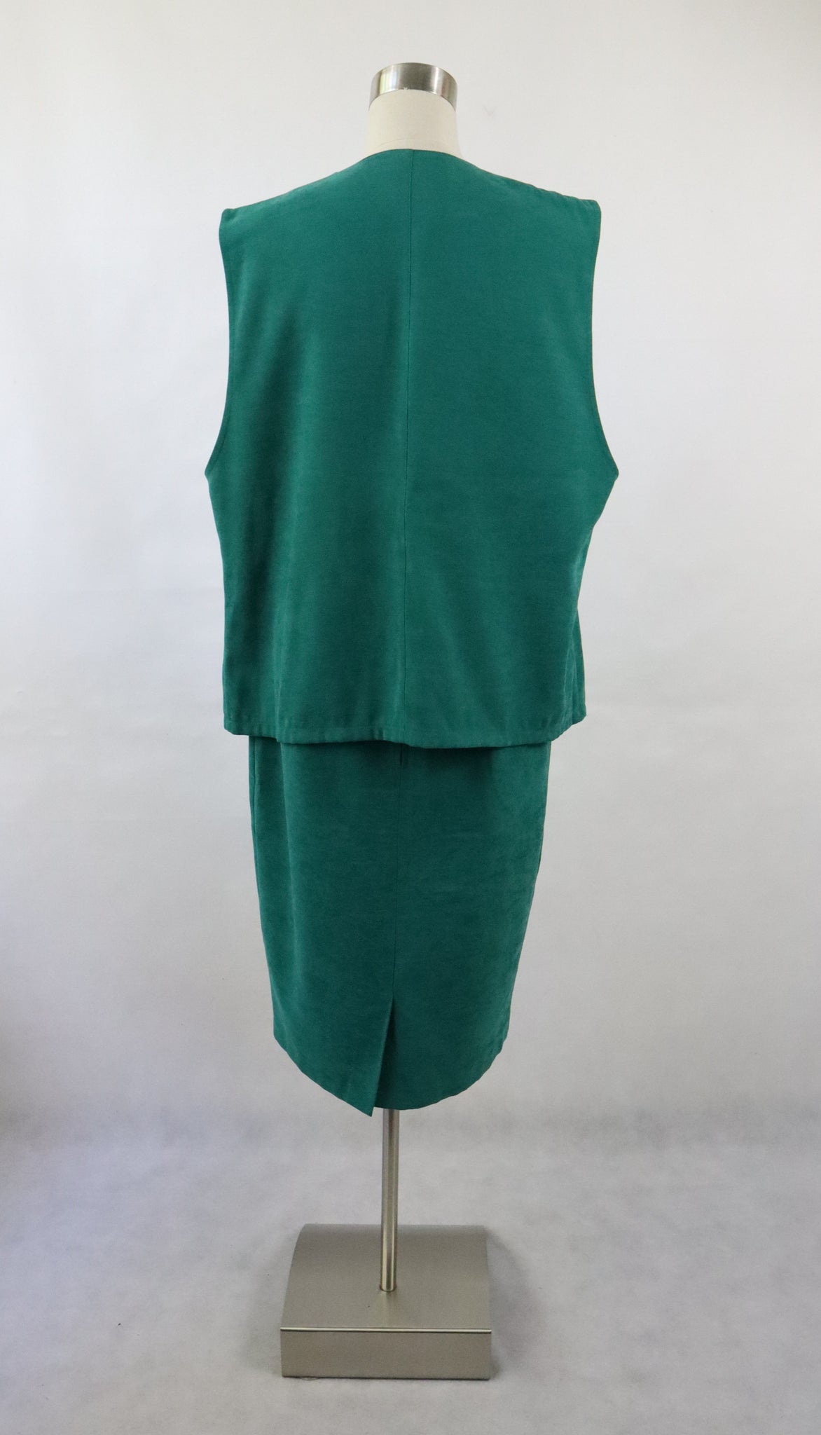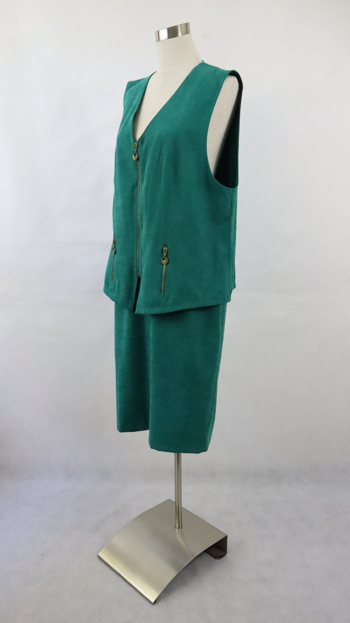 Vihreä kaksiosainen asu, johon kuuluu liivi ja hame, valmistaja L Collection. Liivissä on kullanvärinen vetoketju ja vetoketjulliset valetaskut. Liivi on vuorittamaton. Helma on edestä epäsymmetrinen. Hameessa on takana vetoketju ja nappi ja vyötäröllä sivuilla kuminauhaa. Helmassa on takana halkio. Hame on vuoritettu.