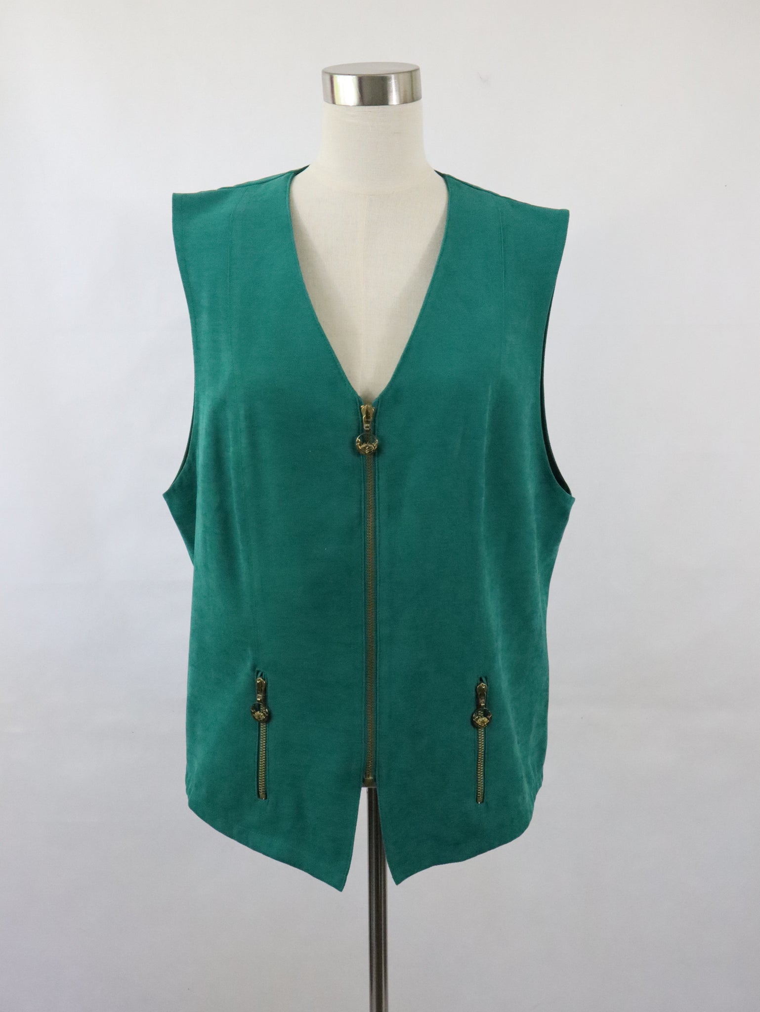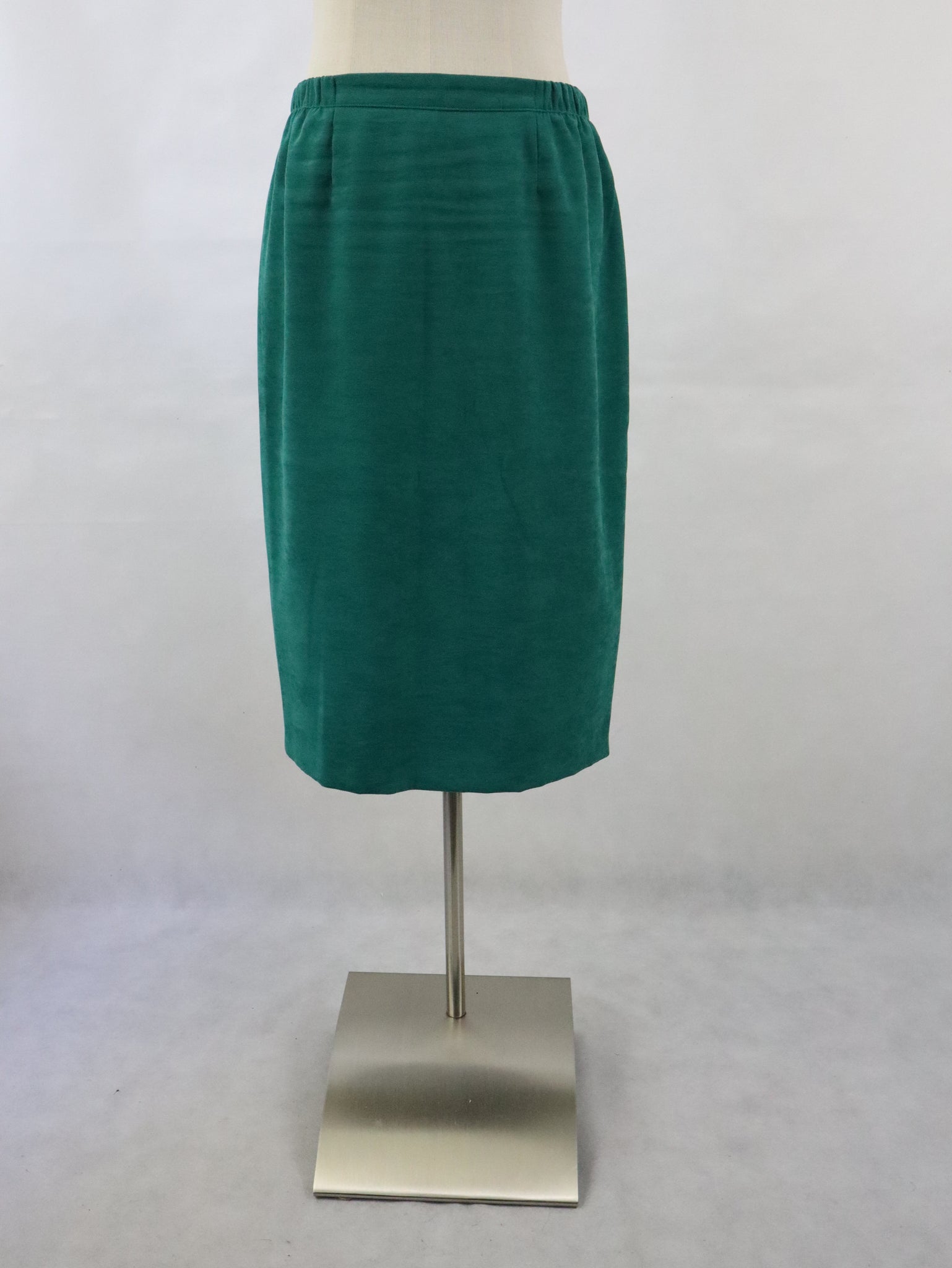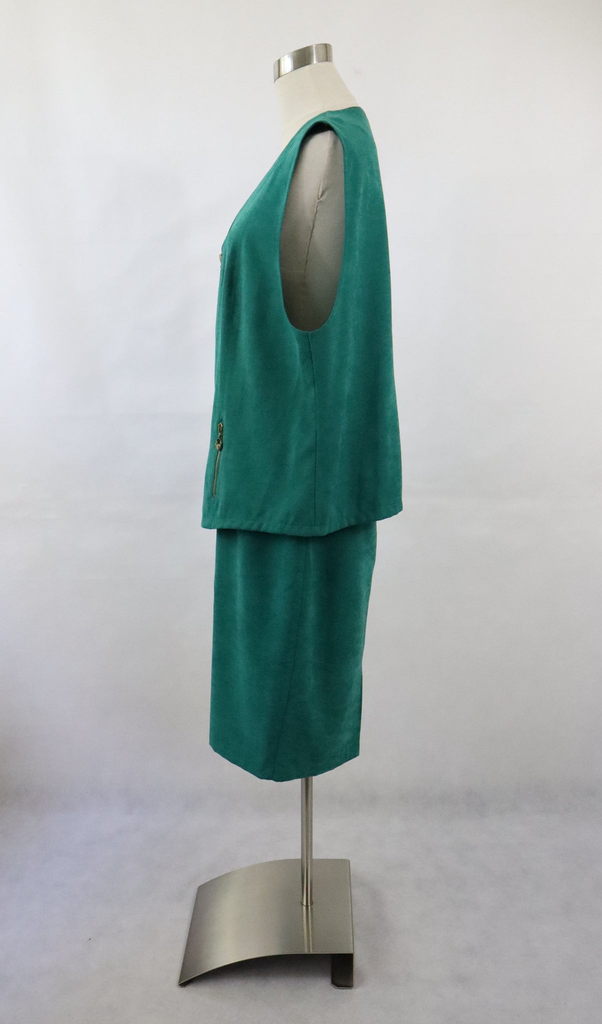 Vihreä kaksiosainen asu, johon kuuluu liivi ja hame, valmistaja L Collection. Liivissä on kullanvärinen vetoketju ja vetoketjulliset valetaskut. Liivi on vuorittamaton. Helma on edestä epäsymmetrinen. Hameessa on takana vetoketju ja nappi ja vyötäröllä sivuilla kuminauhaa. Helmassa on takana halkio. Hame on vuoritettu.