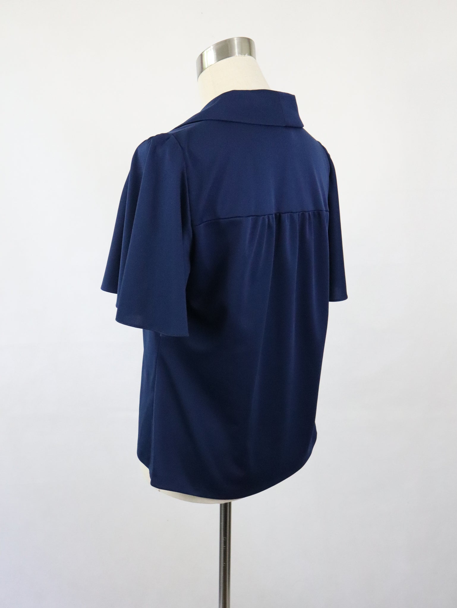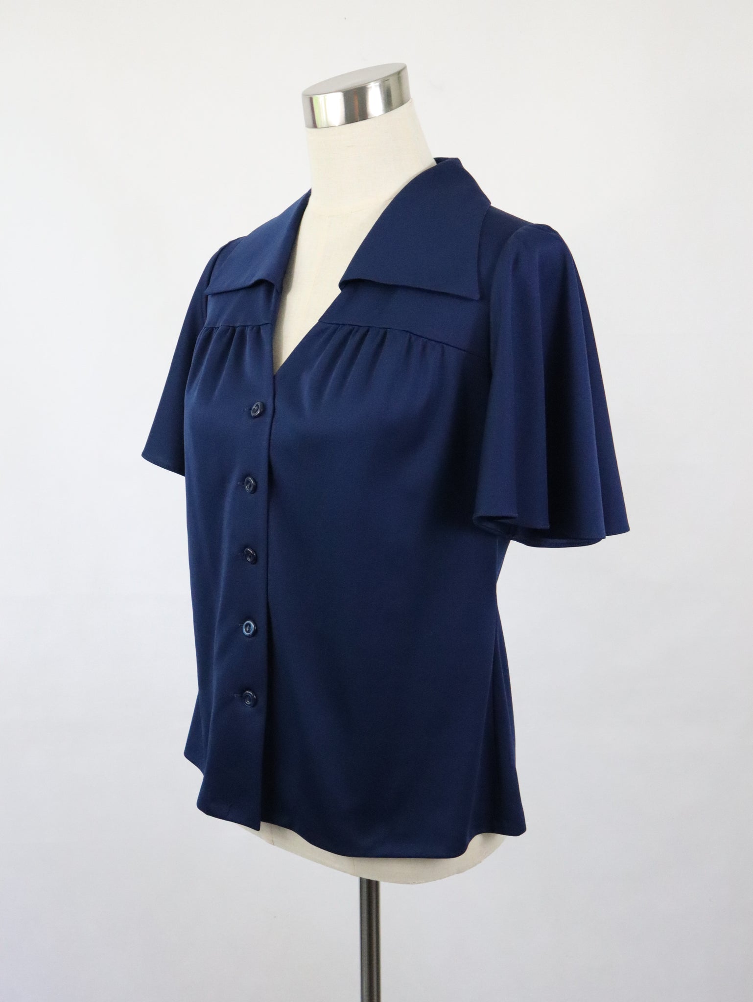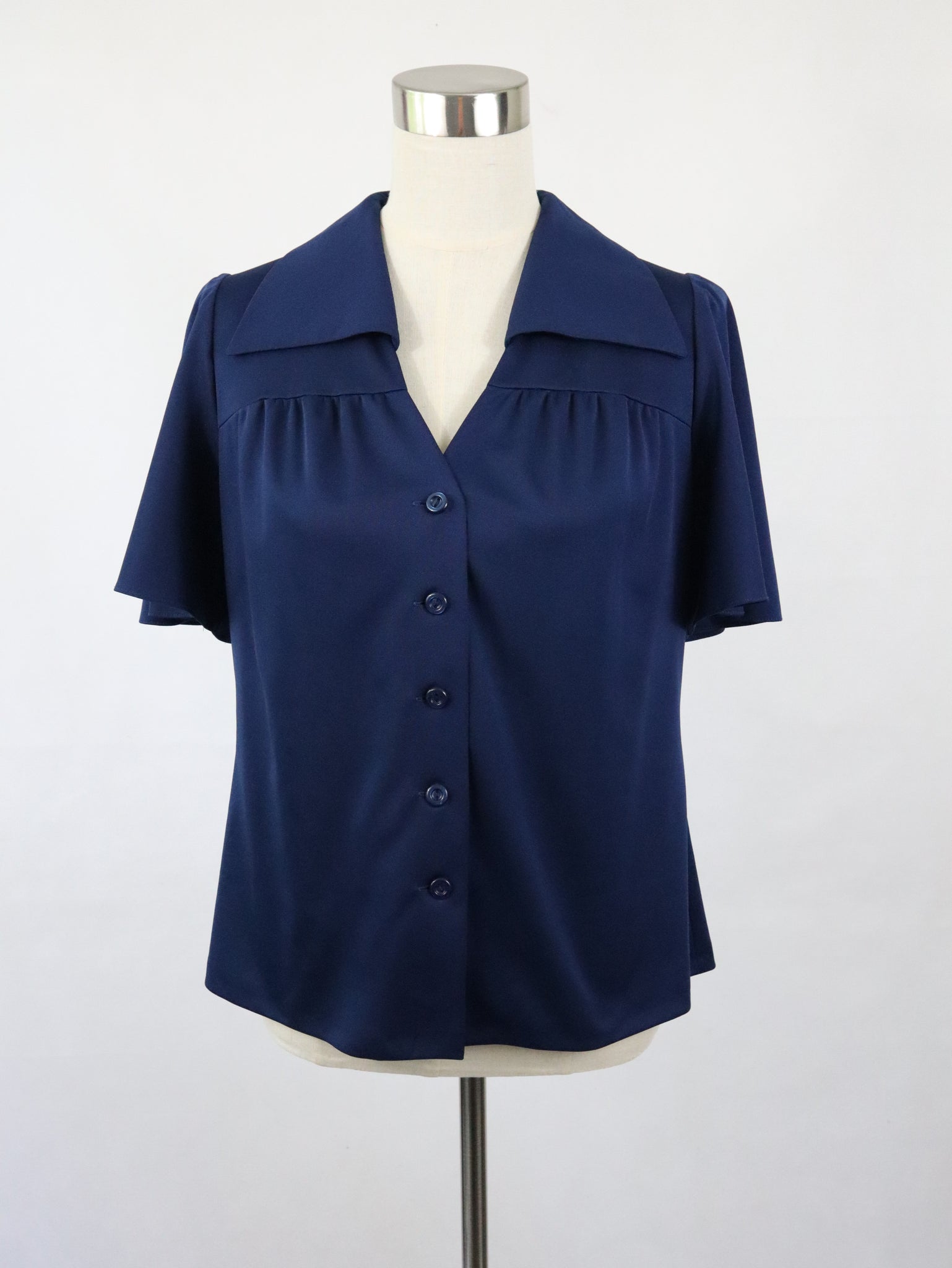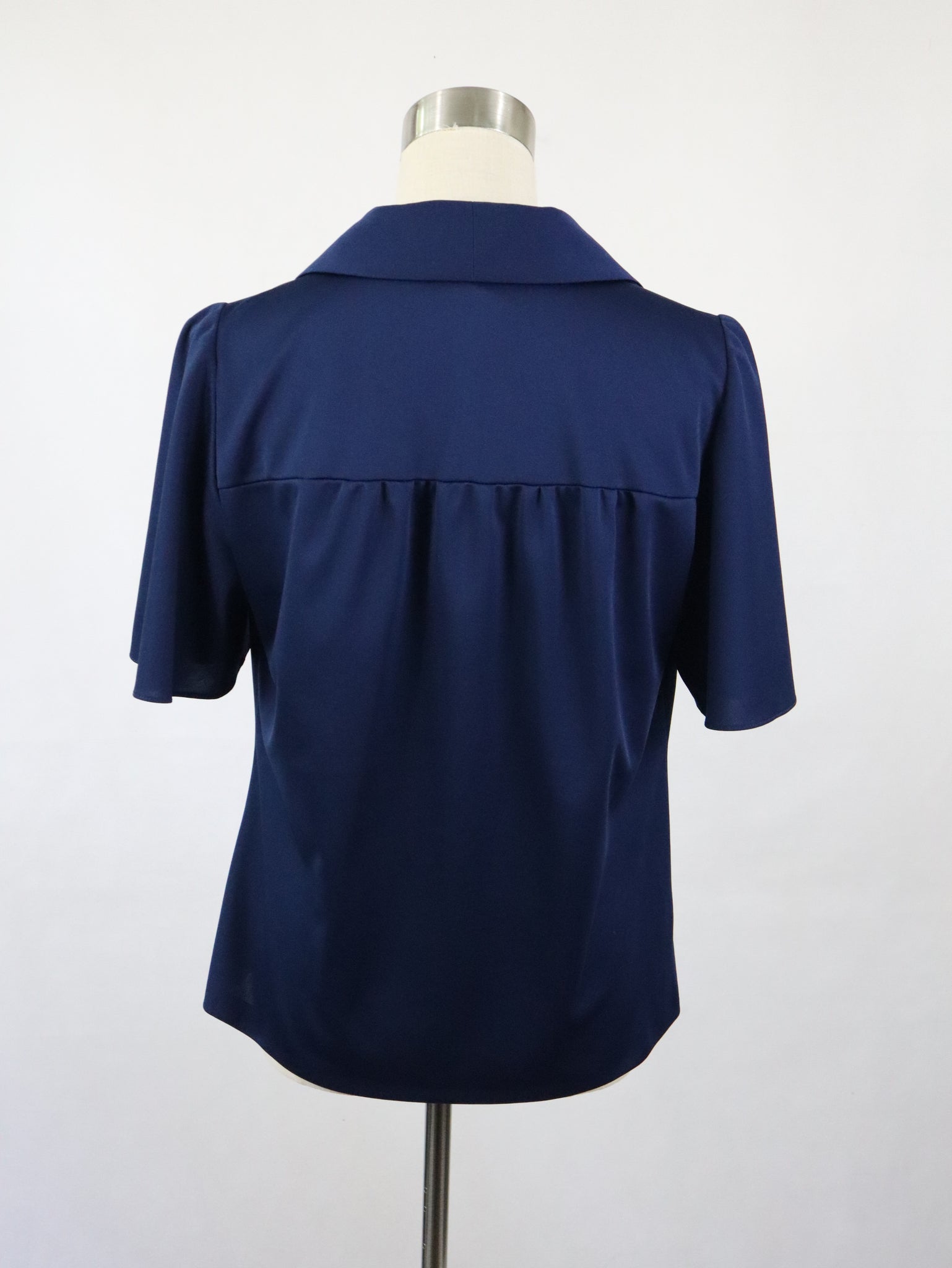 Tummansininen lyhythihainen pusero arviolta 70-luvun kotimaista vintagea, valmistaja Soilituote, Lahti Finland.