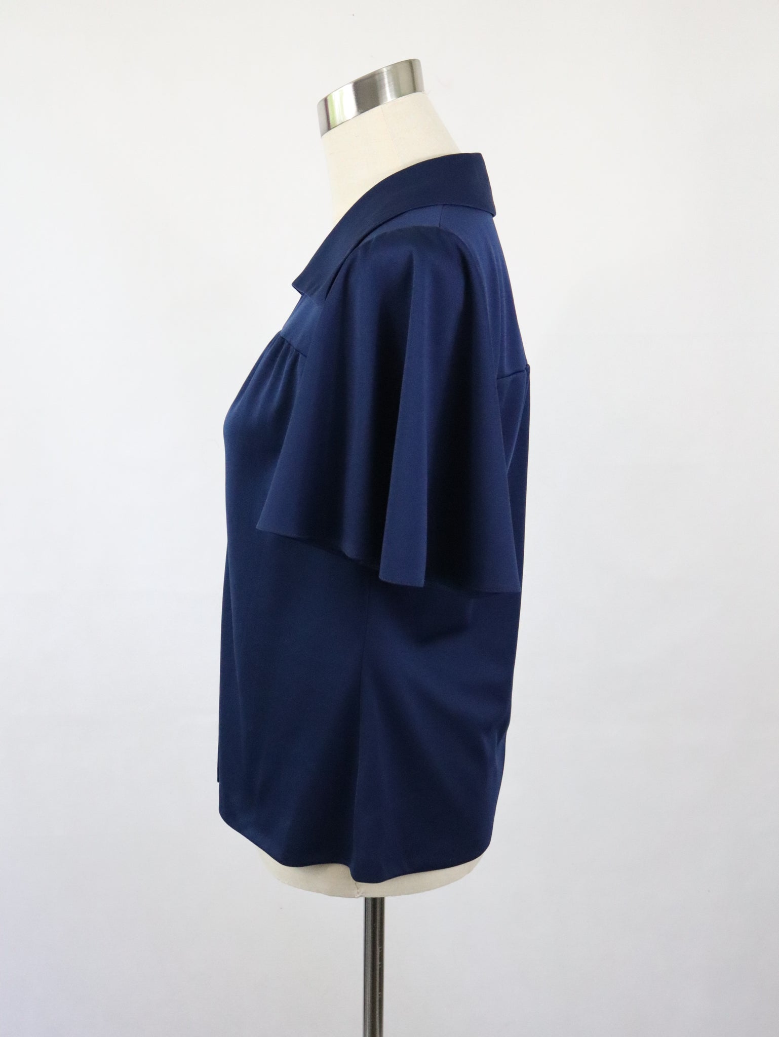 Puserossa on v-mallinen kaula-aukko ja isot kaulukset sekä leveät perhosmalliset lyhyet hihat. Rinnan kohdalla on poikkileikkaus ja kangas on sen alta laskostettu sekä edestä että takaa.