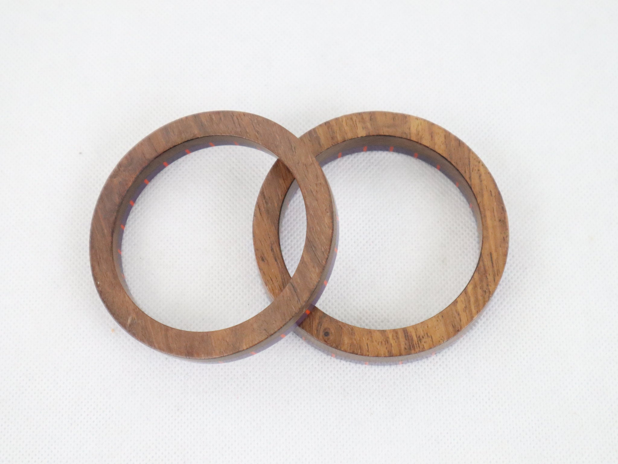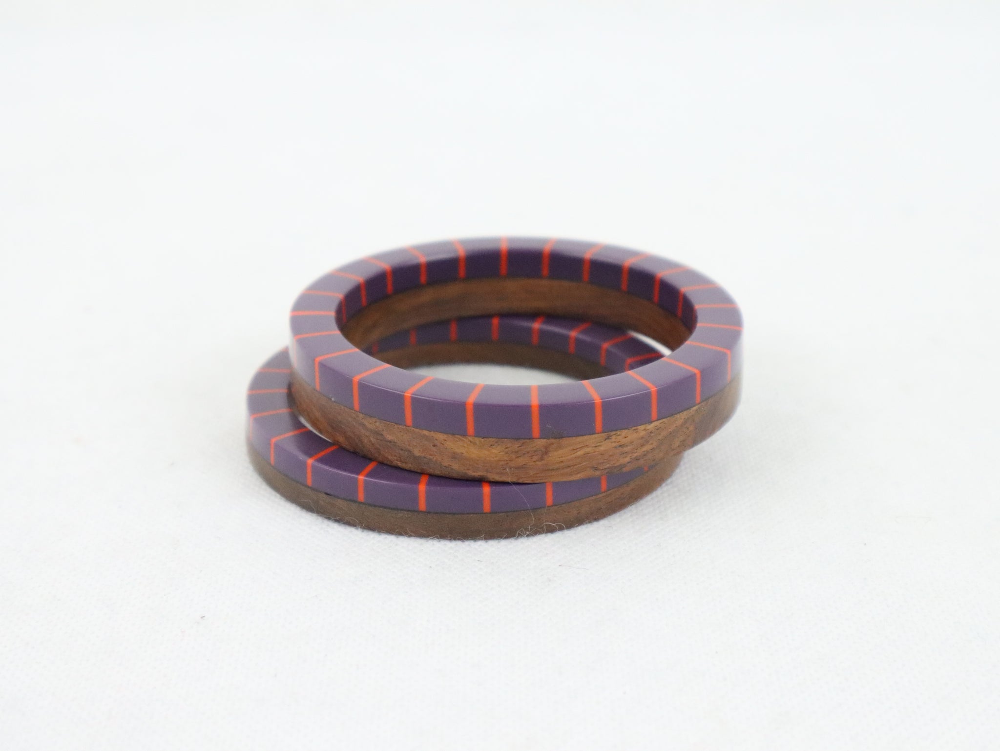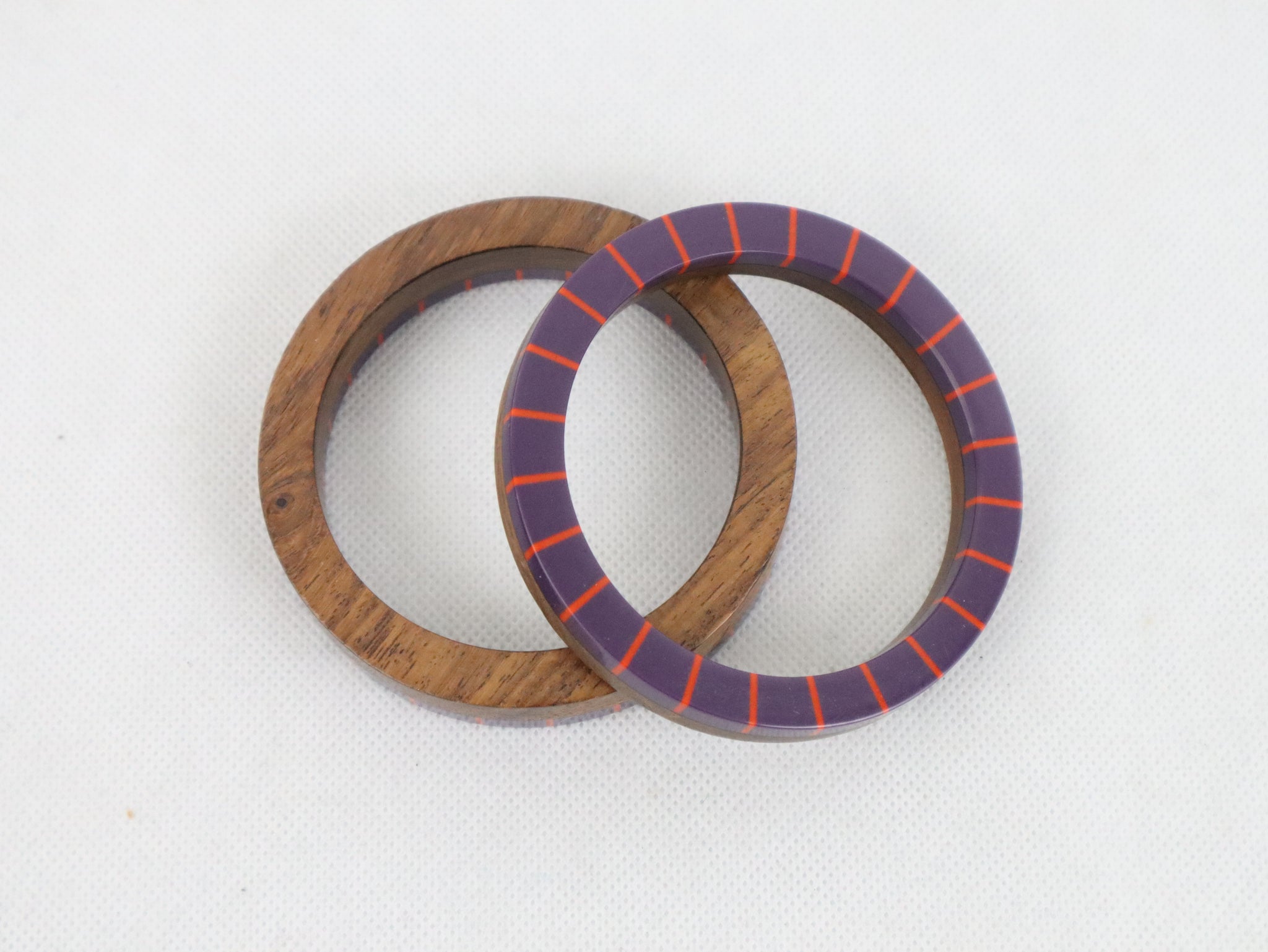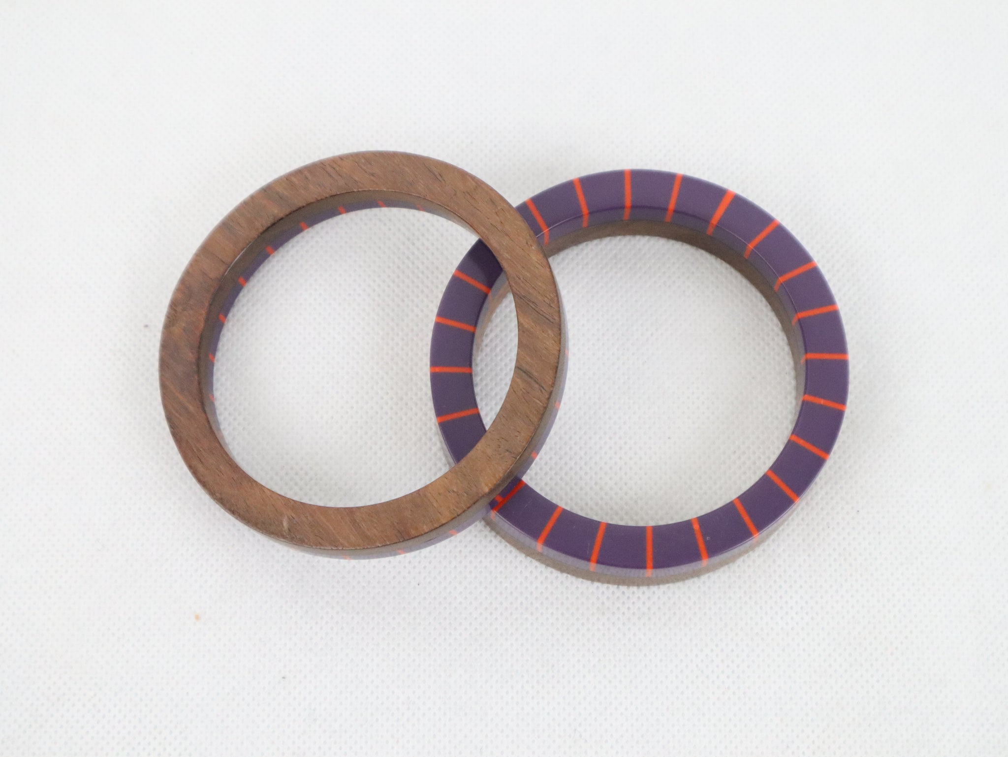 Settiin kuuluu kaksi eri kokoista rannerengasta, joita voi käyttää yhdessä tai erikseen. Rannerenkaiden toinen puoli on ruskeaa puuta ja toinen puoli muovia, väreinä violetti ja oranssi.