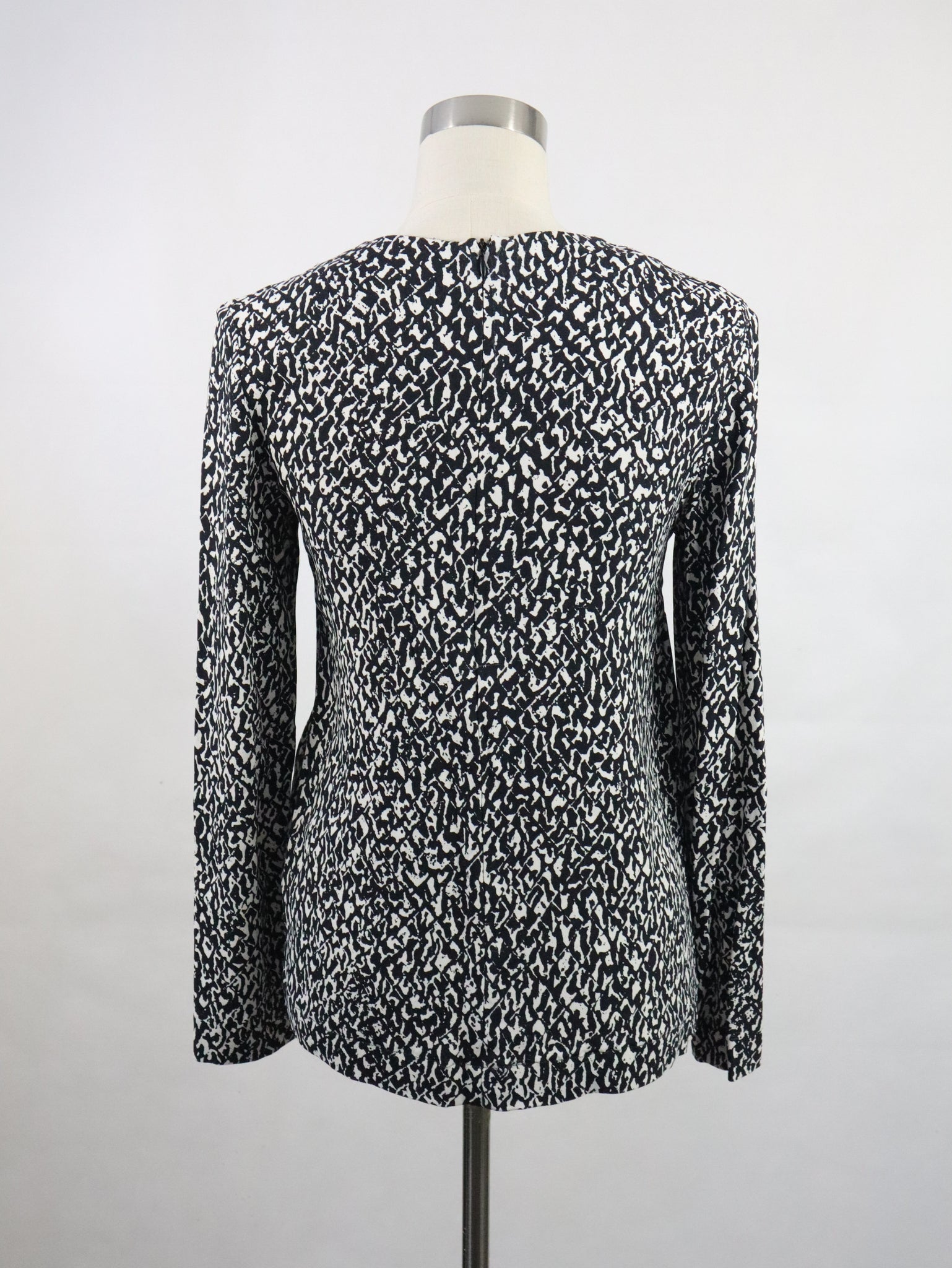 Puserossa on pyöreä kaula-aukko ja takana vetoketju. Pusero on malliltaan suora ja rinnan kohdalta muotoon leikattu. Hihat ovat pitkät ja kapeat.