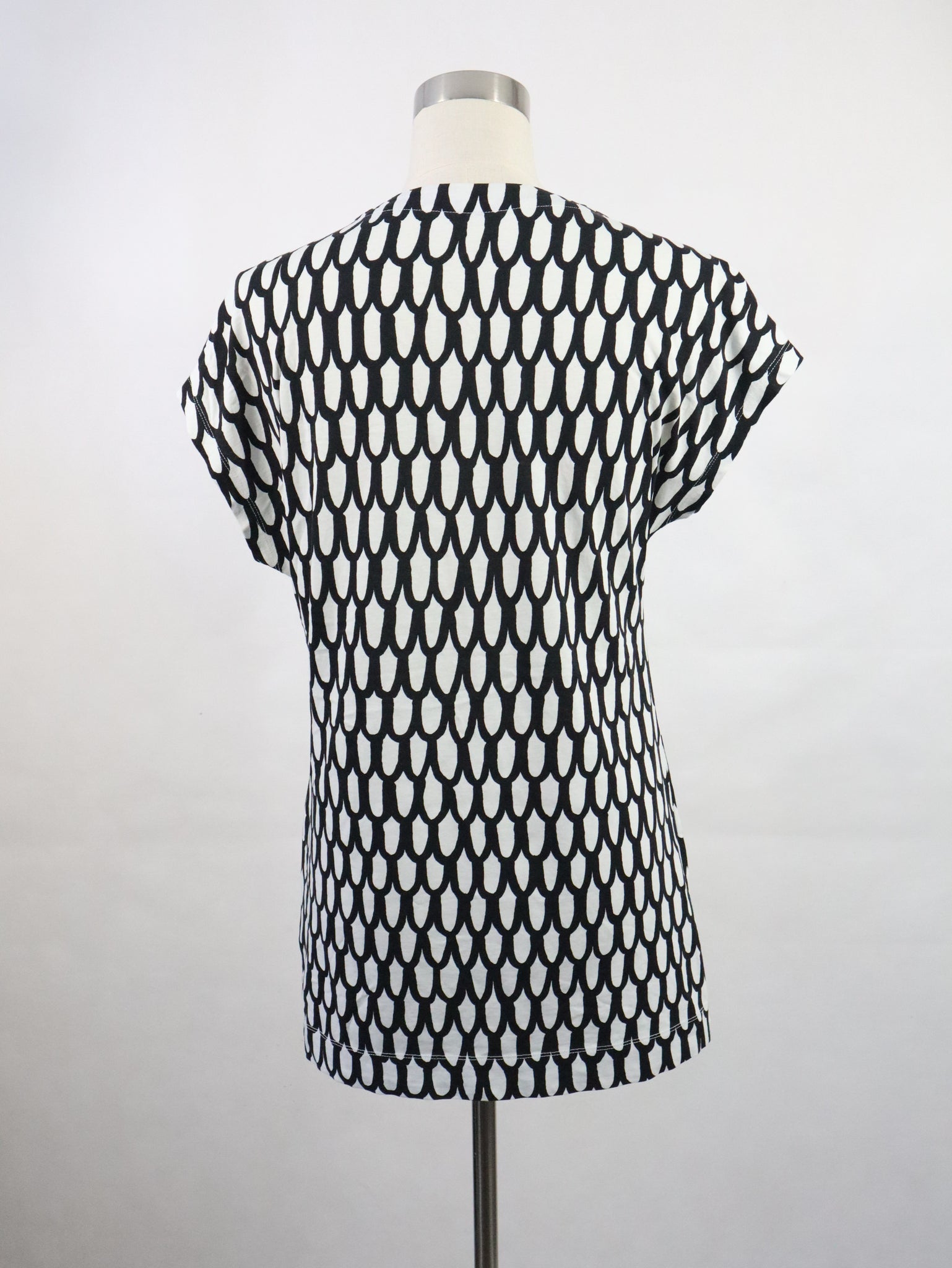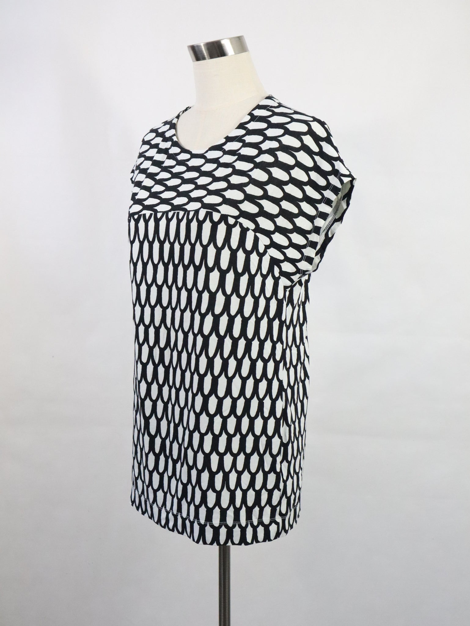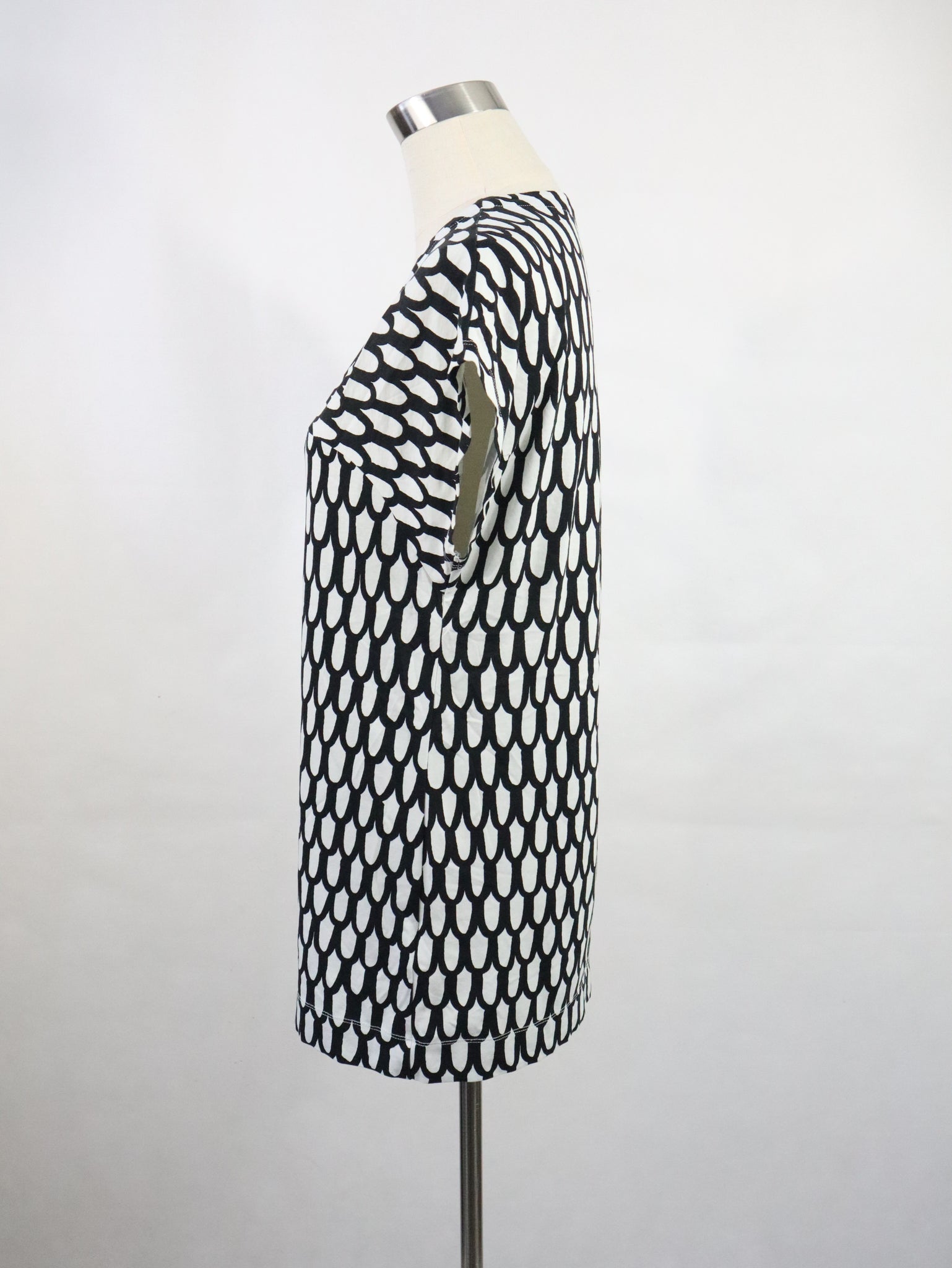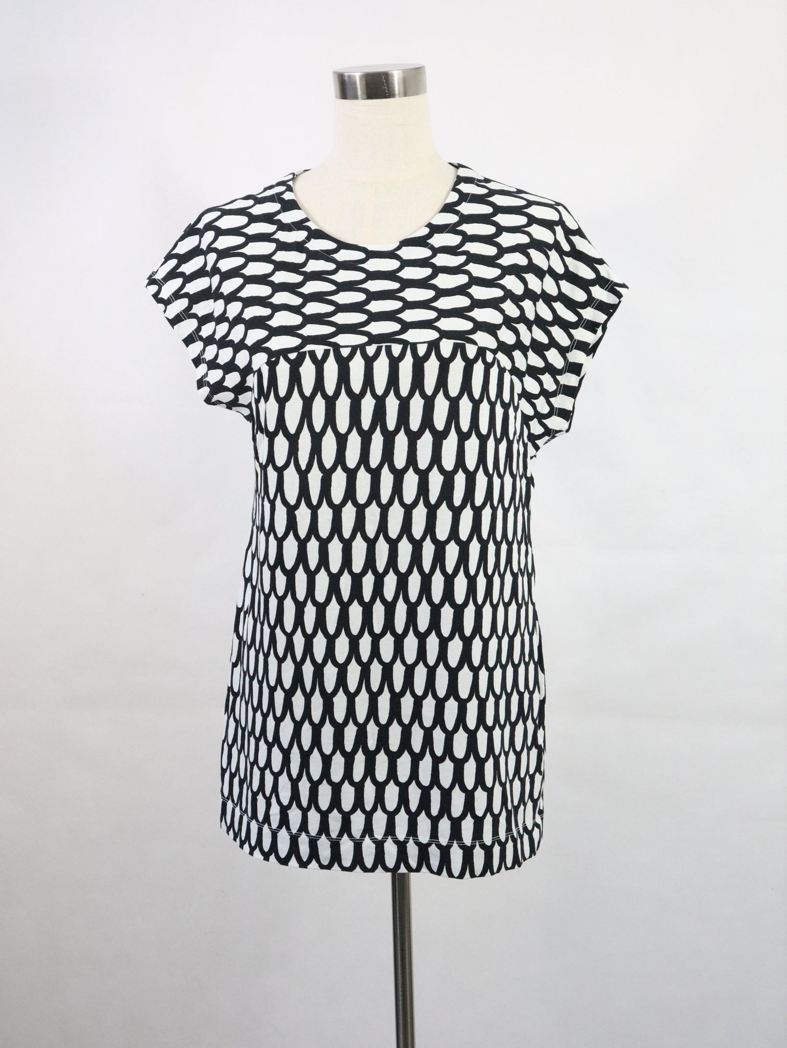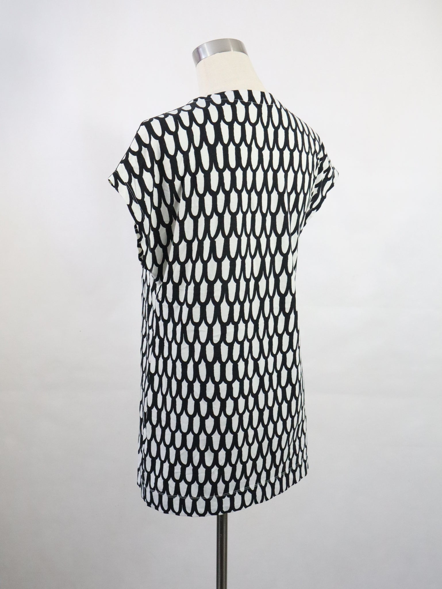 Mustavalkoinen kuviollinen lyhythihainen tunika, valmistaja Marimekko.