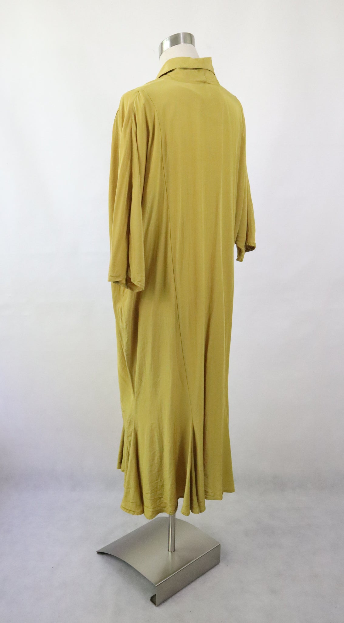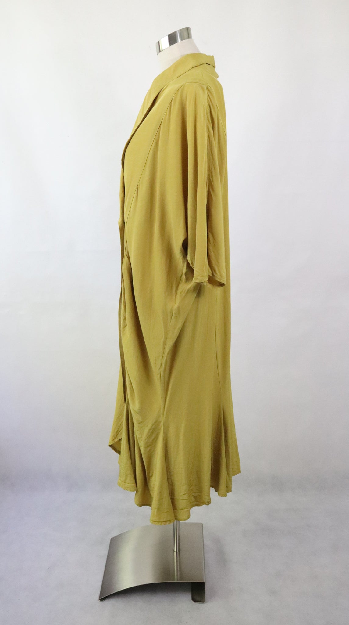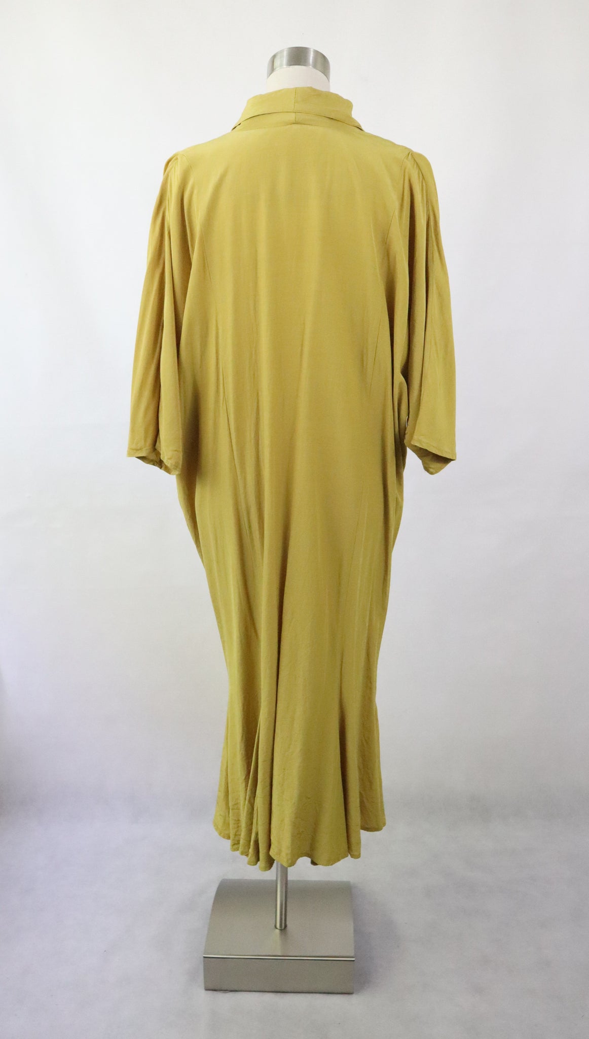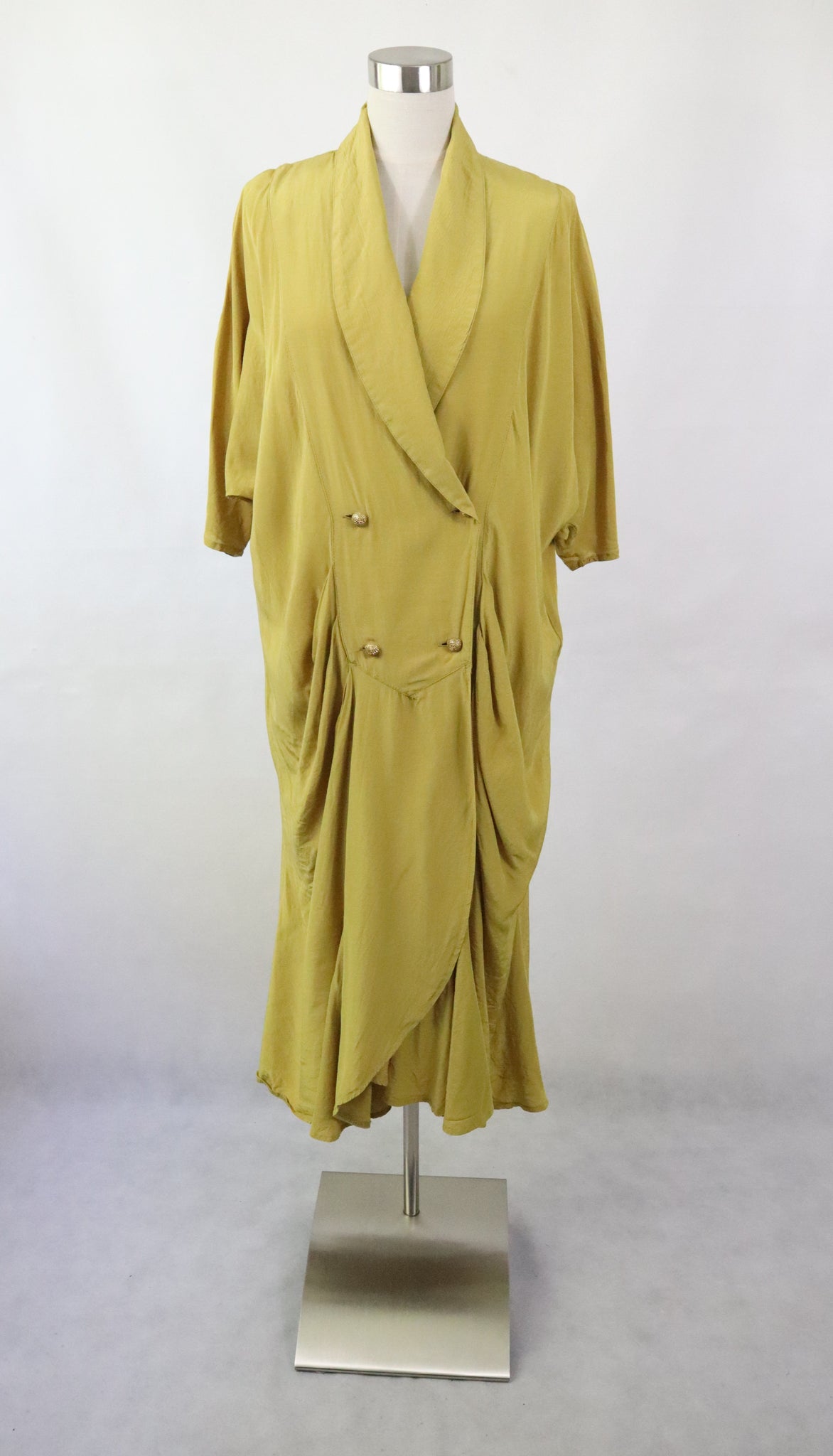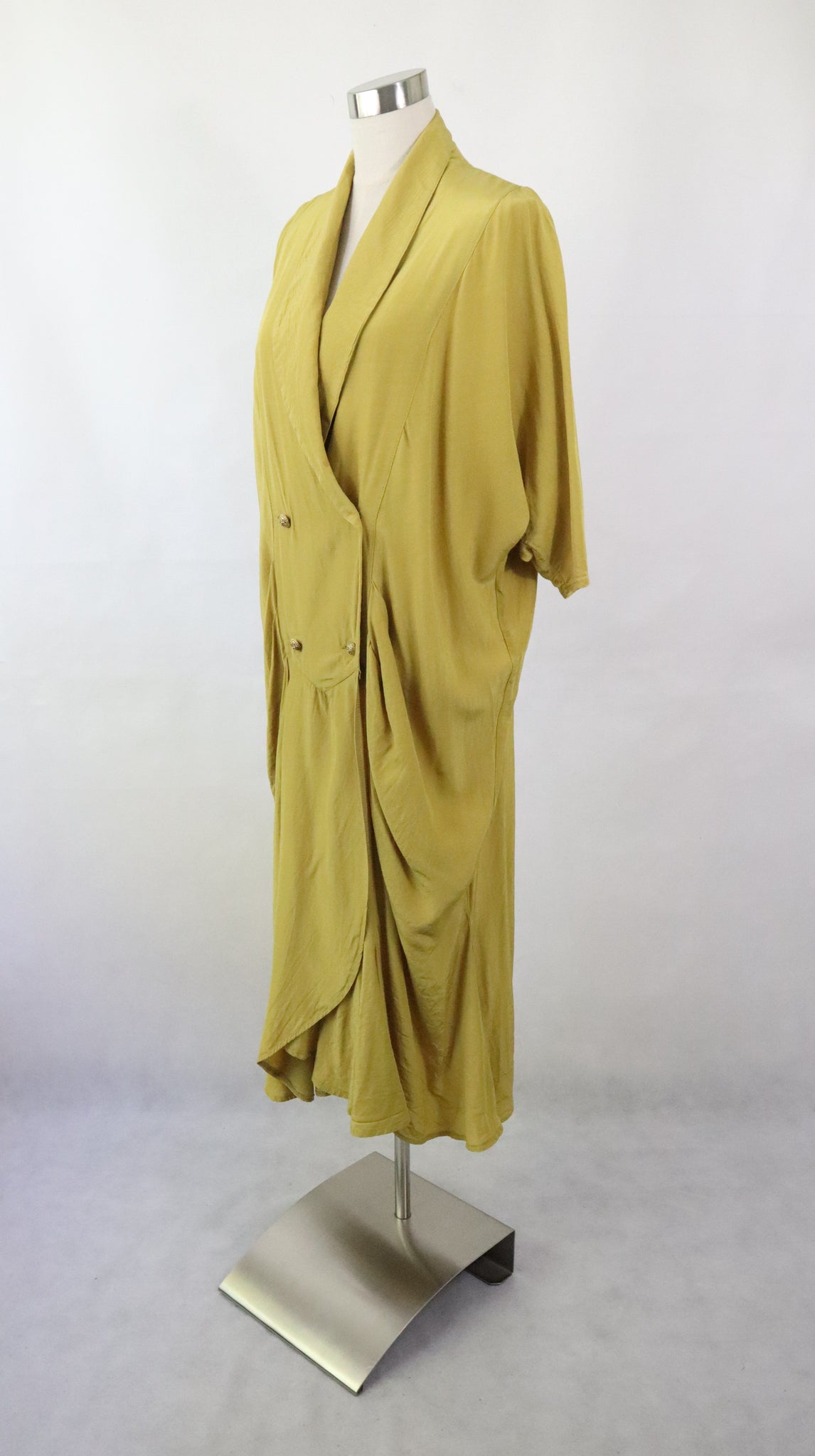 Mekossa on avara kaulus ja kaksirivinen nappikiinnitys koristeellisilla kullanvärisillä napeilla. Hihat ovat kimonomalliset ja vajaamittaiset. Lantiolla on laskostusta ja helma on ommeltu kaistaleista, jotka levenevät alaspäin. Mekko on kevyt ja vuorittamaton.