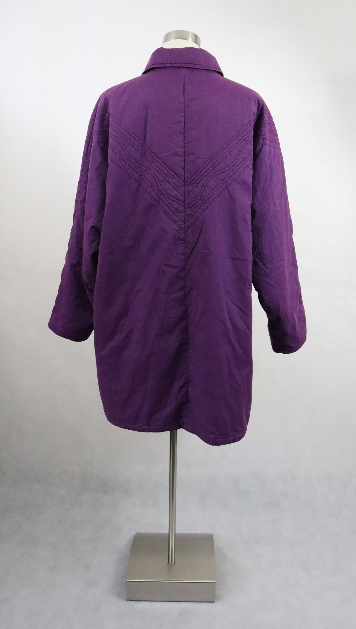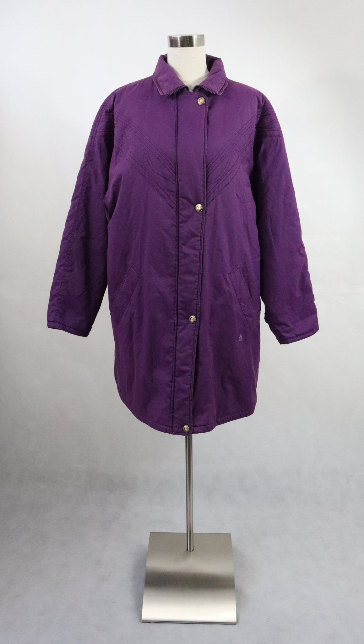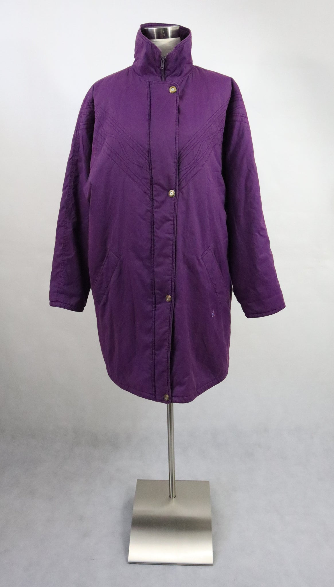 Violetti lämmin toppatakki 80-90-luvun kotimaista vintagea, valmistaja Tiklas, made in Finland.