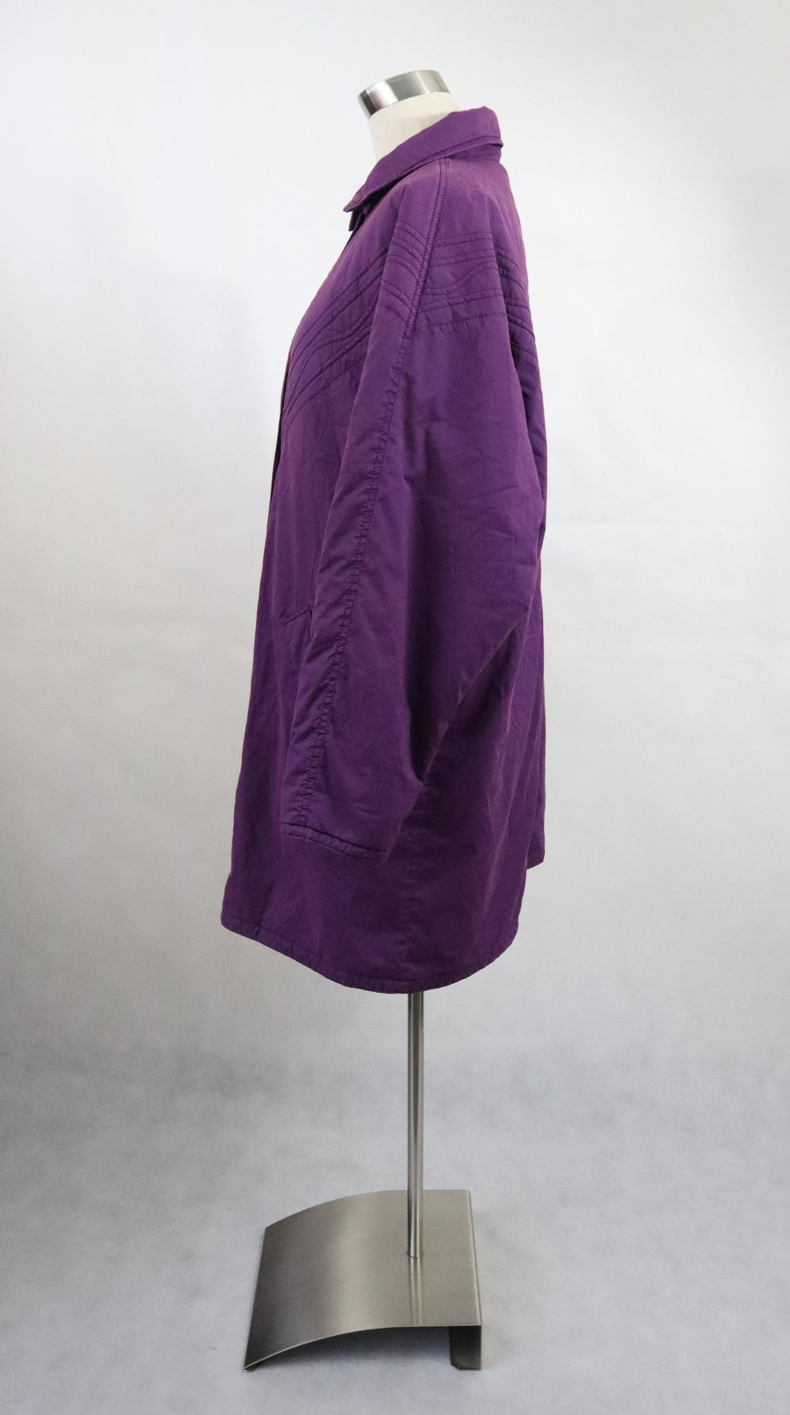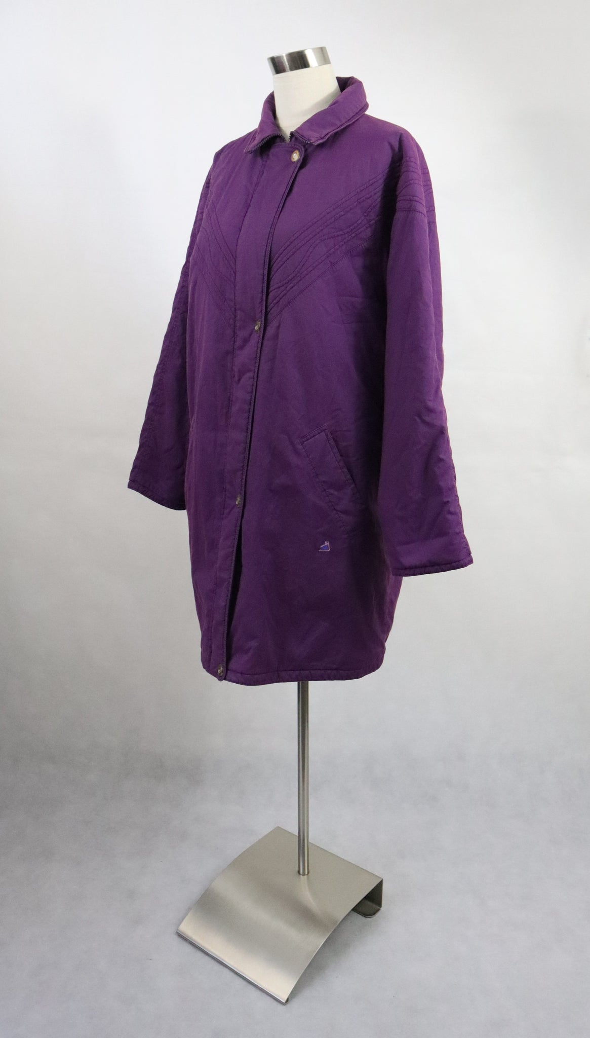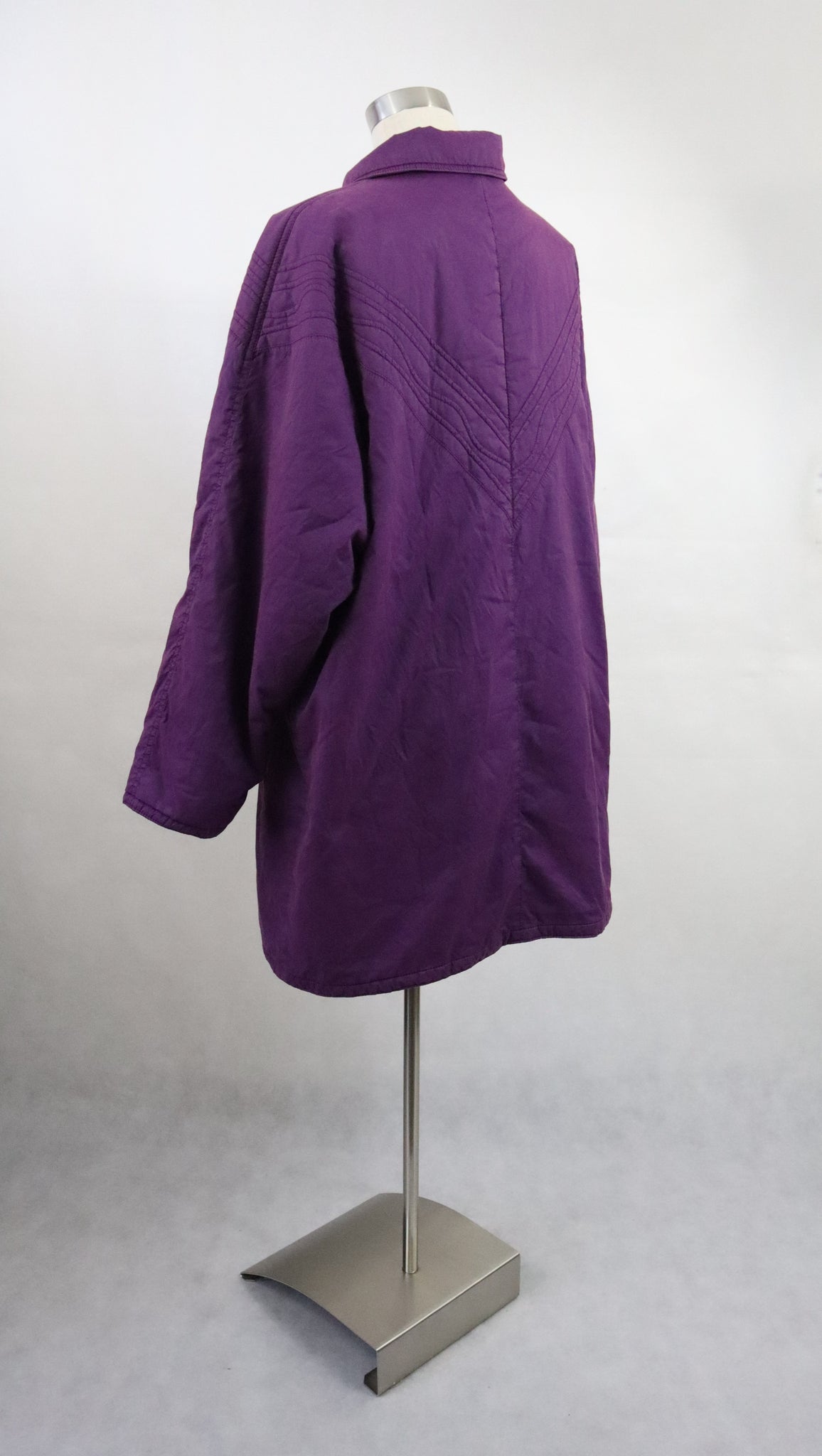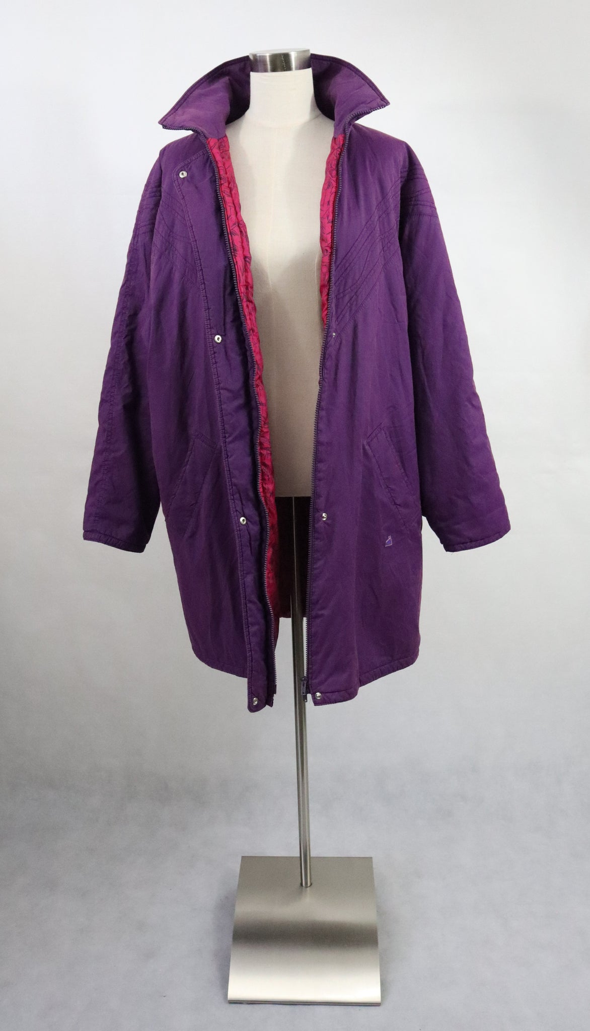 Violetti lämmin toppatakki 80-90-luvun kotimaista vintagea, valmistaja Tiklas, made in Finland.