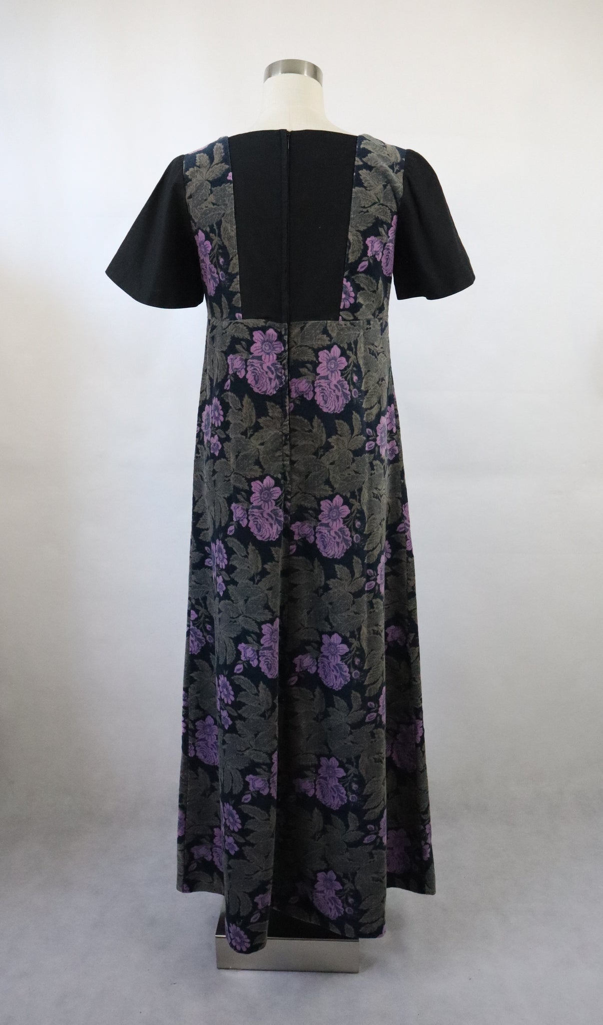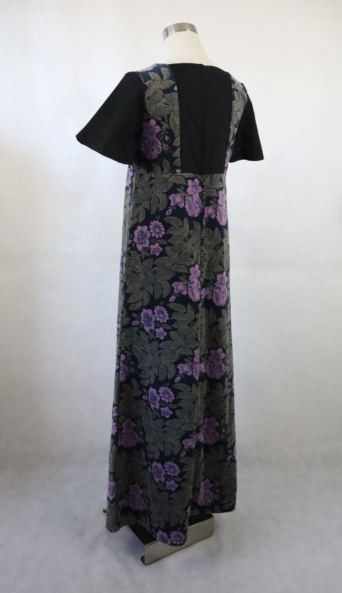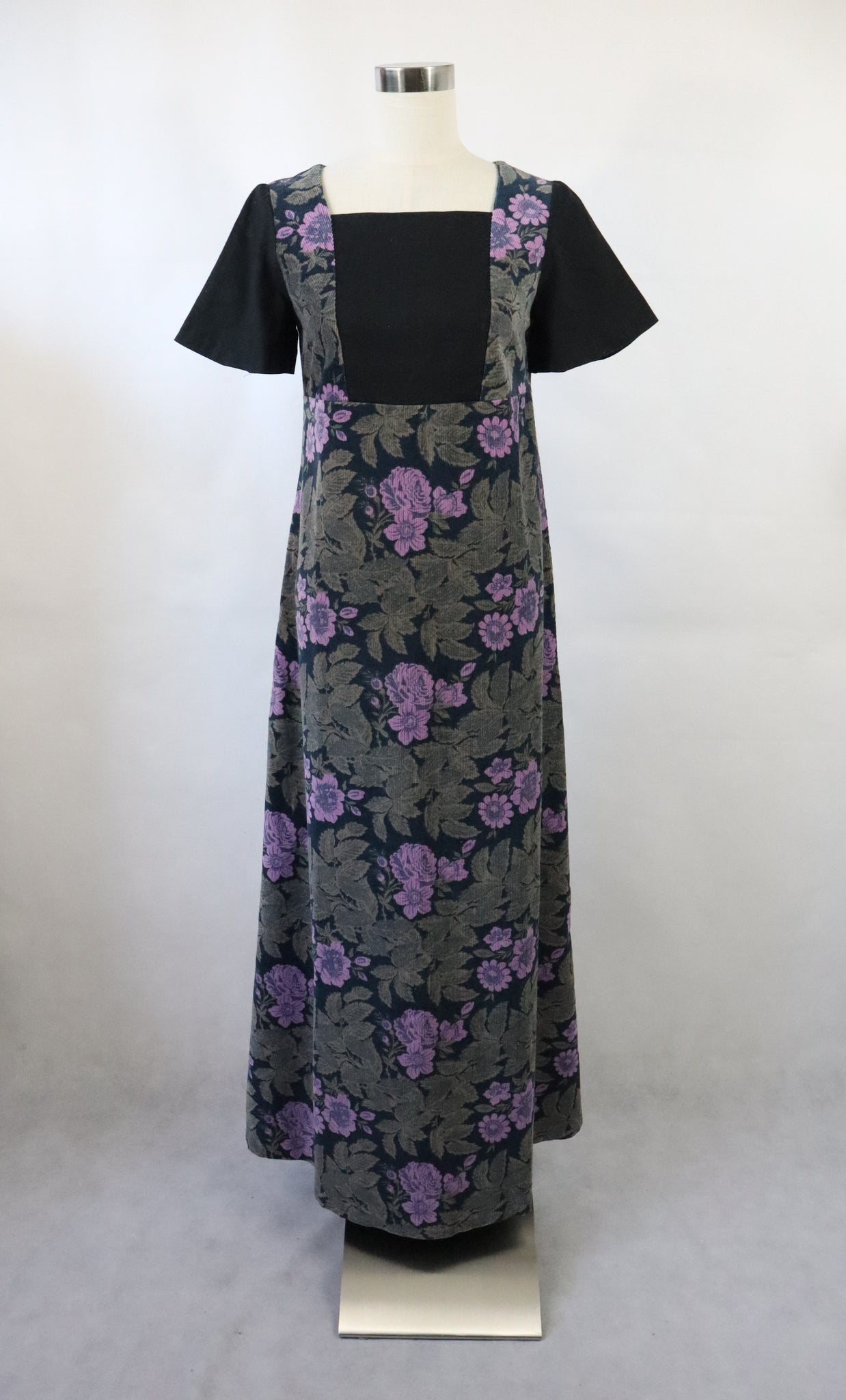 Kukkakuvioinen pitkä samettimekko 70-luvulta, valmistaja Kaisu Heikkilä Oy, made in Finland.