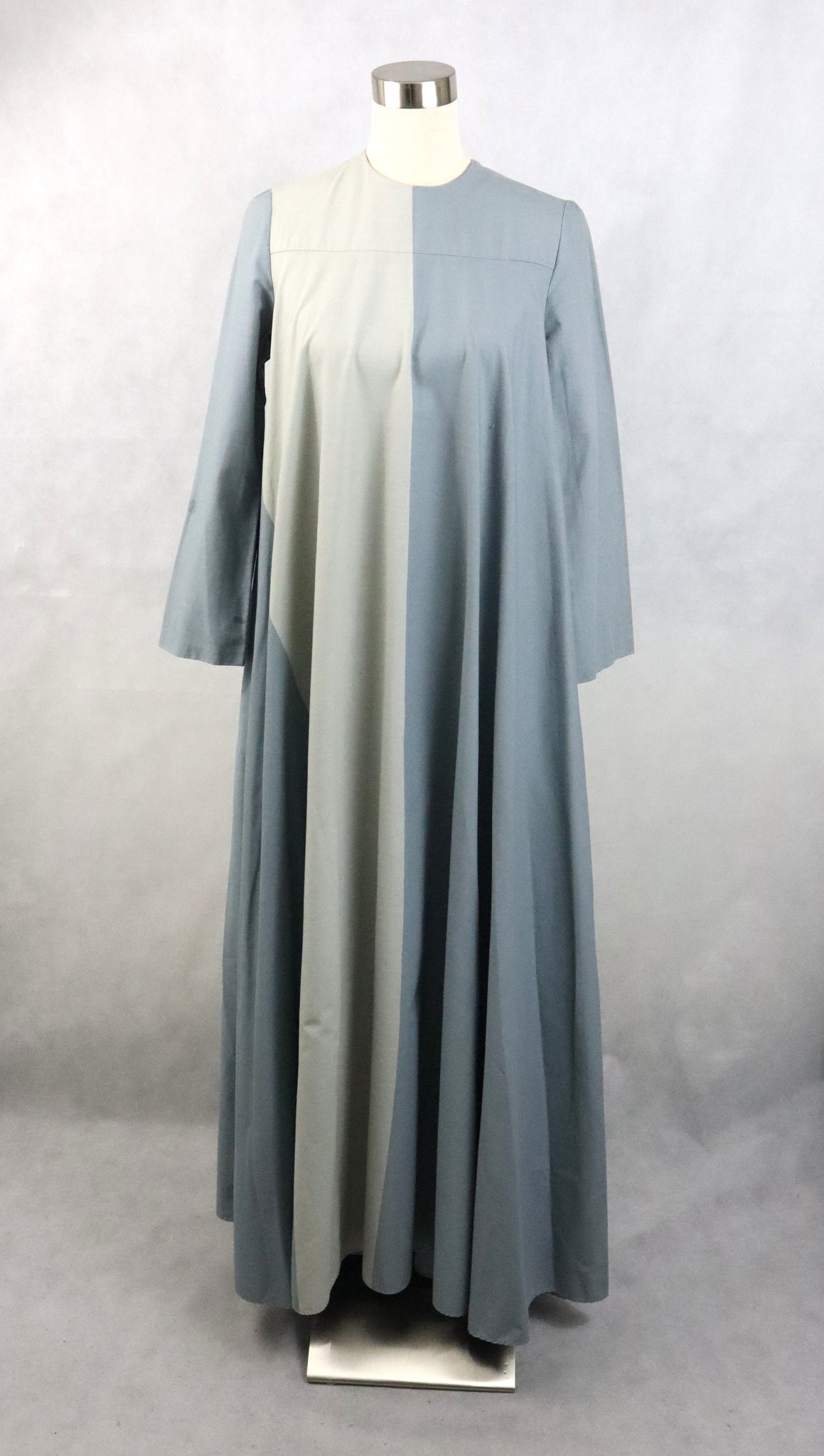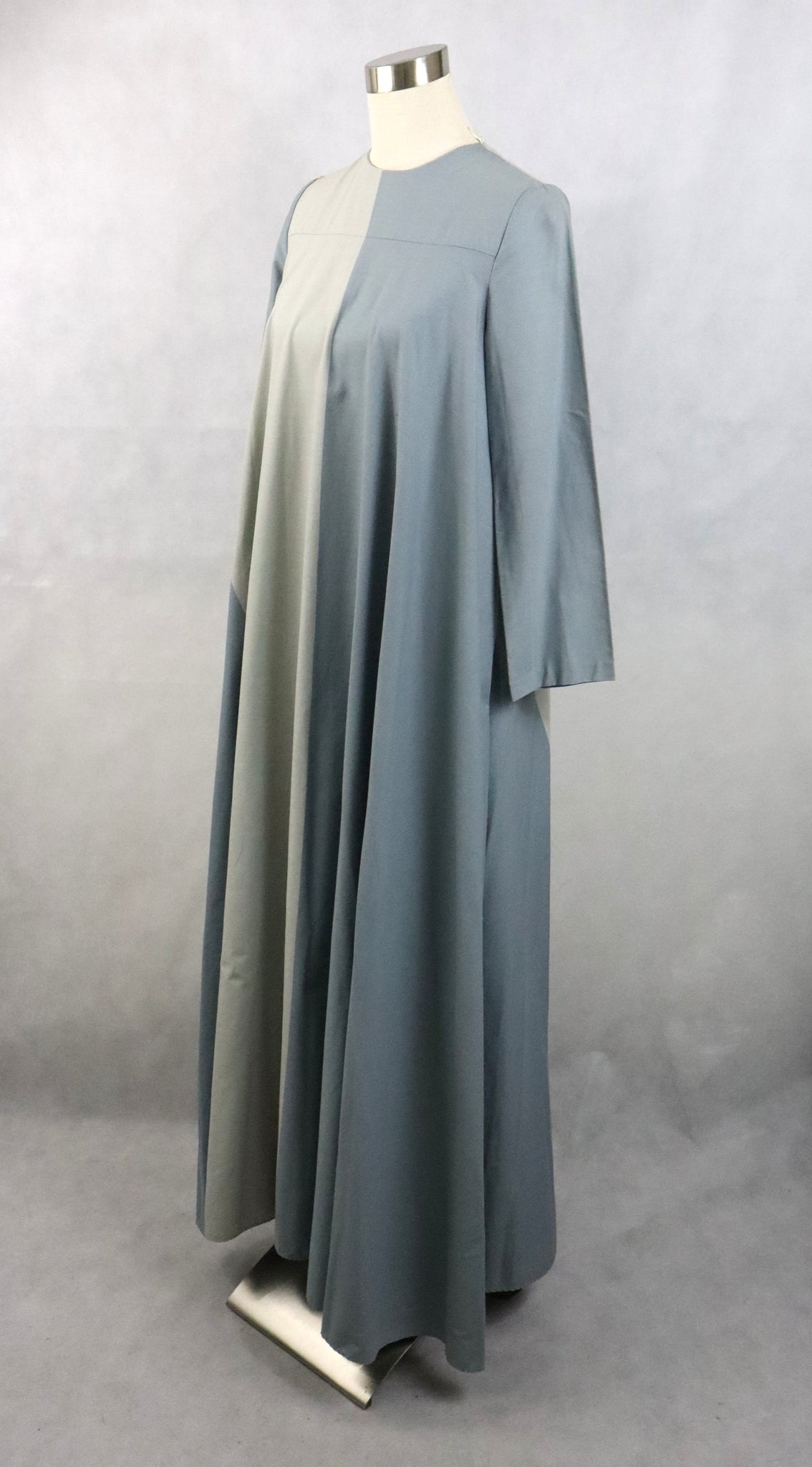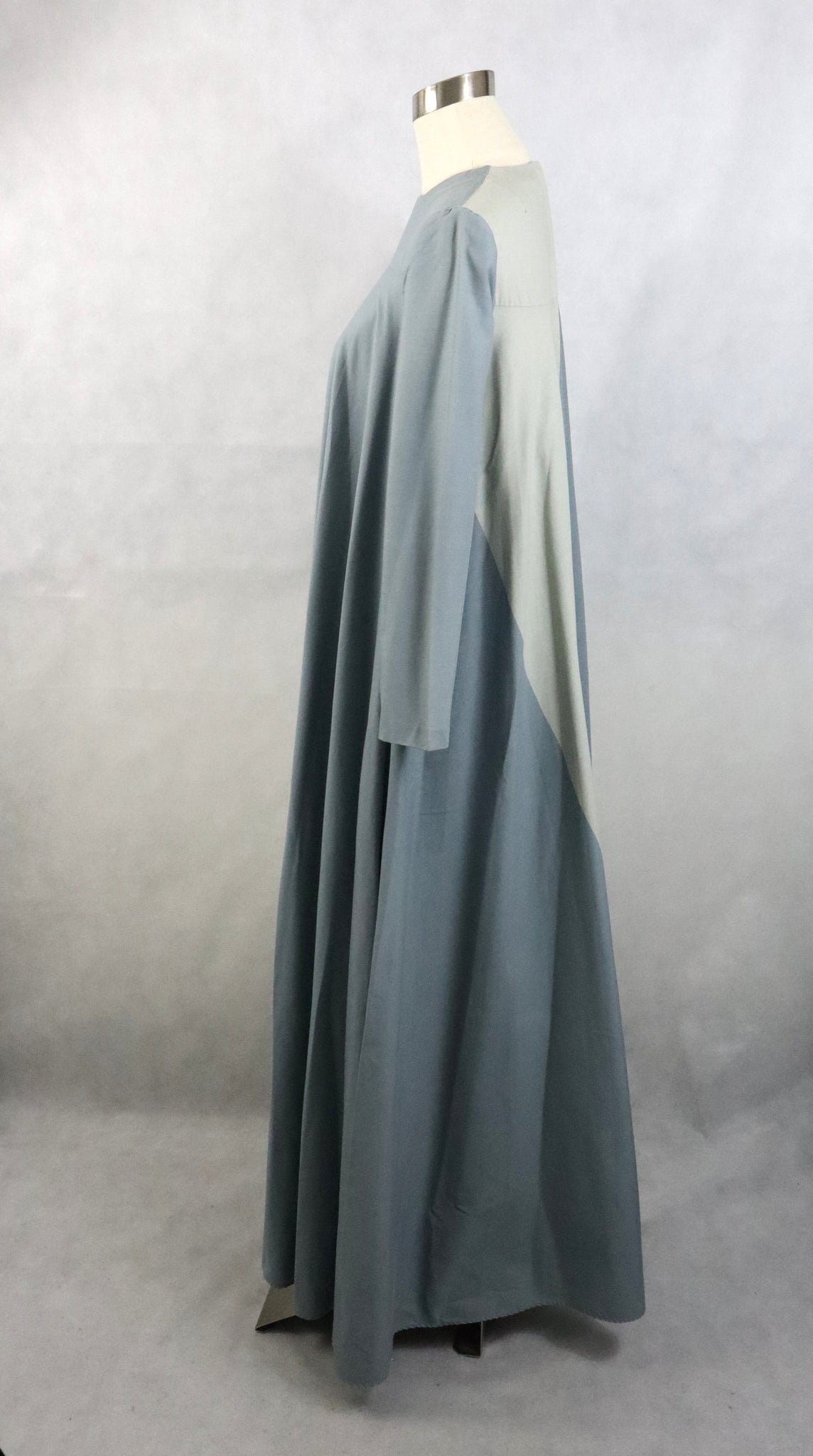 Vaalean siniharmaa maksipituinen pitkähihainen mekko runsaalla helmalla, valmistaja Vuokko Suomi Finland.