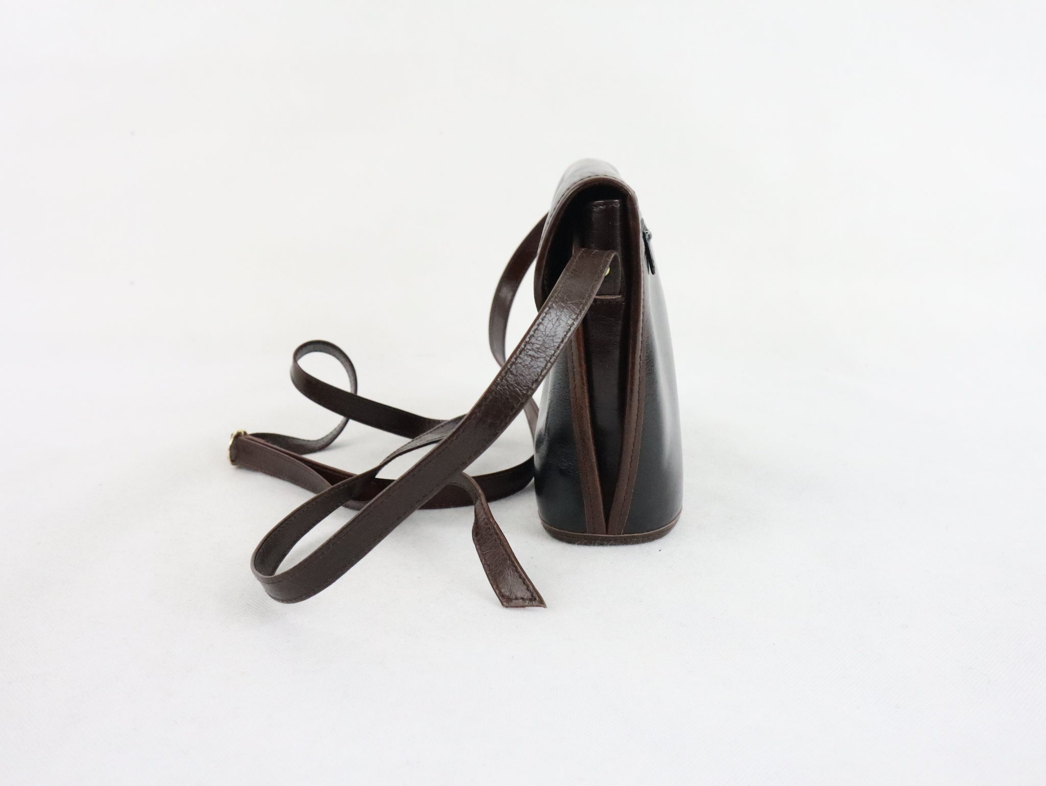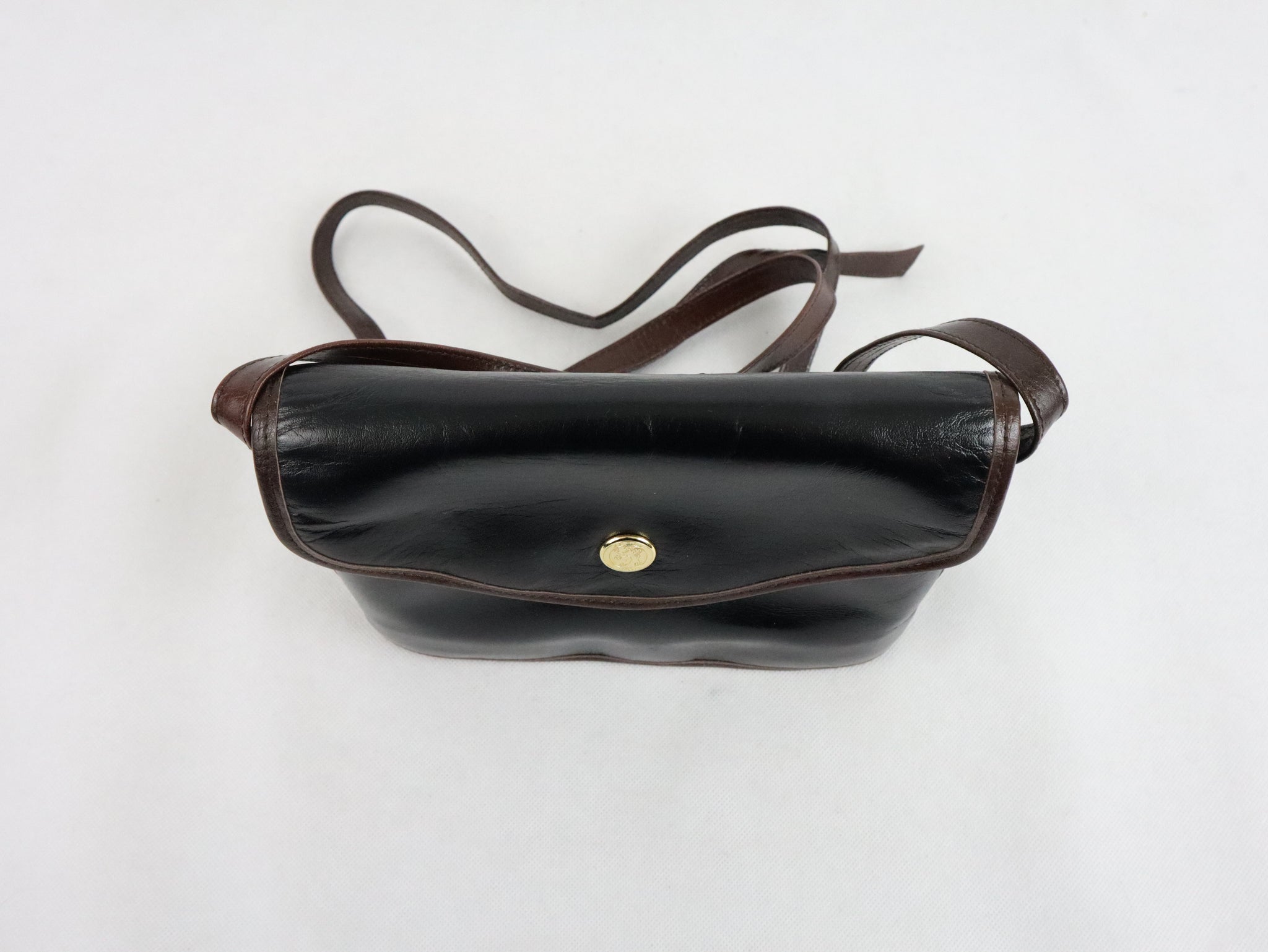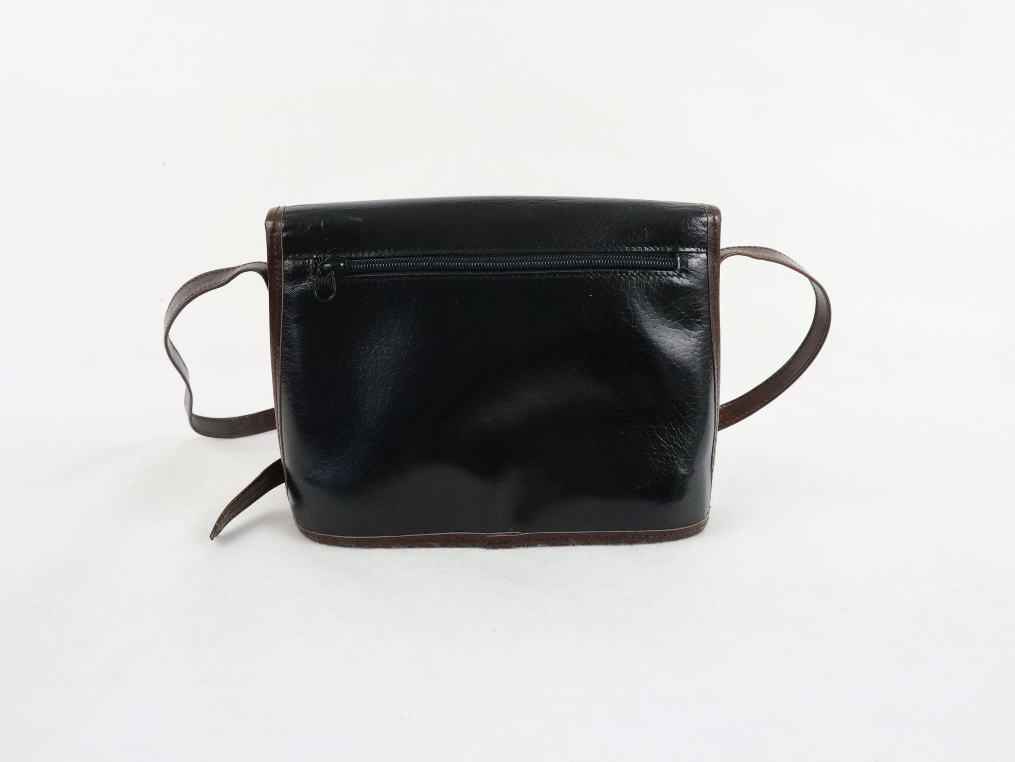 Musta olkalaukku ruskeilla reunuksilla ja olkahihnalla, valmistaja PT Design.